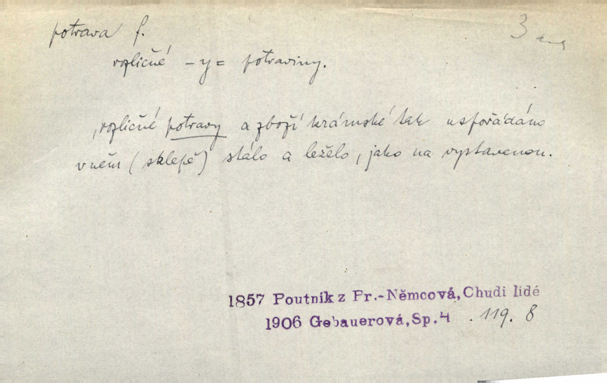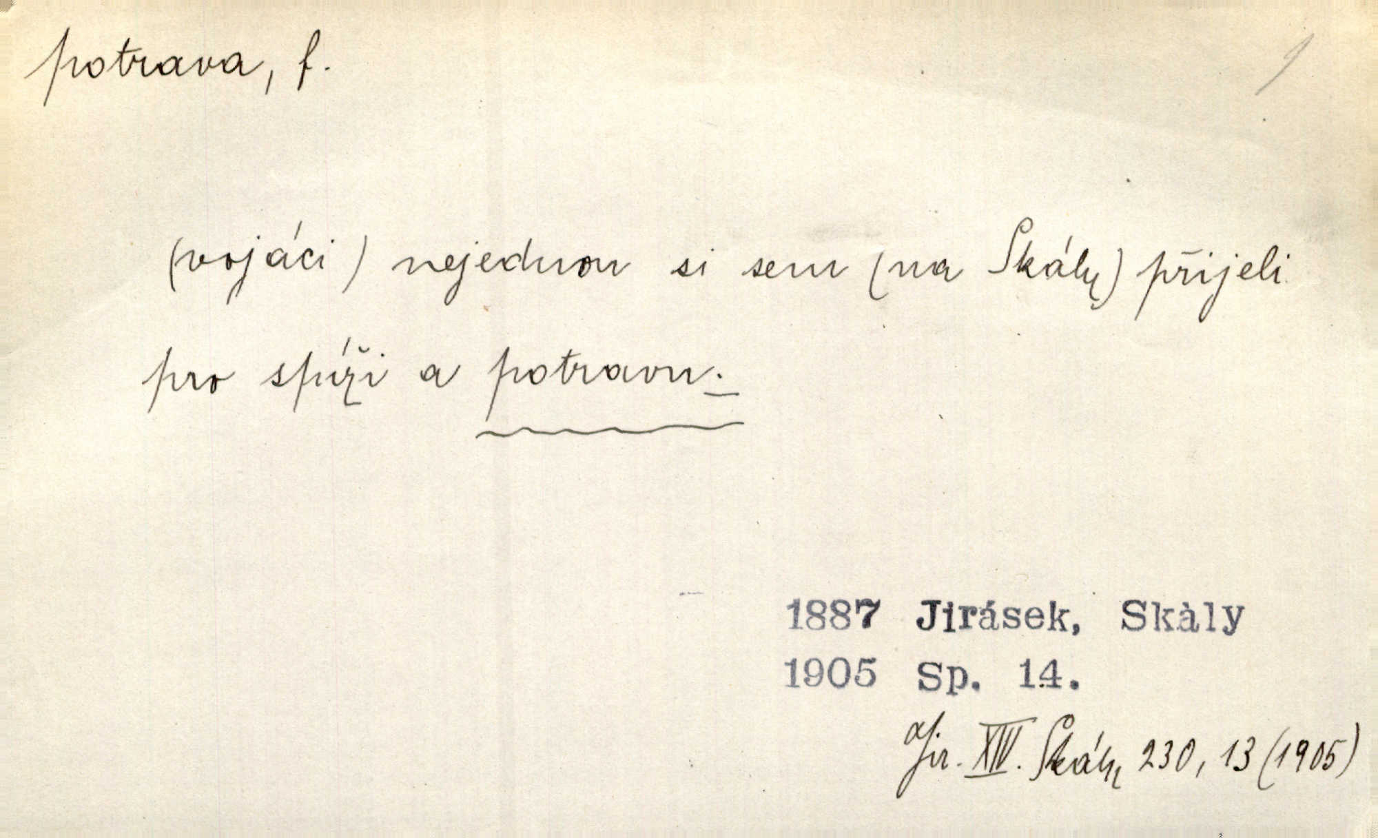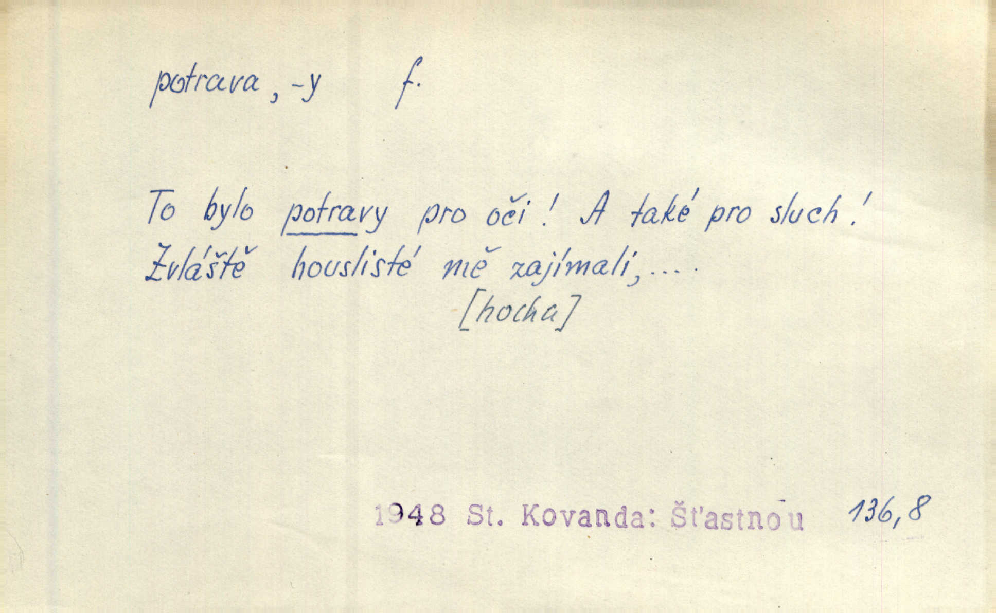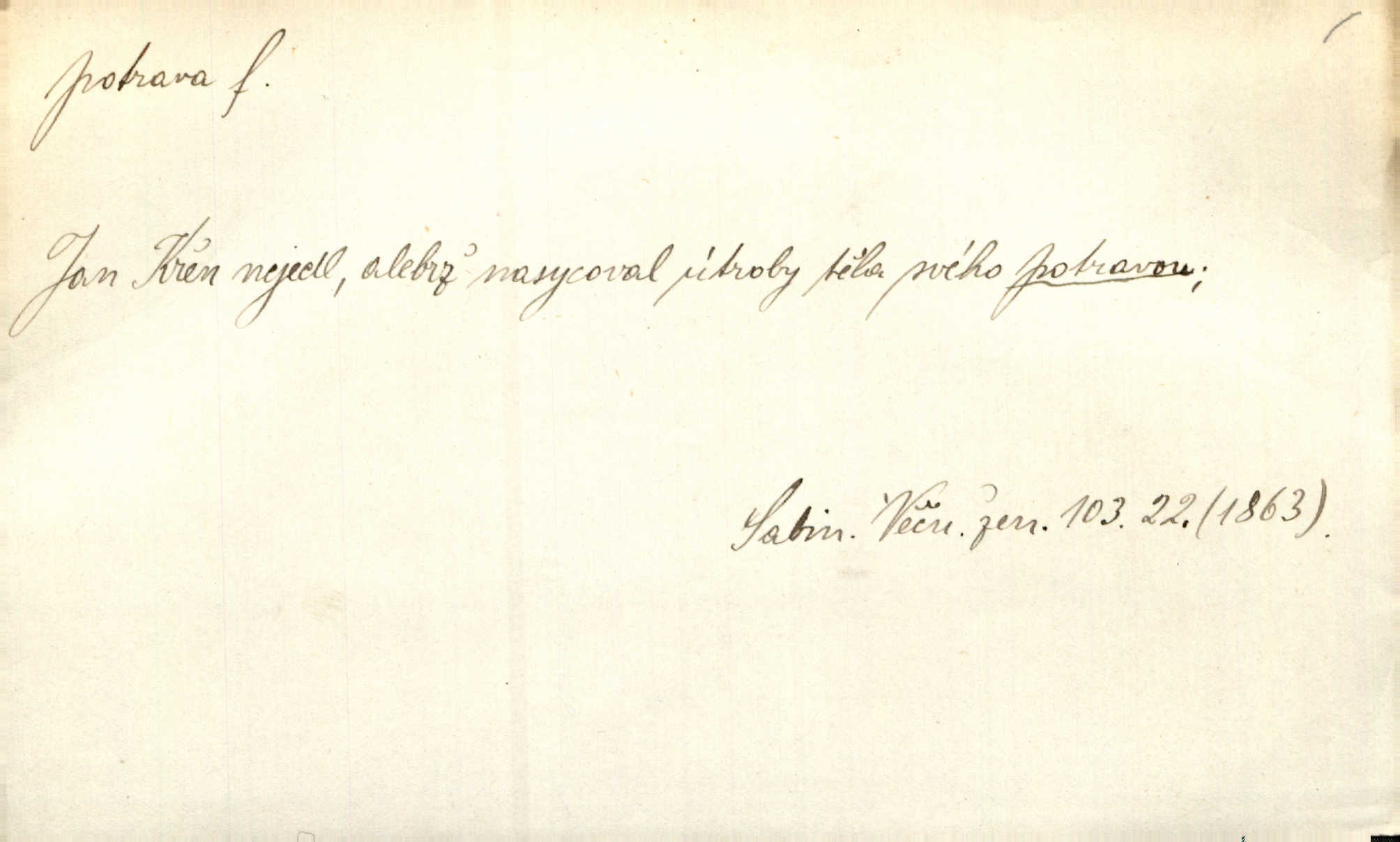 - potrava, -y f. (pl. jen arch.) živné látky, jež přijímají tvorové, zvl. lidé, k výživě; pokrm, jídlo, krmivo, píce a pod. Nasycoval útroby těla svého potravou. Sab. Na zádech nesly si [poutnice] ranečky, v nichž měly potravu. Něm. Nebylo nikde [v lese] potravy, ani jediné jahody, ani jediného zrnka! Zey. [Ptáci] najdou potravu v poli. Sab. [Krávy na jetelišti] širokými tlamami nabíraly čerstvou paličkatou potravu. Rais. Sklepy a špižírny byly všelikými potravami a nápoji hojně zásobeny potravinami. Čel. Hosp. směs živin a krmiv. Bot. všechny látky, jež rostliny přijímají svými listy jako plyny a svými kořeny z půdy jako roztoky. D vůbec látka něco udržující, podněcující, posila. Dříví se hodí nad jiné pod kotel, protože jest nejrychlejší potrava ohně. Vilikovský. [Výstava,] kde zrak má tolik potravy. Ner. Marnivost, která si hledala potravu v parádě, v šatech. Hál. Každého dne dostávalo se nějaké potravy mému podezření. Herb. Vycházky poskytovaly čerstvou potravu zábavám. Šmil. V městech denníky jsou jedinou skoro potravou duševní. Herb. [Gutenberg] svým vynálezem umožnil, aby všichni hrali podíl na duchovní potravě. Lit. noviny.