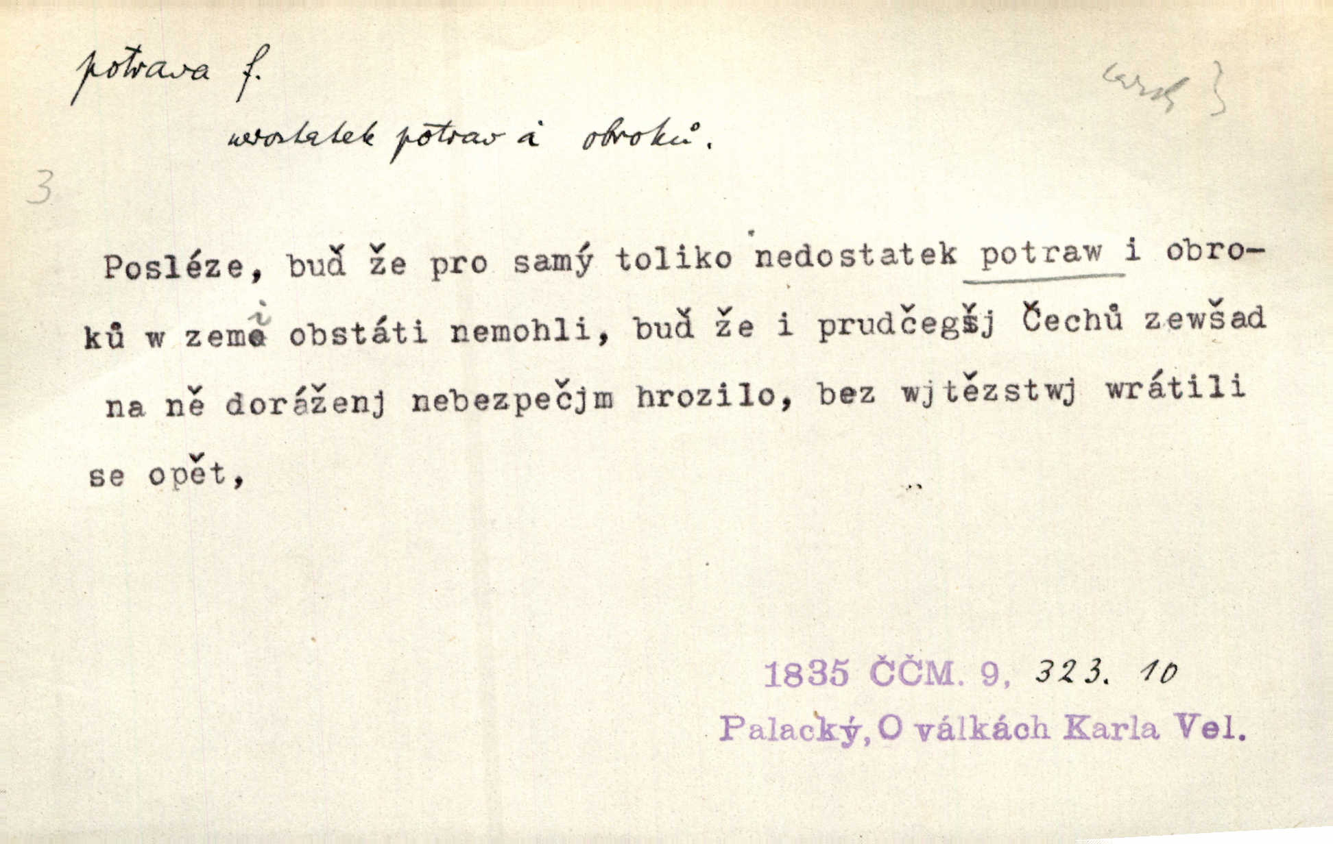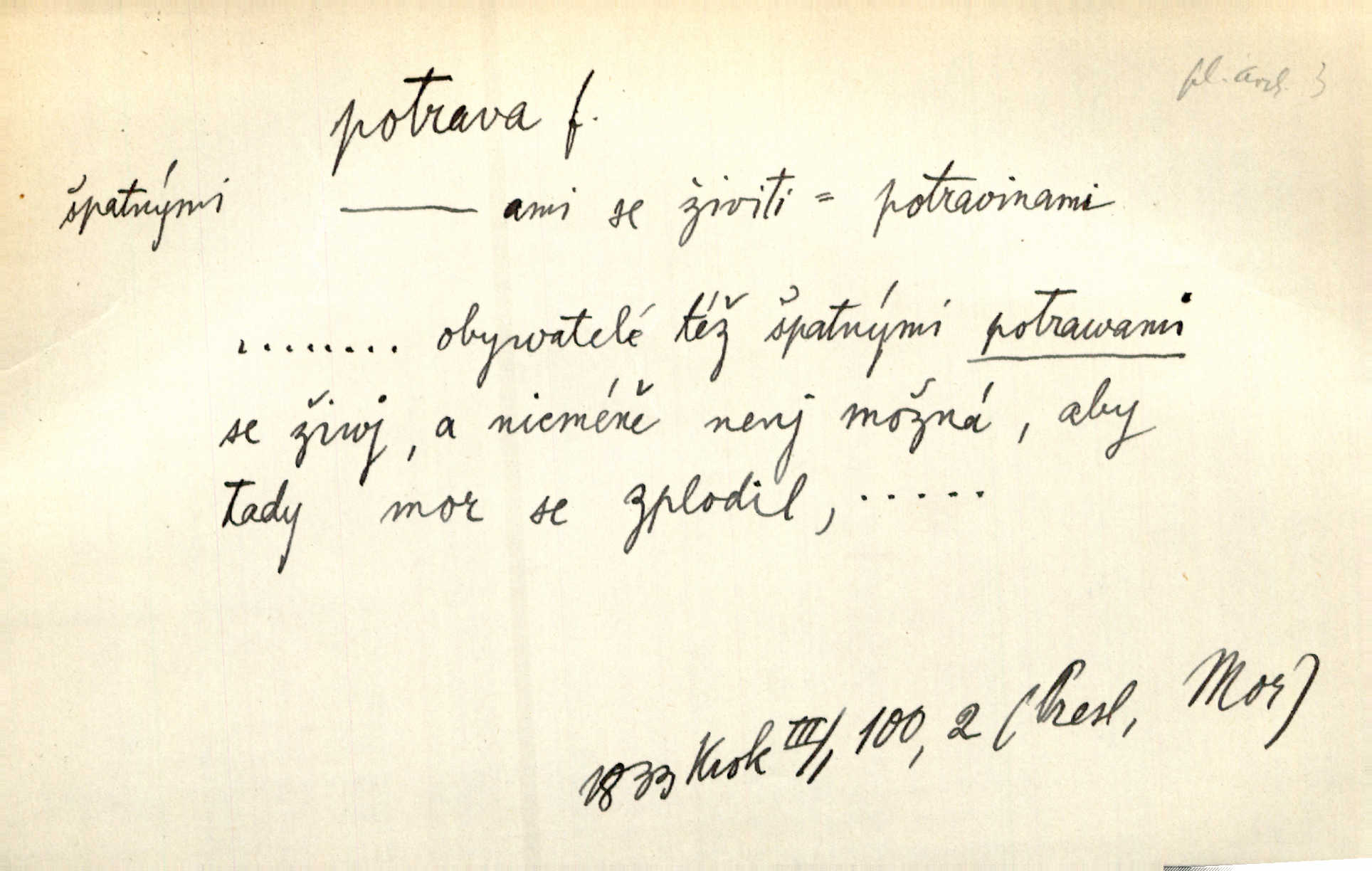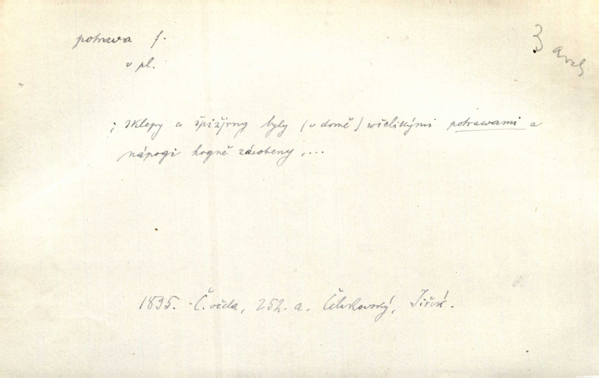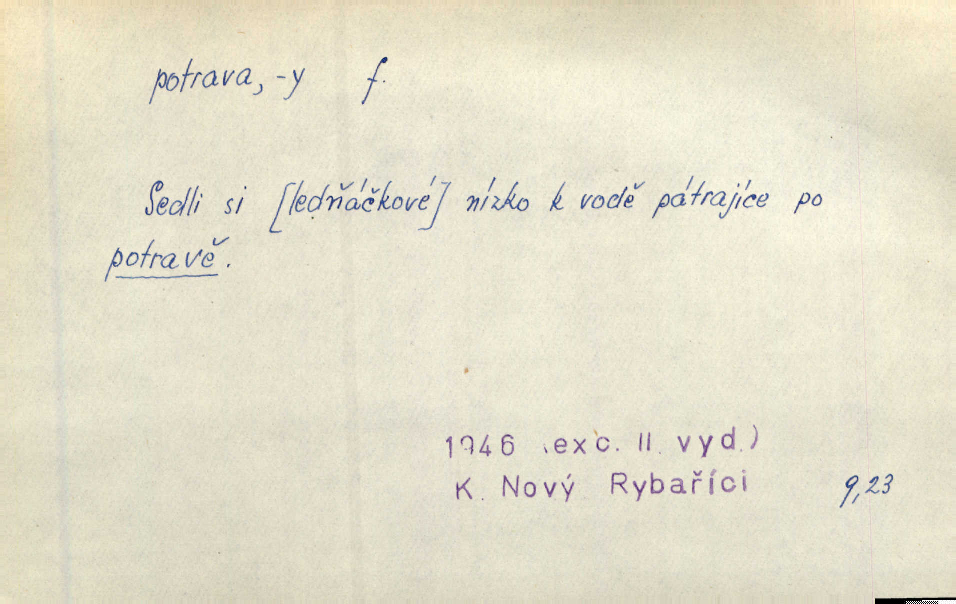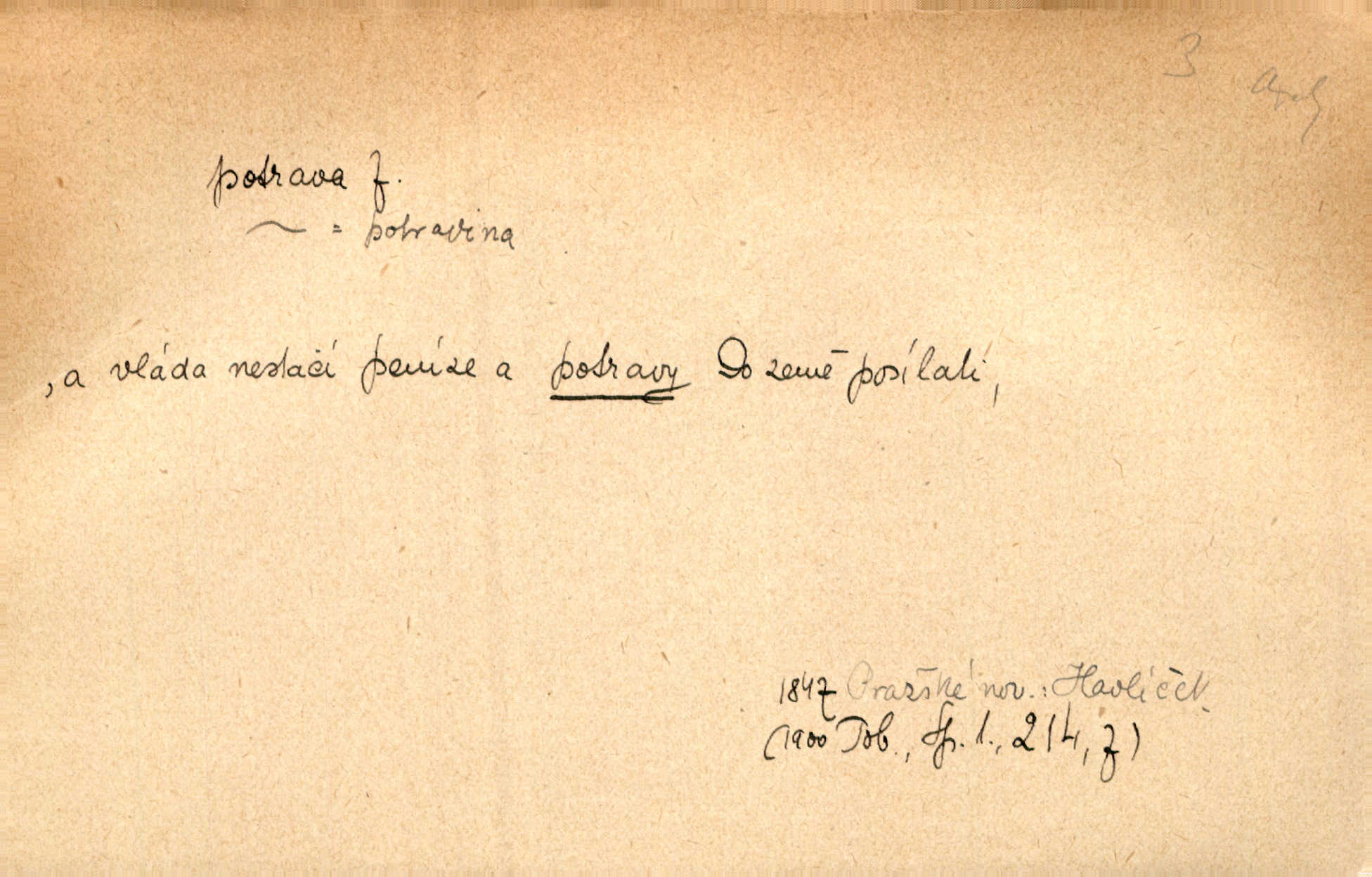 - potrava, -y f. (pl. jen arch.) živné látky, jež přijímají tvorové, zvl. lidé, k výživě; pokrm, jídlo, krmivo, píce a pod. Nasycoval útroby těla svého potravou. Sab. Na zádech nesly si [poutnice] ranečky, v nichž měly potravu. Něm. Nebylo nikde [v lese] potravy, ani jediné jahody, ani jediného zrnka! Zey. [Ptáci] najdou potravu v poli. Sab. [Krávy na jetelišti] širokými tlamami nabíraly čerstvou paličkatou potravu. Rais. Sklepy a špižírny byly všelikými potravami a nápoji hojně zásobeny potravinami. Čel. Hosp. směs živin a krmiv. Bot. všechny látky, jež rostliny přijímají svými listy jako plyny a svými kořeny z půdy jako roztoky. D vůbec látka něco udržující, podněcující, posila. Dříví se hodí nad jiné pod kotel, protože jest nejrychlejší potrava ohně. Vilikovský. [Výstava,] kde zrak má tolik potravy. Ner. Marnivost, která si hledala potravu v parádě, v šatech. Hál. Každého dne dostávalo se nějaké potravy mému podezření. Herb. Vycházky poskytovaly čerstvou potravu zábavám. Šmil. V městech denníky jsou jedinou skoro potravou duševní. Herb. [Gutenberg] svým vynálezem umožnil, aby všichni hrali podíl na duchovní potravě. Lit. noviny.