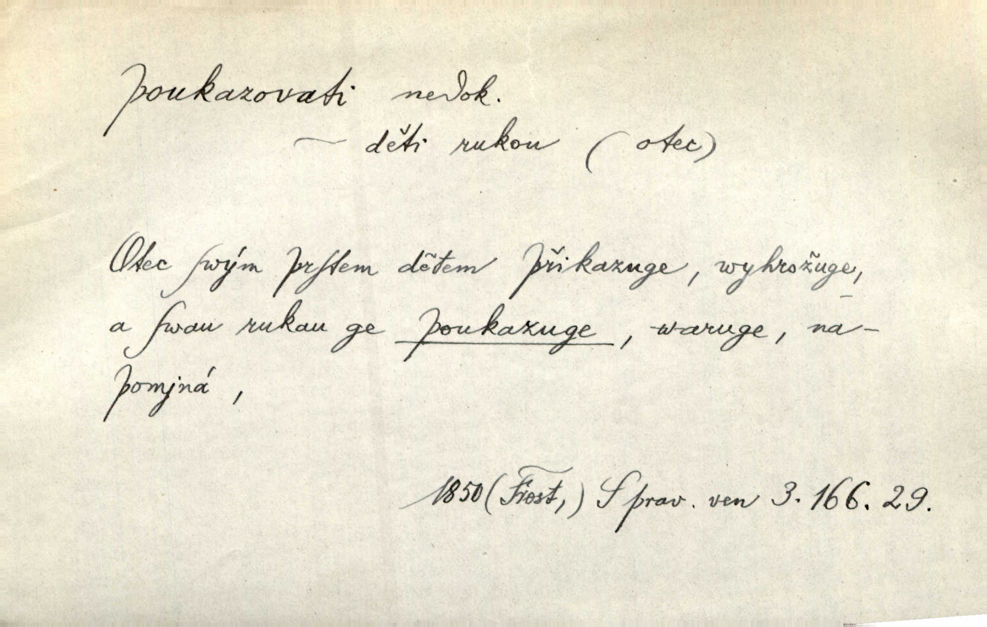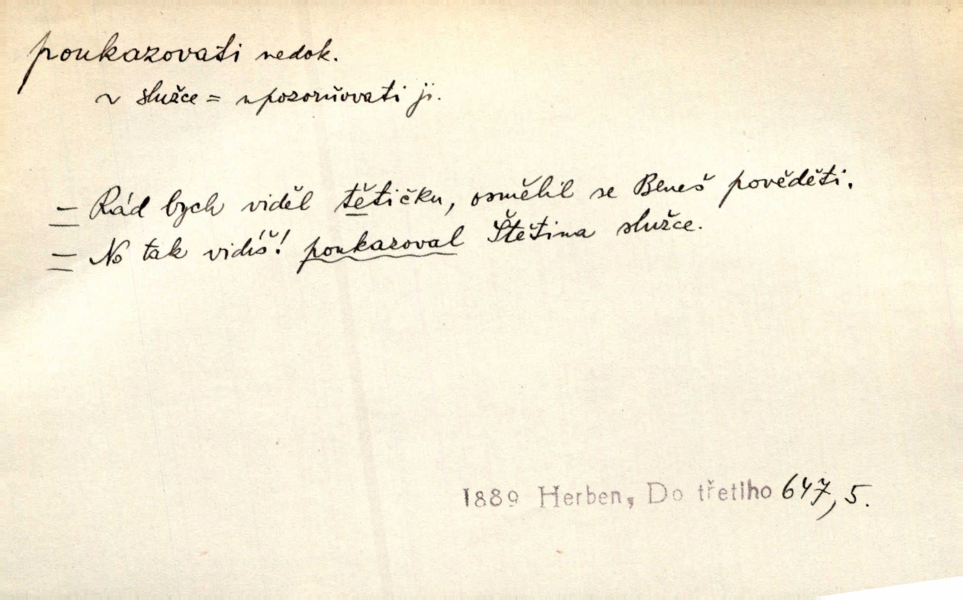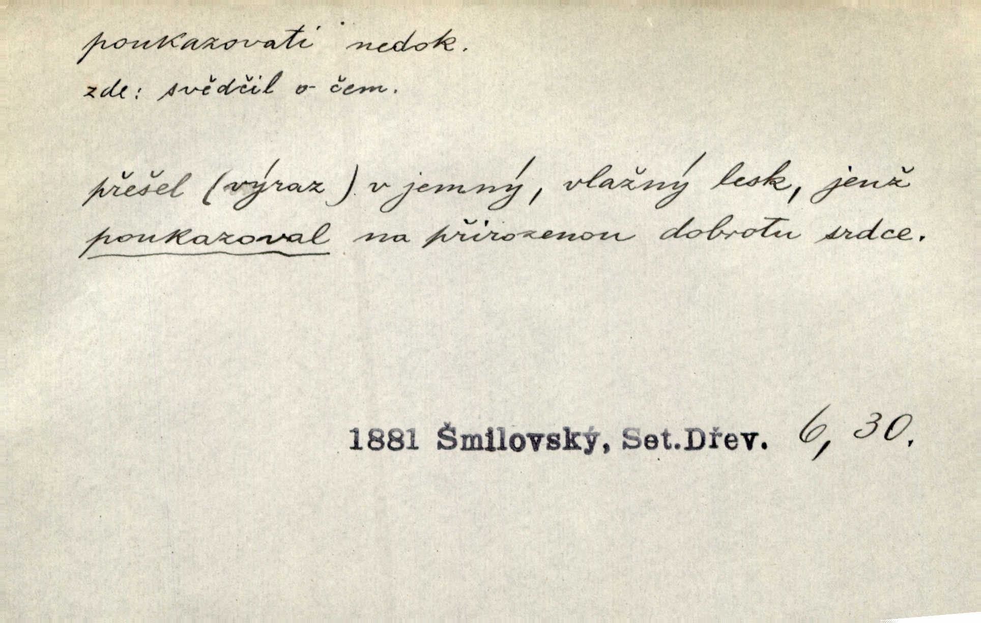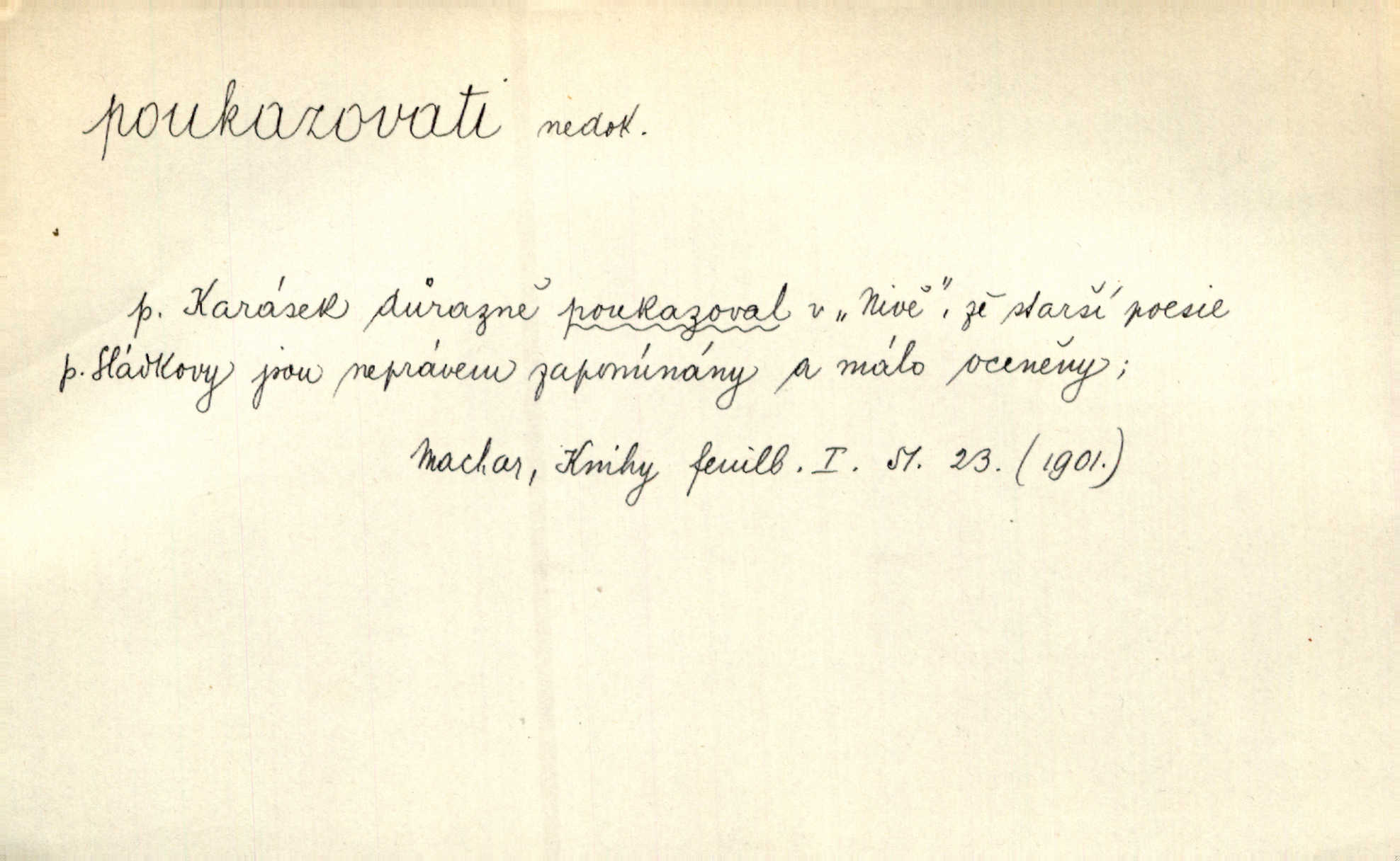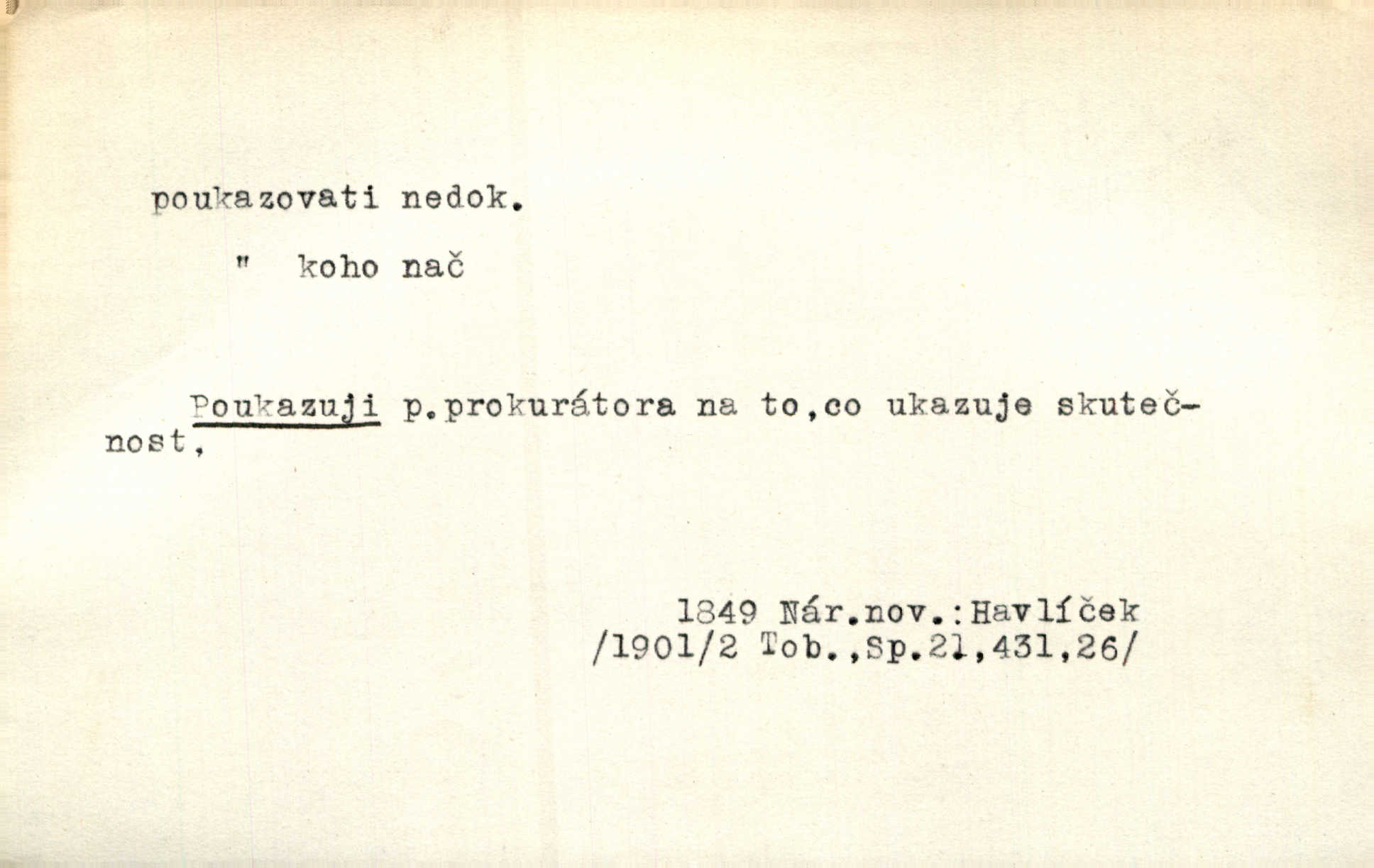 - poukazovati ned. jistým pohybem ruky n. prstu ukazovati. Rozčilil se zas, a poukazuje mokrým šátkem od potu, volal za ním mávaje. V. Mrš. D upozorňovati, obraceti pozornost. Poukazuji p. prokurátora na to, co ukazuje skutečnost. Havl. P. Karásek důrazně poukazoval v „Nivě“, že starší poesie p. Sládkovy jsou neprávem zapomínány. Mach. Poukazuji na motivování, na psychická hnutí u jednotlivých osob. Zey. Z počátku jen jaksi mimochodem na to [pohoršlivé chování žebráků] poukazováno. Arb. D býti dokladem, důkazem, svědectvím něčeho, svědčiti pro něco. Nejstarší listina poukazuje na to, že se dříve v okolí Jílovském zlato ze zlatonosného písku vypíralo. Lum. Prvotiny Máchovy poukazovaly na zcela jiný směr, nežli v jakém se později osvědčil. Sab. D přikazovati. Každý poukazující úřad má koncept poukazu. Předp. zahr. min. Práv. dávati příkaz osobě jiné, aby plnila osobě třetí. Poukazovati výplatu.