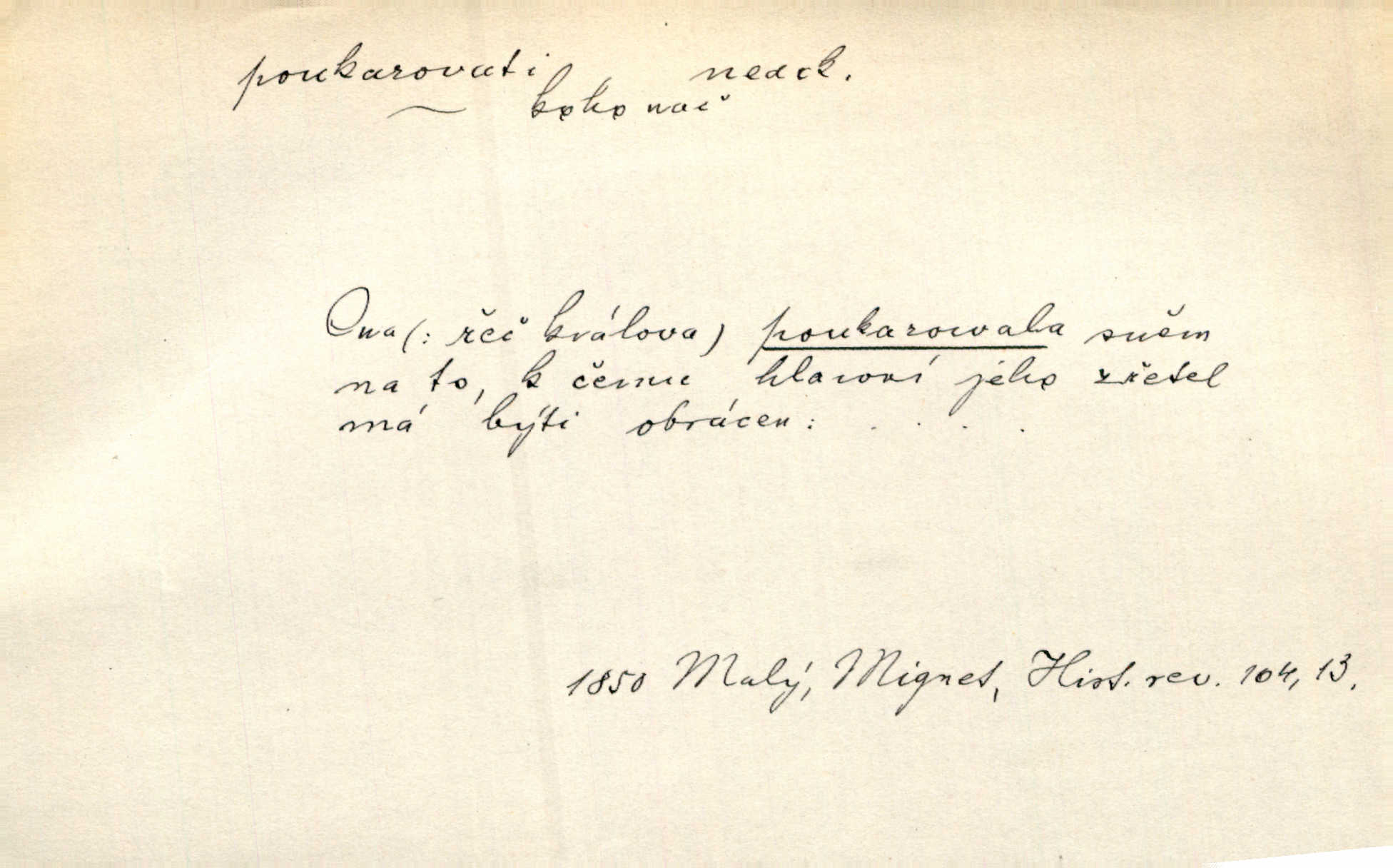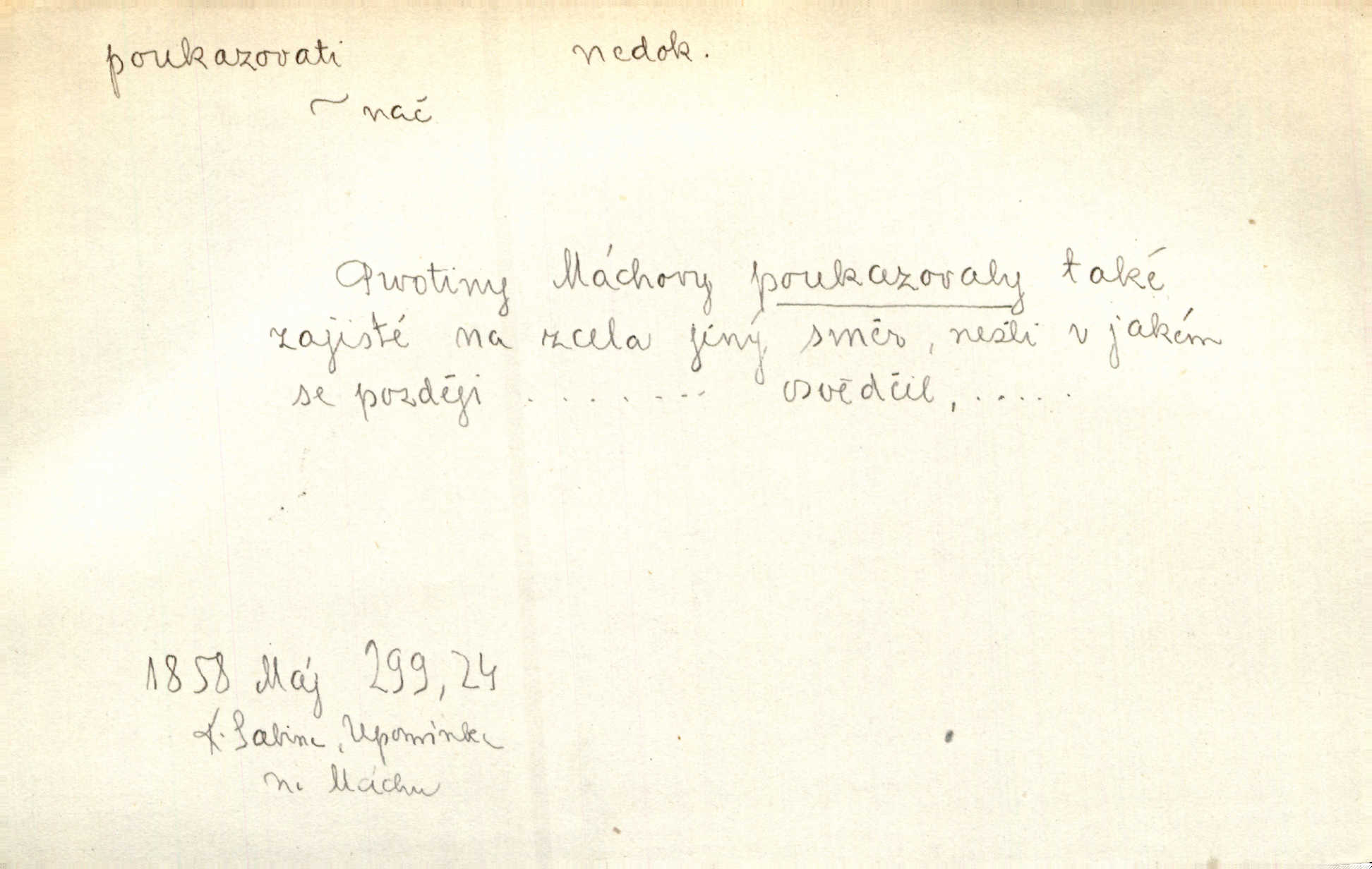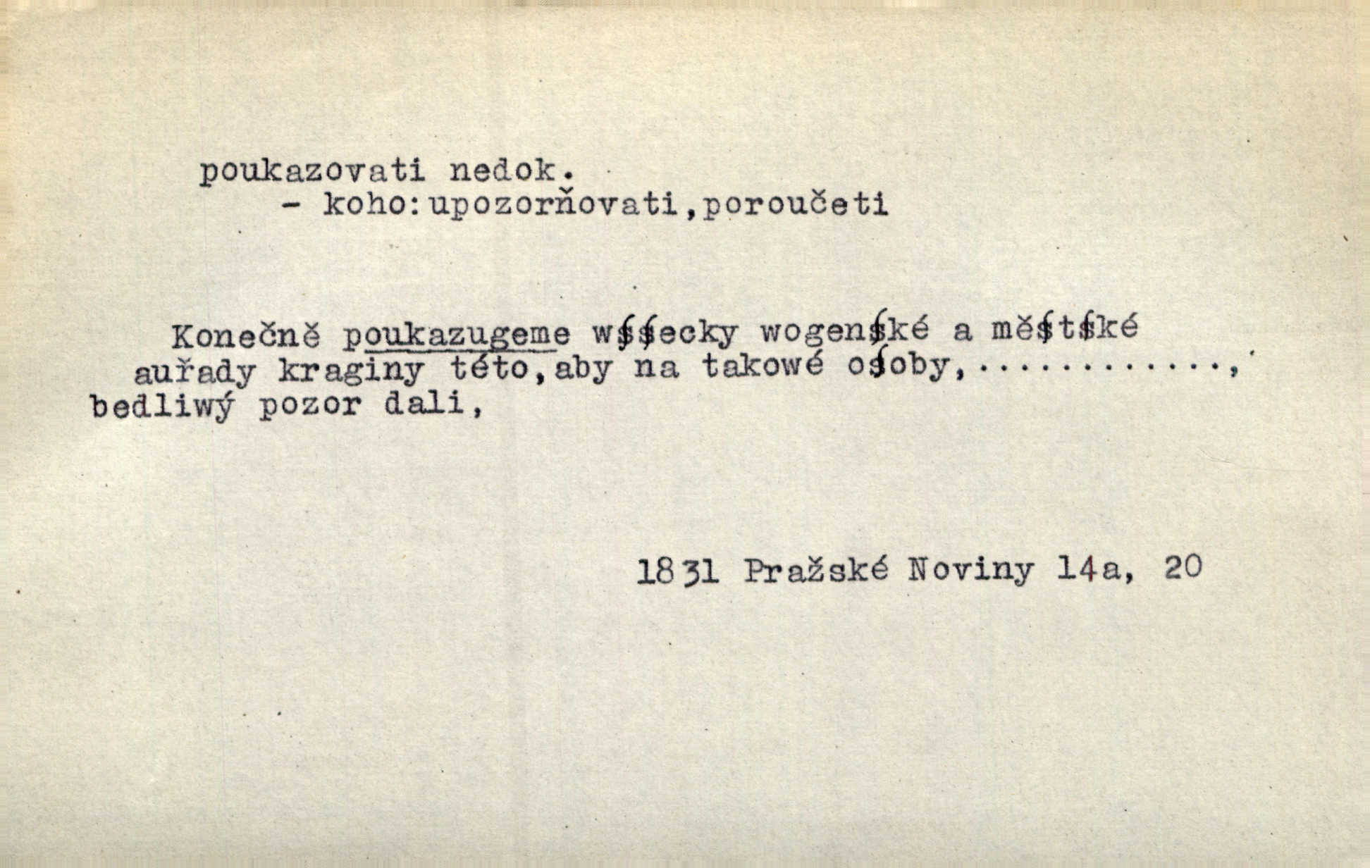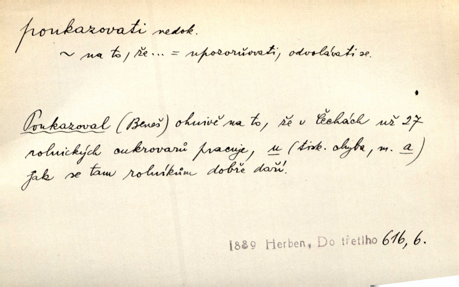 - poukazovati ned. jistým pohybem ruky n. prstu ukazovati. Rozčilil se zas, a poukazuje mokrým šátkem od potu, volal za ním mávaje. V. Mrš. D upozorňovati, obraceti pozornost. Poukazuji p. prokurátora na to, co ukazuje skutečnost. Havl. P. Karásek důrazně poukazoval v „Nivě“, že starší poesie p. Sládkovy jsou neprávem zapomínány. Mach. Poukazuji na motivování, na psychická hnutí u jednotlivých osob. Zey. Z počátku jen jaksi mimochodem na to [pohoršlivé chování žebráků] poukazováno. Arb. D býti dokladem, důkazem, svědectvím něčeho, svědčiti pro něco. Nejstarší listina poukazuje na to, že se dříve v okolí Jílovském zlato ze zlatonosného písku vypíralo. Lum. Prvotiny Máchovy poukazovaly na zcela jiný směr, nežli v jakém se později osvědčil. Sab. D přikazovati. Každý poukazující úřad má koncept poukazu. Předp. zahr. min. Práv. dávati příkaz osobě jiné, aby plnila osobě třetí. Poukazovati výplatu.
