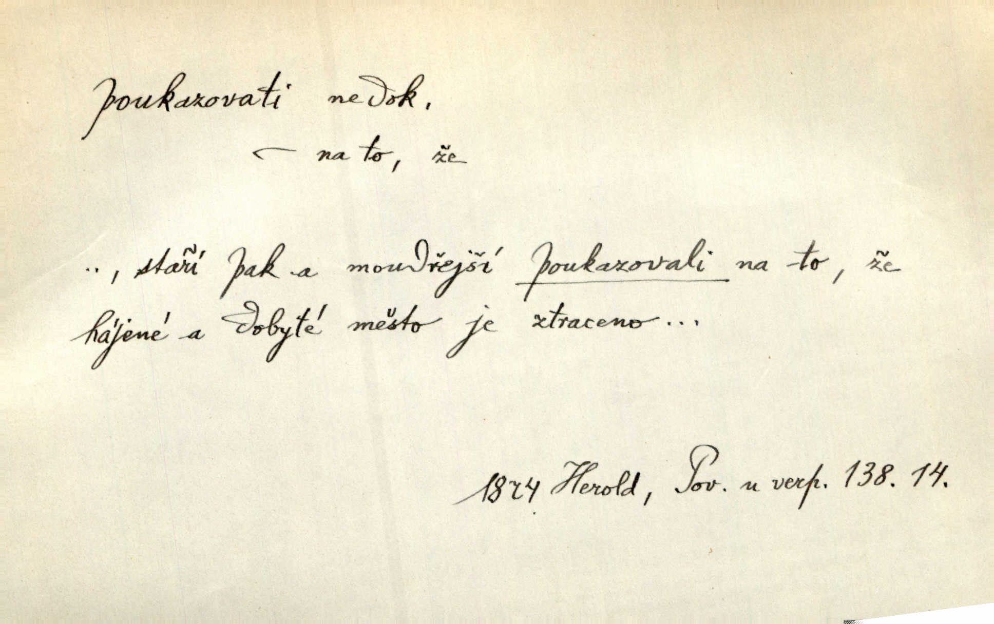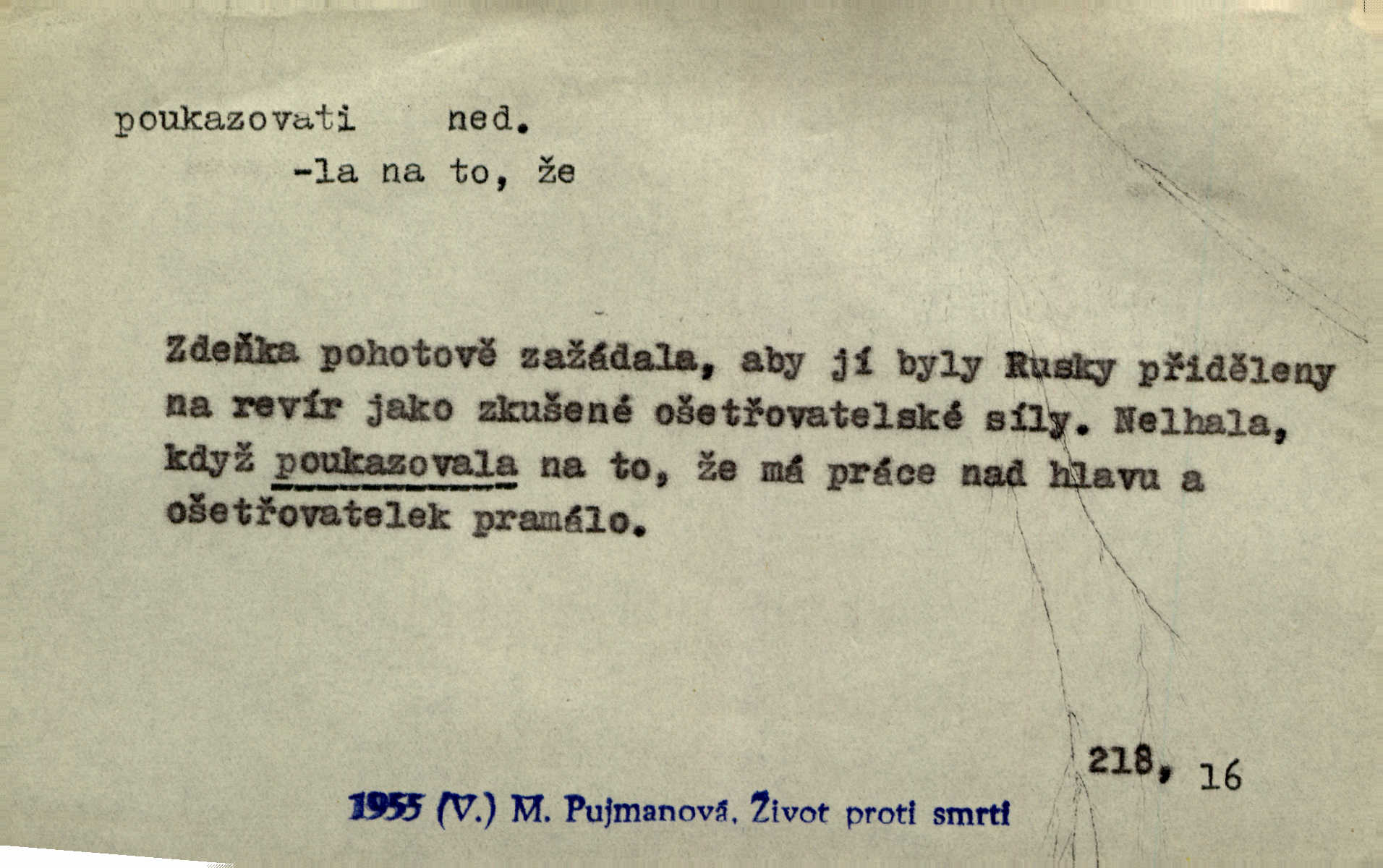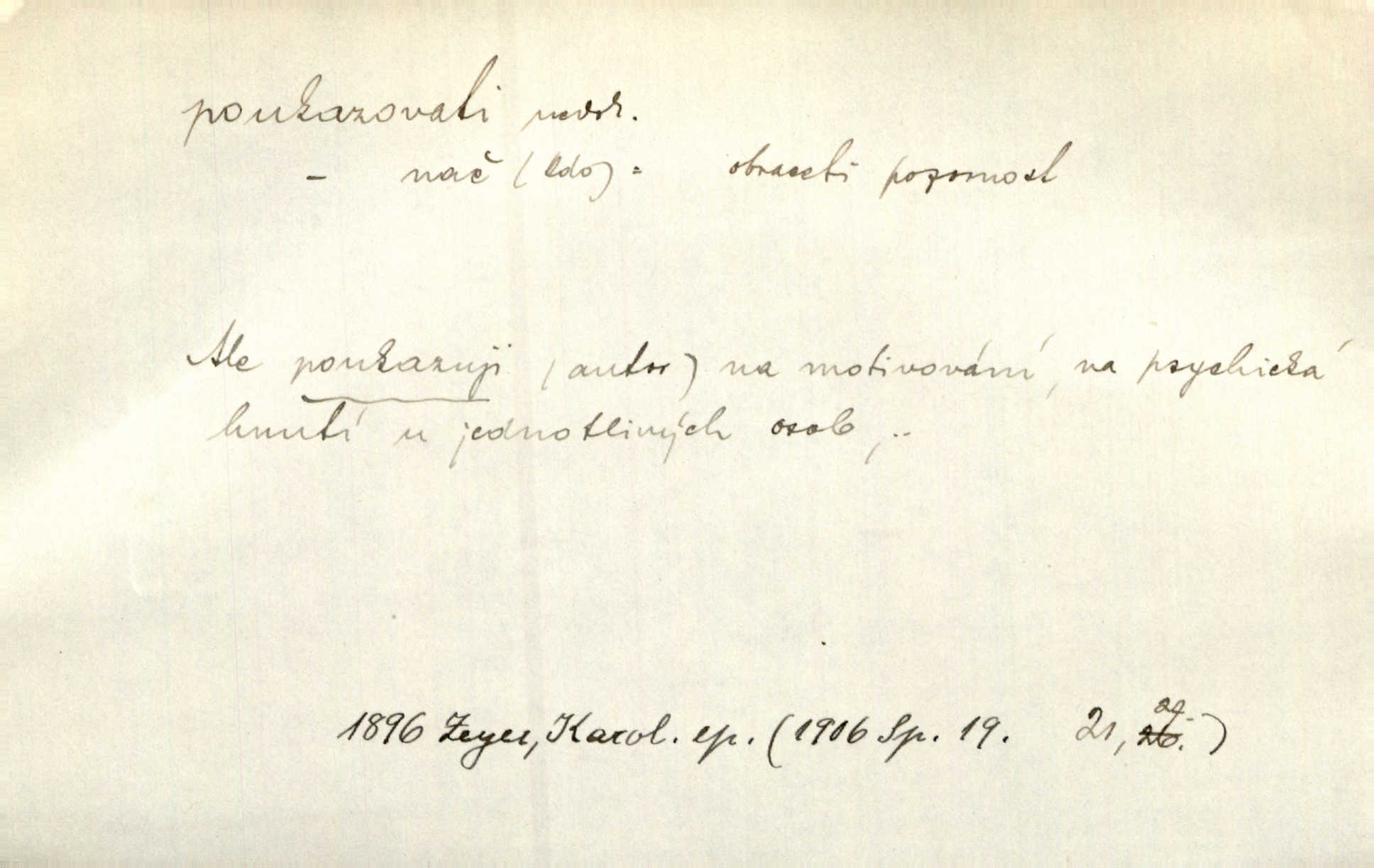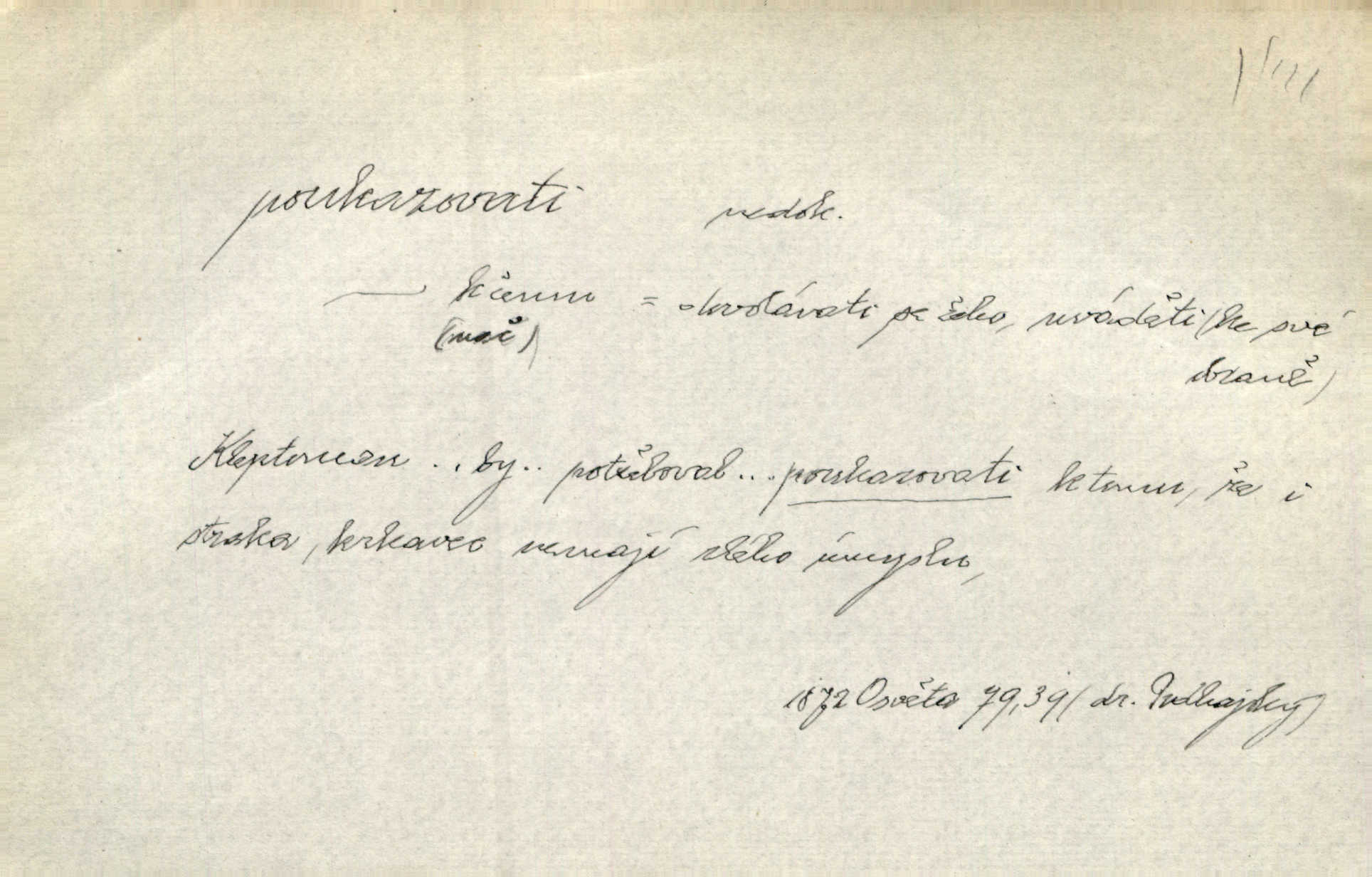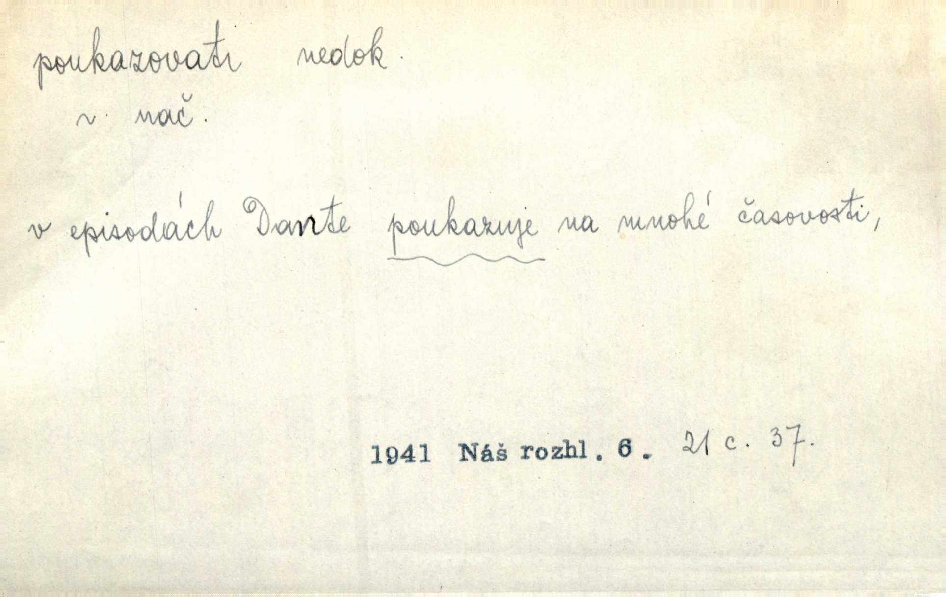 - poukazovati ned. jistým pohybem ruky n. prstu ukazovati. Rozčilil se zas, a poukazuje mokrým šátkem od potu, volal za ním mávaje. V. Mrš. D upozorňovati, obraceti pozornost. Poukazuji p. prokurátora na to, co ukazuje skutečnost. Havl. P. Karásek důrazně poukazoval v „Nivě“, že starší poesie p. Sládkovy jsou neprávem zapomínány. Mach. Poukazuji na motivování, na psychická hnutí u jednotlivých osob. Zey. Z počátku jen jaksi mimochodem na to [pohoršlivé chování žebráků] poukazováno. Arb. D býti dokladem, důkazem, svědectvím něčeho, svědčiti pro něco. Nejstarší listina poukazuje na to, že se dříve v okolí Jílovském zlato ze zlatonosného písku vypíralo. Lum. Prvotiny Máchovy poukazovaly na zcela jiný směr, nežli v jakém se později osvědčil. Sab. D přikazovati. Každý poukazující úřad má koncept poukazu. Předp. zahr. min. Práv. dávati příkaz osobě jiné, aby plnila osobě třetí. Poukazovati výplatu.