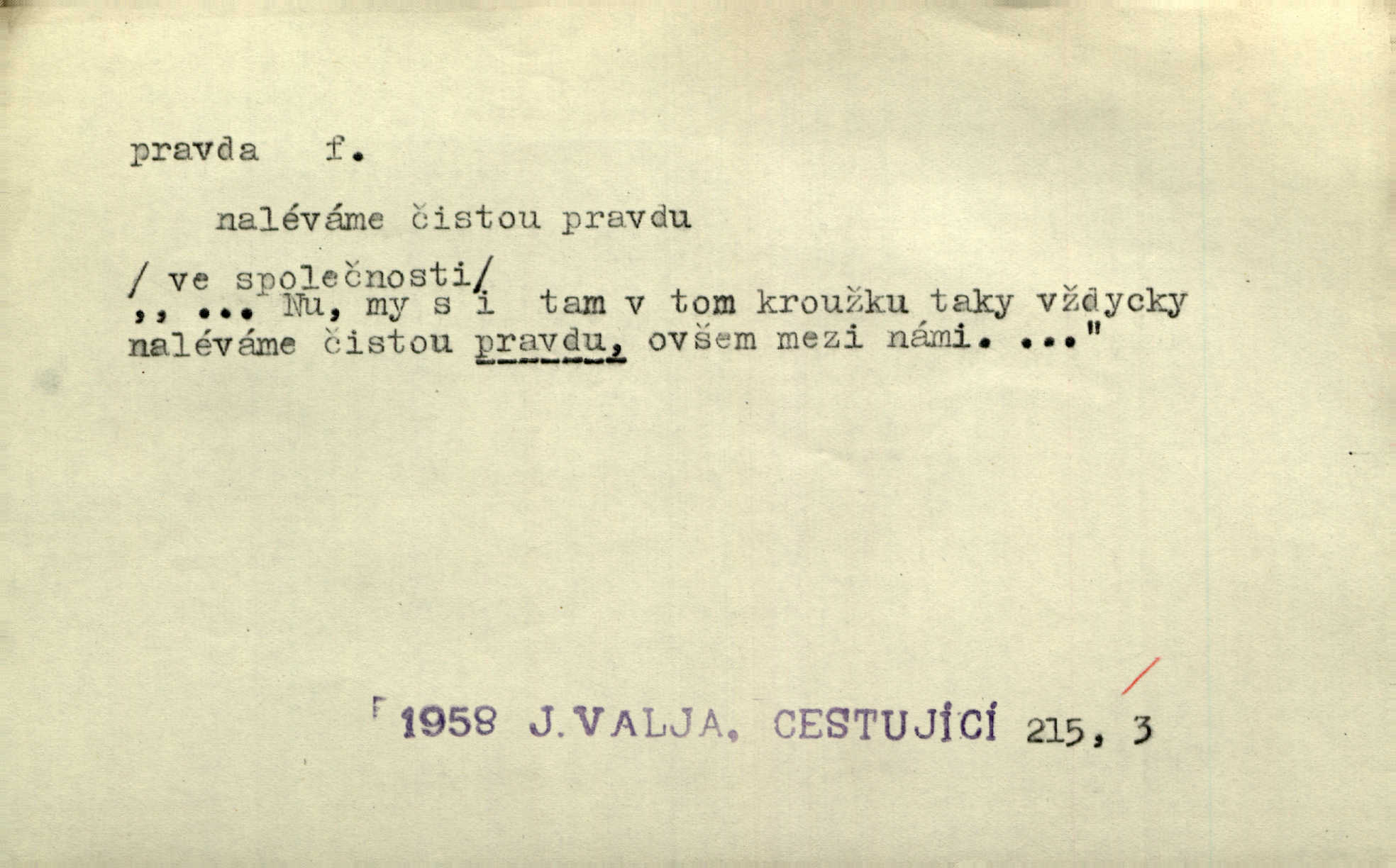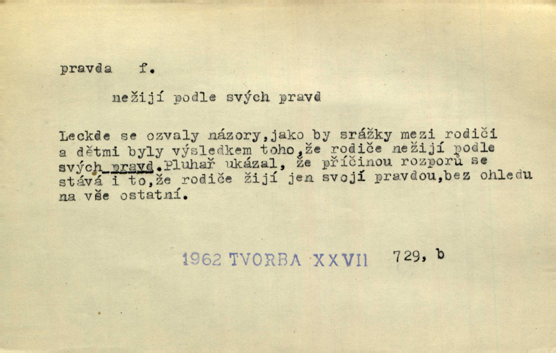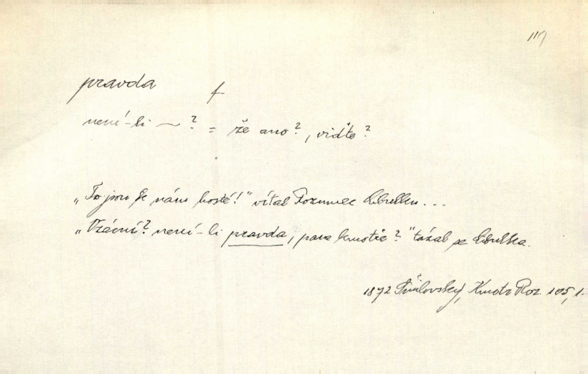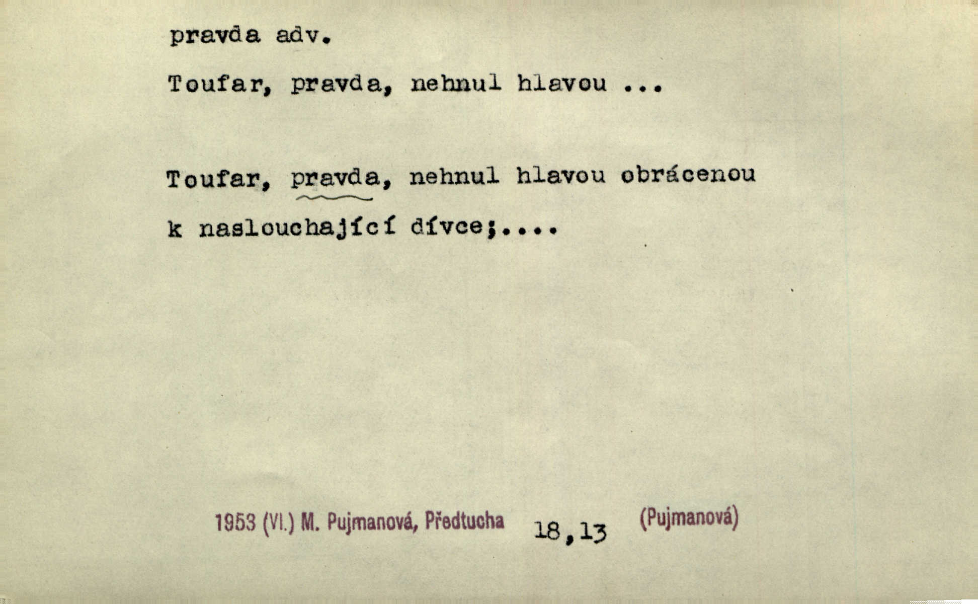 - pravda adv. vyjadřuje souhlas s proneseným míněním, zajisté, ovšem. Pravda, stromy jsou ještě neživé. Marcha. Tvá Milost pravda hned nemůže, je třeba sebrati vojsko. Jir. [Strnádek:] „Dnes vám vzal šunky z komory, zítra vezme pečeni z trouby.“ [Konipas:] „Pravda, pravda.“ Šmil. Má pohádka mi náhle s bohem dává — ach, pravda, starým člověkem jsem zase. Mach. D vyjadřuje dotaz po správnosti proneseného mínění, žádost o souhlas. A chlapeček neplaká, dobře se vyspal, pravda? Herb. Ach, matku moji též jste viděl, pravda? Zey, To je vaše jediňátko, pravda, moje milá? Heyd. Pravda, stařenka mne vždycky chovala? Preis.