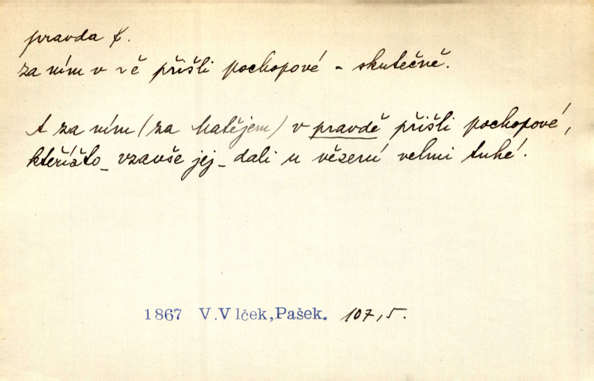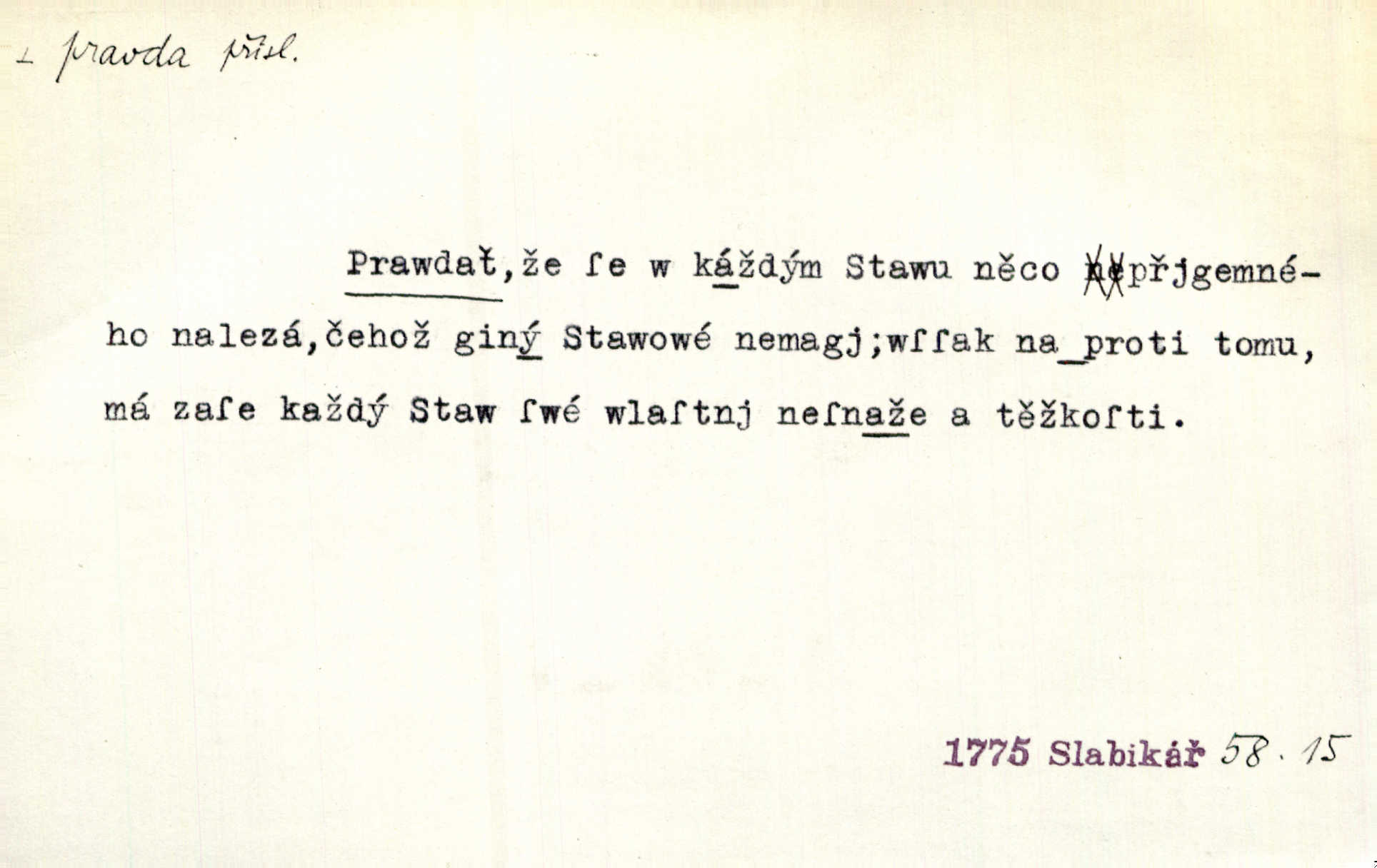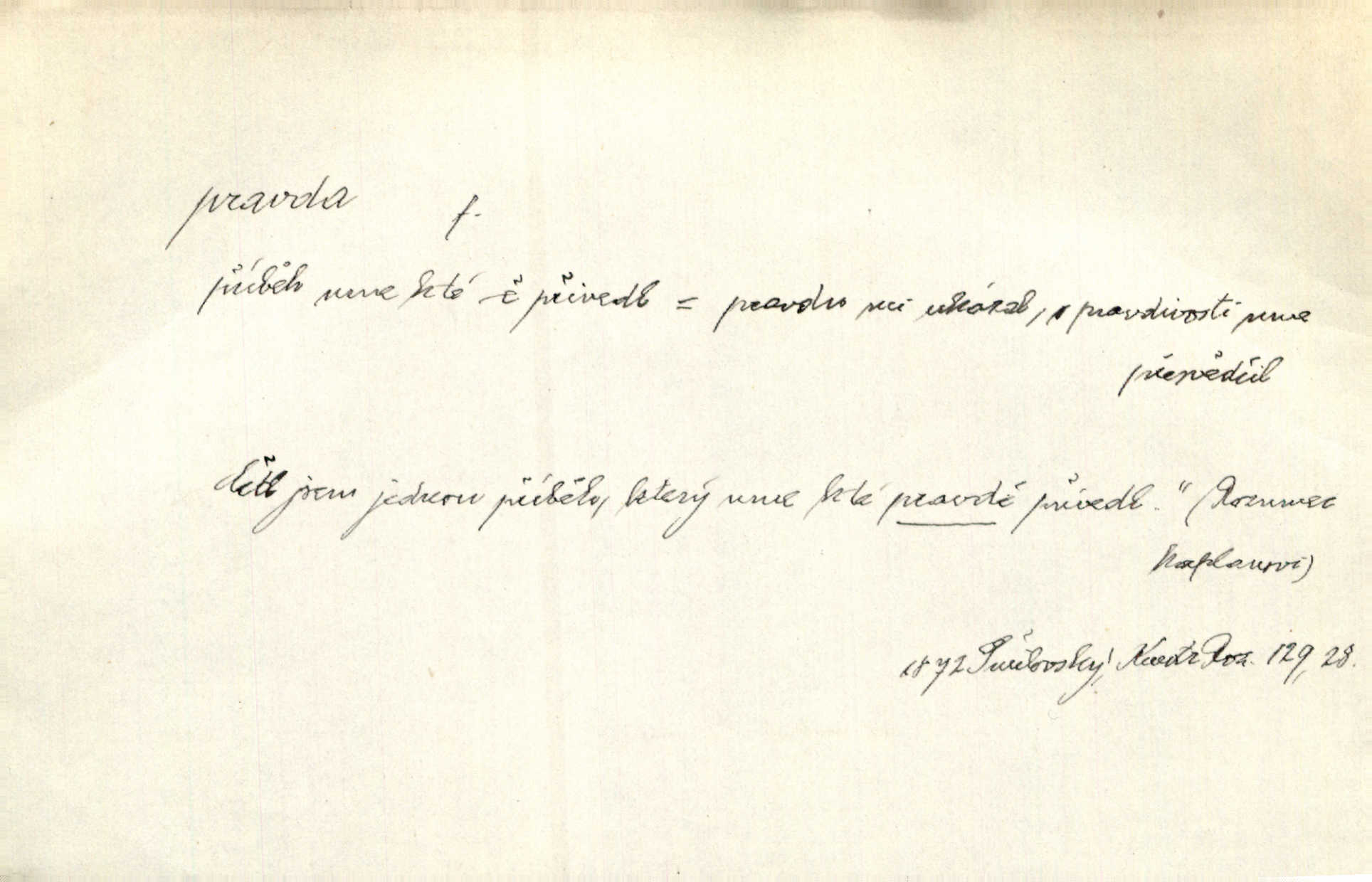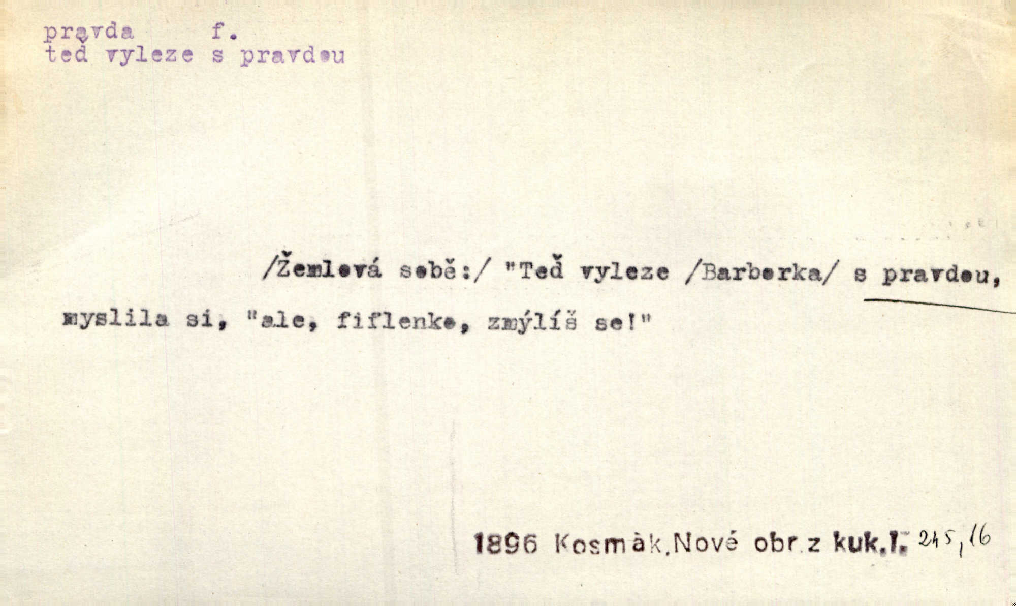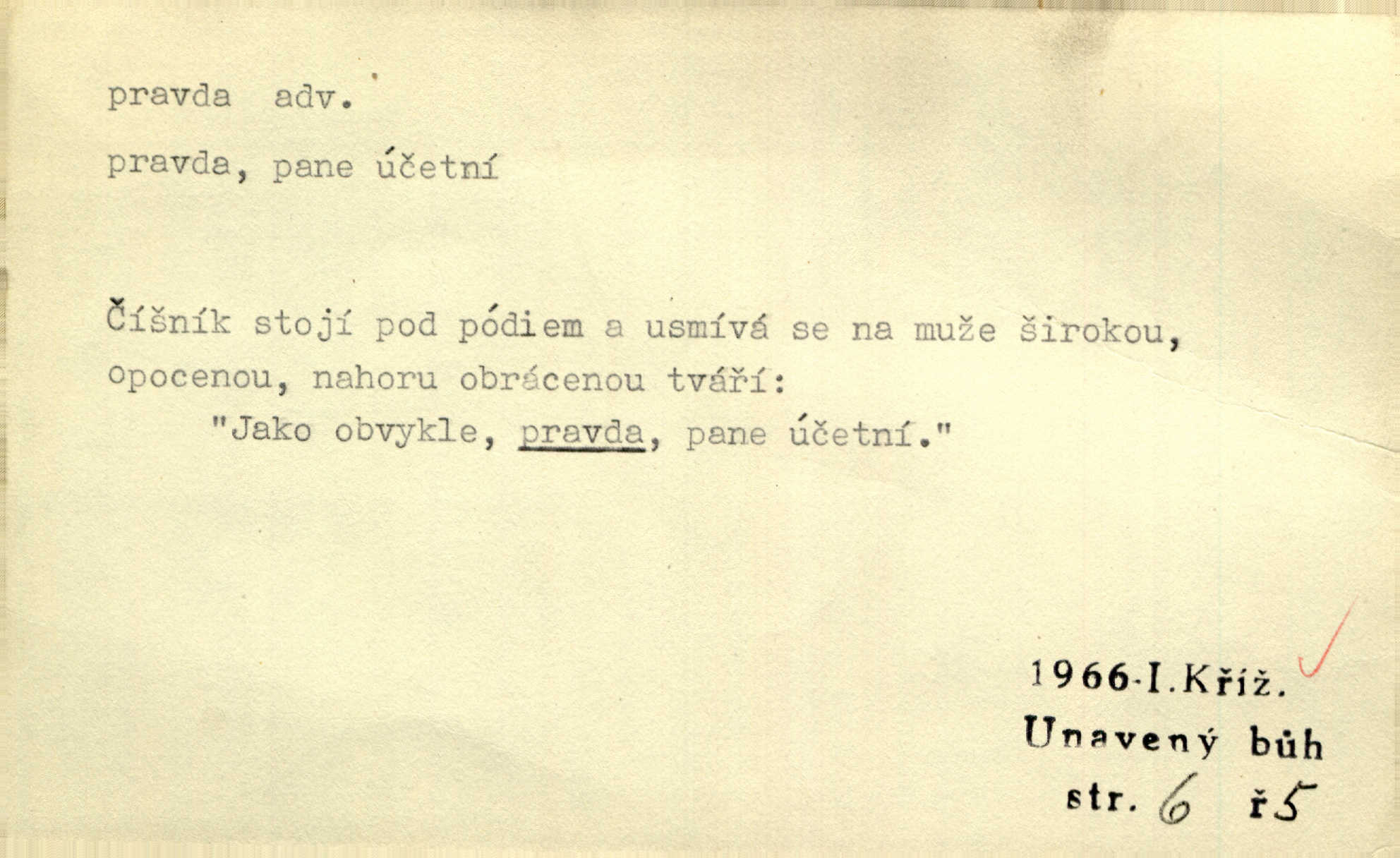 - pravda adv. vyjadřuje souhlas s proneseným míněním, zajisté, ovšem. Pravda, stromy jsou ještě neživé. Marcha. Tvá Milost pravda hned nemůže, je třeba sebrati vojsko. Jir. [Strnádek:] „Dnes vám vzal šunky z komory, zítra vezme pečeni z trouby.“ [Konipas:] „Pravda, pravda.“ Šmil. Má pohádka mi náhle s bohem dává — ach, pravda, starým člověkem jsem zase. Mach. D vyjadřuje dotaz po správnosti proneseného mínění, žádost o souhlas. A chlapeček neplaká, dobře se vyspal, pravda? Herb. Ach, matku moji též jste viděl, pravda? Zey, To je vaše jediňátko, pravda, moje milá? Heyd. Pravda, stařenka mne vždycky chovala? Preis.