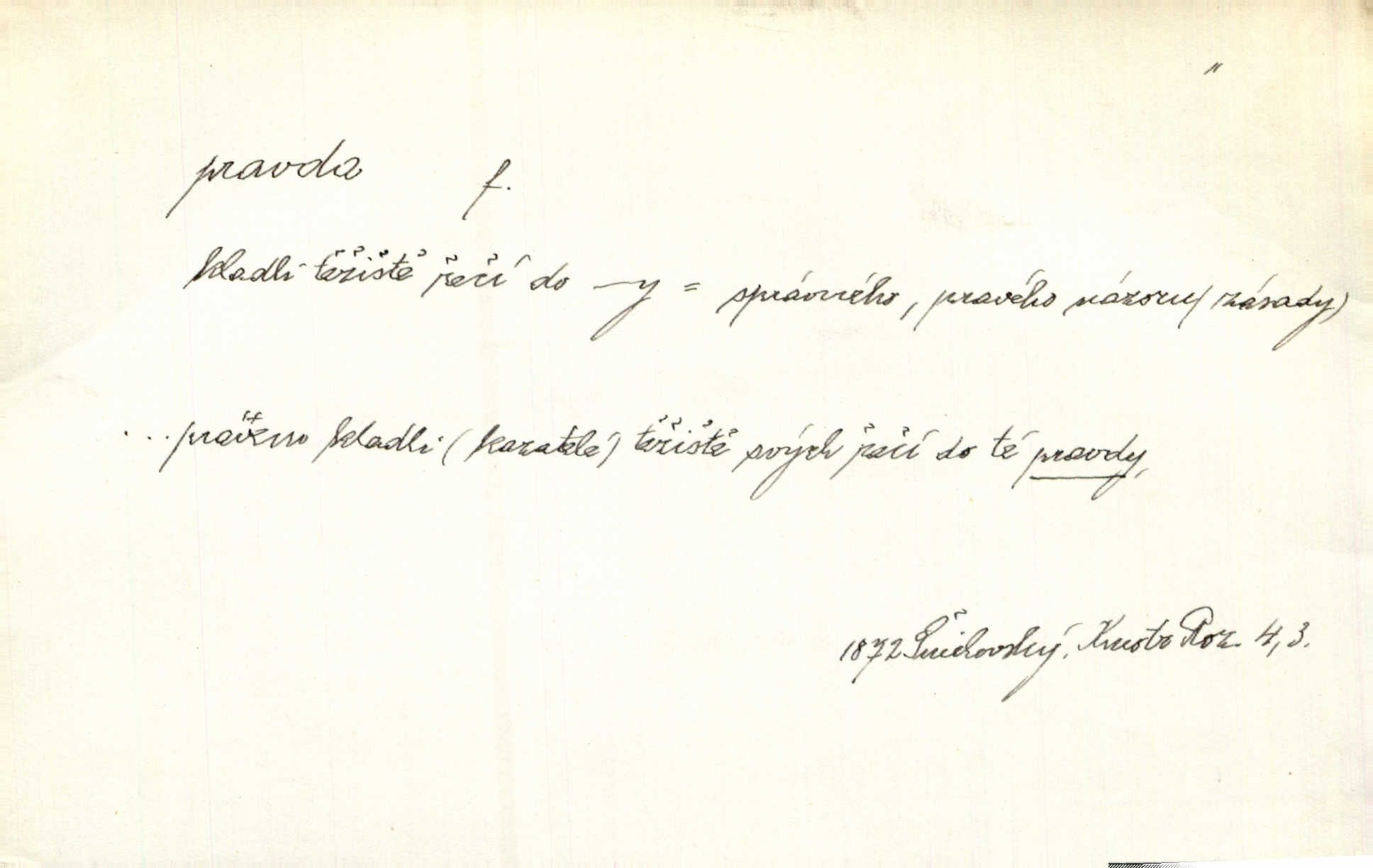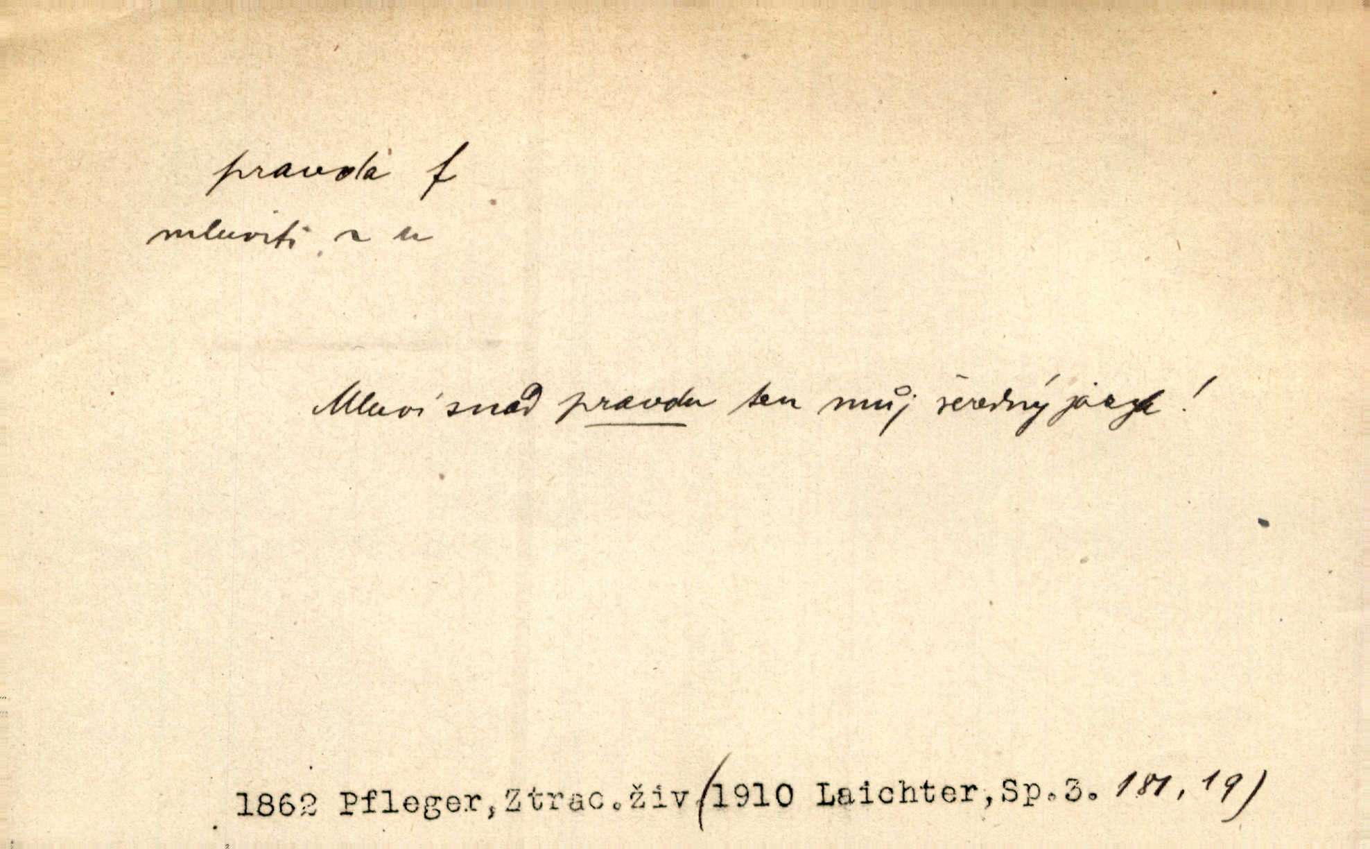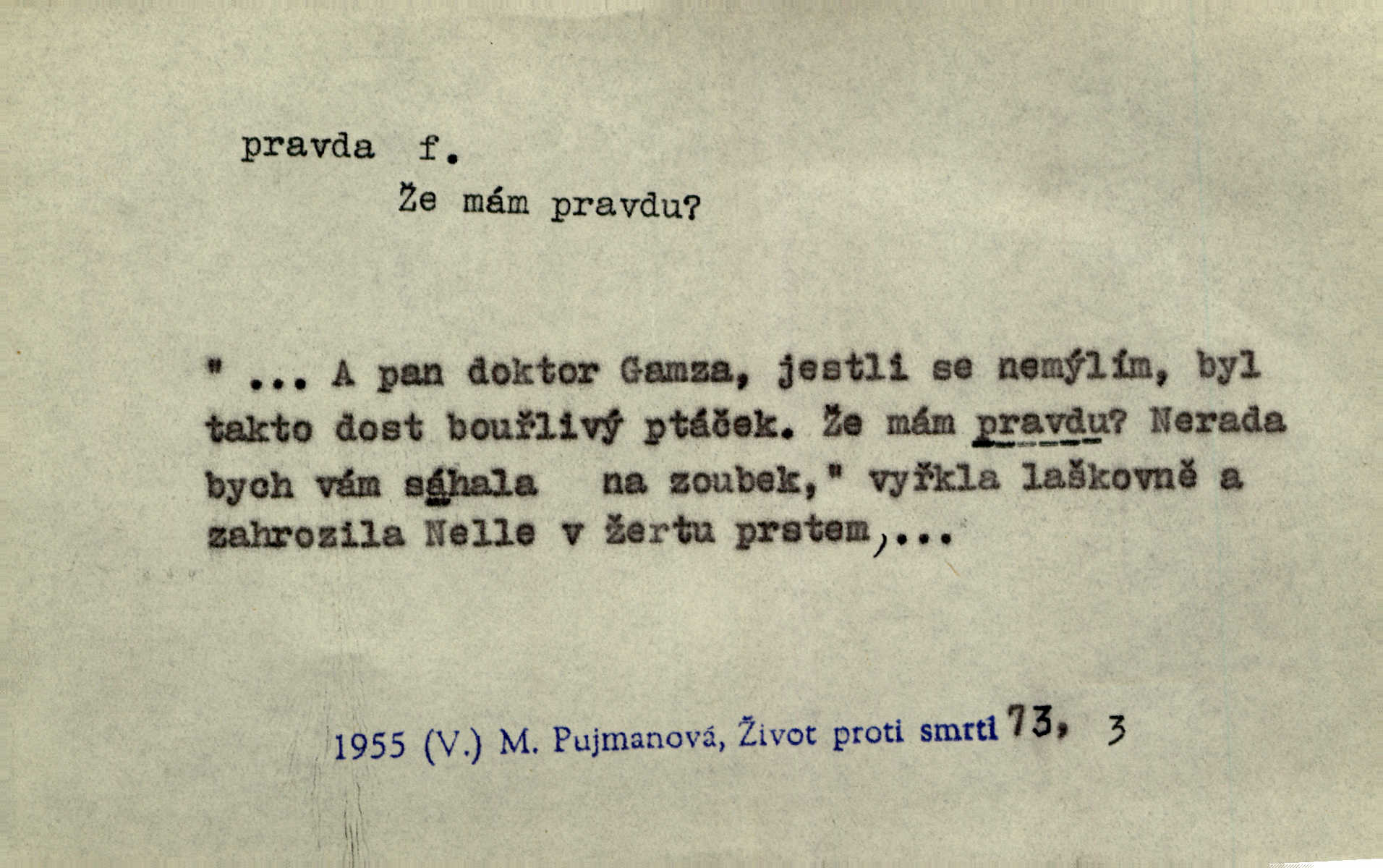 - pravda, -y f. souhlas nějakého tvrzení se skutečností (op. lež). Tělo bratrovo rozsekali na mnoho kusů, a zlatovlasé panně pohrozili smrtí, bude-li pravdu mluviti. Erb. Jádro pravdy v těch řečech spočívalo přece. Třeb. Teď v pamětech svých musím s pravdou ven. Jir. Lékaře uspokojila [pacientova] pravdě podobná odpověď. Svět. Ostatně, on [lékař] jest učený muž, jen co je pravda. Stroup. Odvolávám všecky žaloby proti tomuto pánovi, poněvadž na pravdě se nezakládají. Lier. Pravdou pravdoucí zůstane, že jeho hostinec byl zařízen dosti pěkně. Kos. Pacholek zbledl a dušoval se, že všecko, co řekl, bylo svatá pravda. Jir. Jest s pravdou, že namnoze nejsme přímo vinni [za svou zaostalost]. Lier. Na naši mlčelivost markýzka může spolehnouti; není-li pravda, drahá přítelkyně? Bozd. Nebude zajisté aspoň z části od pravdy, líčí-li [pamětní spis] tehdejší kněžstvo jakožto celkem hrubé a málo vzdělané. Rez. Práv. pravda materielní objektivní souhlas se skutečností; pravda procesní získaná procesním řízením; pravda formální co je uznáno druhou stranou za pravdu; důkaz pravdy. D pravdivé tvrzení, pravdivý výrok, pravdivá zásada. Velké pravdy slýcháme z úst dětských. Bozd. Nelze klasy vzácných pravd a rad ti na těch stránkách bujně předkládat. Mach. D pravda (Boží) souhrn křesťanských nauk, zjevení. Toho bůh nedej, abych já pro krátké muky zradil pravdu svaté víry křesťanské! Pal. Vznešena byla k mistrům učení pražského otázka, zdali obci křesťanské pro pravdu boží válčiti lze. Goll. D správné smýšlení, správný názor. Máš pravdu, příteli, to pivo je dobré. Havl. V jednom byl přece šlechetný jeho přítel ve pravdě. Šmil. Sedláci, dokud císař žil, často dovolávali se této pomoci [soudu proti vrchnosti] a dostávali nejednou za pravdu. Herb. Když za prázdných chvil důkladněji věty tetiny rozbírala, nemohla jí nedávati pravdu. Šmil. Dívka mu za pravdu dáti musila. Bozd. Pes zahleděl se na hosta a vrtěl velkým ohonem. „Ořech — na mou pravdu, je to Ořech — a poznal mne.“ Rais. Račte na dobrou pravdu nám říci: co by vám se lépe zpívalo. Kos. Filos. pravda (objektivní) shoda myšlení se skutečností; pravda subjektivní přesvědčení o souhlase myšlení (výroku) se skutečností. D skutečnost, opravdivost. Antoš slyšel cestou, že udělali ještědští hoši přec jen ze žertu pravdu, Sylva byla od nich žalována a pokutována. Svět. Nevěděla, byl-li to sen anebo pravda. Jir. Včerejší jeho proroctví o dobrém lovu začalo záhy v pravdu přecházet. Tyl. Jsou to roky, když jsem byl ve vašich letech! Zdá se, jako by to už ani pravda nebyla. M. Jahn. Takž mohl po pravdě otec Alexův synu svému vyčísti záhubné zábavy podle pravdy, skutečnosti. Pfleg. Nějaké neprozřetelné slůvko nabylo zřetelnosti, které po pravdě nemělo ve skutečnosti. Šrám. Adam počal zase blázniti, napřed jen v žertu a v dobrotě, až pak se to do pravdy dostalo. Prav. Paní doktorová se při tom smála, ale dědeček viděl, že to mluví do pravdy doopravdy. Rais. Podívav se stranou na smíšky, jimž pověděl do pravdy, hrdě s matkou vyšel dal co proto. Rais. Pubička bral důvody své proti pravdě listiny Boleslavovy jen ze známek zevnějších pravosti. Pal. D právo, spravedlnost. Otec byl už hromadu let na pravdě boží mrtev. Rais. Už jsou, chudáci, na pravdě boží oba. Šim.