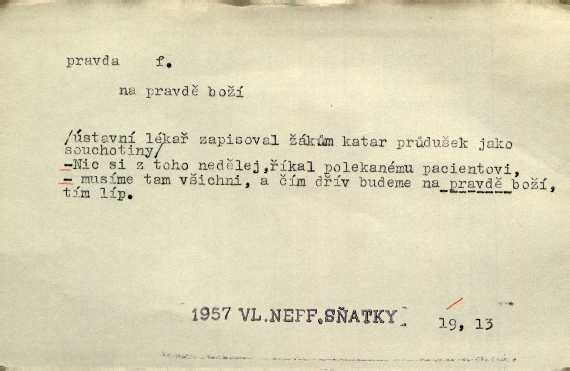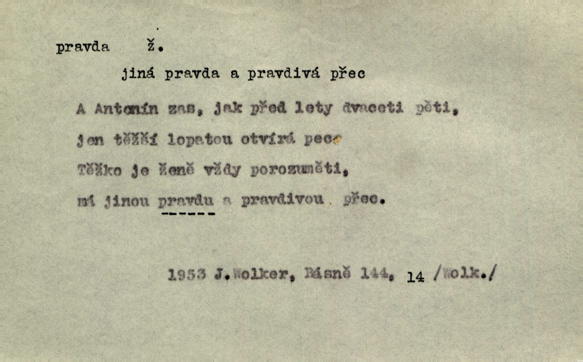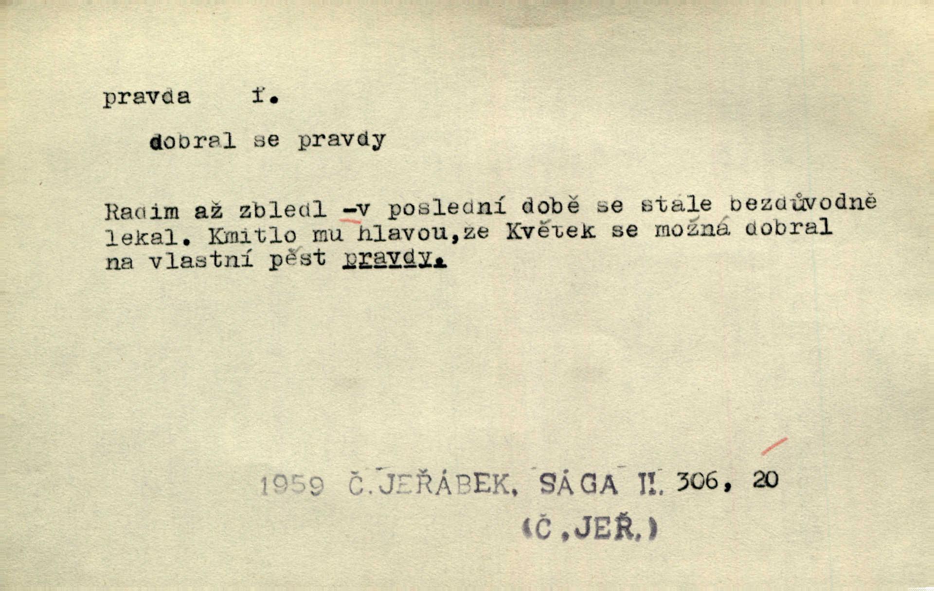 - pravda, -y f. souhlas nějakého tvrzení se skutečností (op. lež). Tělo bratrovo rozsekali na mnoho kusů, a zlatovlasé panně pohrozili smrtí, bude-li pravdu mluviti. Erb. Jádro pravdy v těch řečech spočívalo přece. Třeb. Teď v pamětech svých musím s pravdou ven. Jir. Lékaře uspokojila [pacientova] pravdě podobná odpověď. Svět. Ostatně, on [lékař] jest učený muž, jen co je pravda. Stroup. Odvolávám všecky žaloby proti tomuto pánovi, poněvadž na pravdě se nezakládají. Lier. Pravdou pravdoucí zůstane, že jeho hostinec byl zařízen dosti pěkně. Kos. Pacholek zbledl a dušoval se, že všecko, co řekl, bylo svatá pravda. Jir. Jest s pravdou, že namnoze nejsme přímo vinni [za svou zaostalost]. Lier. Na naši mlčelivost markýzka může spolehnouti; není-li pravda, drahá přítelkyně? Bozd. Nebude zajisté aspoň z části od pravdy, líčí-li [pamětní spis] tehdejší kněžstvo jakožto celkem hrubé a málo vzdělané. Rez. Práv. pravda materielní objektivní souhlas se skutečností; pravda procesní získaná procesním řízením; pravda formální co je uznáno druhou stranou za pravdu; důkaz pravdy. D pravdivé tvrzení, pravdivý výrok, pravdivá zásada. Velké pravdy slýcháme z úst dětských. Bozd. Nelze klasy vzácných pravd a rad ti na těch stránkách bujně předkládat. Mach. D pravda (Boží) souhrn křesťanských nauk, zjevení. Toho bůh nedej, abych já pro krátké muky zradil pravdu svaté víry křesťanské! Pal. Vznešena byla k mistrům učení pražského otázka, zdali obci křesťanské pro pravdu boží válčiti lze. Goll. D správné smýšlení, správný názor. Máš pravdu, příteli, to pivo je dobré. Havl. V jednom byl přece šlechetný jeho přítel ve pravdě. Šmil. Sedláci, dokud císař žil, často dovolávali se této pomoci [soudu proti vrchnosti] a dostávali nejednou za pravdu. Herb. Když za prázdných chvil důkladněji věty tetiny rozbírala, nemohla jí nedávati pravdu. Šmil. Dívka mu za pravdu dáti musila. Bozd. Pes zahleděl se na hosta a vrtěl velkým ohonem. „Ořech — na mou pravdu, je to Ořech — a poznal mne.“ Rais. Račte na dobrou pravdu nám říci: co by vám se lépe zpívalo. Kos. Filos. pravda (objektivní) shoda myšlení se skutečností; pravda subjektivní přesvědčení o souhlase myšlení (výroku) se skutečností. D skutečnost, opravdivost. Antoš slyšel cestou, že udělali ještědští hoši přec jen ze žertu pravdu, Sylva byla od nich žalována a pokutována. Svět. Nevěděla, byl-li to sen anebo pravda. Jir. Včerejší jeho proroctví o dobrém lovu začalo záhy v pravdu přecházet. Tyl. Jsou to roky, když jsem byl ve vašich letech! Zdá se, jako by to už ani pravda nebyla. M. Jahn. Takž mohl po pravdě otec Alexův synu svému vyčísti záhubné zábavy podle pravdy, skutečnosti. Pfleg. Nějaké neprozřetelné slůvko nabylo zřetelnosti, které po pravdě nemělo ve skutečnosti. Šrám. Adam počal zase blázniti, napřed jen v žertu a v dobrotě, až pak se to do pravdy dostalo. Prav. Paní doktorová se při tom smála, ale dědeček viděl, že to mluví do pravdy doopravdy. Rais. Podívav se stranou na smíšky, jimž pověděl do pravdy, hrdě s matkou vyšel dal co proto. Rais. Pubička bral důvody své proti pravdě listiny Boleslavovy jen ze známek zevnějších pravosti. Pal. D právo, spravedlnost. Otec byl už hromadu let na pravdě boží mrtev. Rais. Už jsou, chudáci, na pravdě boží oba. Šim.