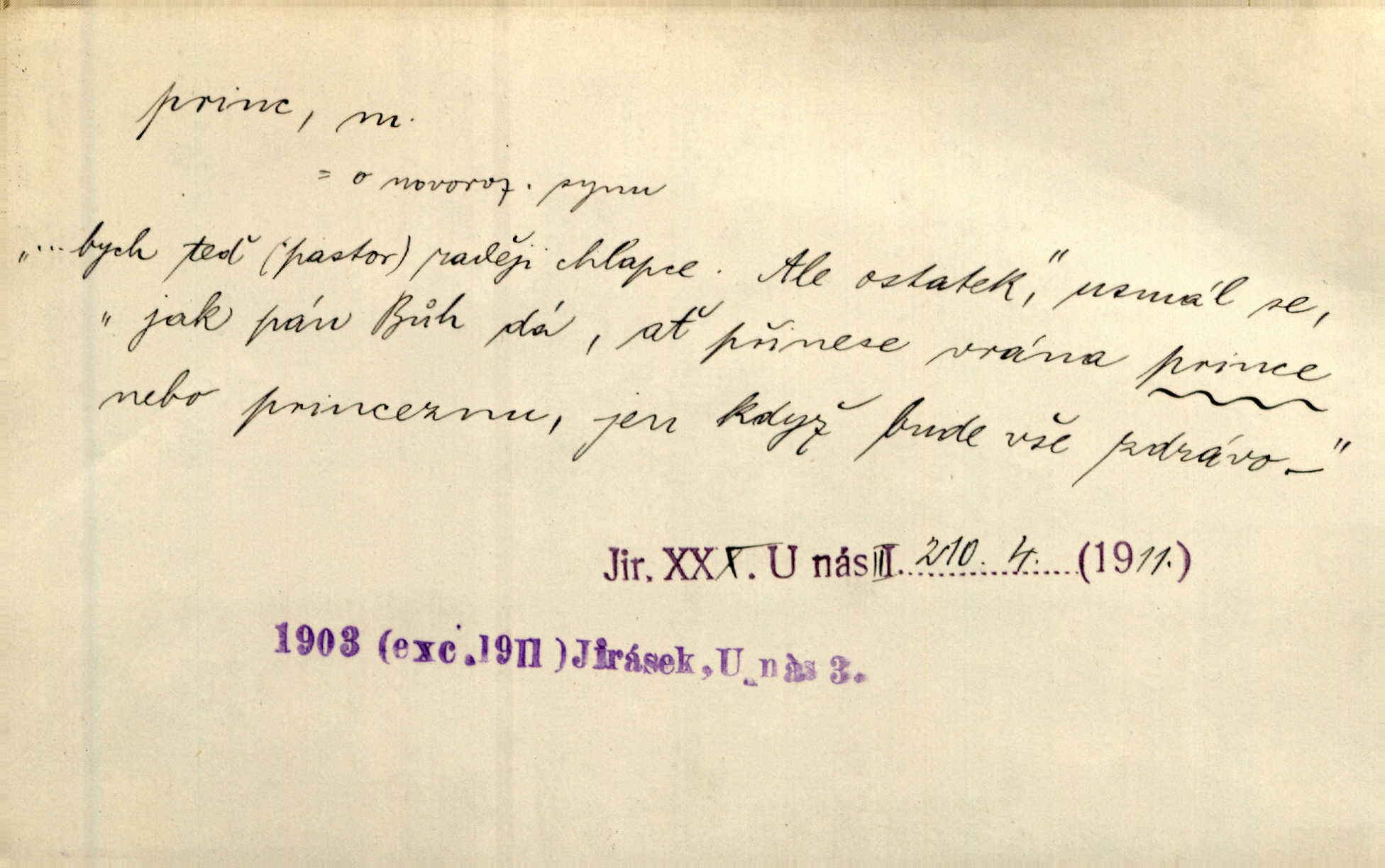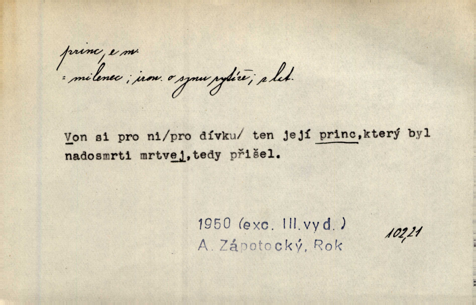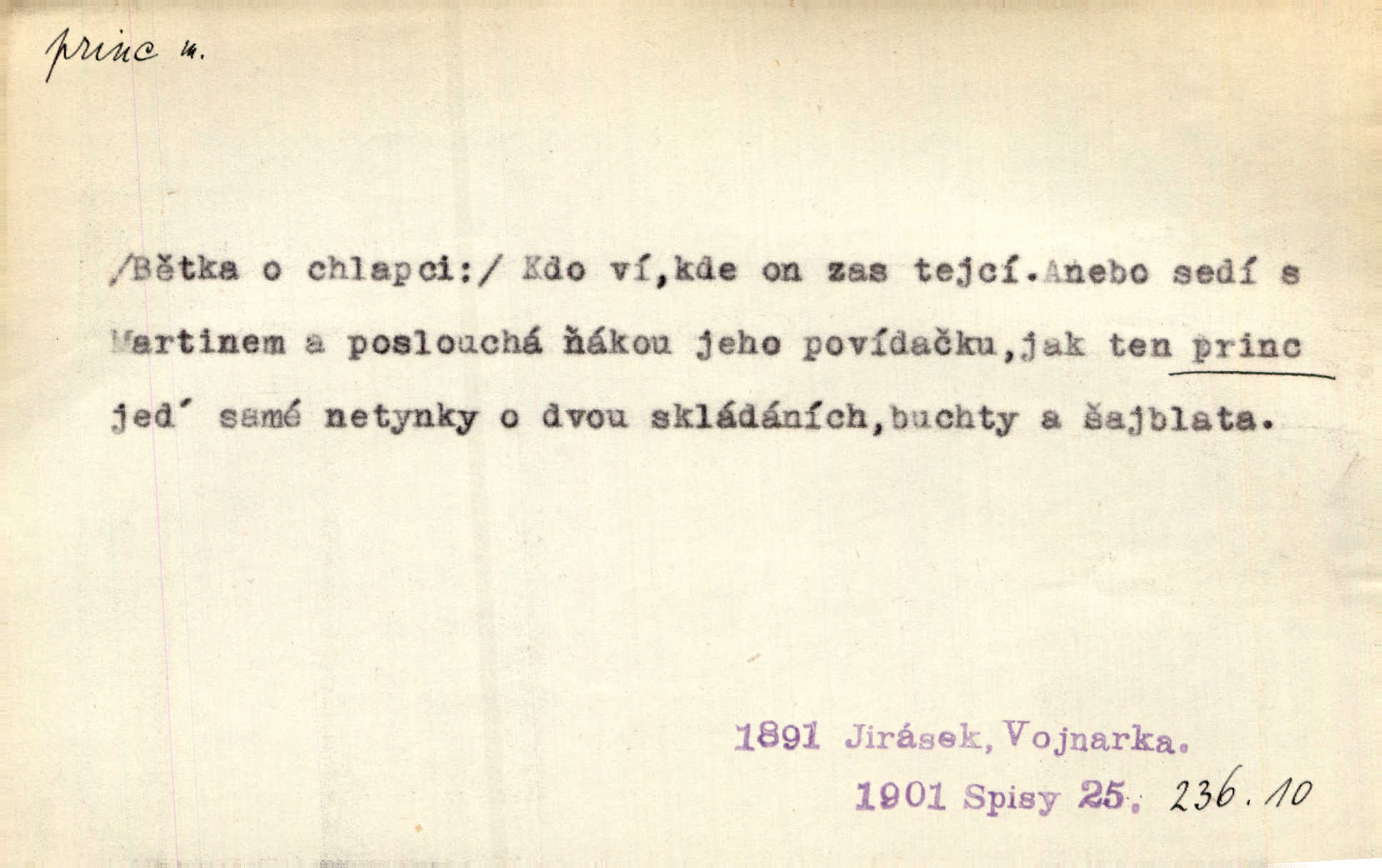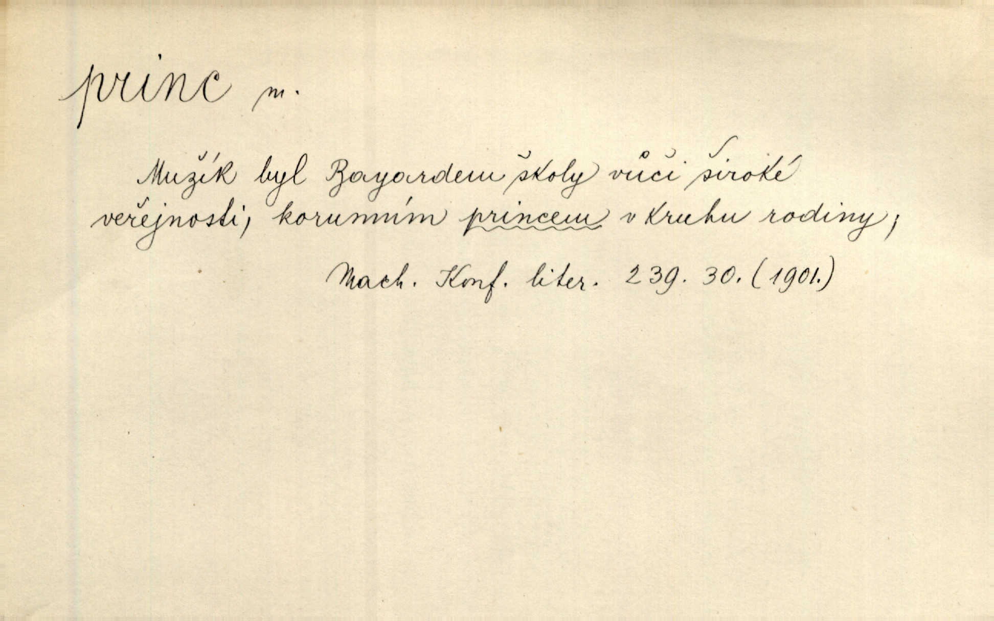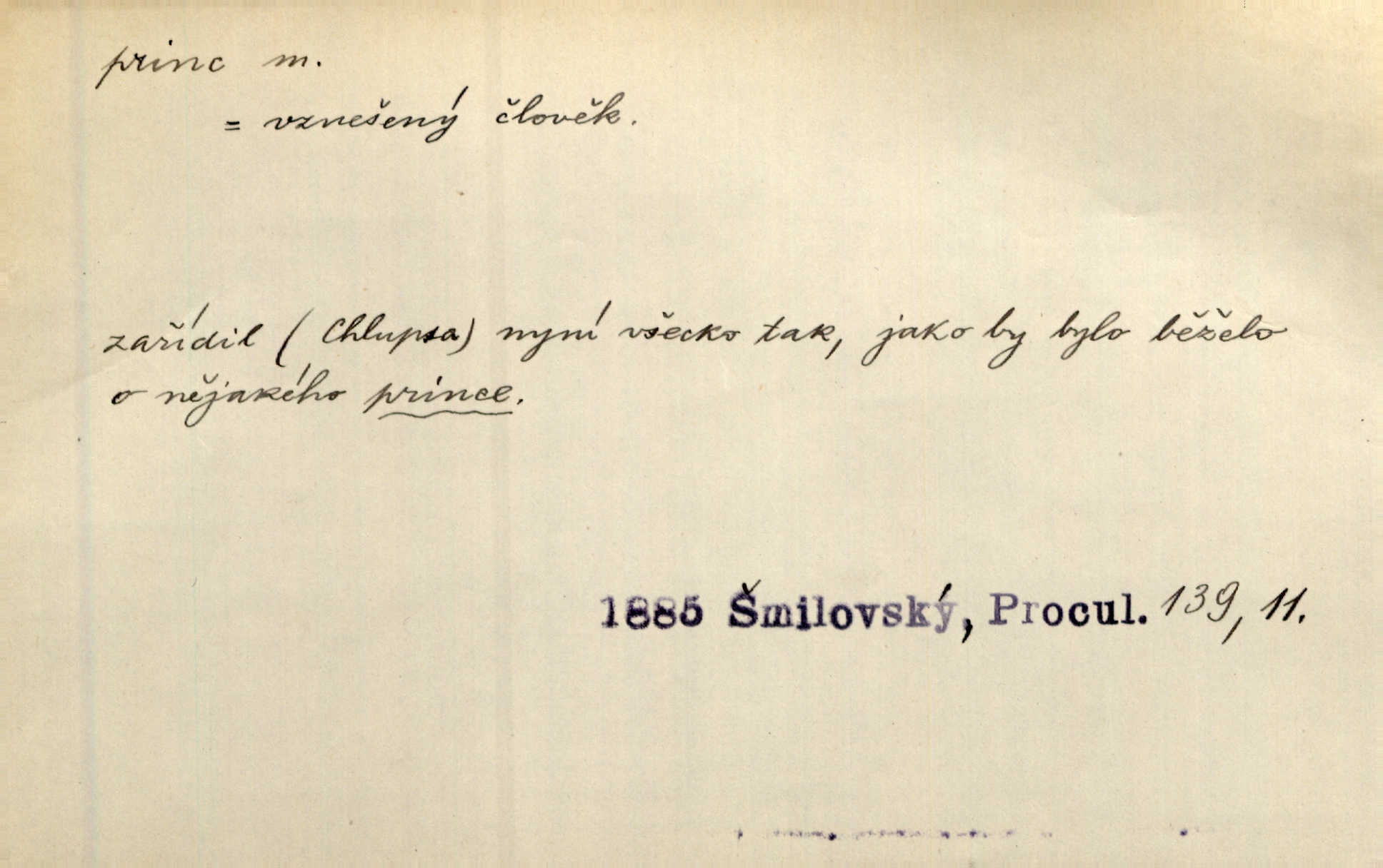 - princ, -e m. nepanující mužský člen panovnického n. knížecího rodu. Korunní princ následník trůnu. Slyšel jste o Budhovi? To byl dokonce královský princ. Vach. Pozvali si mladého pana knížete na hon, aby se měli čím pochlubit; princ přijel, ale na srnce po několik nocí marně číhal. Staš. Jdu do lesa a vesel jak princ z pohádky se vracím. Heyd. Domů se vrátila zářící a veselá, jakoby pro ni byl přišel princ. V. Mrš. Ženy a spanilé děvy dostavily se v hojném počtu, aby holdovaly princi Karnevallu tančily. Lier. D Hypok. synáček. Tonička má prince, slyšíte, hocha jako malinu! Rais. Tatínek, ač chce-li mít se svým princem dobrou vůli, běží koupit mu koníka. Bes.