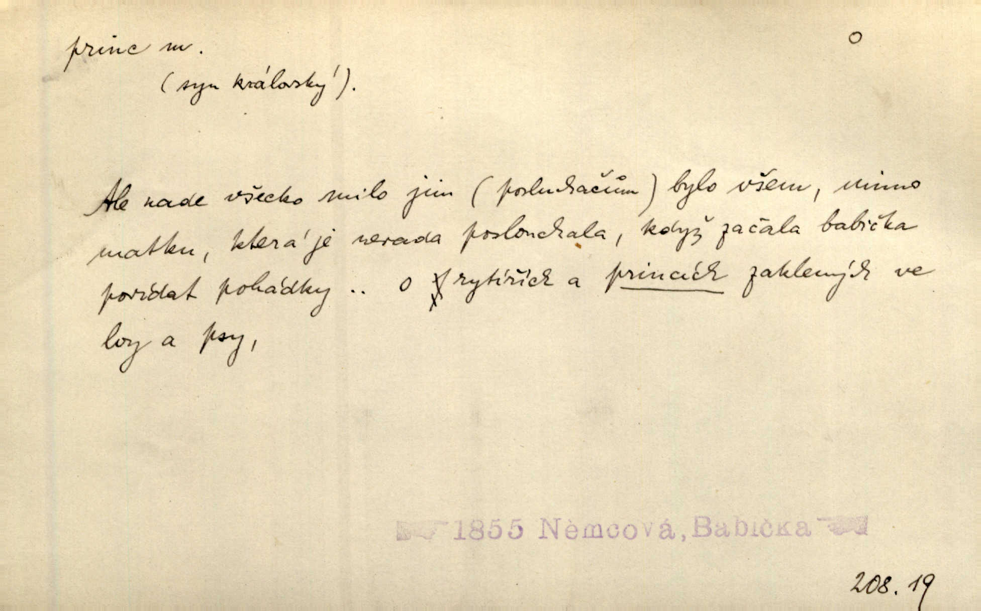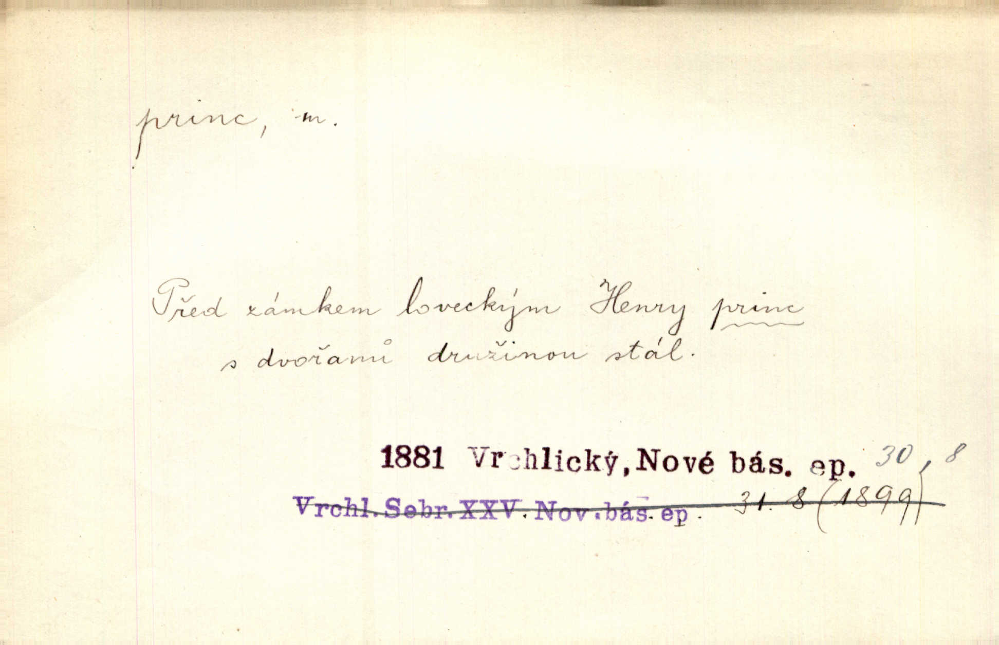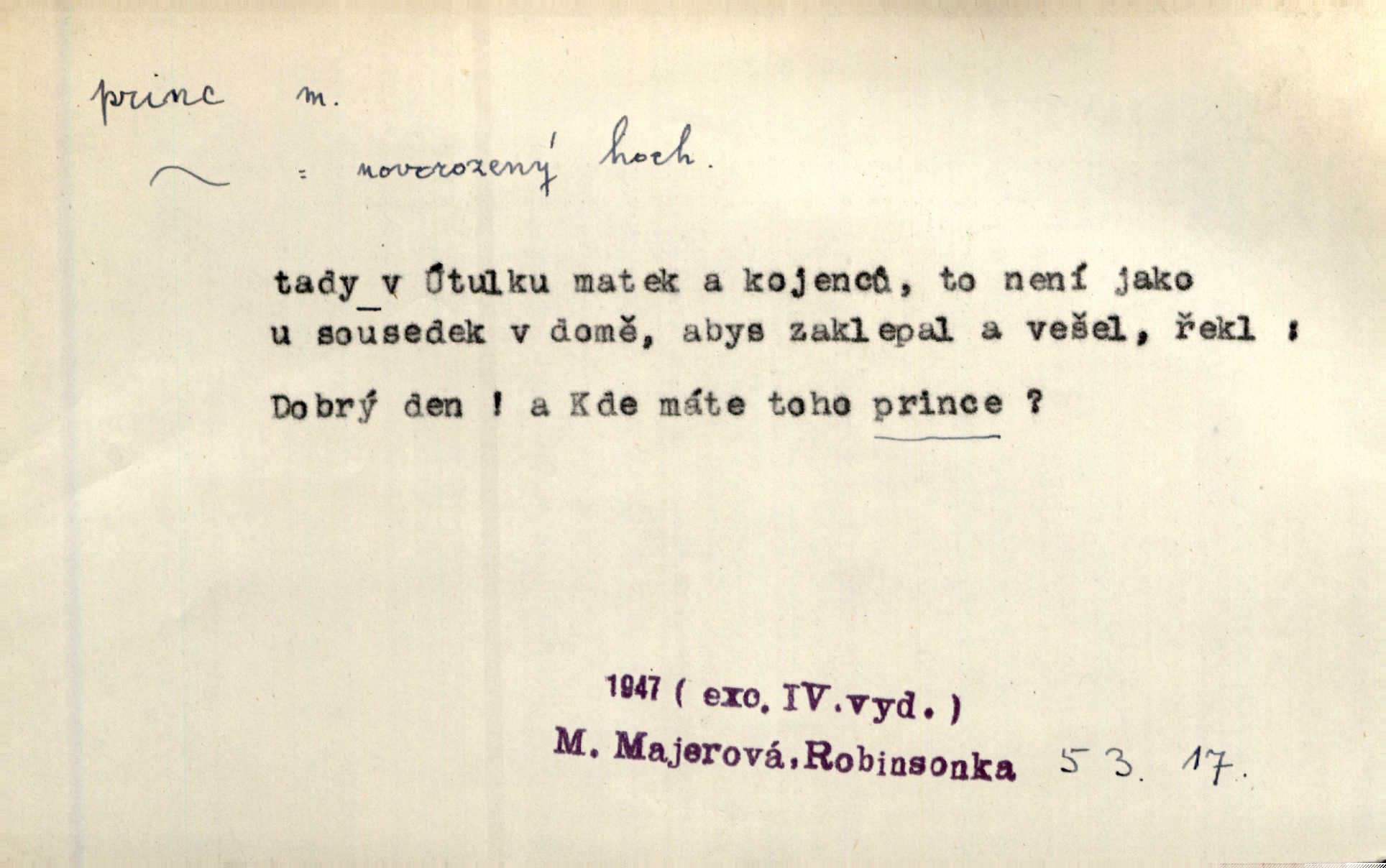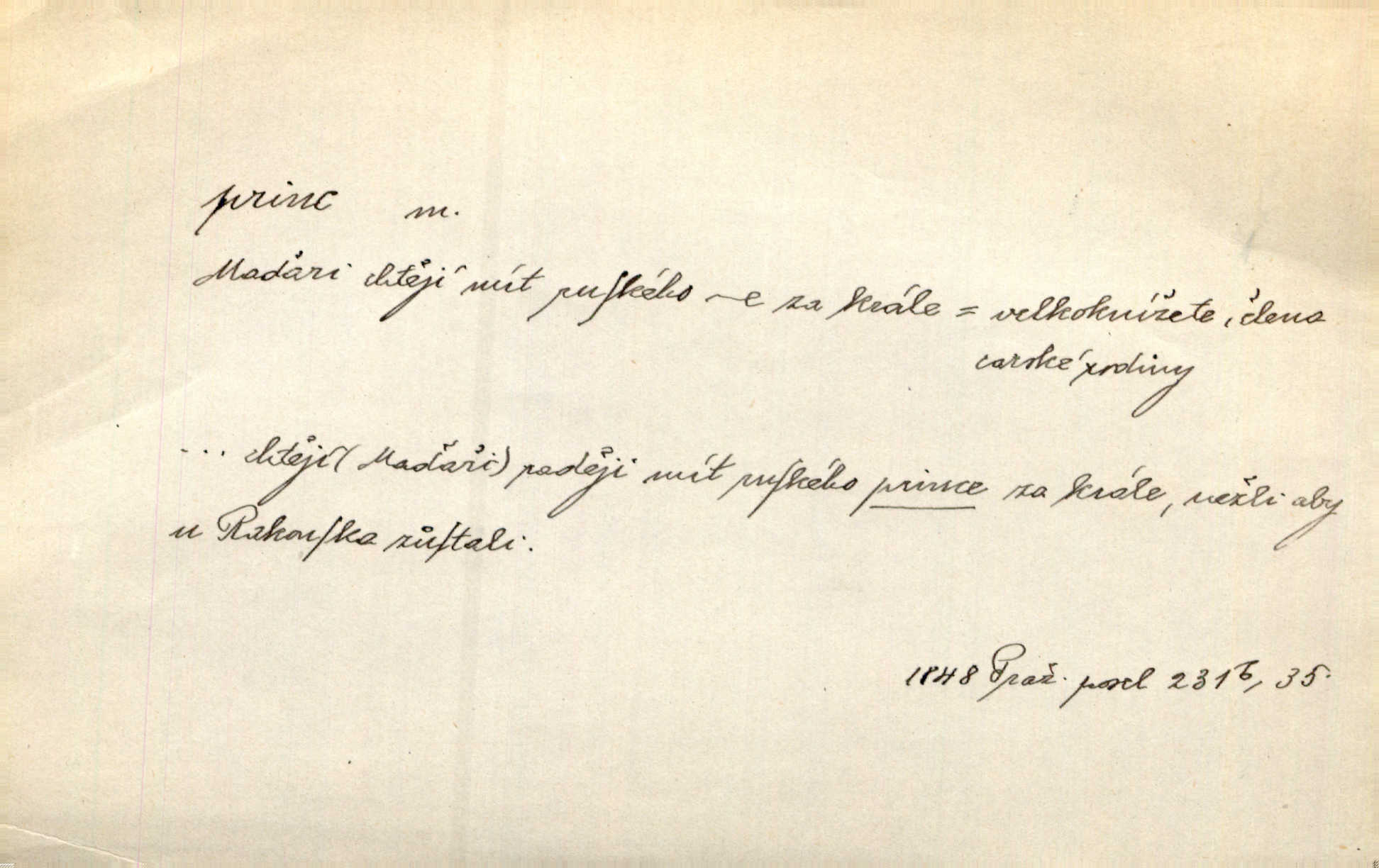 - princ, -e m. nepanující mužský člen panovnického n. knížecího rodu. Korunní princ následník trůnu. Slyšel jste o Budhovi? To byl dokonce královský princ. Vach. Pozvali si mladého pana knížete na hon, aby se měli čím pochlubit; princ přijel, ale na srnce po několik nocí marně číhal. Staš. Jdu do lesa a vesel jak princ z pohádky se vracím. Heyd. Domů se vrátila zářící a veselá, jakoby pro ni byl přišel princ. V. Mrš. Ženy a spanilé děvy dostavily se v hojném počtu, aby holdovaly princi Karnevallu tančily. Lier. D Hypok. synáček. Tonička má prince, slyšíte, hocha jako malinu! Rais. Tatínek, ač chce-li mít se svým princem dobrou vůli, běží koupit mu koníka. Bes.