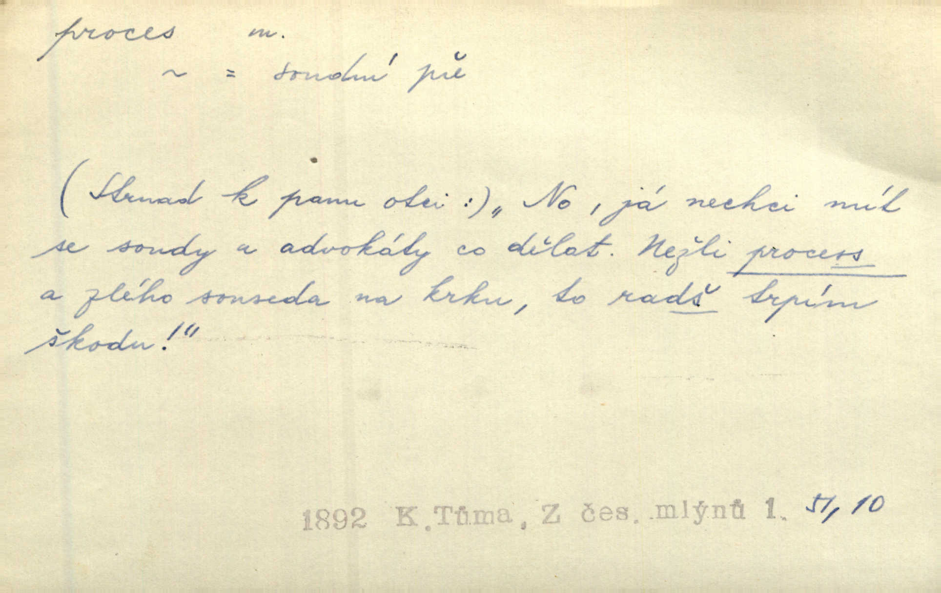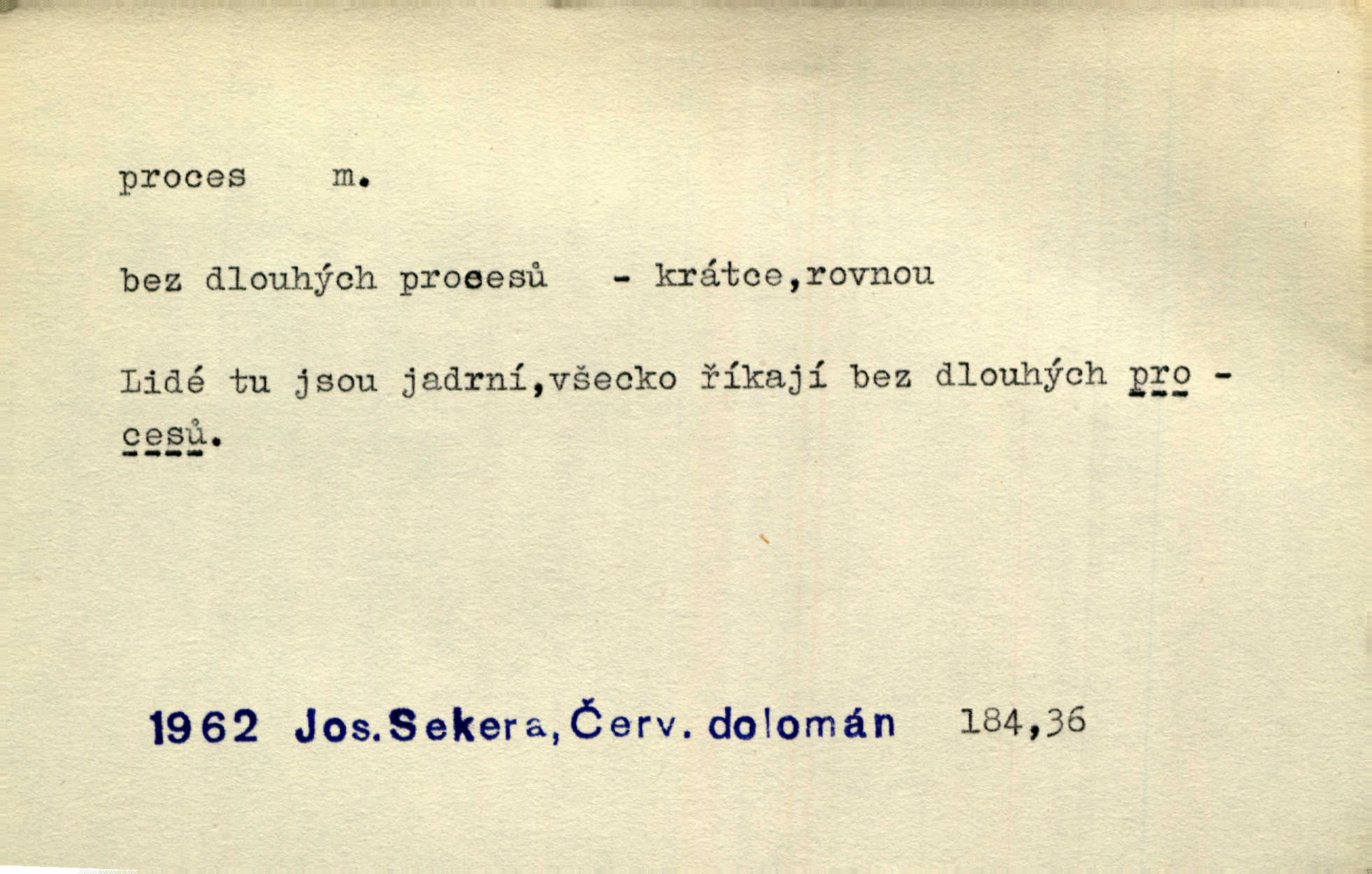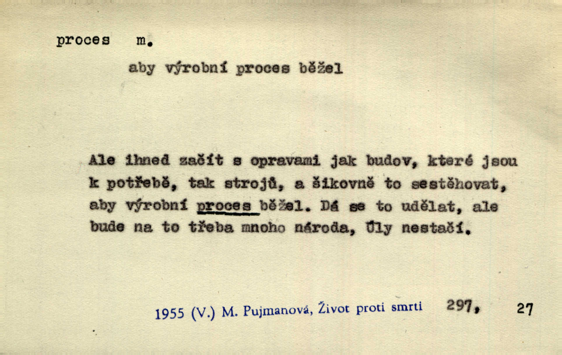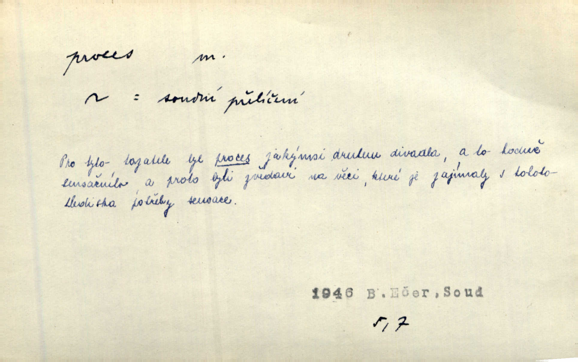 - proces, -u m. soudní řízení, spor vedený před soudem. Proces začal, a tu navrhl jeden ze soudců, aby byl obžalovaný také slyšán. Ner. Není možno, aby soud odpíral obnovení procesu. Arb. Pan cís. rada proces vyhrával a byl by vyhrál i v poslední instanci, ale protivná strana nabídla vyrovnání. Čap. Ch. Byli by mu pověsili na krk proces pro zaviněný úpadek. Čap. Ch. S tou naší Lízí, mně se zdá, udělám krátký proces rychle se s ní vypořádám. Šim. [Jde o to,] aby žurnalista uměl jít přímo na věc, aby řekl své bez dlouhých procesů stručně. Rozhlas. Tak tedy bez procesů a beze všech excesů podpište smlouvu hned bez průtahu. Sab. Práv. souhrn zásad, jimiž se předpisuje formální postup při úkonech stran a veřejných orgánů, směřujících k určení nějaké právní situace; proces trestní řízení, kterým se zjišťuje, zda v daném případě nastaly podmínky trestnosti zákonem stanovené; proces civilní soudní řízení v občanských právních rozepřích; proces písemný řízení, v němž se všechny důležité úkony procesní dějí písemně; proces ústní řízení, při kterém se věc ústně projedná před soudem, který pak vynese ústní rozsudek. Círk. kanonický proces právní řízení o sporné nebo trestní věci před soudem církevním; proces inkvisiční trestní řízení, které se zahajuje ex officio na základě pověsti o zločinu nebo udání. D dění plynule, zvolna se vyvíjející, uplatňující, průběh, pochod, postup, vývoj. Autor prodělal veliký duševní proces. Vrch. Drama „Ztracení“ uvádí na jeviště dvojici lidí úpadkových v jejich konečném processu vedoucím k zániku. Šim. Ona s jistotou instinktu tušila duševní i fysiologický process, odehrávající se v mladém muži při pohledu na ni. Sez. Proces uvědomovací nejdále dospěl dosud v poesii. V. Čer. Báseň ne velkou psal [Manzoni] celé dva dny, třetí den ji upravoval, jaký to process tvůrčí! Vrch. Staloť se smíšení toto [práva a bezpráví] staletým processem a prodělalo mnohé proměny. Pal. [Odpadky] se znovu dostanou do výrobního procesu. Rozhlas. Suché desky znamenaly značné zjednodušení fotografického procesu. Smrž. Gram. hláskové procesy změny. Typ. způsob fotografické reprodukce; proces mokrý, suchý. Chem. chemický pochod, reakce.