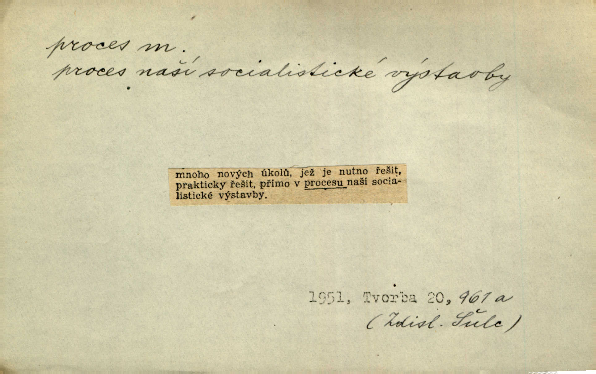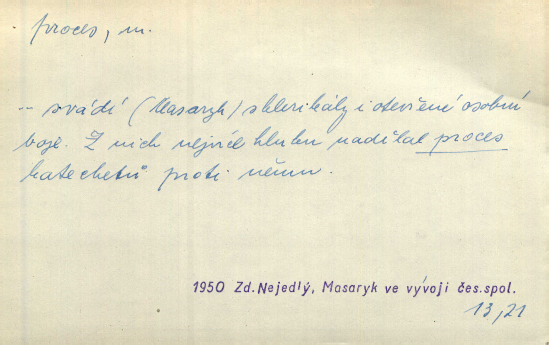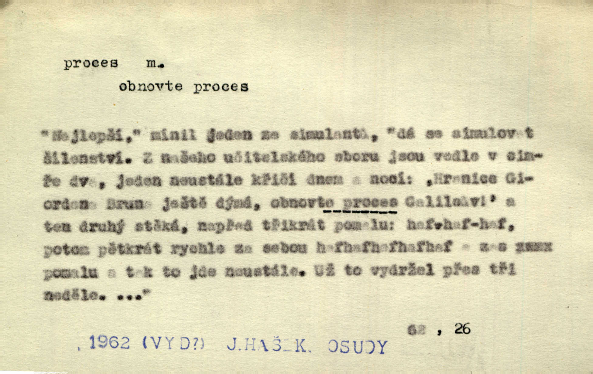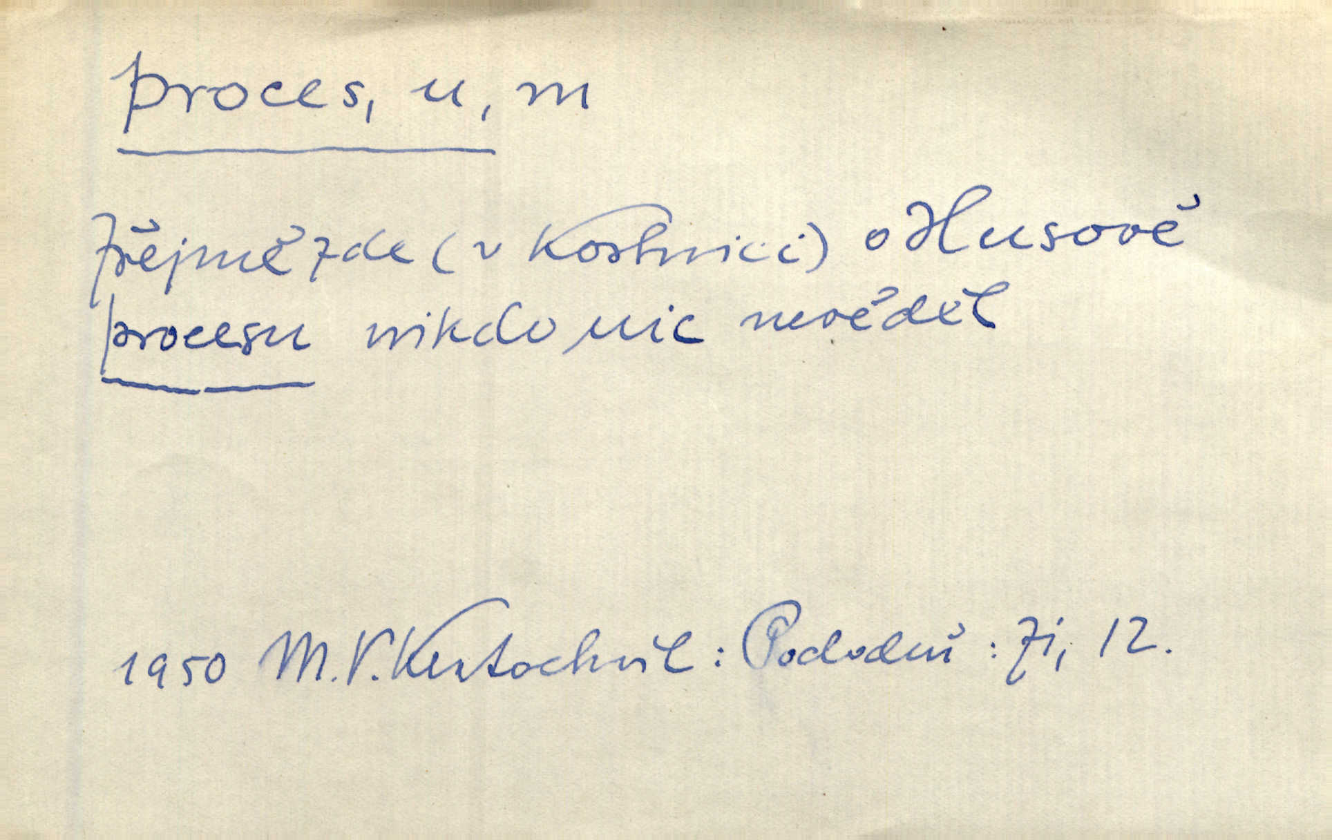 - proces, -u m. soudní řízení, spor vedený před soudem. Proces začal, a tu navrhl jeden ze soudců, aby byl obžalovaný také slyšán. Ner. Není možno, aby soud odpíral obnovení procesu. Arb. Pan cís. rada proces vyhrával a byl by vyhrál i v poslední instanci, ale protivná strana nabídla vyrovnání. Čap. Ch. Byli by mu pověsili na krk proces pro zaviněný úpadek. Čap. Ch. S tou naší Lízí, mně se zdá, udělám krátký proces rychle se s ní vypořádám. Šim. [Jde o to,] aby žurnalista uměl jít přímo na věc, aby řekl své bez dlouhých procesů stručně. Rozhlas. Tak tedy bez procesů a beze všech excesů podpište smlouvu hned bez průtahu. Sab. Práv. souhrn zásad, jimiž se předpisuje formální postup při úkonech stran a veřejných orgánů, směřujících k určení nějaké právní situace; proces trestní řízení, kterým se zjišťuje, zda v daném případě nastaly podmínky trestnosti zákonem stanovené; proces civilní soudní řízení v občanských právních rozepřích; proces písemný řízení, v němž se všechny důležité úkony procesní dějí písemně; proces ústní řízení, při kterém se věc ústně projedná před soudem, který pak vynese ústní rozsudek. Círk. kanonický proces právní řízení o sporné nebo trestní věci před soudem církevním; proces inkvisiční trestní řízení, které se zahajuje ex officio na základě pověsti o zločinu nebo udání. D dění plynule, zvolna se vyvíjející, uplatňující, průběh, pochod, postup, vývoj. Autor prodělal veliký duševní proces. Vrch. Drama „Ztracení“ uvádí na jeviště dvojici lidí úpadkových v jejich konečném processu vedoucím k zániku. Šim. Ona s jistotou instinktu tušila duševní i fysiologický process, odehrávající se v mladém muži při pohledu na ni. Sez. Proces uvědomovací nejdále dospěl dosud v poesii. V. Čer. Báseň ne velkou psal [Manzoni] celé dva dny, třetí den ji upravoval, jaký to process tvůrčí! Vrch. Staloť se smíšení toto [práva a bezpráví] staletým processem a prodělalo mnohé proměny. Pal. [Odpadky] se znovu dostanou do výrobního procesu. Rozhlas. Suché desky znamenaly značné zjednodušení fotografického procesu. Smrž. Gram. hláskové procesy změny. Typ. způsob fotografické reprodukce; proces mokrý, suchý. Chem. chemický pochod, reakce.