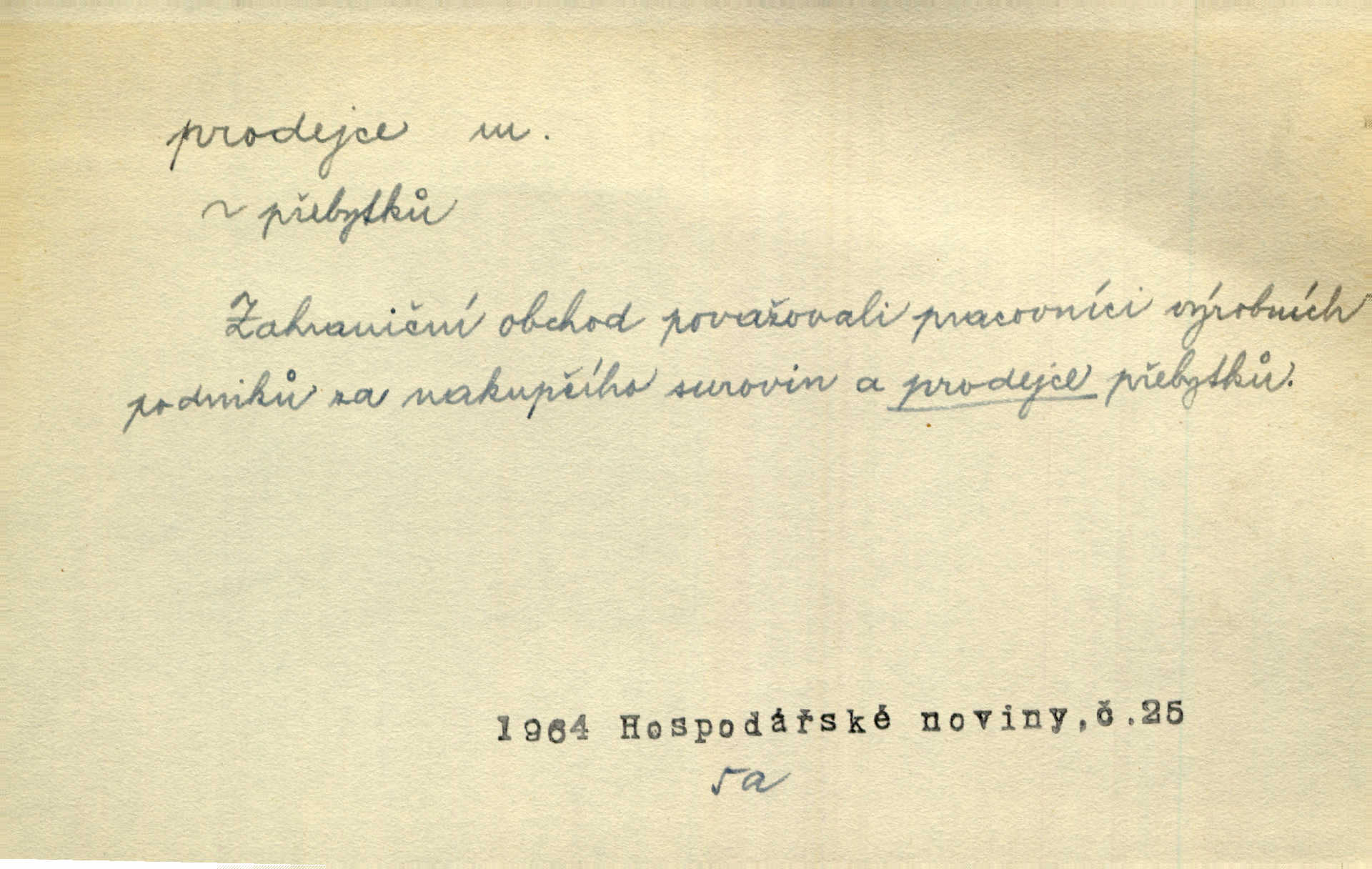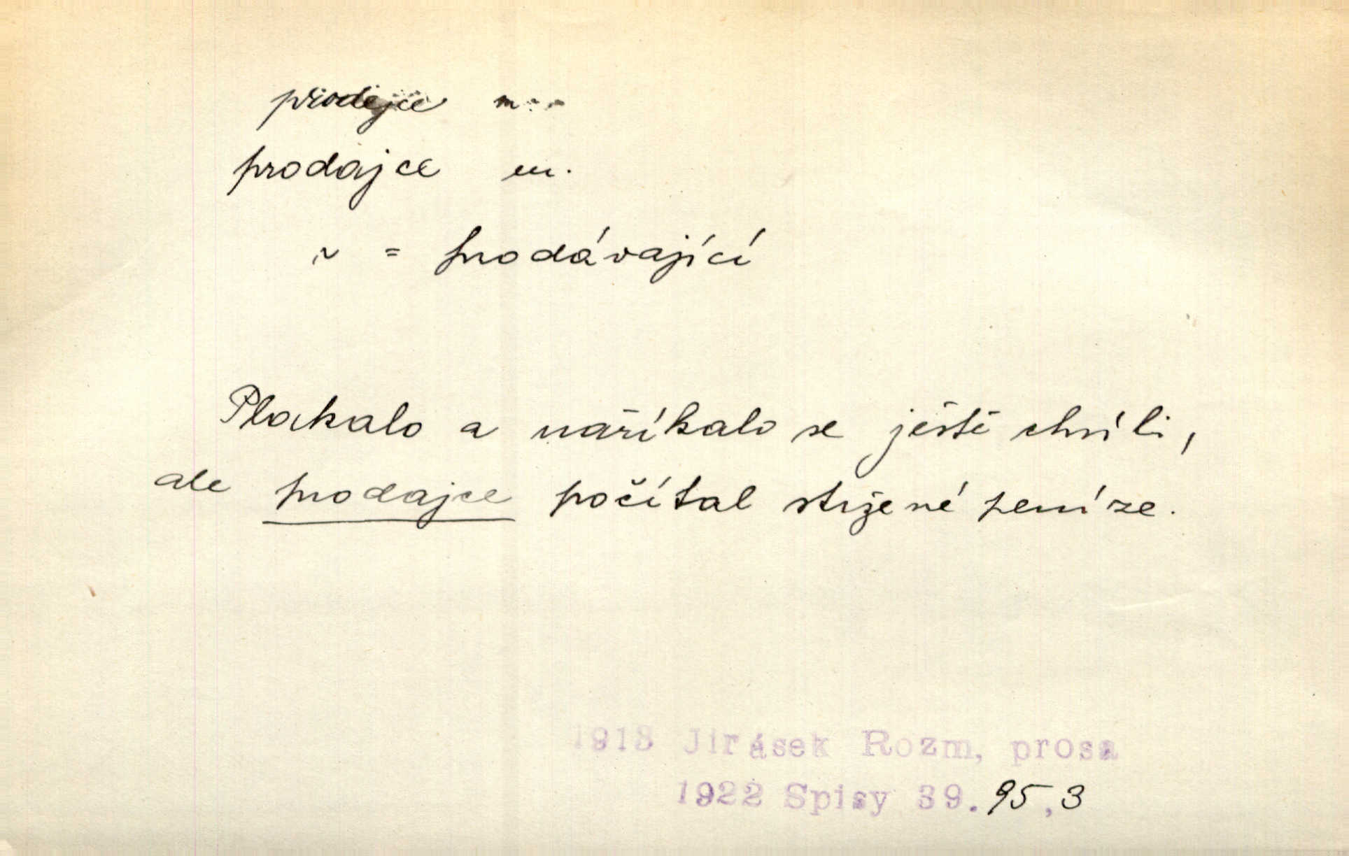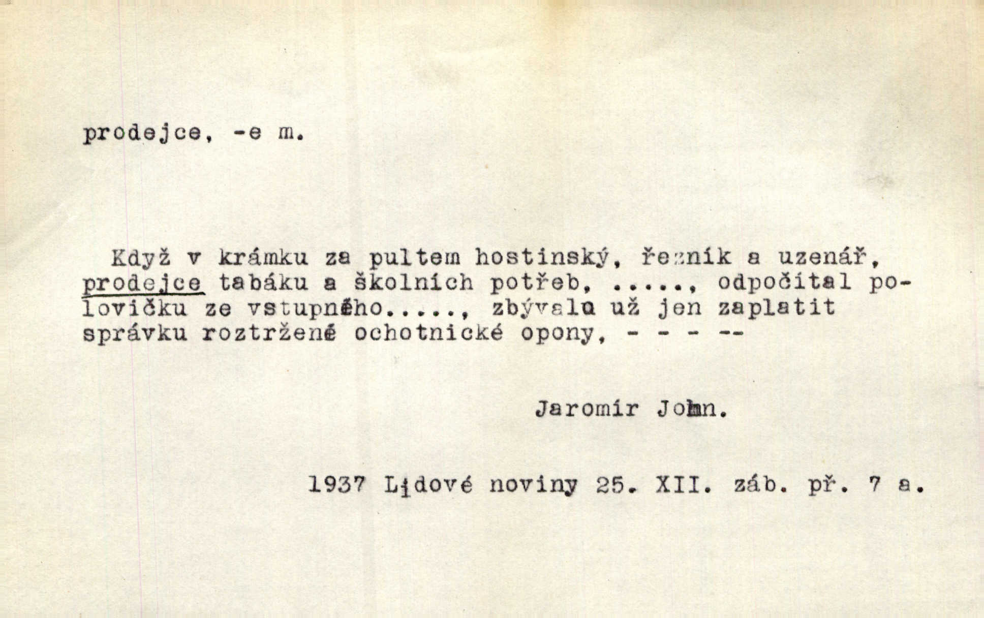 - prodejce (zast. prodajce), -e m. kdo prodal n. prodává, prodávající, kdo obstarává rozprodej. Prodejci mohou mýdlo a mýdlové výrobky vydati spotřebitelům jen na lístky na mýdlo. Nár. p. Prodajce počítal stržené peníze. Jir.