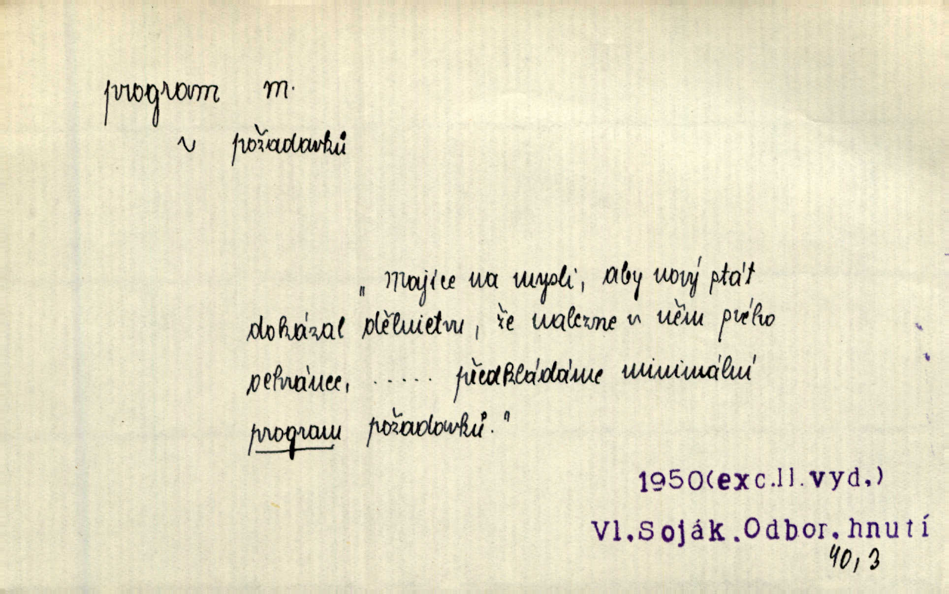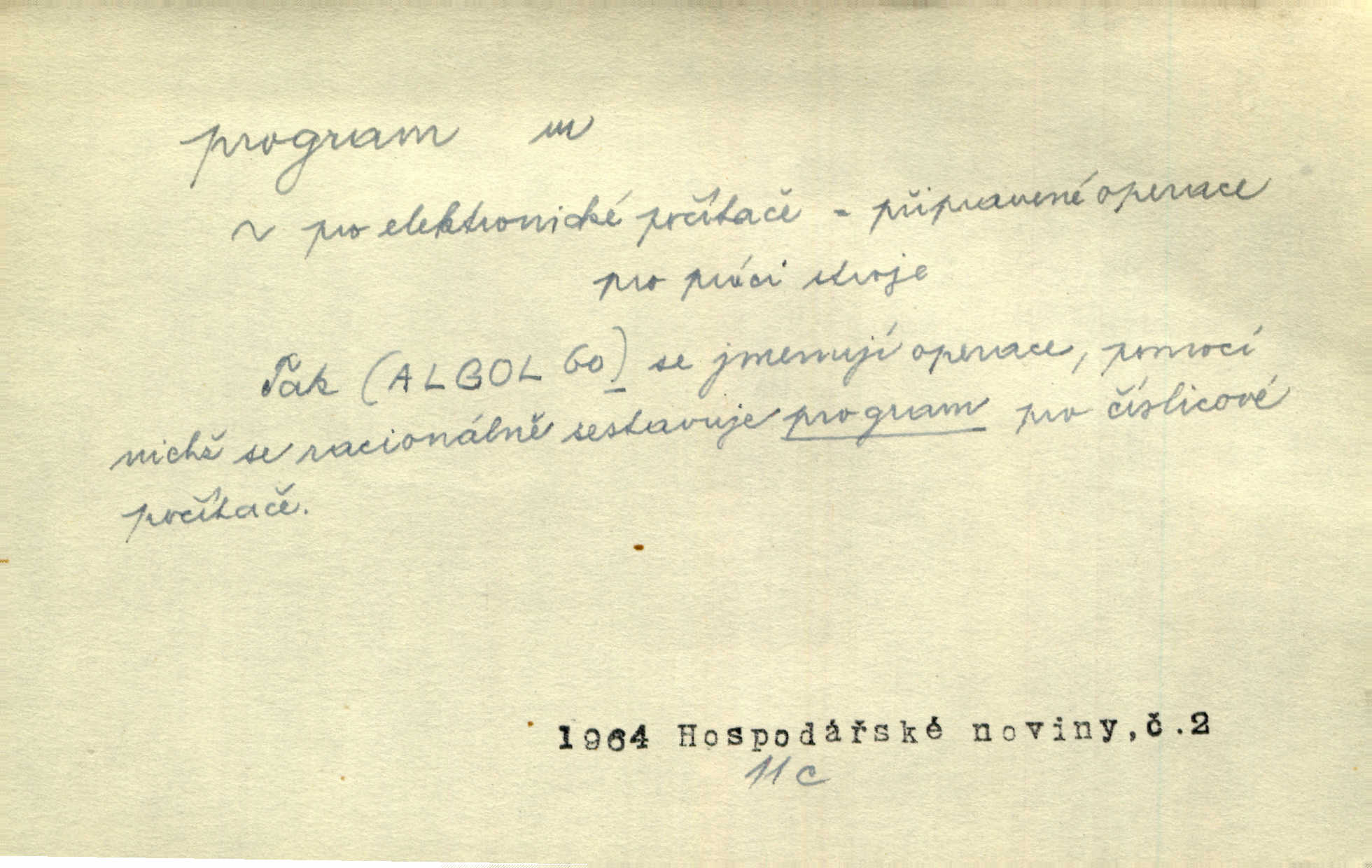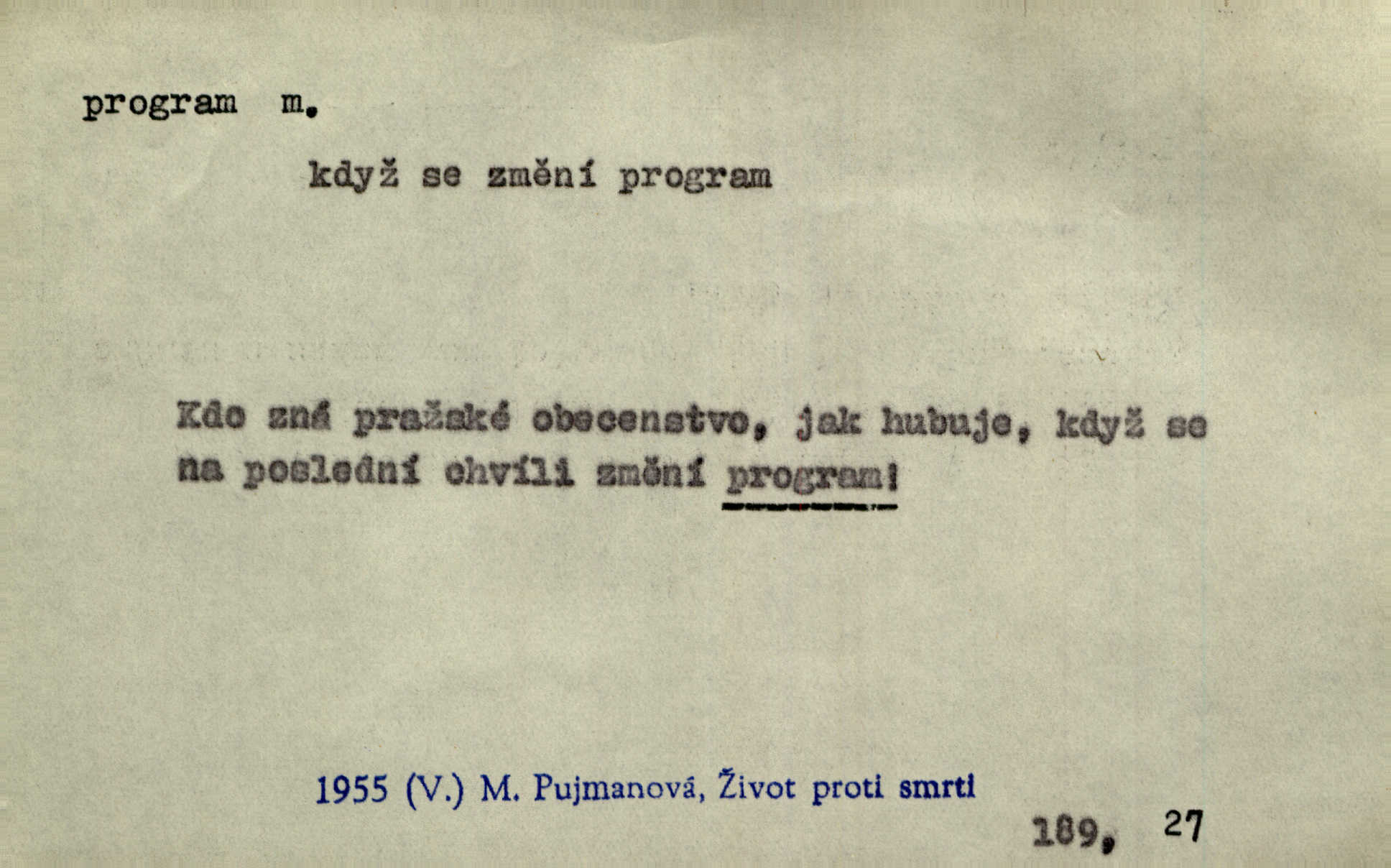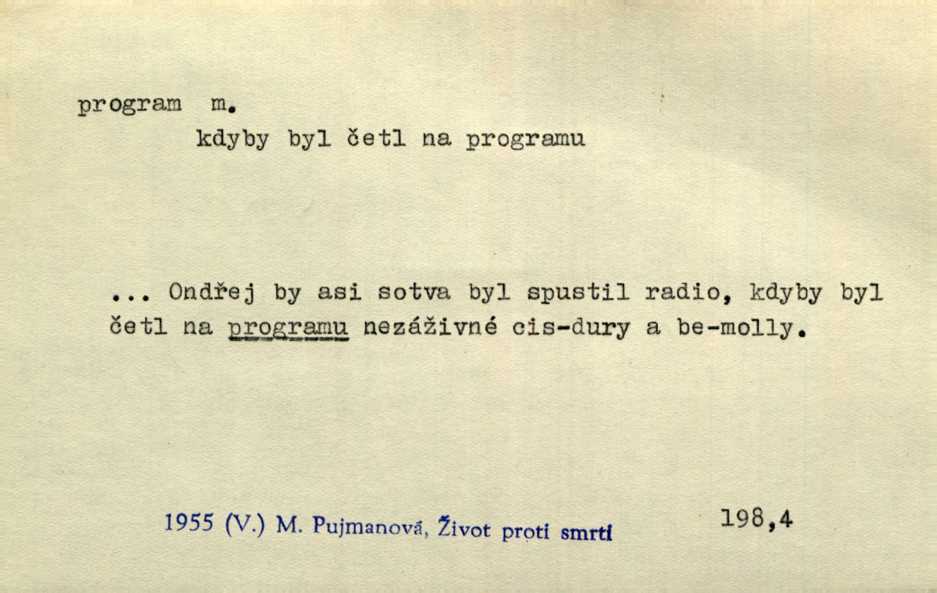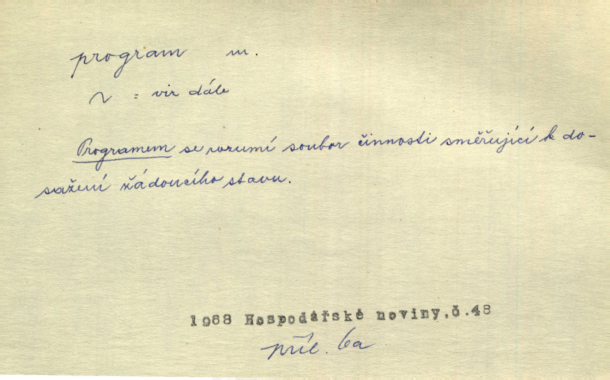 - program, -u m. předem stanovený pořad slavnosti, koncertu a pod. n. vůbec lidského podnikání. Náš rozhlas provedl v hudebním svém programu díla světové tvorby. Krit. měs. Vy jste patrně nebyl na novém programu ve variété. Bass. Program již byl určen i mnohokrát opět zavřen. Havlasa. Jídlo a pití bylo celým programem zábavy. Podl. Zachovala jsem náš obvyklý každodenní program. Krás. Udělal věc, která jaksi nebyla v programu: klekl k Baštovi, strčil mu do ruky housku. Lid. nov. Kdyby vyšší instance svolaly jednou anketu všech subalterních, viděly by, jaký pracovní program bychom sestavili. Herrm. Ani tak důležitý předmět jako mravouka nedán na učební program. Krás. D cíl, kterého chce jedinec nebo skupina prací dosáhnout; zásady. Vykládal svůj program o vzdělání lidu. Herb. Programem [listu] bylo vyhovět ve všem všudy knížeti. Čap. Ch. Ničeho není tak Liliencron vzdálen, jako úmyslu básniti dle nějakého programu. Kar. Balbín je nadčasovým zjevem netoliko tím, čím barokní program naplňuje, ale i tím, čím jej již v zárodku překonává. Krit. měs. Bylať učená, ale její duševní program, abych tak řekl, nebyl veliký obzor. Podl. D myšlenkový obsah hudebního díla. Pro představovou neurčitost hudby je třeba, aby nám skladatel podal slovný výklad, t. řeč. „program“ skladby. Zich. D tištěné oznámení pořadu, zprav. se seznamem vystupujících osob. Když četl na programu tištěné své jméno, pocítil poprvé vlny nevylíčitelné pýchy. Svob. [Učitel] rozbalil lejstra a podal [vrchnímu] program [besedy]. Rais. D tištěná výroční zpráva, zprav. školská, s výkazem činnosti za uplynulý rok. Koho věc zajímá, nechť si prohlídne středoškolské programy české za léta 1860—1888. Herb.