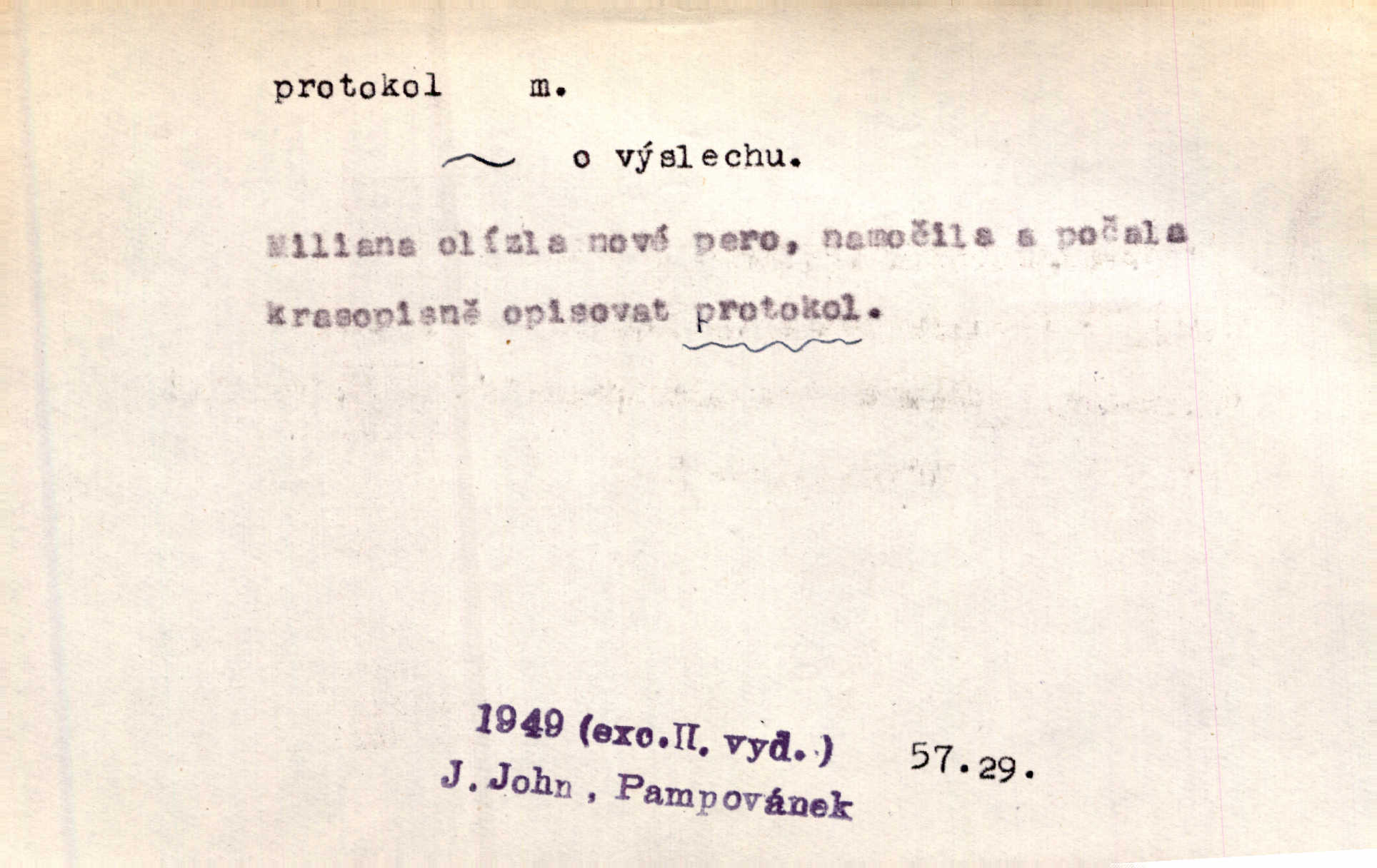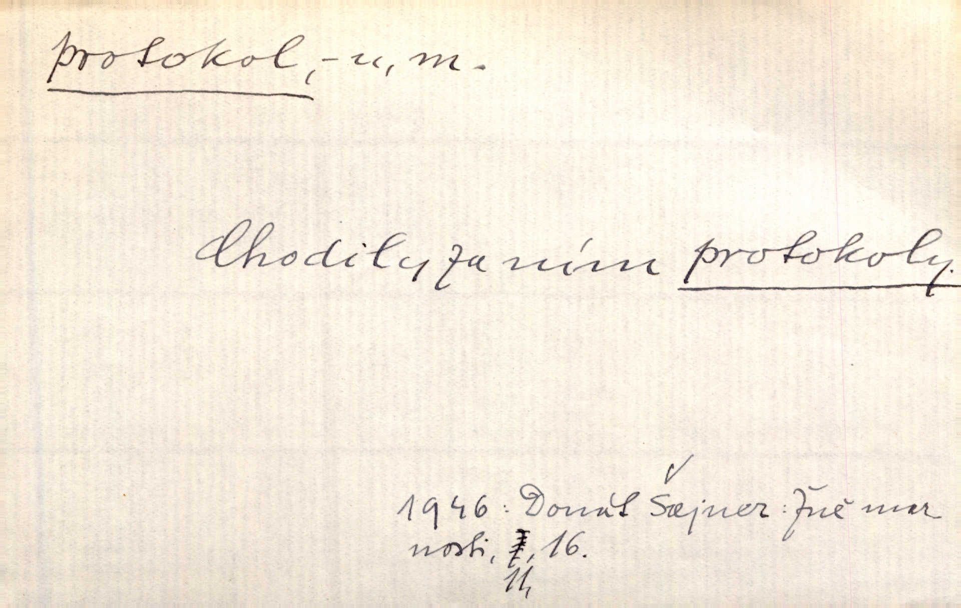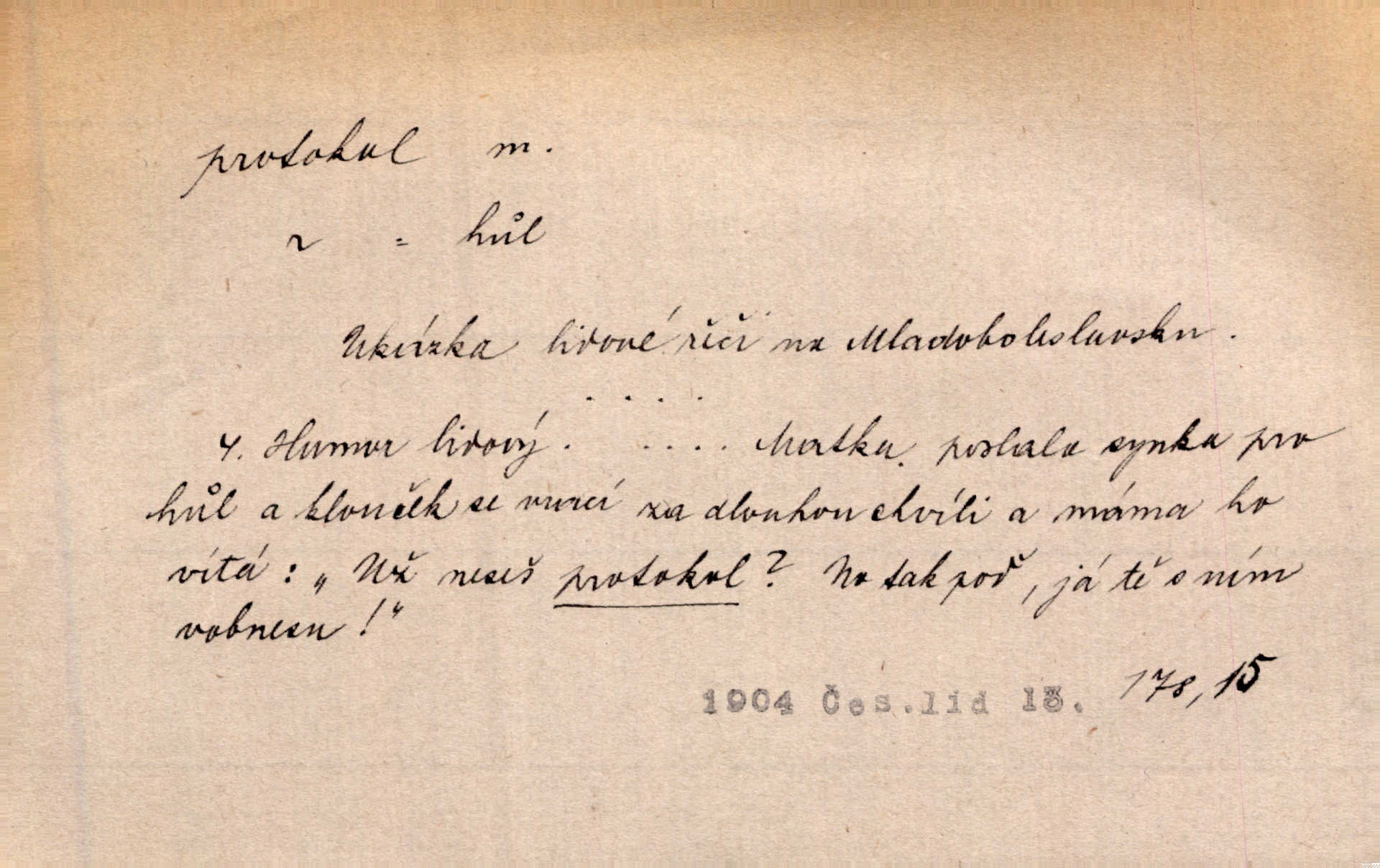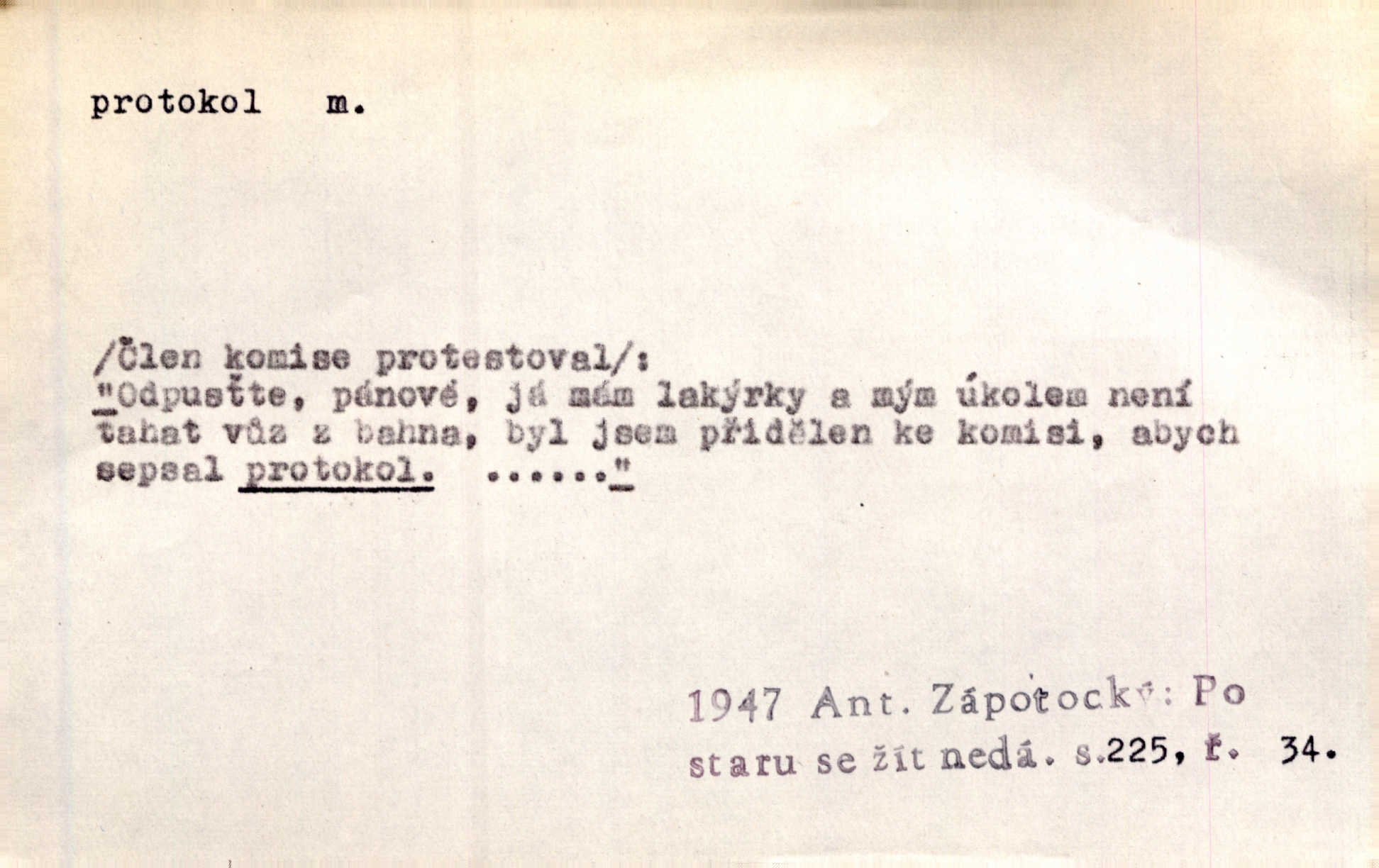 - protokol, -u m. zápis, hlavně veřejný, o ústním jednání, o výsledku ústního jednání. Uctili jste, velectění pánové, povstáním jeho památku a svolíte zajisté, aby uctění naše bylo zapsáno do protokolu dnešní schůze. Jir. Konferenční protokoly se vyřizovaly v ten rozum, že je žádoucno, aby výkony žáků se posuzovaly přísně. Klost. Vzalo se to vše [svědectví o neštěstí] do protokolu, odbyl se výslech svědků. Prav. Akta o Jírovi Skaláku byla v protokolech trestního vyšetřování na zámku opočenském. Jir. „Tuto otázku jsem neslyšel. Jinak bych musil s vámi ihned zavésti protokol,“ odpověděl přednosta. Pfleg. Úř. protokol jednací formální zápis o úředním jednání a o jeho výsledku; protokol podací kniha, do níž se zapisují došlá podání s poznámkou, jak a kdy byla vyřízena; protokol úřední místnost, v níž se přijímají podání, podatelna. Práv. protokol soudní zápis o soudním řízení; protokol parcelní seznam parcel vedený podle obcí a vlastníků u příslušné berní správy. Polit. (v mezinárodním styku) zápis o jednání n. usnesení. Dipl. diplomatický protokol souhrn společenských a úředních pravidel, jimiž se upravuje vzájemný styk diplomatů; oddělení zahraničního úřadu příslušné pro styky diplomatů. Šéf protokolu. D Odb. zápisník pro záznam soustavného pozorování. Protokol délkový, nivelisační, úhlový a j.