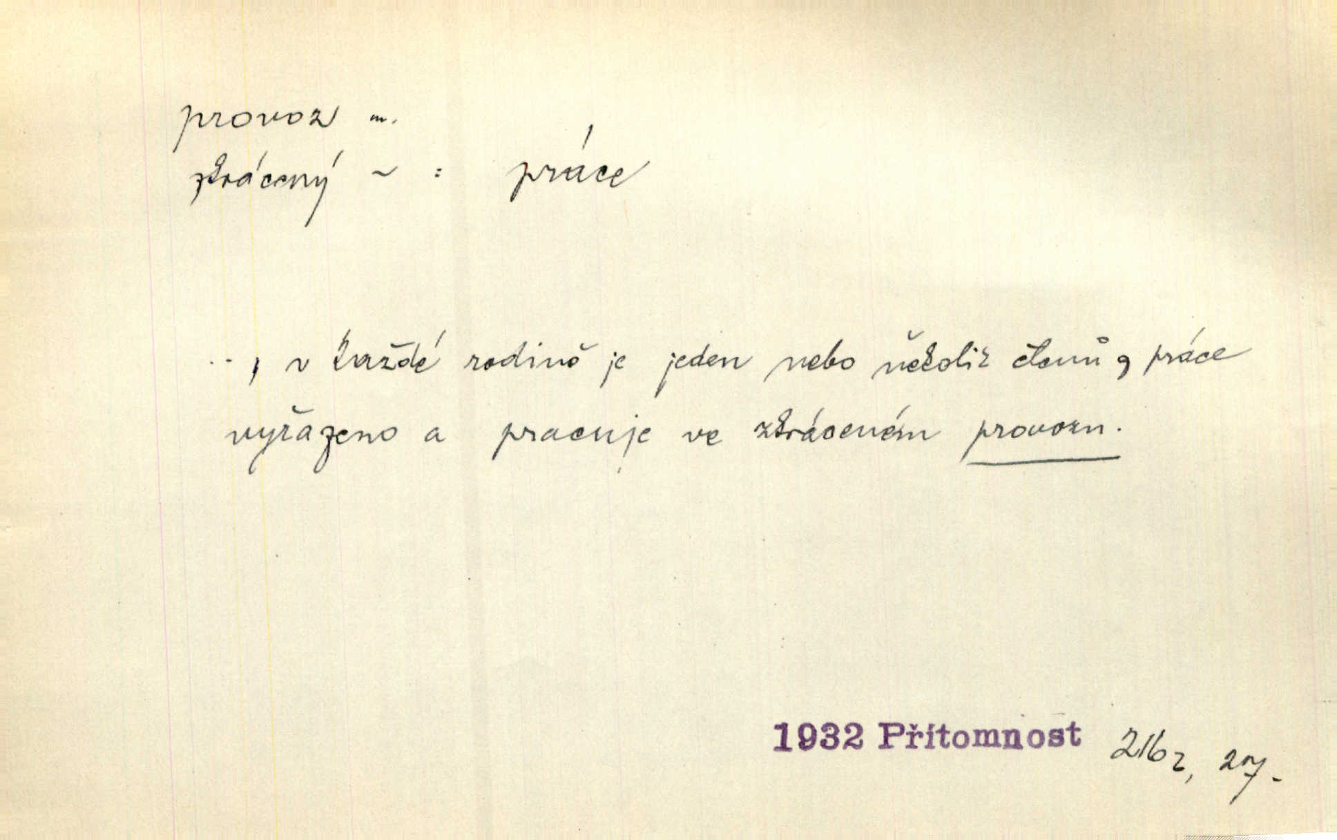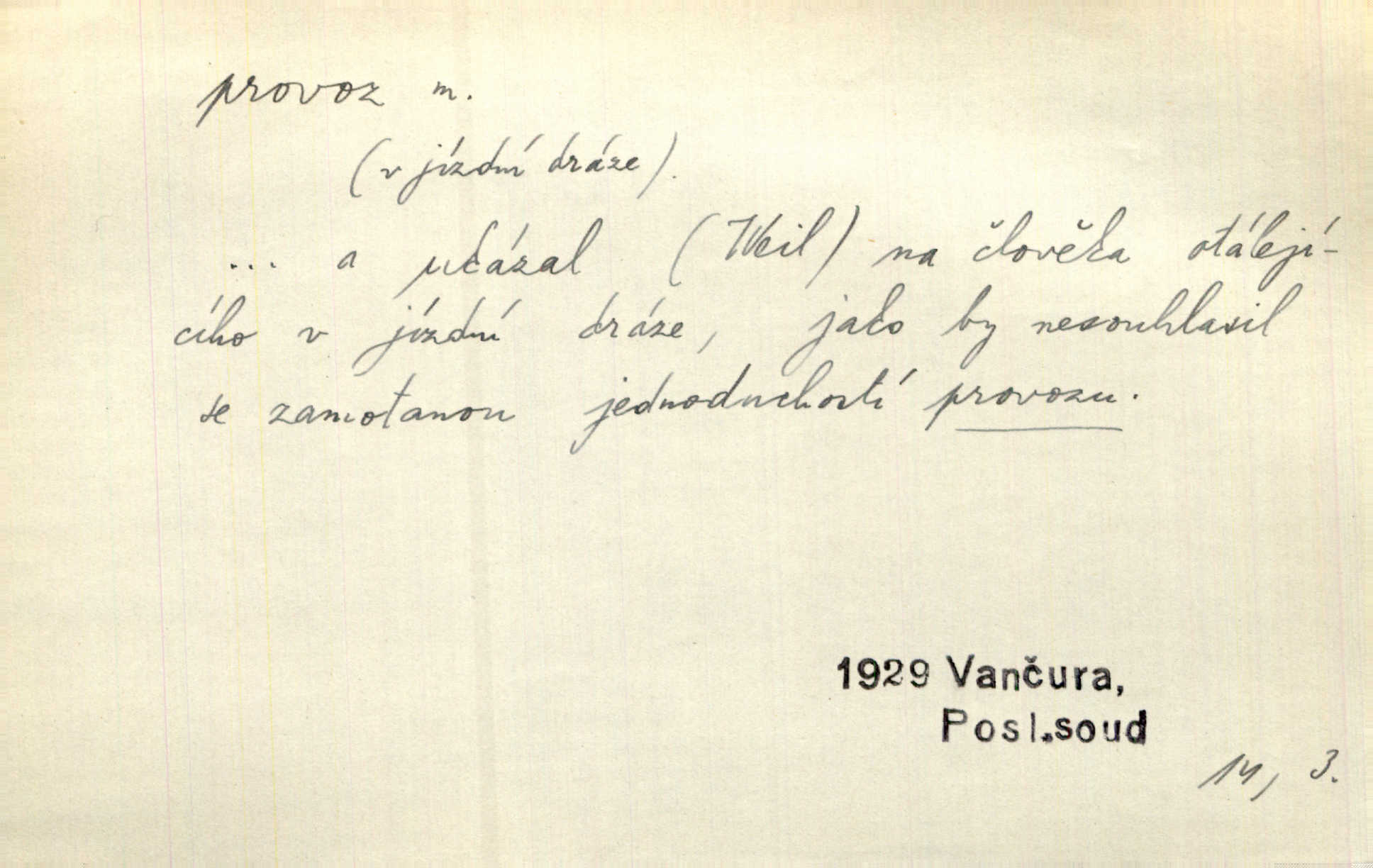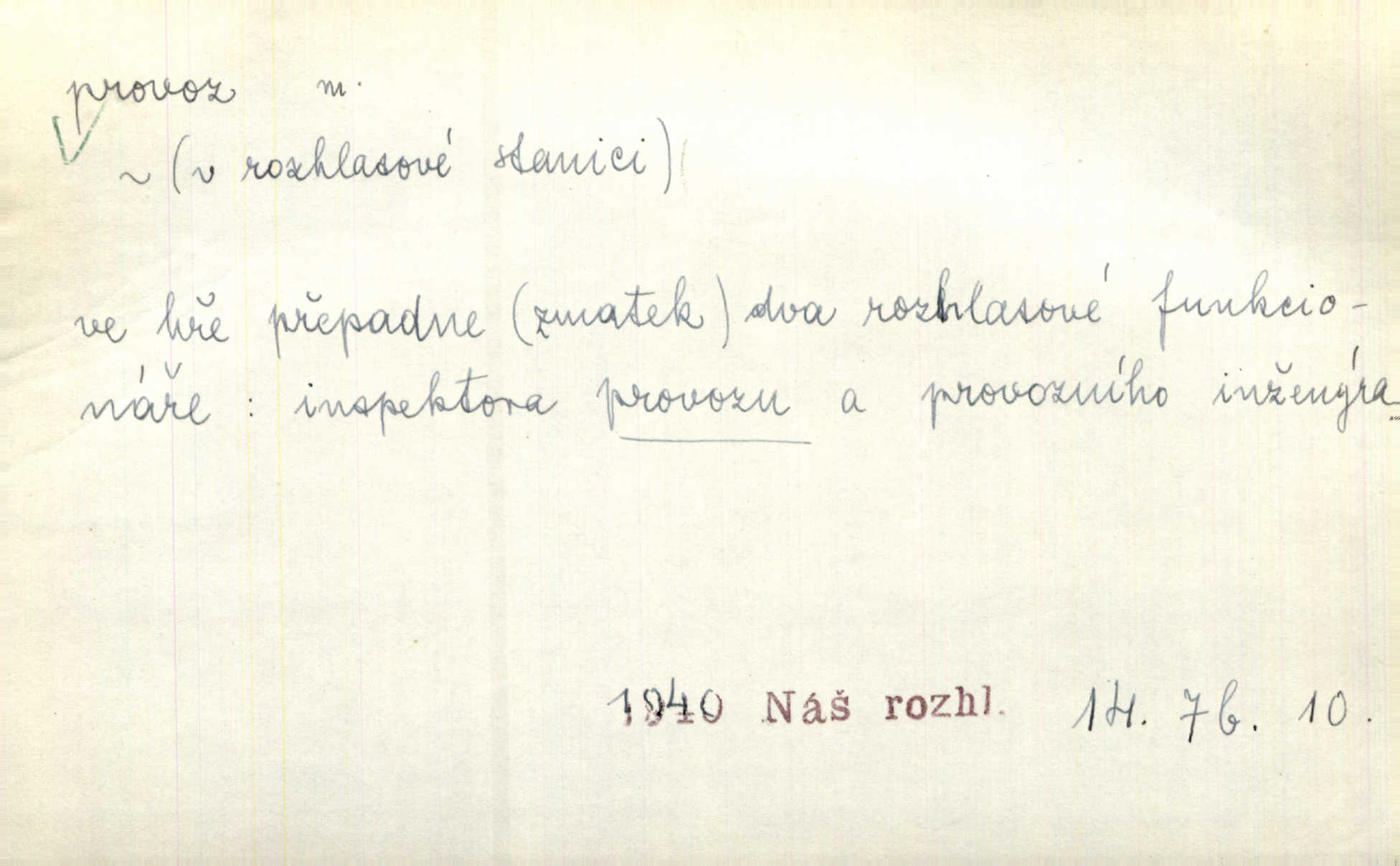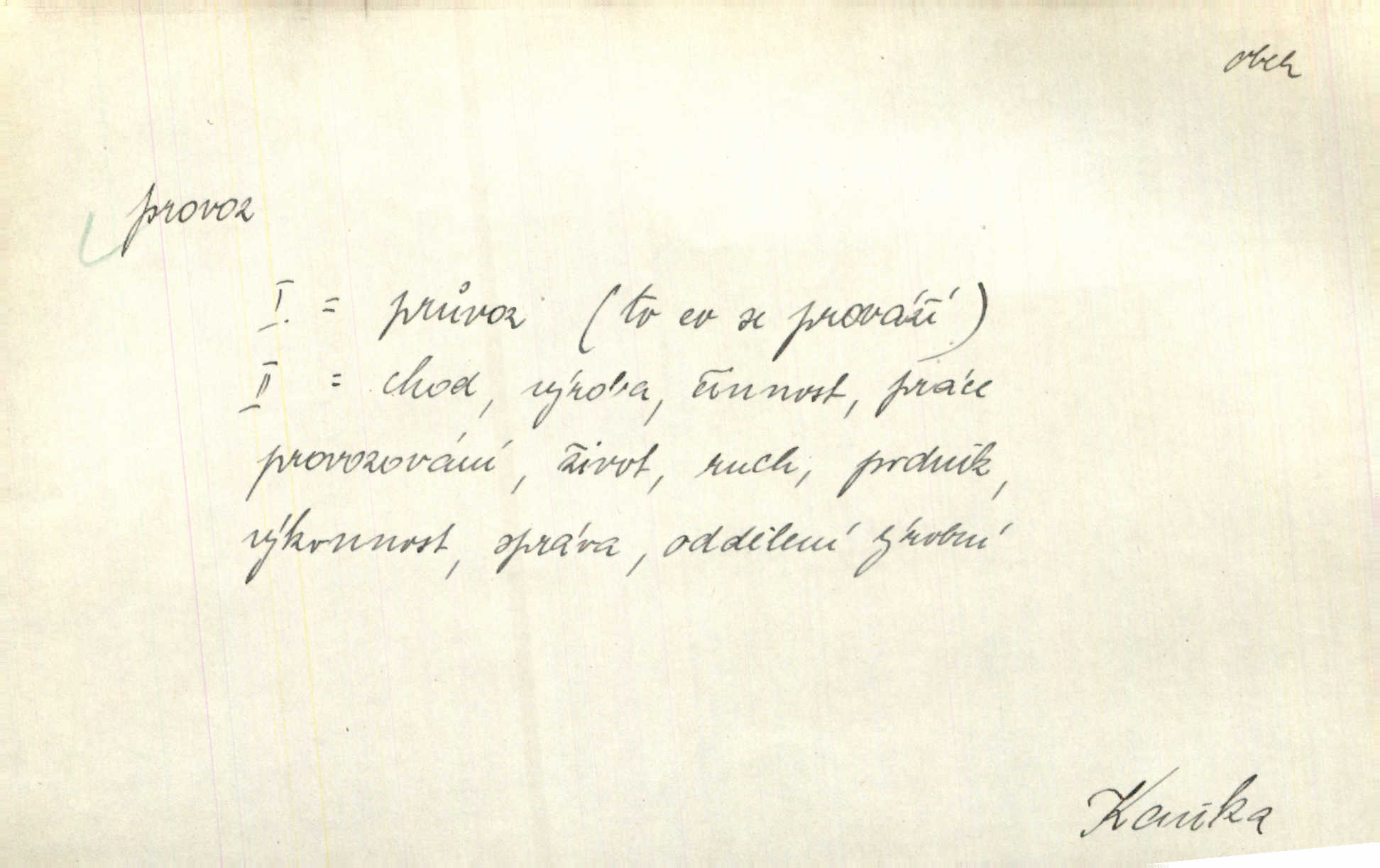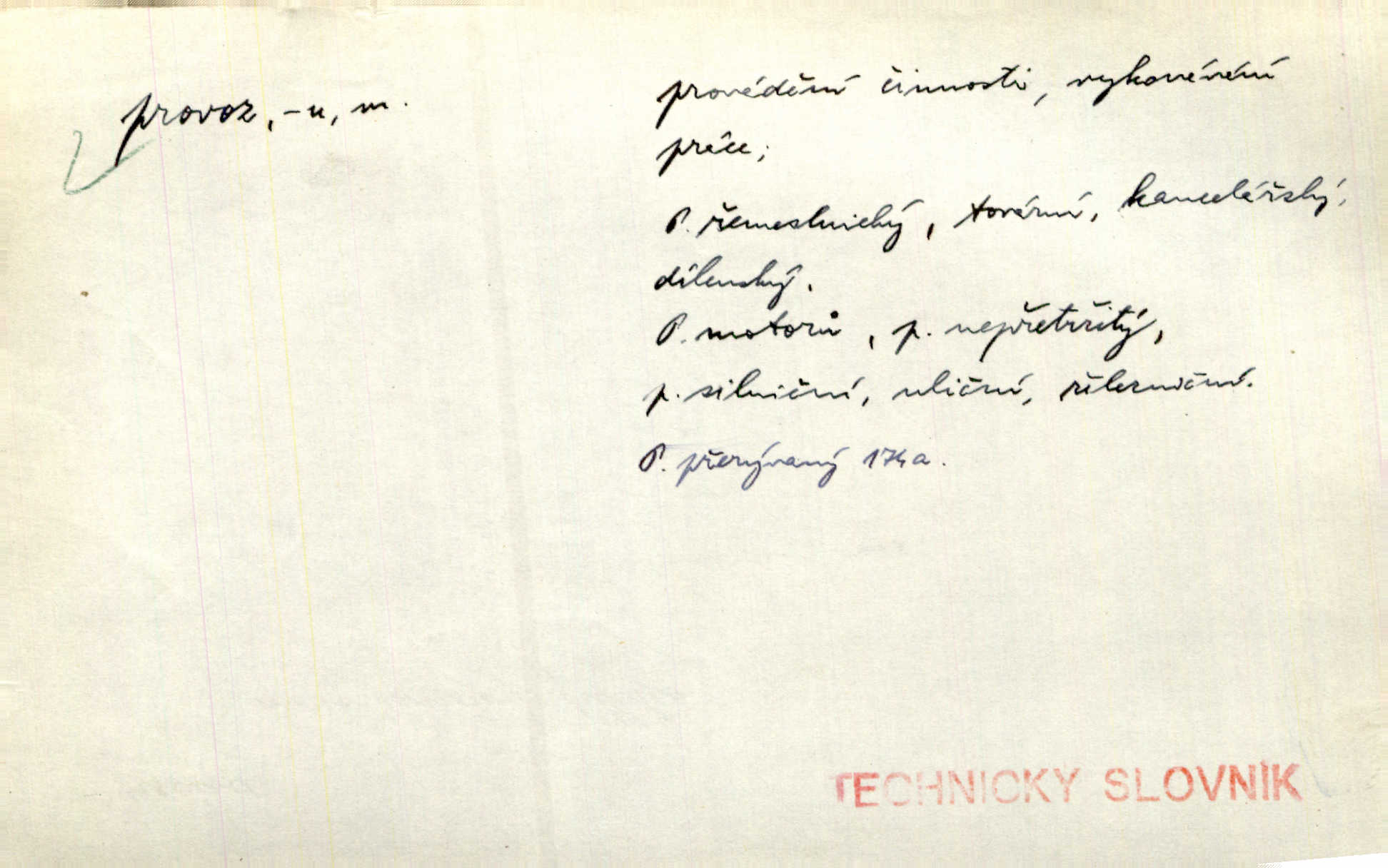 - provoz, -u m. činnost, chod podniku, obyč. výrobního. Poněvadž byli [družstevníci] chudí, chtěli i provoz [pekárny] vésti chudě. Durd. Dal je [továrny] do pořádku a zabezpečil jejich provoz. Mah. Kavárnu Arco otvírají k vůli nádražnímu provozu brzo. Vach. Nár. hosp. provoz hospodářský, technický, železniční, poštovní atd. D chod n. činnost stroje. Málo jich [těch, kdo kupují automobil] hledí na úspornost provozu. Přít. Kolik stojí provoz mého automobilu. Auto. [Dieselův motor] bude znamenati mnoho pro rozvoj nákladní autodopravy, neboť provoz se velmi zlevní. Přít. D dopravní ruch; doprava. Policista, dirigující majestátně provoz, přiběhl k vozu. Hora. Protější domy s výrazy dávno zařízených domovů a kanceláří vstupovaly sem [do nového bytu] holými okny i s provozem ulice. Pujmanová. D Zř. oběh, užívání. Kohosi napadlo, že bychom měli dát do provozu ozdobné telegrafní blankety. Přít. — V. t. průvoz.