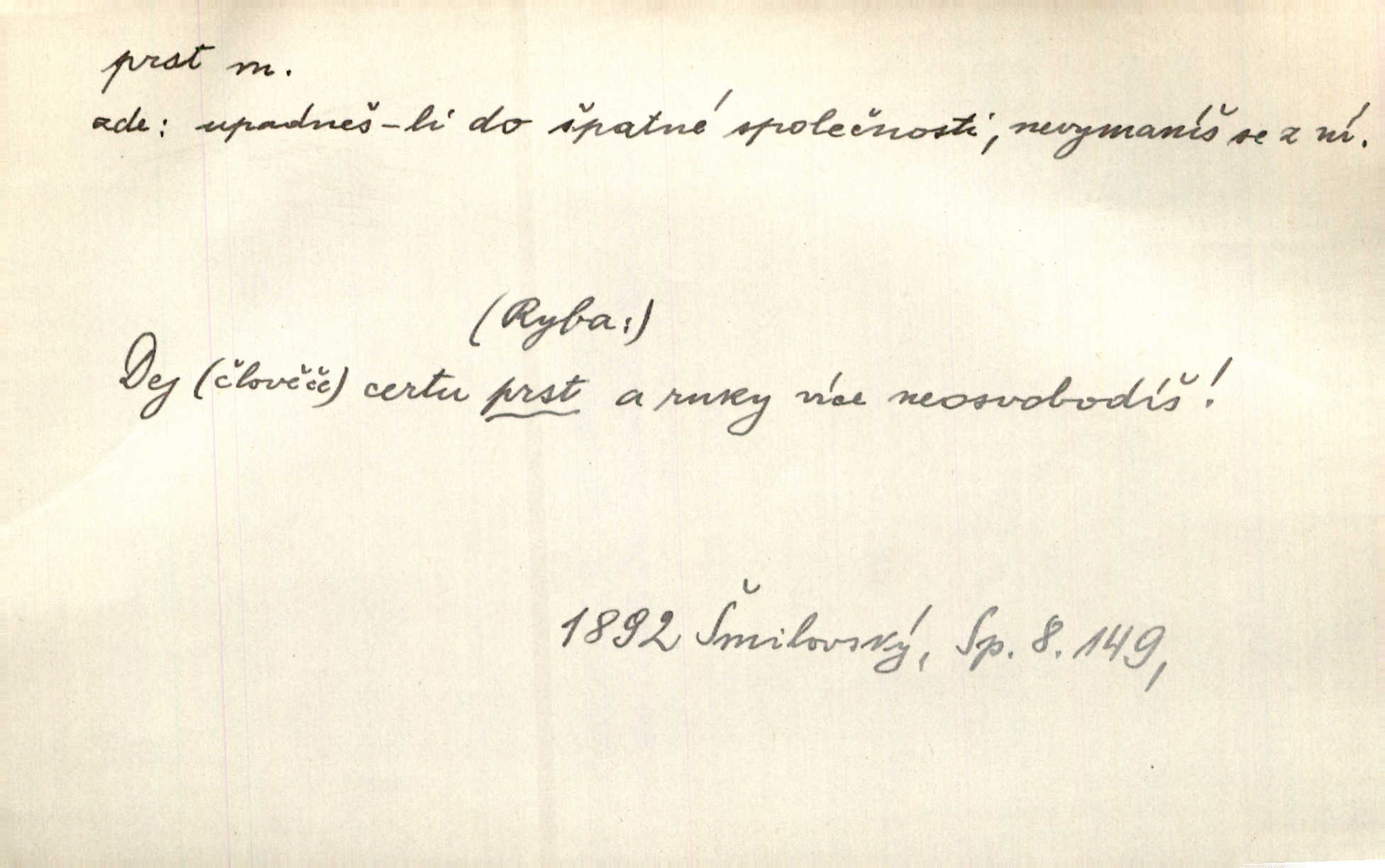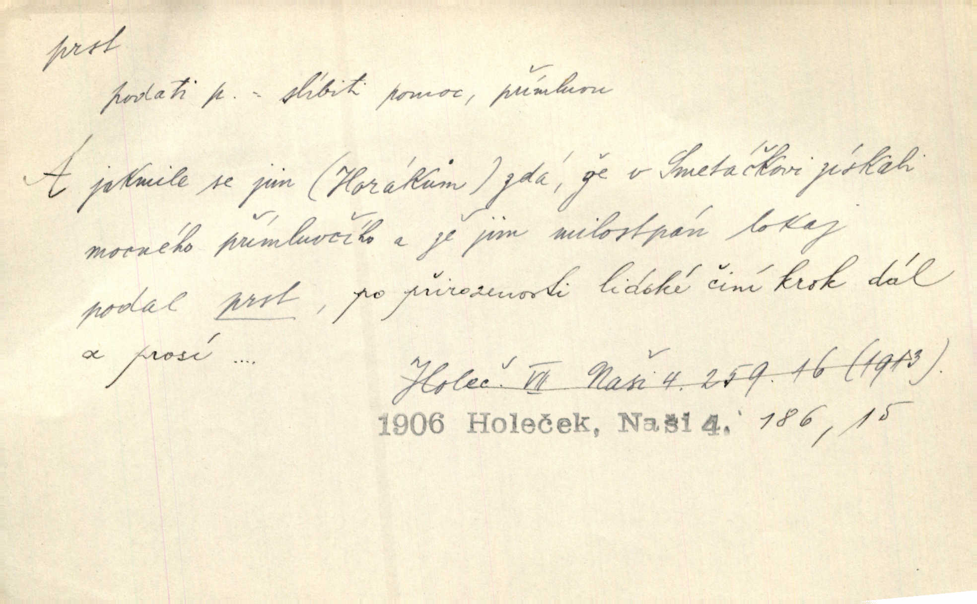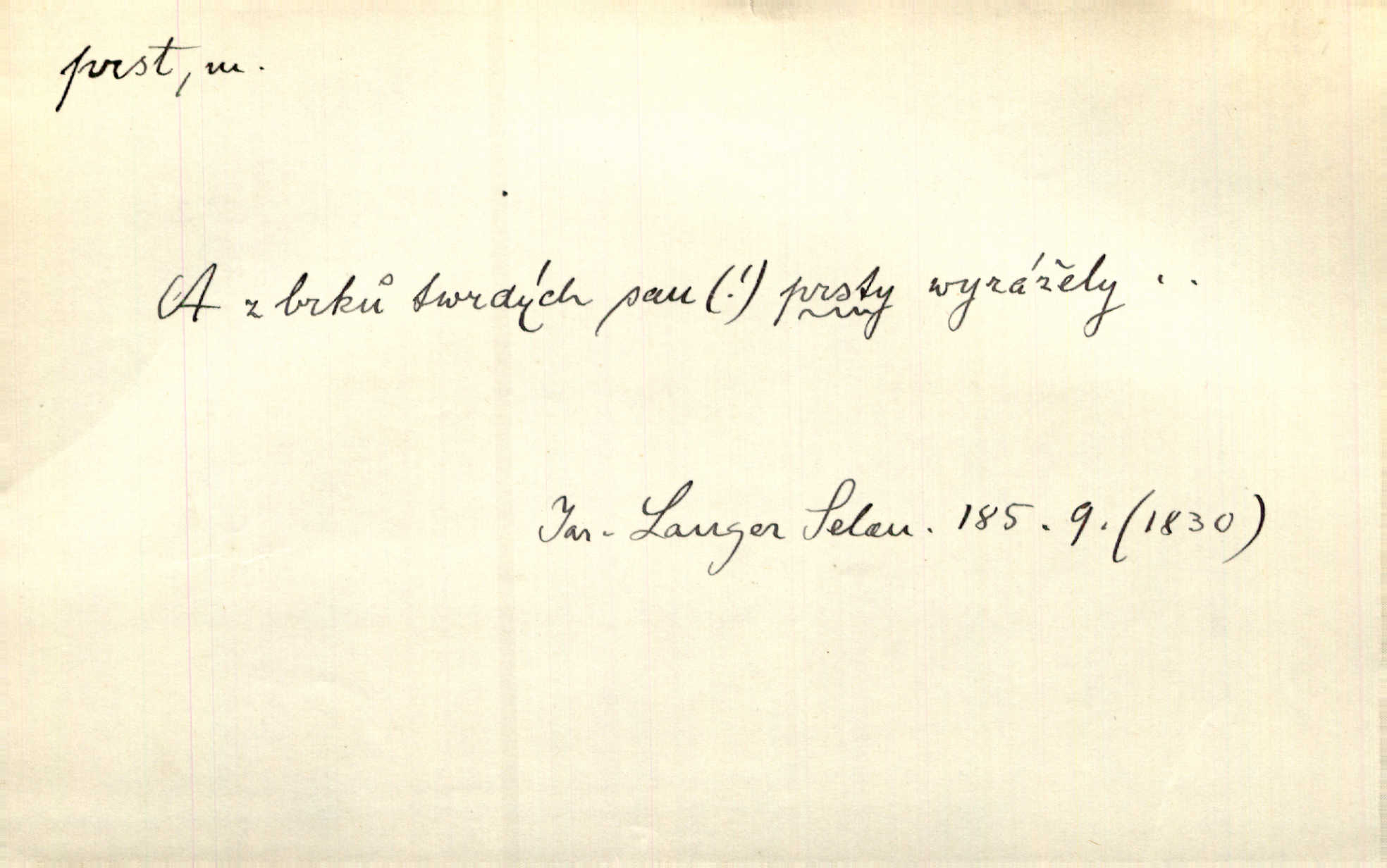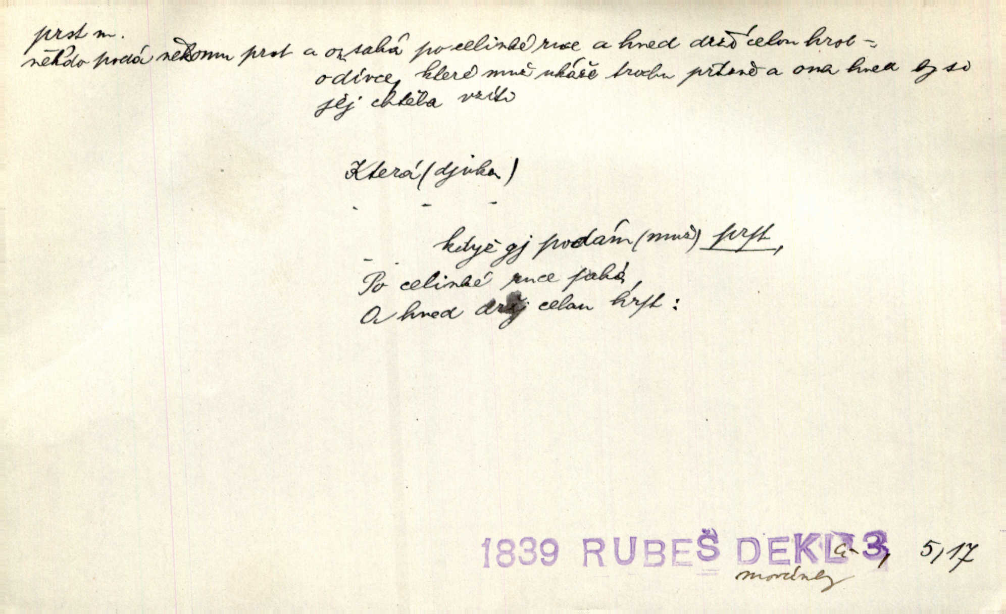 - prst, -u m. jeden z pěti pohyblivých chápavých útvarů zakončujících ruku. [Stařena] prstem do dálky zahrozila. Rais. Barunka učila babičku jedním prstem hrát [na klavír:] „To jsou koně …“ Něm. Dáma po dámě docházely k zrcadlu a dotekem prstů opravovaly si účesky. V. Mrš. Historiky, kteří v těch letech psali monografie, spočítáš na pěti prstech je jich málo. Herb. Byl čas, kde se vlastenci čeští počítali na prsty. Štulc. Dobře mu není, toť si dovedeš vypočítat na prstech! snadno si domyslíš. Rais. Zvěř kolem mlýna má [strýc] spočítanou, řeklo by se, na prstech přesně, do posledního kousku. Herb. Ale především — prst na ústa, synáčku! Ani slova žádnému o tom mlčet. Tyl. Moudrý člověk, chceli všudy dobře vyjíti, musíť na ledacos skrz prsty hleděti shovívavě přehlížeti. Kram. Přestávají se na přistěhovalce dívat skrz prsty pohrdavě se dívati, přezírati. Rais. Prstem na mne okazují sousedé a zlořečí jmenu mému. Choch. Myslíte, že někdo v této věci prstem pohne? Sokol. Ten pán měl prsty všade do všeho zasahoval. Švan. Připustil, že si do těchto zlodějských obchodů namočil prsty. Lid. nov. Není dobře, do všeho nejdříve prsty strkat. Tyl. Proč si pálit prsty pro cizí kaštany? míchati se do cizích záležitostí, způsobovati si nepříjemnosti. Sez. Podejte jim prst, chytí vás hned za celou ruku. Něm. „Buďte tak dobrý,“ chopil se rada podávaného prstu. Her. Ruka s hranolovitými prsty bušila neúnavně do křemene. Jah. Od nynčka padne na každé tvé slovo mých pět prstů facka. Tyl. Krev z toho vycedím, kdo prstem sáhne na posla! sebe méně mu ublíží. Tyl. Ustál. sp. Nejraději jen za pět prstů kupují kradou. Svět. Přišel ke dvorci za pět prstů krádeží, zadarmo. Třeb. Řekla, že je Mojžíš Poberto, ze mu zůstane všecko pod prstem. Něm. Žes chtěl kupovati za deset prstů, tu máš odplatu! krásti. Kosm. Redaktor si oblízne prsty, když mu článek zašleme bude velmi rád. Tyl. [Obchodník] hleděl všude zřízencům na prsty měl na ně dobrý pozor. Hlad. Koukali se každému pod prsty, kolik mu co vynáší. Bass. Jak já jsem ti viděl do prstů! prohlédl tvé plány. Svob. V něm [dopise v novinách] byl hodně klepán přes prsty starosta, že prý: kolik se stržilo za sena a kde jsou peníze? Herb. Potká [hoch] na pastvě mužíka na prst velikého jako prst velikého. Tille. V zimě je den krátký jako prst — ve čtyři hodiny už je tma. Baar. Ta to s ním [mužem] umí — kolem prstu si ho otočila učinila si ho ve všem povolným. Rais. Jsou spolu několik neděl, a juž ho má [žena] takhle kolem prstu. Rais. Přivedli jsme ho [Štěpána]‚ nahého jako prst do pokoje. Hol. „Kdo ti co namluvil?“ — „Z prstu si to lidé nevycucali“ nevymyslili, nevybájili. Tyl. Je v tom cizím světě sám jako prst. Kosm. [Hospodář] je tu šestým prstem na ruce je zbytečný, nic neplatí. Hol. Věděl, jak snadno lze dosíci jejich [děvčat] lásky. „Na každý prst deset,“ říkával. R. Svob. Šimonovi se nabízí nevěst, že by si mohl na každý prst jednu pověsit. Prav. Z každého prstu mu vtipnost a rozmyslnost vykukuje! Klicp. Uhodil-li nevinné dobytče, že to měl, takořka, v prstech, již očekával, že mu kmet domluví měl to již ve zvyku, v krvi. Prav. Lenka hrávala na piano. Měla zlaté prsty! hrála velmi pěkně. Šmil. Takový [pán] nemá dlouhé prsty do kapsy, takový se nepředá není štědrý. Jir. [Tesař] měl dlouhé prsty, takže mu v kapse mizely skoby a hřebíky kradl. Til. Krade jen bohatým, ale lepkavé prsty má od jakživa je nenechavý. Šmil. Přen. [Odpolední slunce] dotýká se světlými prsty vlasů paní Hordové. Jah. K okénku měsíc naklonil se hebce, a prstem třpytným nad svou skráň se chýle, tkal do tvojich snů rosné růže bílé. Vrch. Podávaly si révové úponky klidně své zelené prsty. Vrch. [Světlo] stékalo po rozestřených prstech palm. V. Mrš. D prst Boží, Páně a p. řízení, zásah, působení a p. Boží. Dobrý Bože! teď poznávám tvůj prst! Klicp. Vidím v tom prst boží, který mě vedl na toto místo. Herb. Někteří v tom [neštěstí] viděli trestající prst Páně. Rub. Prst prozřetelnosti hnal mne z domu. Herb. Přen. Krásná, prstem času dosud nedotknutá žena. Podl. Nebylyť [tváře] zorány prstem starostí vezdejších. Svět. Upomínku na slastný okamžik nevyhladí nikdo, leda jen ledový prst, pod nímž však i srdce tlouci ustane smrt. Jir. Žert. „Otevřít tadyhle tu truhlu!“ velel úřední prst úřední orgán, úředník. A. Mrš. D díl rukavice, který kryje prst. Nosí rukavičky, třeba s děravými prsty. Hol. Měla černé rukavice s polovičními prsty. Kop. [Dívky měly] dlouhé pletené rukavice bez prstů. Jir. Lék. kaučukové prsty jednotlivé (na poraněné, znetvořené prsty). D jeden z pohyblivých útvarů zakončujících chodidlo nohy. Málo sejde po tom, je-li do posledního detailu proveden prst ruky nebo nohy. Kar. Zatím jim koukaly prsty z bot měli bídu a nouzi. Svět. Po prstech se vykradl ze sedničky po špičkách, tiše. Pfleg. Mnohem raději mu [chudákovi] vidí paty než prsty raději vidí jeho odchod než příchod. Svět. D Zool. prsty konečná část okončin ssavců. D (v přibližném udávání míry) šířka prstu ruky; stará délková míra. Tuhle si zakrojte, na prst tlustě namažte. Jah. Ani o tři prsty mne nepřibylo. Rais. Na skvostném, čtyři prsty širokém pasu visel mu těžký meč. Třeb. Prst je šířka 4 ječných zrn položených vedle sebe. Vilikovský. D věc vzhledem podobná prstu. Mysl. část lopat daňka. Stroj. strojní součást v podobě prstu ruky. Prsty žacího stroje hroty s přiostřenými hranami umístěné vpředu na žacím rámu a odhrnující plodinu.