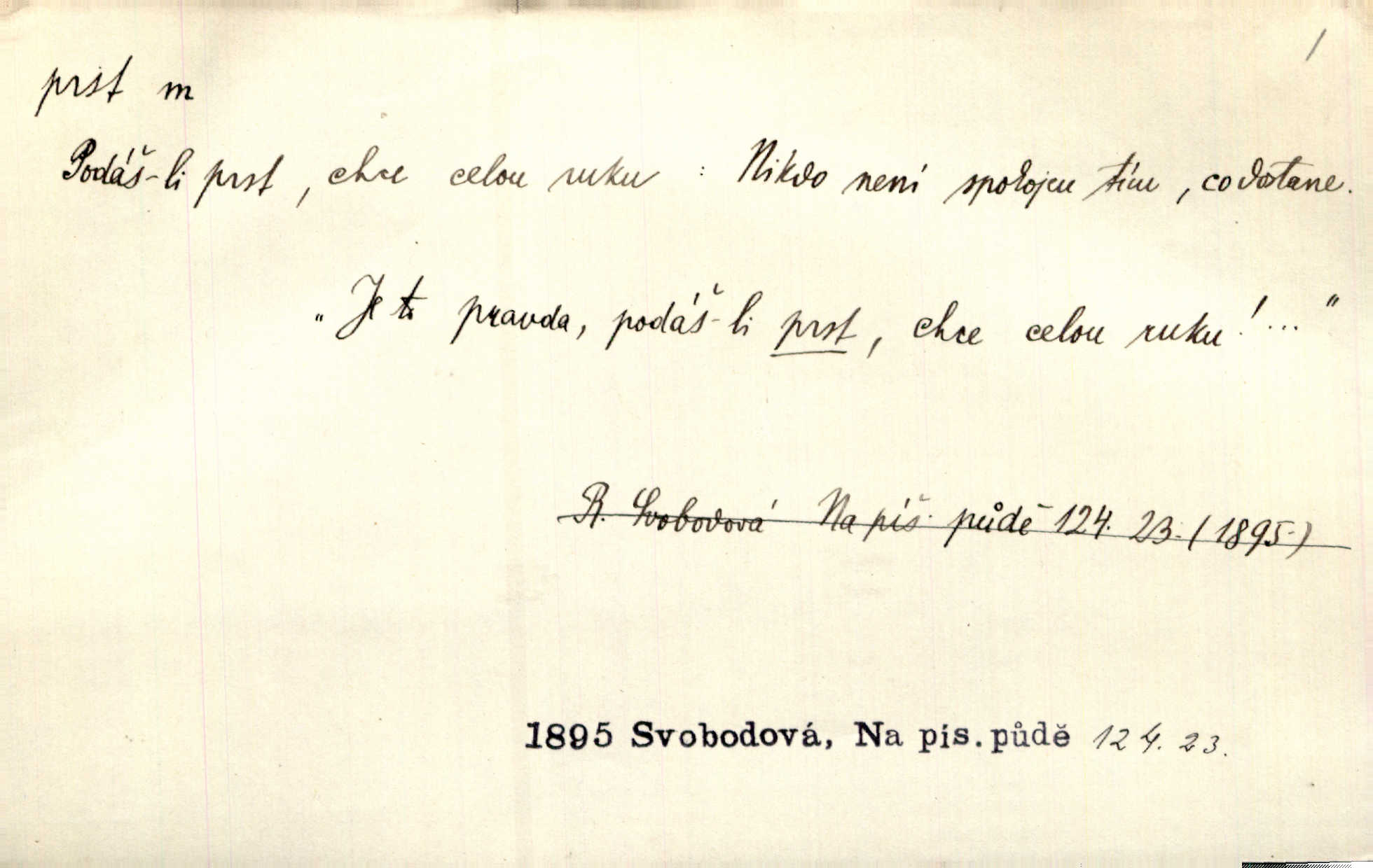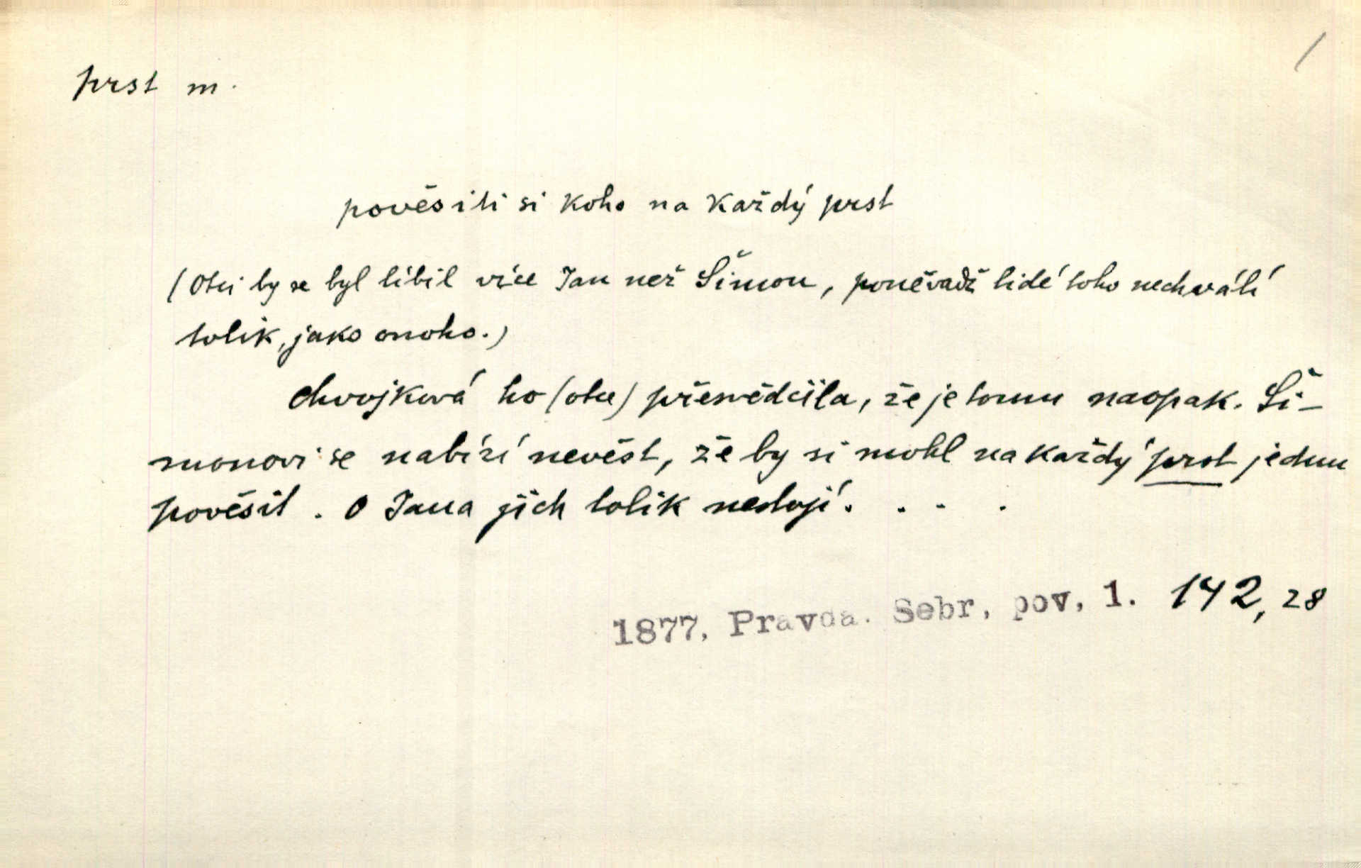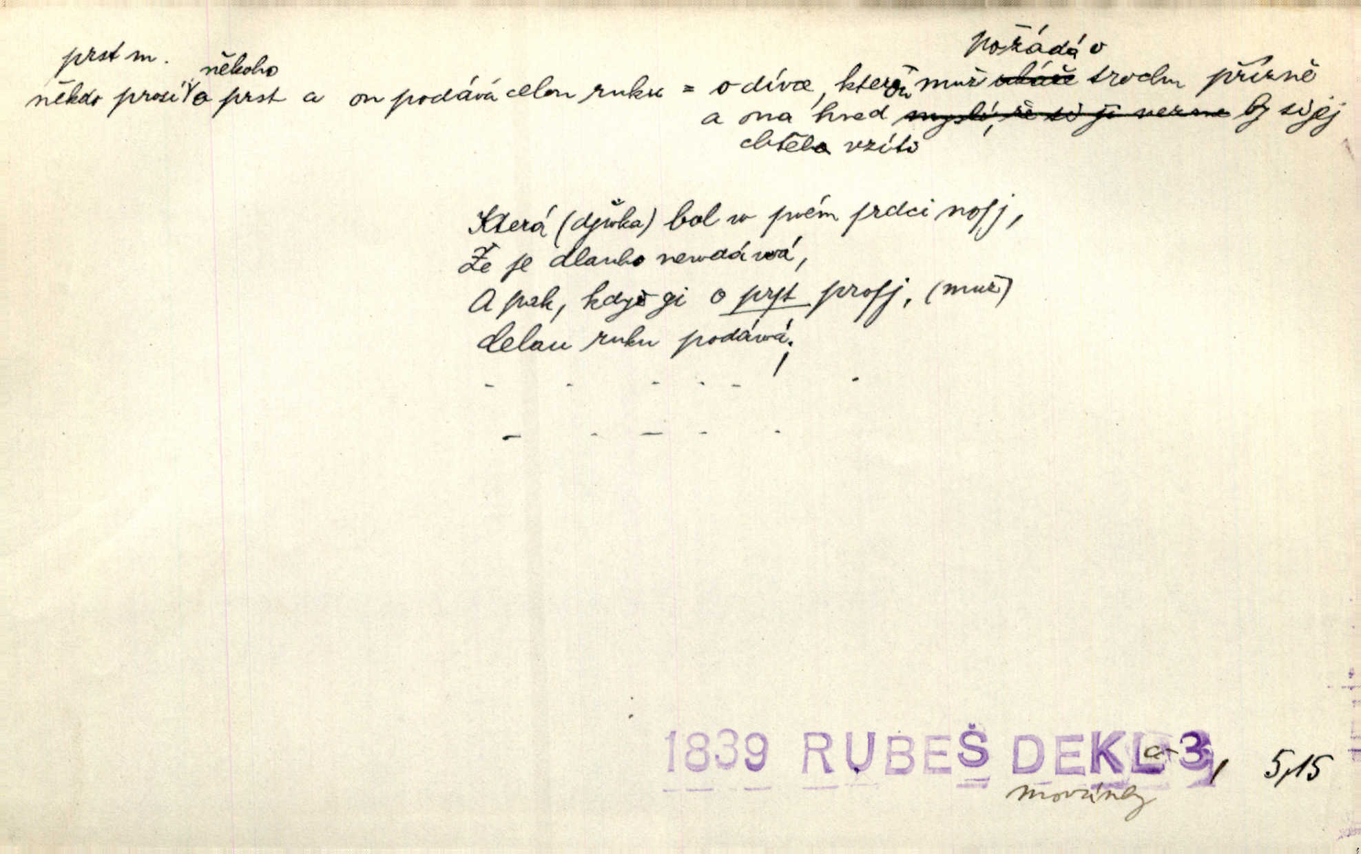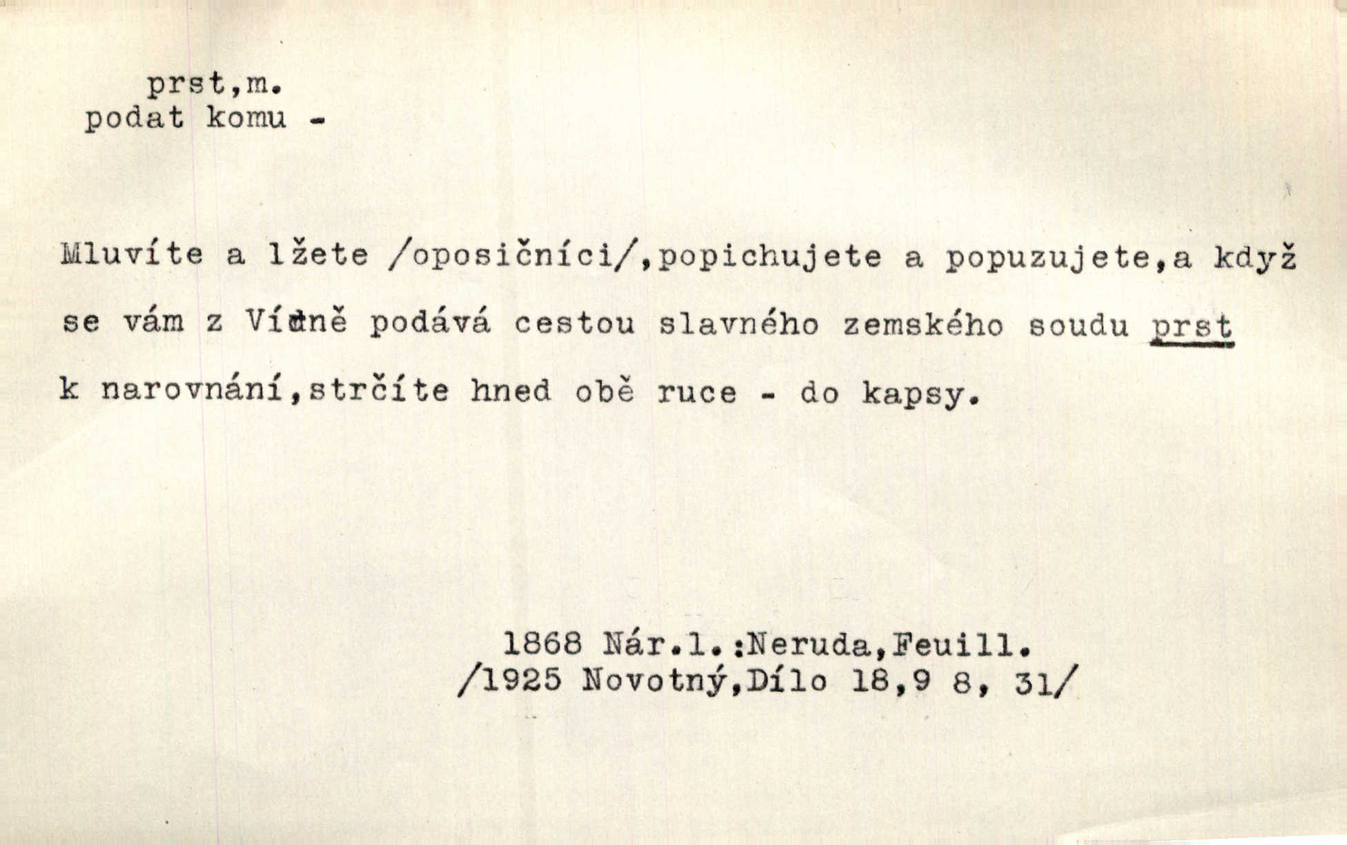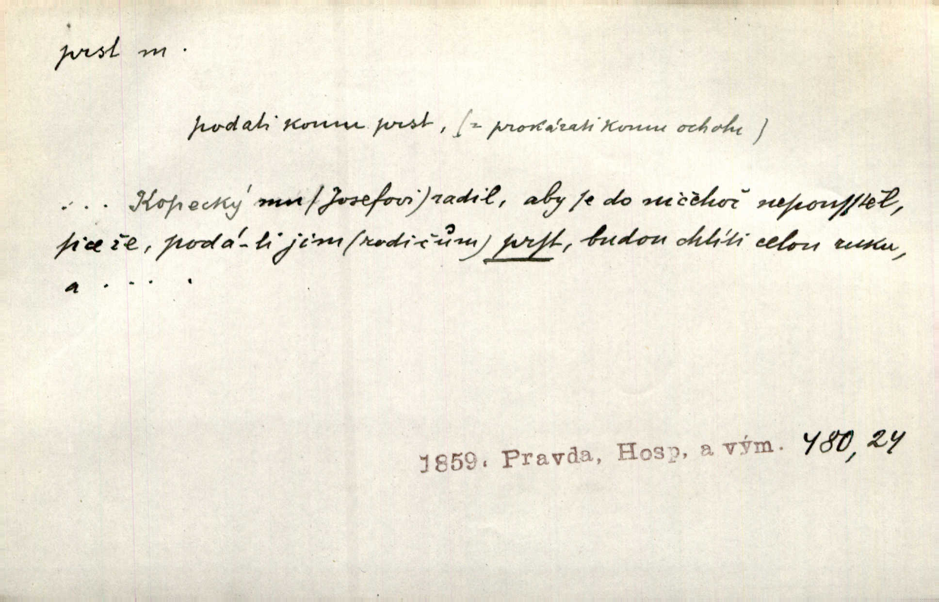- prst, -u m. jeden z pěti pohyblivých chápavých útvarů zakončujících ruku. [Stařena] prstem do dálky zahrozila. Rais. Barunka učila babičku jedním prstem hrát [na klavír:] „To jsou koně …“ Něm. Dáma po dámě docházely k zrcadlu a dotekem prstů opravovaly si účesky. V. Mrš. Historiky, kteří v těch letech psali monografie, spočítáš na pěti prstech je jich málo. Herb. Byl čas, kde se vlastenci čeští počítali na prsty. Štulc. Dobře mu není, toť si dovedeš vypočítat na prstech! snadno si domyslíš. Rais. Zvěř kolem mlýna má [strýc] spočítanou, řeklo by se, na prstech přesně, do posledního kousku. Herb. Ale především — prst na ústa, synáčku! Ani slova žádnému o tom mlčet. Tyl. Moudrý člověk, chceli všudy dobře vyjíti, musíť na ledacos skrz prsty hleděti shovívavě přehlížeti. Kram. Přestávají se na přistěhovalce dívat skrz prsty pohrdavě se dívati, přezírati. Rais. Prstem na mne okazují sousedé a zlořečí jmenu mému. Choch. Myslíte, že někdo v této věci prstem pohne? Sokol. Ten pán měl prsty všade do všeho zasahoval. Švan. Připustil, že si do těchto zlodějských obchodů namočil prsty. Lid. nov. Není dobře, do všeho nejdříve prsty strkat. Tyl. Proč si pálit prsty pro cizí kaštany? míchati se do cizích záležitostí, způsobovati si nepříjemnosti. Sez. Podejte jim prst, chytí vás hned za celou ruku. Něm. „Buďte tak dobrý,“ chopil se rada podávaného prstu. Her. Ruka s hranolovitými prsty bušila neúnavně do křemene. Jah. Od nynčka padne na každé tvé slovo mých pět prstů facka. Tyl. Krev z toho vycedím, kdo prstem sáhne na posla! sebe méně mu ublíží. Tyl. Ustál. sp. Nejraději jen za pět prstů kupují kradou. Svět. Přišel ke dvorci za pět prstů krádeží, zadarmo. Třeb. Řekla, že je Mojžíš Poberto, ze mu zůstane všecko pod prstem. Něm. Žes chtěl kupovati za deset prstů, tu máš odplatu! krásti. Kosm. Redaktor si oblízne prsty, když mu článek zašleme bude velmi rád. Tyl. [Obchodník] hleděl všude zřízencům na prsty měl na ně dobrý pozor. Hlad. Koukali se každému pod prsty, kolik mu co vynáší. Bass. Jak já jsem ti viděl do prstů! prohlédl tvé plány. Svob. V něm [dopise v novinách] byl hodně klepán přes prsty starosta, že prý: kolik se stržilo za sena a kde jsou peníze? Herb. Potká [hoch] na pastvě mužíka na prst velikého jako prst velikého. Tille. V zimě je den krátký jako prst — ve čtyři hodiny už je tma. Baar. Ta to s ním [mužem] umí — kolem prstu si ho otočila učinila si ho ve všem povolným. Rais. Jsou spolu několik neděl, a juž ho má [žena] takhle kolem prstu. Rais. Přivedli jsme ho [Štěpána]‚ nahého jako prst do pokoje. Hol. „Kdo ti co namluvil?“ — „Z prstu si to lidé nevycucali“ nevymyslili, nevybájili. Tyl. Je v tom cizím světě sám jako prst. Kosm. [Hospodář] je tu šestým prstem na ruce je zbytečný, nic neplatí. Hol. Věděl, jak snadno lze dosíci jejich [děvčat] lásky. „Na každý prst deset,“ říkával. R. Svob. Šimonovi se nabízí nevěst, že by si mohl na každý prst jednu pověsit. Prav. Z každého prstu mu vtipnost a rozmyslnost vykukuje! Klicp. Uhodil-li nevinné dobytče, že to měl, takořka, v prstech, již očekával, že mu kmet domluví měl to již ve zvyku, v krvi. Prav. Lenka hrávala na piano. Měla zlaté prsty! hrála velmi pěkně. Šmil. Takový [pán] nemá dlouhé prsty do kapsy, takový se nepředá není štědrý. Jir. [Tesař] měl dlouhé prsty, takže mu v kapse mizely skoby a hřebíky kradl. Til. Krade jen bohatým, ale lepkavé prsty má od jakživa je nenechavý. Šmil. Přen. [Odpolední slunce] dotýká se světlými prsty vlasů paní Hordové. Jah. K okénku měsíc naklonil se hebce, a prstem třpytným nad svou skráň se chýle, tkal do tvojich snů rosné růže bílé. Vrch. Podávaly si révové úponky klidně své zelené prsty. Vrch. [Světlo] stékalo po rozestřených prstech palm. V. Mrš. D prst Boží, Páně a p. řízení, zásah, působení a p. Boží. Dobrý Bože! teď poznávám tvůj prst! Klicp. Vidím v tom prst boží, který mě vedl na toto místo. Herb. Někteří v tom [neštěstí] viděli trestající prst Páně. Rub. Prst prozřetelnosti hnal mne z domu. Herb. Přen. Krásná, prstem času dosud nedotknutá žena. Podl. Nebylyť [tváře] zorány prstem starostí vezdejších. Svět. Upomínku na slastný okamžik nevyhladí nikdo, leda jen ledový prst, pod nímž však i srdce tlouci ustane smrt. Jir. Žert. „Otevřít tadyhle tu truhlu!“ velel úřední prst úřední orgán, úředník. A. Mrš. D díl rukavice, který kryje prst. Nosí rukavičky, třeba s děravými prsty. Hol. Měla černé rukavice s polovičními prsty. Kop. [Dívky měly] dlouhé pletené rukavice bez prstů. Jir. Lék. kaučukové prsty jednotlivé (na poraněné, znetvořené prsty). D jeden z pohyblivých útvarů zakončujících chodidlo nohy. Málo sejde po tom, je-li do posledního detailu proveden prst ruky nebo nohy. Kar. Zatím jim koukaly prsty z bot měli bídu a nouzi. Svět. Po prstech se vykradl ze sedničky po špičkách, tiše. Pfleg. Mnohem raději mu [chudákovi] vidí paty než prsty raději vidí jeho odchod než příchod. Svět. D Zool. prsty konečná část okončin ssavců. D (v přibližném udávání míry) šířka prstu ruky; stará délková míra. Tuhle si zakrojte, na prst tlustě namažte. Jah. Ani o tři prsty mne nepřibylo. Rais. Na skvostném, čtyři prsty širokém pasu visel mu těžký meč. Třeb. Prst je šířka 4 ječných zrn položených vedle sebe. Vilikovský. D věc vzhledem podobná prstu. Mysl. část lopat daňka. Stroj. strojní součást v podobě prstu ruky. Prsty žacího stroje hroty s přiostřenými hranami umístěné vpředu na žacím rámu a odhrnující plodinu.
