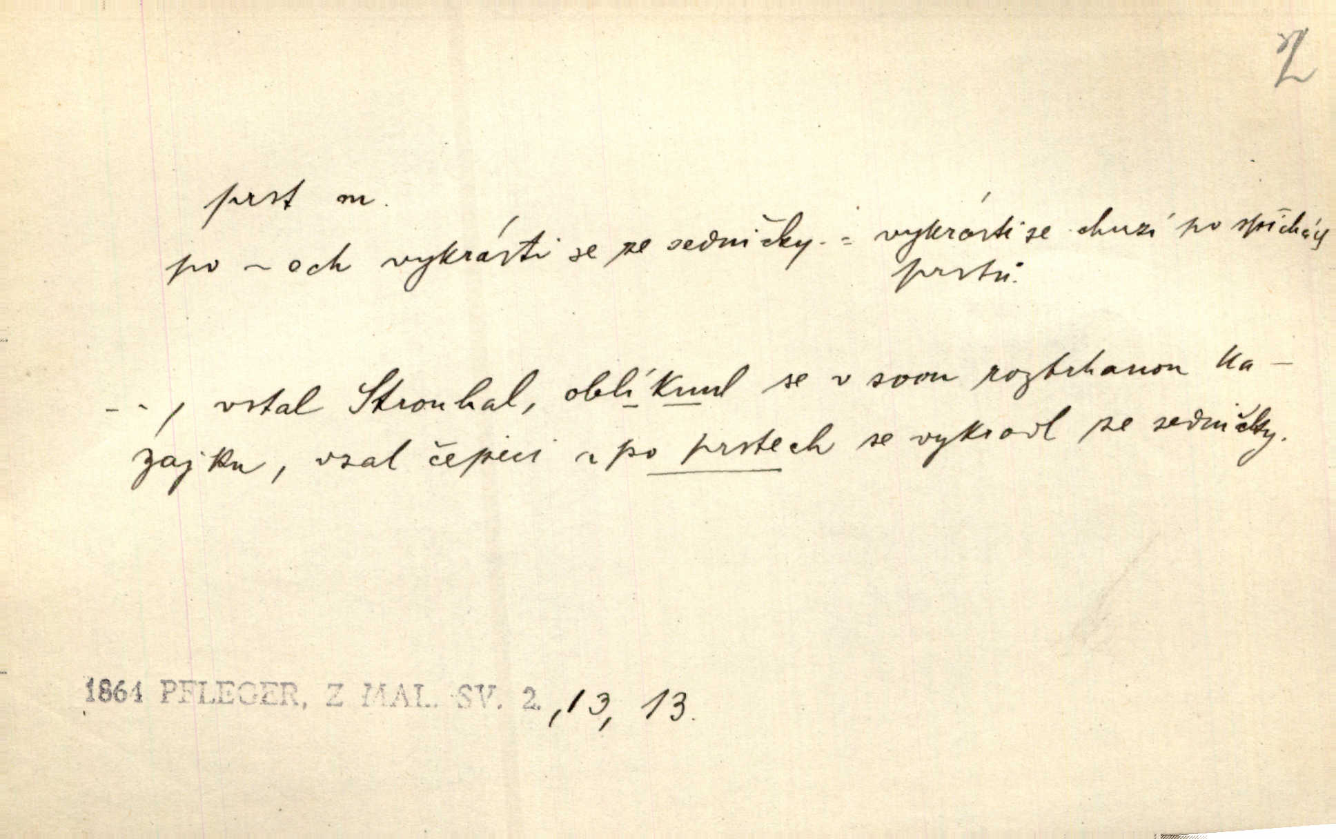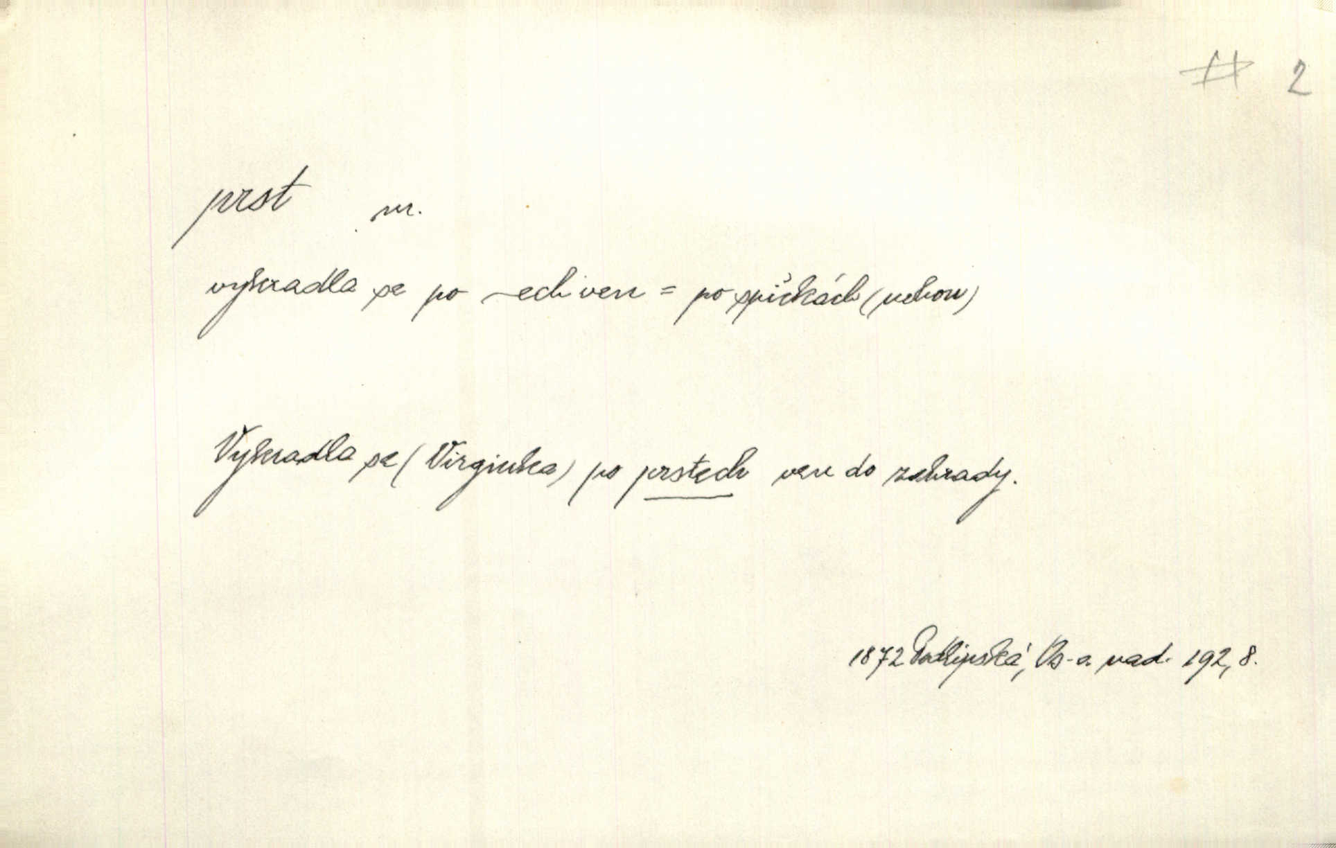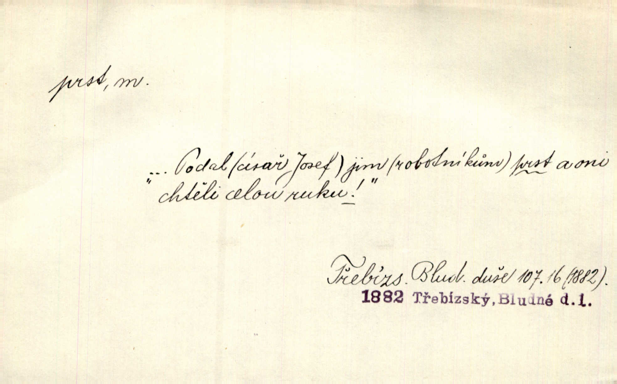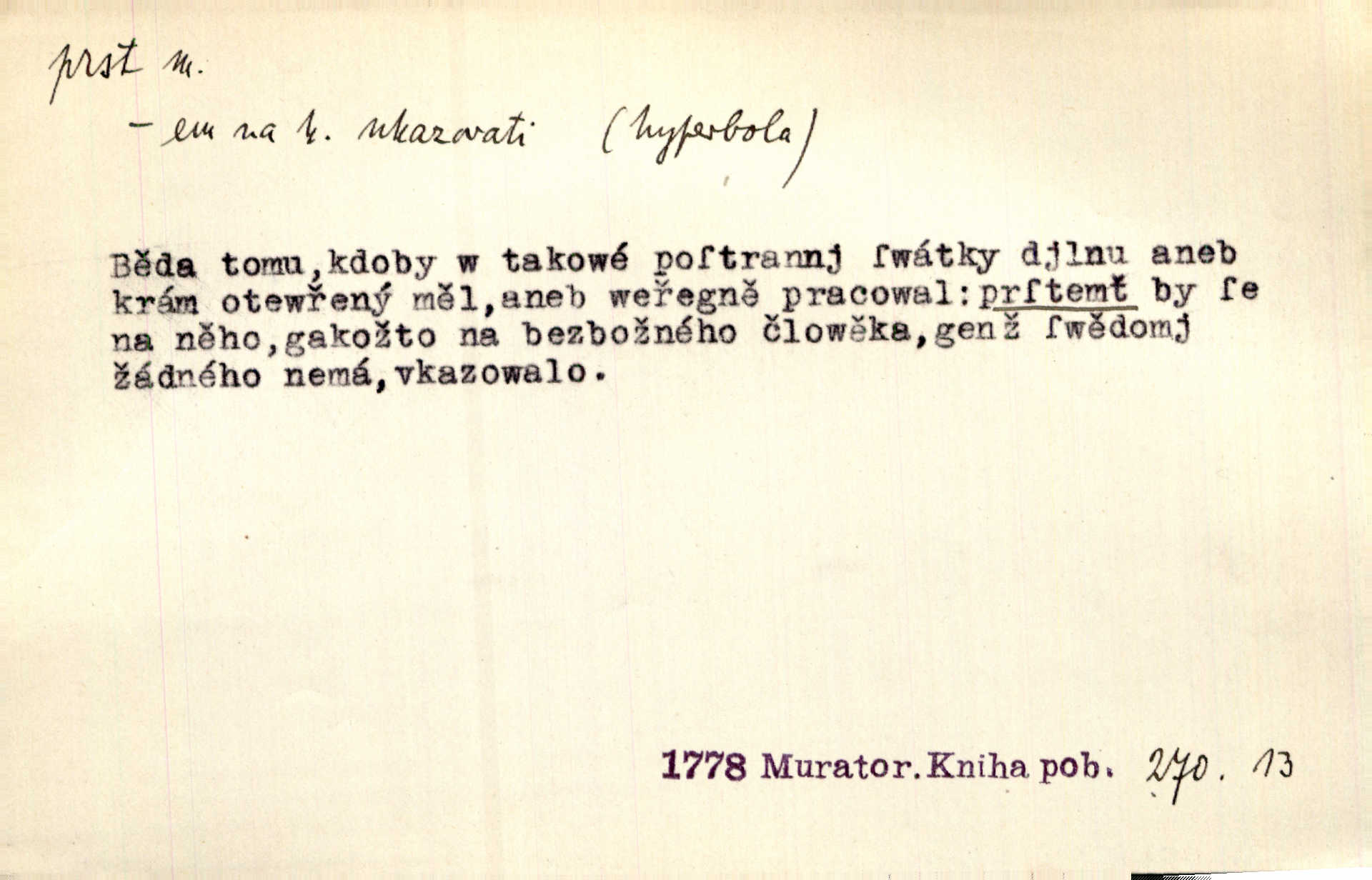 - prst, -u m. jeden z pěti pohyblivých chápavých útvarů zakončujících ruku. [Stařena] prstem do dálky zahrozila. Rais. Barunka učila babičku jedním prstem hrát [na klavír:] „To jsou koně …“ Něm. Dáma po dámě docházely k zrcadlu a dotekem prstů opravovaly si účesky. V. Mrš. Historiky, kteří v těch letech psali monografie, spočítáš na pěti prstech je jich málo. Herb. Byl čas, kde se vlastenci čeští počítali na prsty. Štulc. Dobře mu není, toť si dovedeš vypočítat na prstech! snadno si domyslíš. Rais. Zvěř kolem mlýna má [strýc] spočítanou, řeklo by se, na prstech přesně, do posledního kousku. Herb. Ale především — prst na ústa, synáčku! Ani slova žádnému o tom mlčet. Tyl. Moudrý člověk, chceli všudy dobře vyjíti, musíť na ledacos skrz prsty hleděti shovívavě přehlížeti. Kram. Přestávají se na přistěhovalce dívat skrz prsty pohrdavě se dívati, přezírati. Rais. Prstem na mne okazují sousedé a zlořečí jmenu mému. Choch. Myslíte, že někdo v této věci prstem pohne? Sokol. Ten pán měl prsty všade do všeho zasahoval. Švan. Připustil, že si do těchto zlodějských obchodů namočil prsty. Lid. nov. Není dobře, do všeho nejdříve prsty strkat. Tyl. Proč si pálit prsty pro cizí kaštany? míchati se do cizích záležitostí, způsobovati si nepříjemnosti. Sez. Podejte jim prst, chytí vás hned za celou ruku. Něm. „Buďte tak dobrý,“ chopil se rada podávaného prstu. Her. Ruka s hranolovitými prsty bušila neúnavně do křemene. Jah. Od nynčka padne na každé tvé slovo mých pět prstů facka. Tyl. Krev z toho vycedím, kdo prstem sáhne na posla! sebe méně mu ublíží. Tyl. Ustál. sp. Nejraději jen za pět prstů kupují kradou. Svět. Přišel ke dvorci za pět prstů krádeží, zadarmo. Třeb. Řekla, že je Mojžíš Poberto, ze mu zůstane všecko pod prstem. Něm. Žes chtěl kupovati za deset prstů, tu máš odplatu! krásti. Kosm. Redaktor si oblízne prsty, když mu článek zašleme bude velmi rád. Tyl. [Obchodník] hleděl všude zřízencům na prsty měl na ně dobrý pozor. Hlad. Koukali se každému pod prsty, kolik mu co vynáší. Bass. Jak já jsem ti viděl do prstů! prohlédl tvé plány. Svob. V něm [dopise v novinách] byl hodně klepán přes prsty starosta, že prý: kolik se stržilo za sena a kde jsou peníze? Herb. Potká [hoch] na pastvě mužíka na prst velikého jako prst velikého. Tille. V zimě je den krátký jako prst — ve čtyři hodiny už je tma. Baar. Ta to s ním [mužem] umí — kolem prstu si ho otočila učinila si ho ve všem povolným. Rais. Jsou spolu několik neděl, a juž ho má [žena] takhle kolem prstu. Rais. Přivedli jsme ho [Štěpána]‚ nahého jako prst do pokoje. Hol. „Kdo ti co namluvil?“ — „Z prstu si to lidé nevycucali“ nevymyslili, nevybájili. Tyl. Je v tom cizím světě sám jako prst. Kosm. [Hospodář] je tu šestým prstem na ruce je zbytečný, nic neplatí. Hol. Věděl, jak snadno lze dosíci jejich [děvčat] lásky. „Na každý prst deset,“ říkával. R. Svob. Šimonovi se nabízí nevěst, že by si mohl na každý prst jednu pověsit. Prav. Z každého prstu mu vtipnost a rozmyslnost vykukuje! Klicp. Uhodil-li nevinné dobytče, že to měl, takořka, v prstech, již očekával, že mu kmet domluví měl to již ve zvyku, v krvi. Prav. Lenka hrávala na piano. Měla zlaté prsty! hrála velmi pěkně. Šmil. Takový [pán] nemá dlouhé prsty do kapsy, takový se nepředá není štědrý. Jir. [Tesař] měl dlouhé prsty, takže mu v kapse mizely skoby a hřebíky kradl. Til. Krade jen bohatým, ale lepkavé prsty má od jakživa je nenechavý. Šmil. Přen. [Odpolední slunce] dotýká se světlými prsty vlasů paní Hordové. Jah. K okénku měsíc naklonil se hebce, a prstem třpytným nad svou skráň se chýle, tkal do tvojich snů rosné růže bílé. Vrch. Podávaly si révové úponky klidně své zelené prsty. Vrch. [Světlo] stékalo po rozestřených prstech palm. V. Mrš. D prst Boží, Páně a p. řízení, zásah, působení a p. Boží. Dobrý Bože! teď poznávám tvůj prst! Klicp. Vidím v tom prst boží, který mě vedl na toto místo. Herb. Někteří v tom [neštěstí] viděli trestající prst Páně. Rub. Prst prozřetelnosti hnal mne z domu. Herb. Přen. Krásná, prstem času dosud nedotknutá žena. Podl. Nebylyť [tváře] zorány prstem starostí vezdejších. Svět. Upomínku na slastný okamžik nevyhladí nikdo, leda jen ledový prst, pod nímž však i srdce tlouci ustane smrt. Jir. Žert. „Otevřít tadyhle tu truhlu!“ velel úřední prst úřední orgán, úředník. A. Mrš. D díl rukavice, který kryje prst. Nosí rukavičky, třeba s děravými prsty. Hol. Měla černé rukavice s polovičními prsty. Kop. [Dívky měly] dlouhé pletené rukavice bez prstů. Jir. Lék. kaučukové prsty jednotlivé (na poraněné, znetvořené prsty). D jeden z pohyblivých útvarů zakončujících chodidlo nohy. Málo sejde po tom, je-li do posledního detailu proveden prst ruky nebo nohy. Kar. Zatím jim koukaly prsty z bot měli bídu a nouzi. Svět. Po prstech se vykradl ze sedničky po špičkách, tiše. Pfleg. Mnohem raději mu [chudákovi] vidí paty než prsty raději vidí jeho odchod než příchod. Svět. D Zool. prsty konečná část okončin ssavců. D (v přibližném udávání míry) šířka prstu ruky; stará délková míra. Tuhle si zakrojte, na prst tlustě namažte. Jah. Ani o tři prsty mne nepřibylo. Rais. Na skvostném, čtyři prsty širokém pasu visel mu těžký meč. Třeb. Prst je šířka 4 ječných zrn položených vedle sebe. Vilikovský. D věc vzhledem podobná prstu. Mysl. část lopat daňka. Stroj. strojní součást v podobě prstu ruky. Prsty žacího stroje hroty s přiostřenými hranami umístěné vpředu na žacím rámu a odhrnující plodinu.