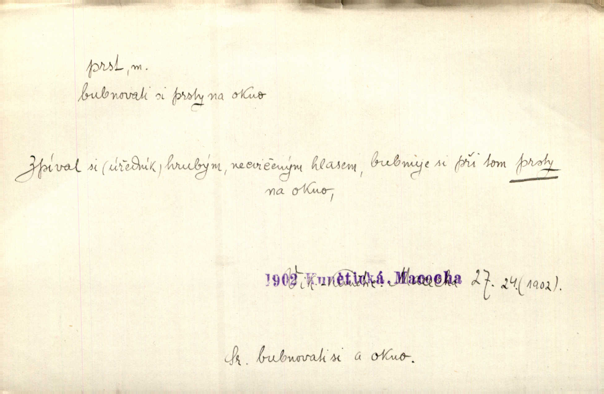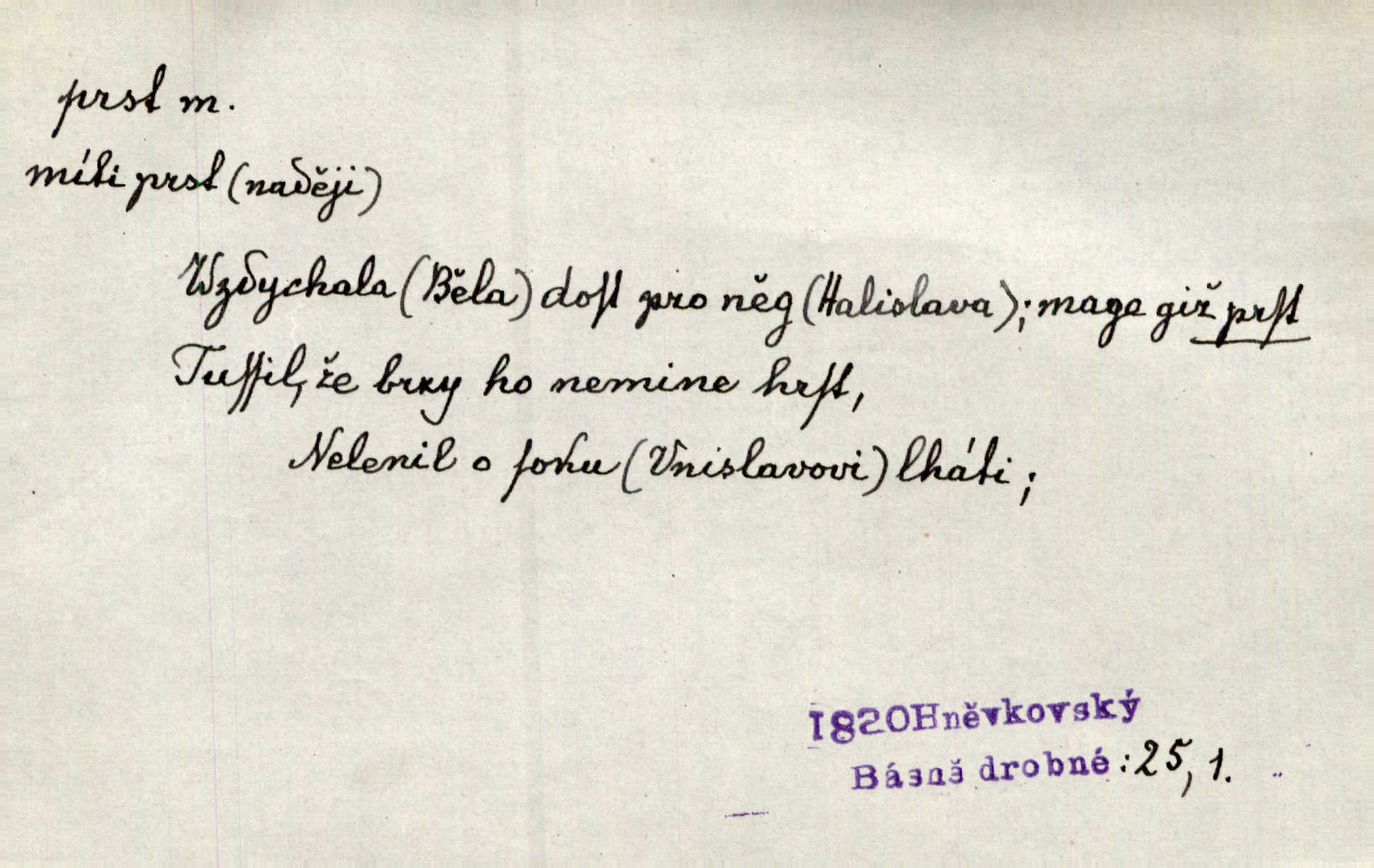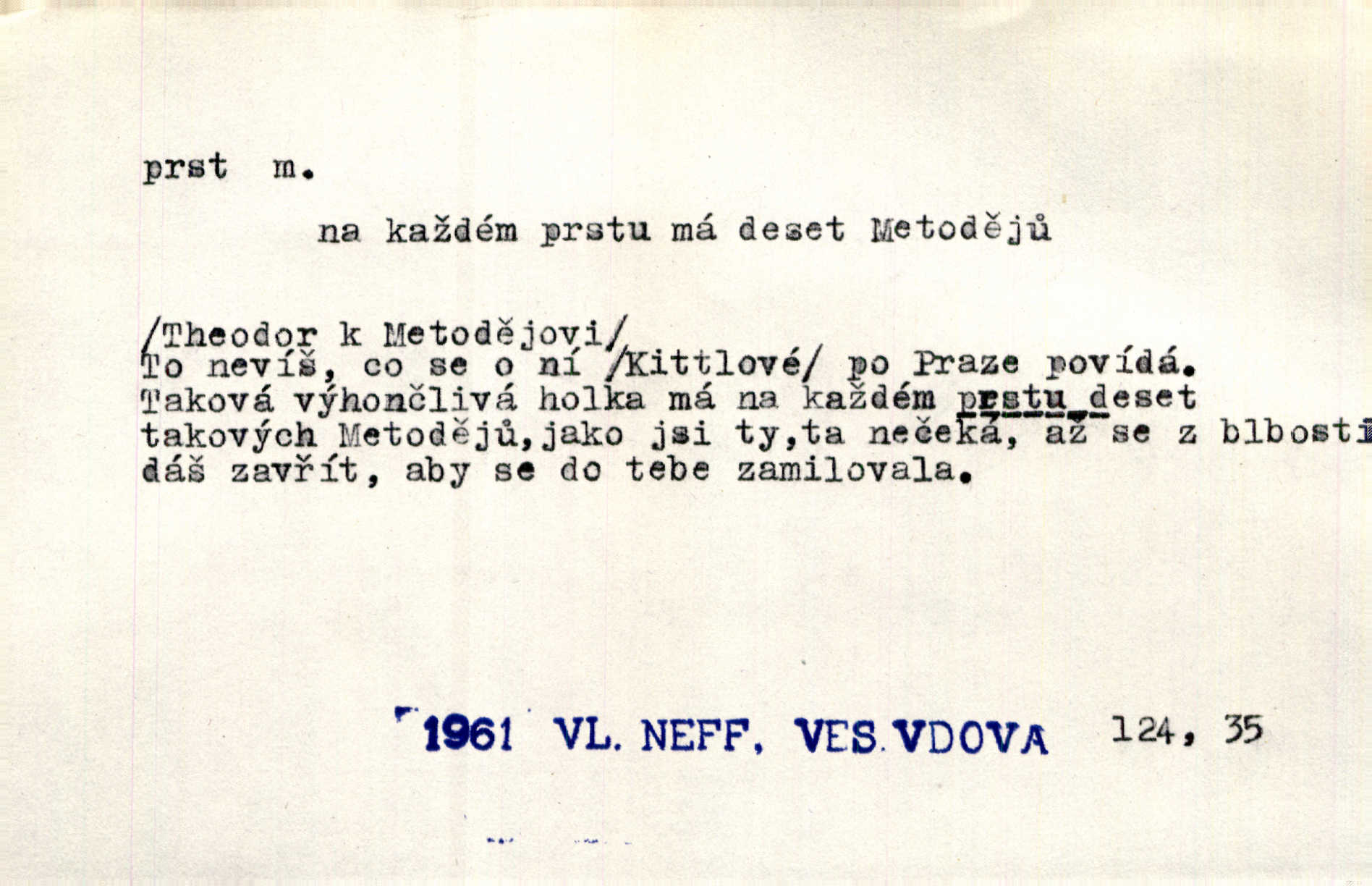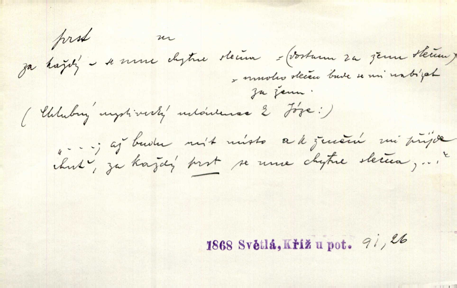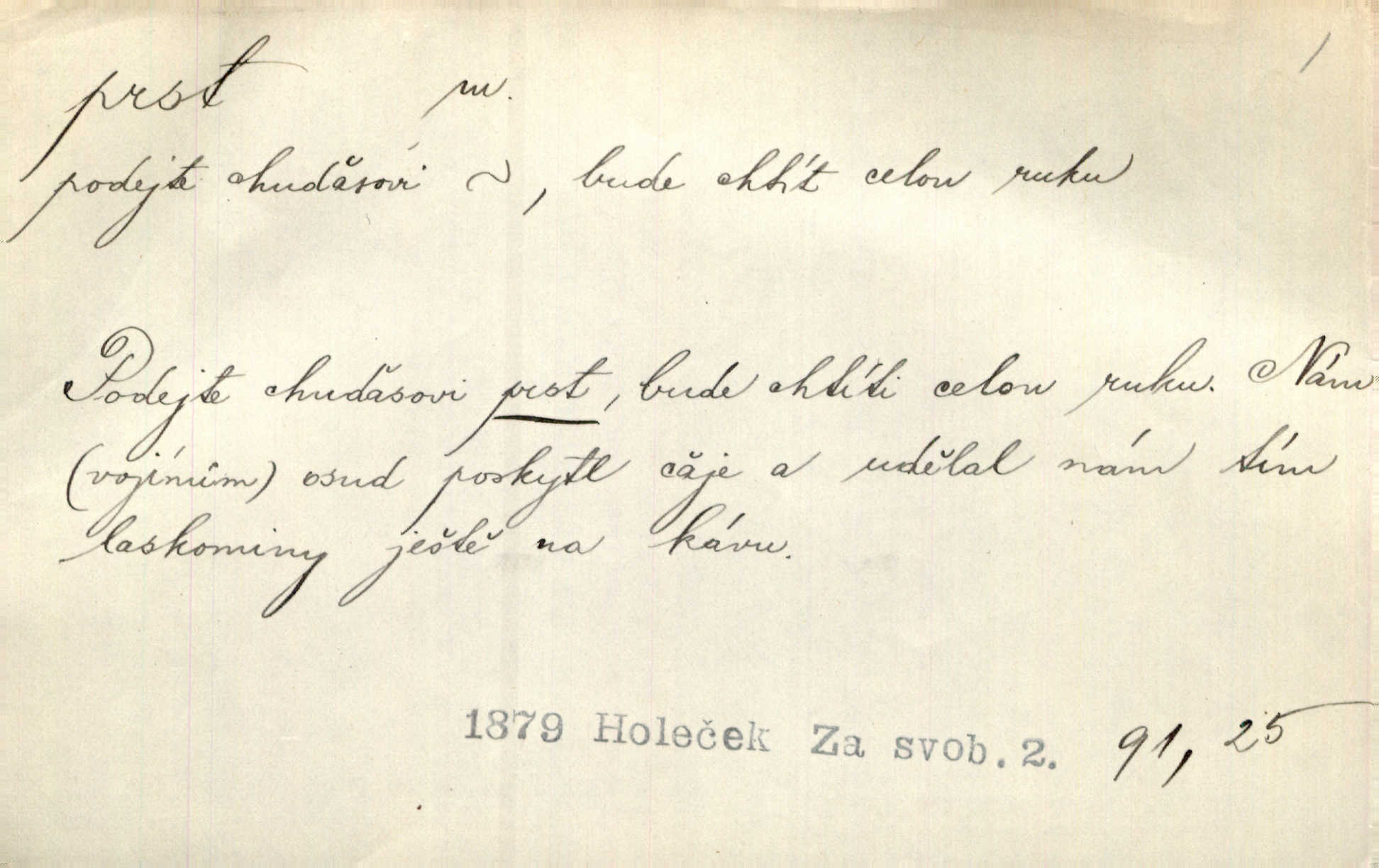 - prst, -u m. jeden z pěti pohyblivých chápavých útvarů zakončujících ruku. [Stařena] prstem do dálky zahrozila. Rais. Barunka učila babičku jedním prstem hrát [na klavír:] „To jsou koně …“ Něm. Dáma po dámě docházely k zrcadlu a dotekem prstů opravovaly si účesky. V. Mrš. Historiky, kteří v těch letech psali monografie, spočítáš na pěti prstech je jich málo. Herb. Byl čas, kde se vlastenci čeští počítali na prsty. Štulc. Dobře mu není, toť si dovedeš vypočítat na prstech! snadno si domyslíš. Rais. Zvěř kolem mlýna má [strýc] spočítanou, řeklo by se, na prstech přesně, do posledního kousku. Herb. Ale především — prst na ústa, synáčku! Ani slova žádnému o tom mlčet. Tyl. Moudrý člověk, chceli všudy dobře vyjíti, musíť na ledacos skrz prsty hleděti shovívavě přehlížeti. Kram. Přestávají se na přistěhovalce dívat skrz prsty pohrdavě se dívati, přezírati. Rais. Prstem na mne okazují sousedé a zlořečí jmenu mému. Choch. Myslíte, že někdo v této věci prstem pohne? Sokol. Ten pán měl prsty všade do všeho zasahoval. Švan. Připustil, že si do těchto zlodějských obchodů namočil prsty. Lid. nov. Není dobře, do všeho nejdříve prsty strkat. Tyl. Proč si pálit prsty pro cizí kaštany? míchati se do cizích záležitostí, způsobovati si nepříjemnosti. Sez. Podejte jim prst, chytí vás hned za celou ruku. Něm. „Buďte tak dobrý,“ chopil se rada podávaného prstu. Her. Ruka s hranolovitými prsty bušila neúnavně do křemene. Jah. Od nynčka padne na každé tvé slovo mých pět prstů facka. Tyl. Krev z toho vycedím, kdo prstem sáhne na posla! sebe méně mu ublíží. Tyl. Ustál. sp. Nejraději jen za pět prstů kupují kradou. Svět. Přišel ke dvorci za pět prstů krádeží, zadarmo. Třeb. Řekla, že je Mojžíš Poberto, ze mu zůstane všecko pod prstem. Něm. Žes chtěl kupovati za deset prstů, tu máš odplatu! krásti. Kosm. Redaktor si oblízne prsty, když mu článek zašleme bude velmi rád. Tyl. [Obchodník] hleděl všude zřízencům na prsty měl na ně dobrý pozor. Hlad. Koukali se každému pod prsty, kolik mu co vynáší. Bass. Jak já jsem ti viděl do prstů! prohlédl tvé plány. Svob. V něm [dopise v novinách] byl hodně klepán přes prsty starosta, že prý: kolik se stržilo za sena a kde jsou peníze? Herb. Potká [hoch] na pastvě mužíka na prst velikého jako prst velikého. Tille. V zimě je den krátký jako prst — ve čtyři hodiny už je tma. Baar. Ta to s ním [mužem] umí — kolem prstu si ho otočila učinila si ho ve všem povolným. Rais. Jsou spolu několik neděl, a juž ho má [žena] takhle kolem prstu. Rais. Přivedli jsme ho [Štěpána]‚ nahého jako prst do pokoje. Hol. „Kdo ti co namluvil?“ — „Z prstu si to lidé nevycucali“ nevymyslili, nevybájili. Tyl. Je v tom cizím světě sám jako prst. Kosm. [Hospodář] je tu šestým prstem na ruce je zbytečný, nic neplatí. Hol. Věděl, jak snadno lze dosíci jejich [děvčat] lásky. „Na každý prst deset,“ říkával. R. Svob. Šimonovi se nabízí nevěst, že by si mohl na každý prst jednu pověsit. Prav. Z každého prstu mu vtipnost a rozmyslnost vykukuje! Klicp. Uhodil-li nevinné dobytče, že to měl, takořka, v prstech, již očekával, že mu kmet domluví měl to již ve zvyku, v krvi. Prav. Lenka hrávala na piano. Měla zlaté prsty! hrála velmi pěkně. Šmil. Takový [pán] nemá dlouhé prsty do kapsy, takový se nepředá není štědrý. Jir. [Tesař] měl dlouhé prsty, takže mu v kapse mizely skoby a hřebíky kradl. Til. Krade jen bohatým, ale lepkavé prsty má od jakživa je nenechavý. Šmil. Přen. [Odpolední slunce] dotýká se světlými prsty vlasů paní Hordové. Jah. K okénku měsíc naklonil se hebce, a prstem třpytným nad svou skráň se chýle, tkal do tvojich snů rosné růže bílé. Vrch. Podávaly si révové úponky klidně své zelené prsty. Vrch. [Světlo] stékalo po rozestřených prstech palm. V. Mrš. D prst Boží, Páně a p. řízení, zásah, působení a p. Boží. Dobrý Bože! teď poznávám tvůj prst! Klicp. Vidím v tom prst boží, který mě vedl na toto místo. Herb. Někteří v tom [neštěstí] viděli trestající prst Páně. Rub. Prst prozřetelnosti hnal mne z domu. Herb. Přen. Krásná, prstem času dosud nedotknutá žena. Podl. Nebylyť [tváře] zorány prstem starostí vezdejších. Svět. Upomínku na slastný okamžik nevyhladí nikdo, leda jen ledový prst, pod nímž však i srdce tlouci ustane smrt. Jir. Žert. „Otevřít tadyhle tu truhlu!“ velel úřední prst úřední orgán, úředník. A. Mrš. D díl rukavice, který kryje prst. Nosí rukavičky, třeba s děravými prsty. Hol. Měla černé rukavice s polovičními prsty. Kop. [Dívky měly] dlouhé pletené rukavice bez prstů. Jir. Lék. kaučukové prsty jednotlivé (na poraněné, znetvořené prsty). D jeden z pohyblivých útvarů zakončujících chodidlo nohy. Málo sejde po tom, je-li do posledního detailu proveden prst ruky nebo nohy. Kar. Zatím jim koukaly prsty z bot měli bídu a nouzi. Svět. Po prstech se vykradl ze sedničky po špičkách, tiše. Pfleg. Mnohem raději mu [chudákovi] vidí paty než prsty raději vidí jeho odchod než příchod. Svět. D Zool. prsty konečná část okončin ssavců. D (v přibližném udávání míry) šířka prstu ruky; stará délková míra. Tuhle si zakrojte, na prst tlustě namažte. Jah. Ani o tři prsty mne nepřibylo. Rais. Na skvostném, čtyři prsty širokém pasu visel mu těžký meč. Třeb. Prst je šířka 4 ječných zrn položených vedle sebe. Vilikovský. D věc vzhledem podobná prstu. Mysl. část lopat daňka. Stroj. strojní součást v podobě prstu ruky. Prsty žacího stroje hroty s přiostřenými hranami umístěné vpředu na žacím rámu a odhrnující plodinu.