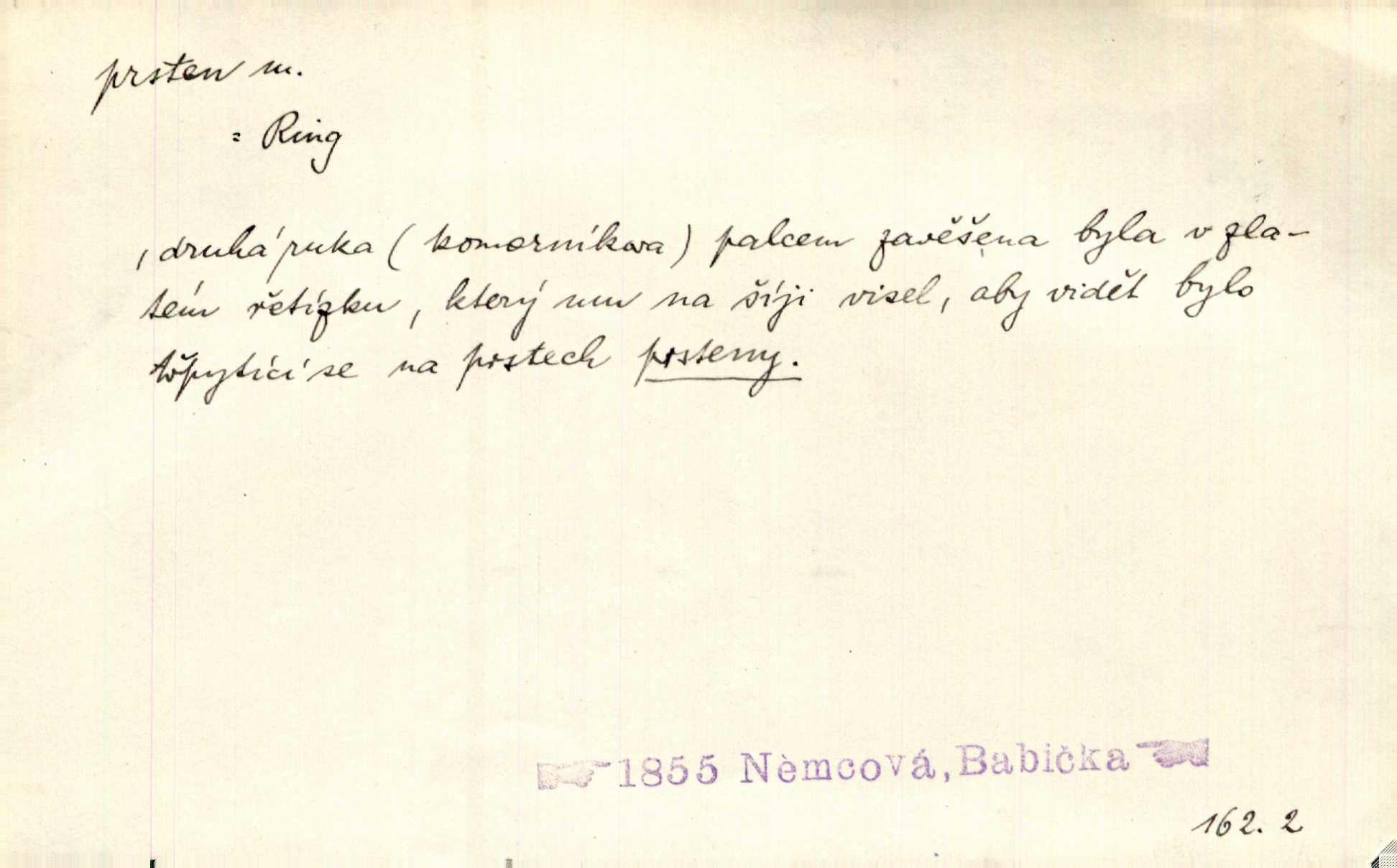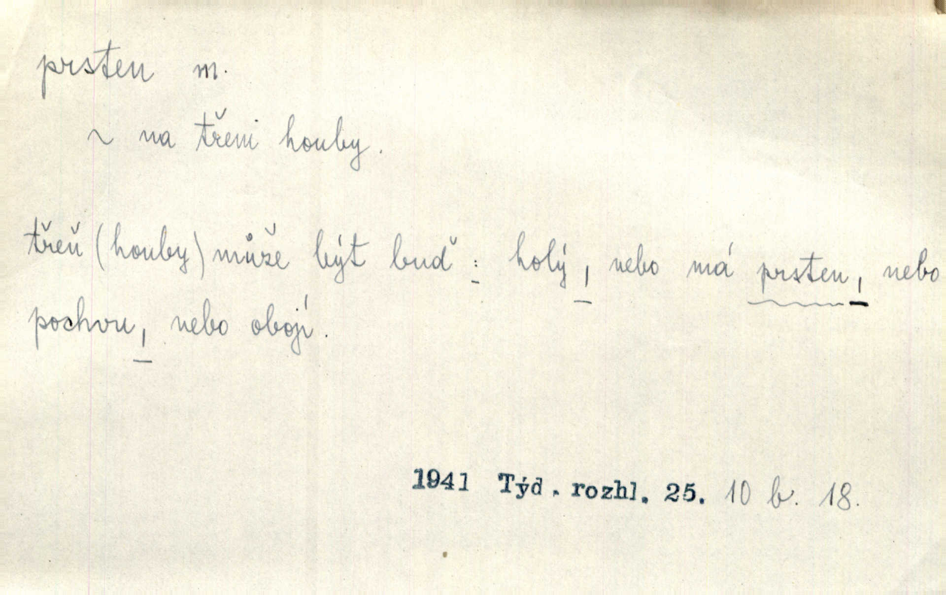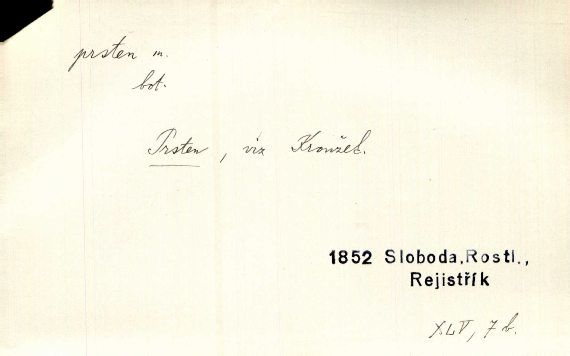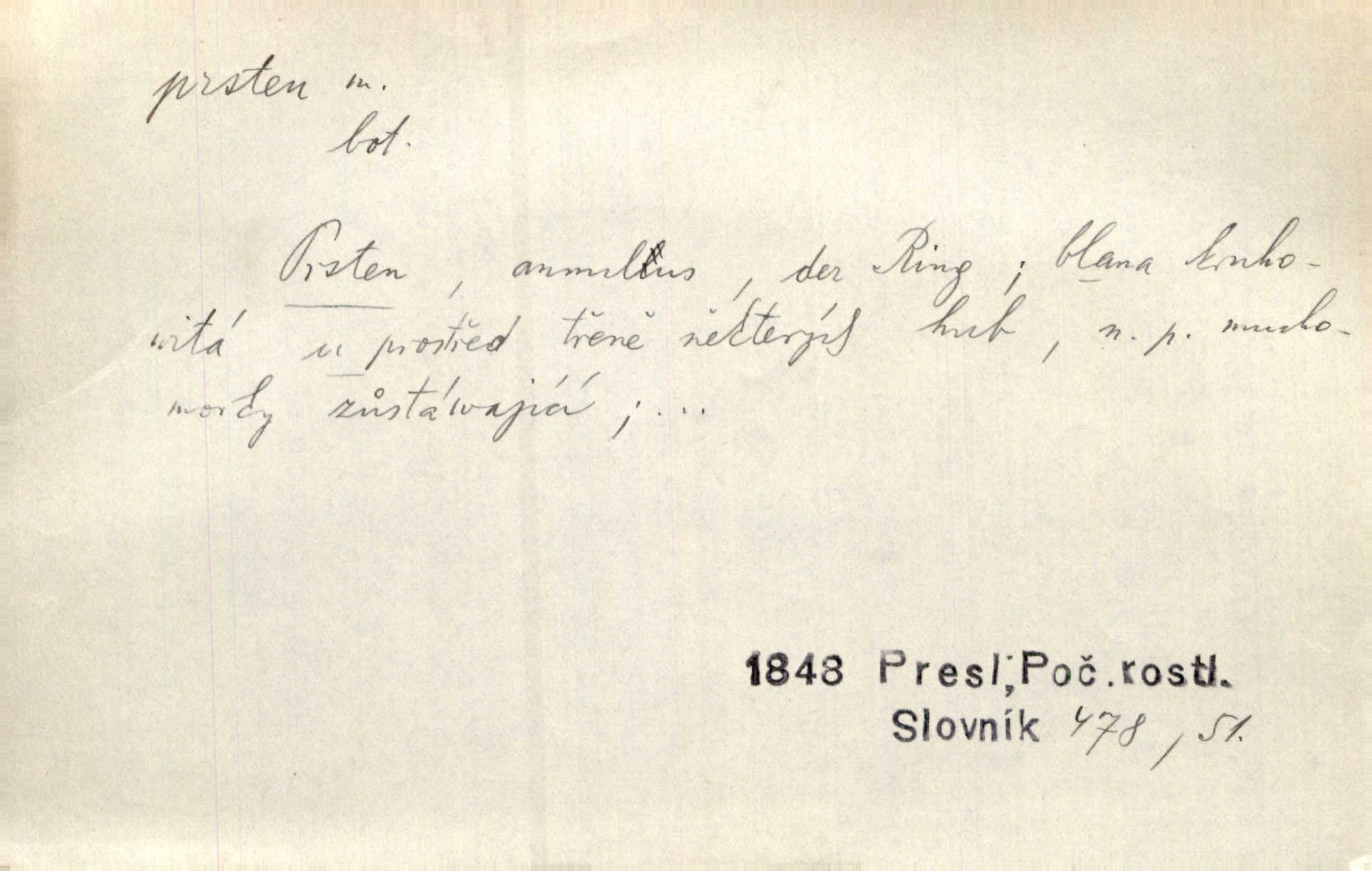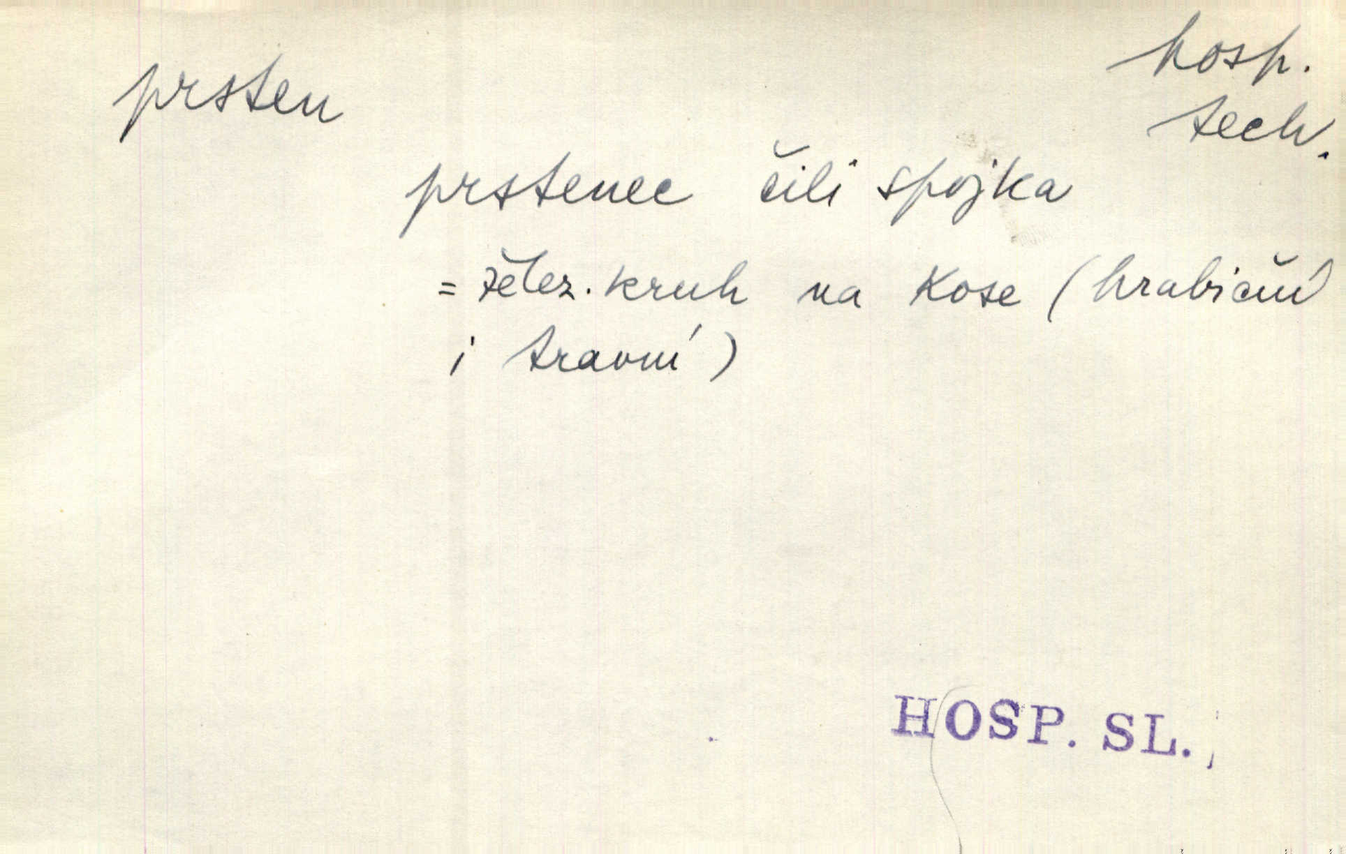 - prsten, -u m. kroužek, obyč. z drahého kovu, navlékaný na prst jako ozdoba, odznak důstojenství, manželství a pod. Na prstech měl [Kvoch] několik prstenů. Hál. Nejbohatší krámy v Římě jsou krámy zlatnické, v nichž plno brillantových prstenů kněžských. Ner. Já měl jen srdce a trochu těch písní, on [sok] dům ve Frydku a prsteny zlaté. Bezr. Stařec dá Blažkovi prsten, plnící ve jménu božím každé přání. Tille. Pak to psaní složil, zapečetil a přitlačil svůj prsten. Erb. Ochotně jej vyslechneš a směníš s ním snubný prsten. Šmil. Círk. prsten rybářský odznak biskupské hodnosti papeže, na jehož pečeti je vyryto lovení ryb sv. Petrem. Sport. hra na zlatý prsten druh dětských her. D kroužek navlékaný na prst a uzpůsobený jako zbraň. Drotar měl proraženu hlavu železným prstenem, jejž Bavoři rádi nosí a jichž při pranicích používají. Něm. D kruh. Jen v těch místech kraj není obklíčen prstenem lesů. Hol. Prsten lidí se rozstoupil. Hol. Strašný ryk revoluce prorazil prsten činžáků města. Vach. D něco stočeného do kroužku, zvl. pramen vlasů, prstenec. Měl [Antoš] hladkou tvář, vlasy jeden prsten. Svět. Drobná dceruška, po hlavě samý zlatý prsten, opustila své místo u mých nohou. Ner. Vlasy [cikánů] jeden černý prsten. Vrch. Nebylo tam [v hradě] sloupce, okolo něhož by se nebyl vinul [břečťan] v temných prstenech. Svět. Astron. prsten Saturnův prstencovité seskupení hmotných částic kolem planety Saturna. D předmět tvarem podobný prstenu. Geom. kulový prsten těleso vytvořené rotací kruhové úseče kolem průměru ji neprotínajícího. Tech. strojová součást v tvaru prstenu n. kruhu; prsten kalibrovací, nárazníkový. Zeměd. železný kruh na kosišti, za který se upevňuje patka kosy. Archit. vypuklý architektonický článek kruhového tvaru. Sklář. šamotový kruh plující na roztavené sklovině, z něhož se sklovina nabírá. Hud. část mechanismu na dřevěných dechových nástrojích; kovový, kostěný nebo celuloidový náprstek s hrotem, jímž se drnká na citeru. Bot. prstenec.