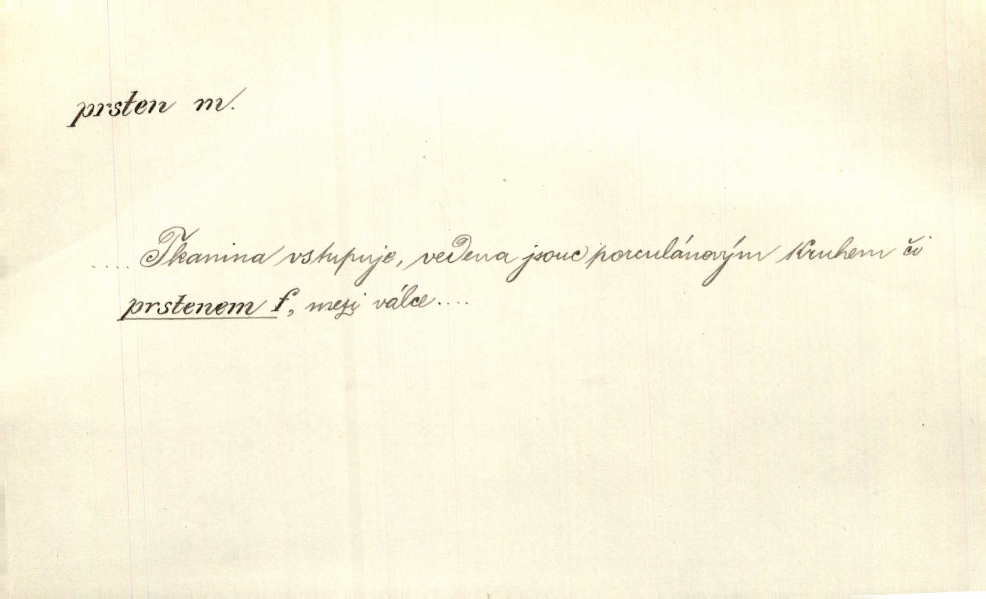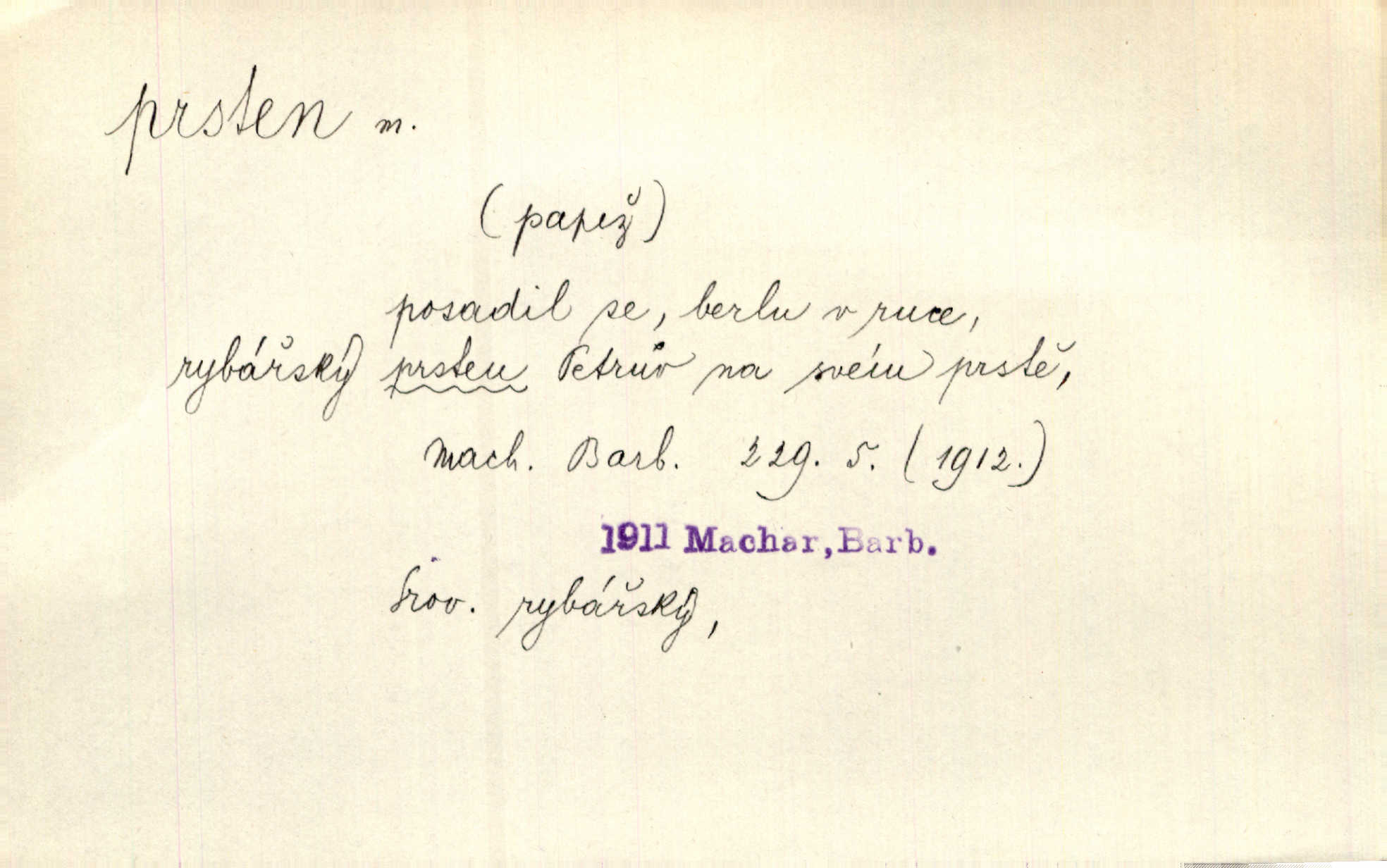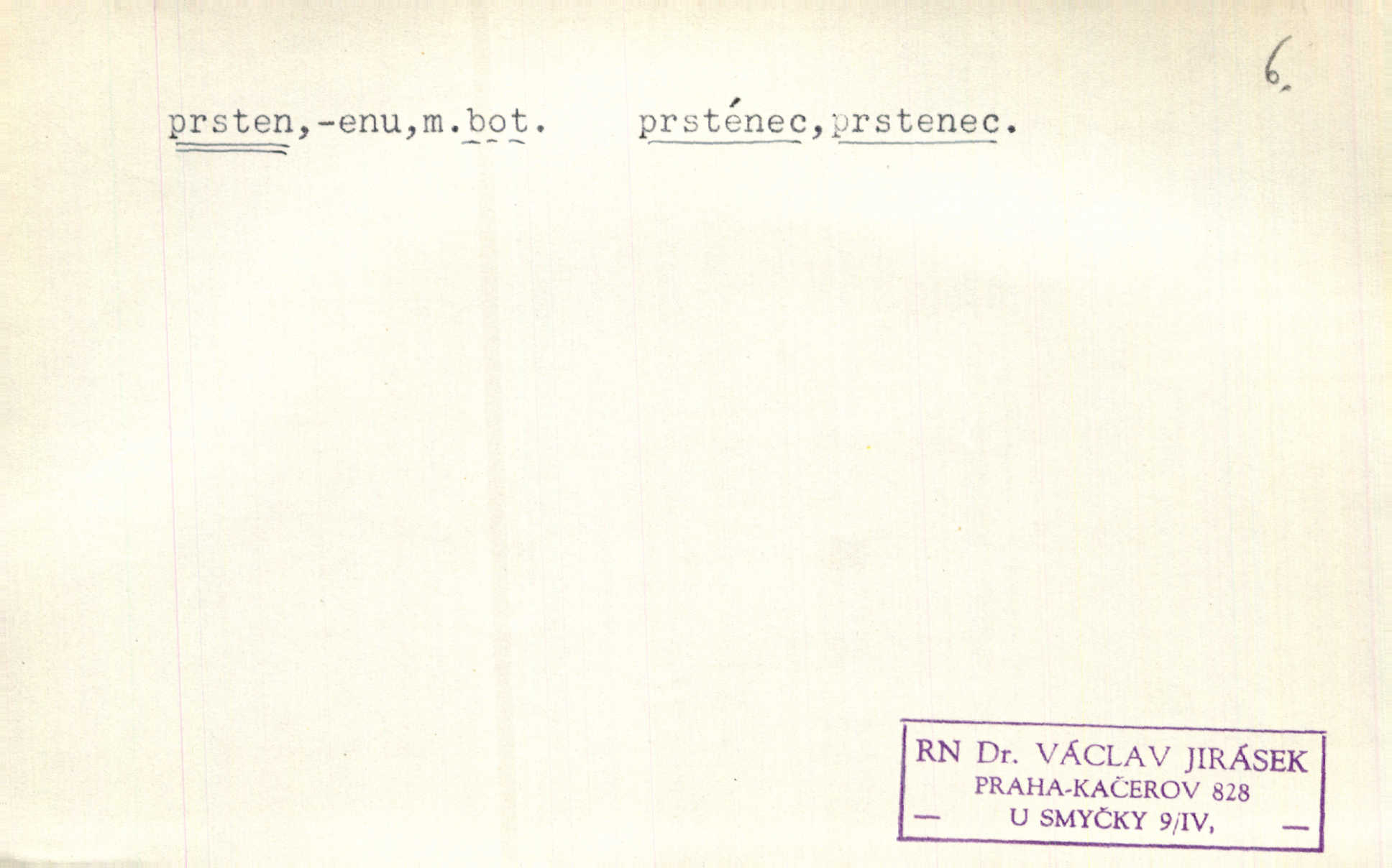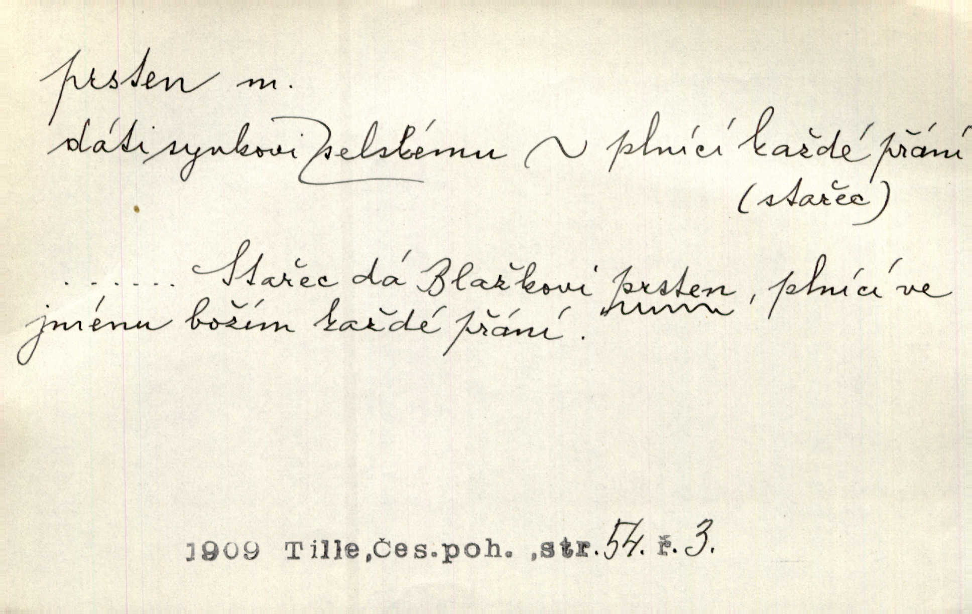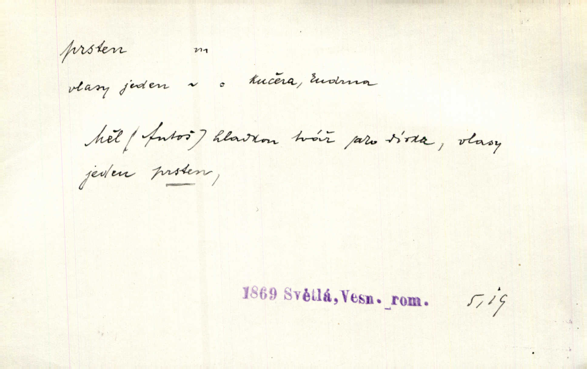 - prsten, -u m. kroužek, obyč. z drahého kovu, navlékaný na prst jako ozdoba, odznak důstojenství, manželství a pod. Na prstech měl [Kvoch] několik prstenů. Hál. Nejbohatší krámy v Římě jsou krámy zlatnické, v nichž plno brillantových prstenů kněžských. Ner. Já měl jen srdce a trochu těch písní, on [sok] dům ve Frydku a prsteny zlaté. Bezr. Stařec dá Blažkovi prsten, plnící ve jménu božím každé přání. Tille. Pak to psaní složil, zapečetil a přitlačil svůj prsten. Erb. Ochotně jej vyslechneš a směníš s ním snubný prsten. Šmil. Círk. prsten rybářský odznak biskupské hodnosti papeže, na jehož pečeti je vyryto lovení ryb sv. Petrem. Sport. hra na zlatý prsten druh dětských her. D kroužek navlékaný na prst a uzpůsobený jako zbraň. Drotar měl proraženu hlavu železným prstenem, jejž Bavoři rádi nosí a jichž při pranicích používají. Něm. D kruh. Jen v těch místech kraj není obklíčen prstenem lesů. Hol. Prsten lidí se rozstoupil. Hol. Strašný ryk revoluce prorazil prsten činžáků města. Vach. D něco stočeného do kroužku, zvl. pramen vlasů, prstenec. Měl [Antoš] hladkou tvář, vlasy jeden prsten. Svět. Drobná dceruška, po hlavě samý zlatý prsten, opustila své místo u mých nohou. Ner. Vlasy [cikánů] jeden černý prsten. Vrch. Nebylo tam [v hradě] sloupce, okolo něhož by se nebyl vinul [břečťan] v temných prstenech. Svět. Astron. prsten Saturnův prstencovité seskupení hmotných částic kolem planety Saturna. D předmět tvarem podobný prstenu. Geom. kulový prsten těleso vytvořené rotací kruhové úseče kolem průměru ji neprotínajícího. Tech. strojová součást v tvaru prstenu n. kruhu; prsten kalibrovací, nárazníkový. Zeměd. železný kruh na kosišti, za který se upevňuje patka kosy. Archit. vypuklý architektonický článek kruhového tvaru. Sklář. šamotový kruh plující na roztavené sklovině, z něhož se sklovina nabírá. Hud. část mechanismu na dřevěných dechových nástrojích; kovový, kostěný nebo celuloidový náprstek s hrotem, jímž se drnká na citeru. Bot. prstenec.