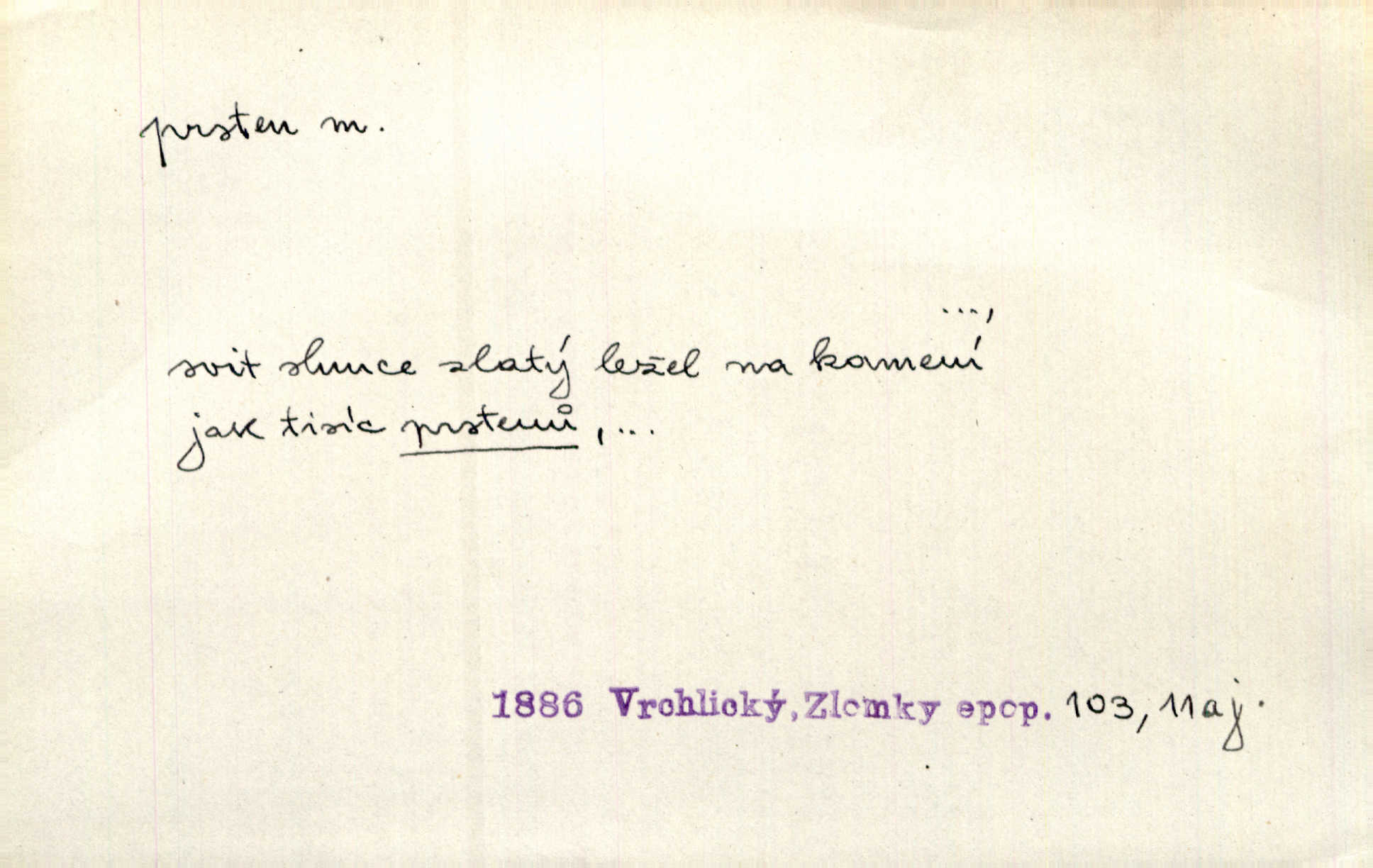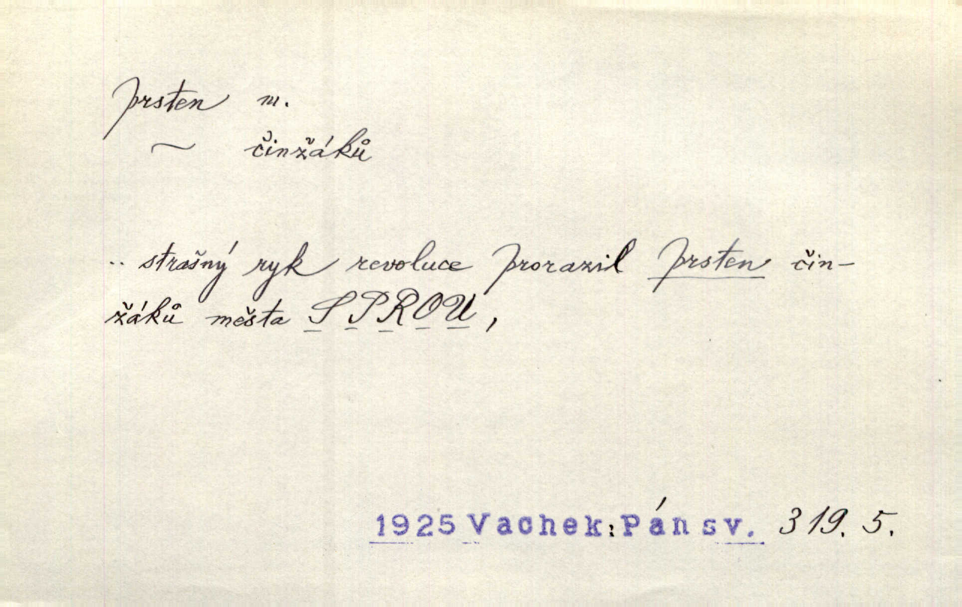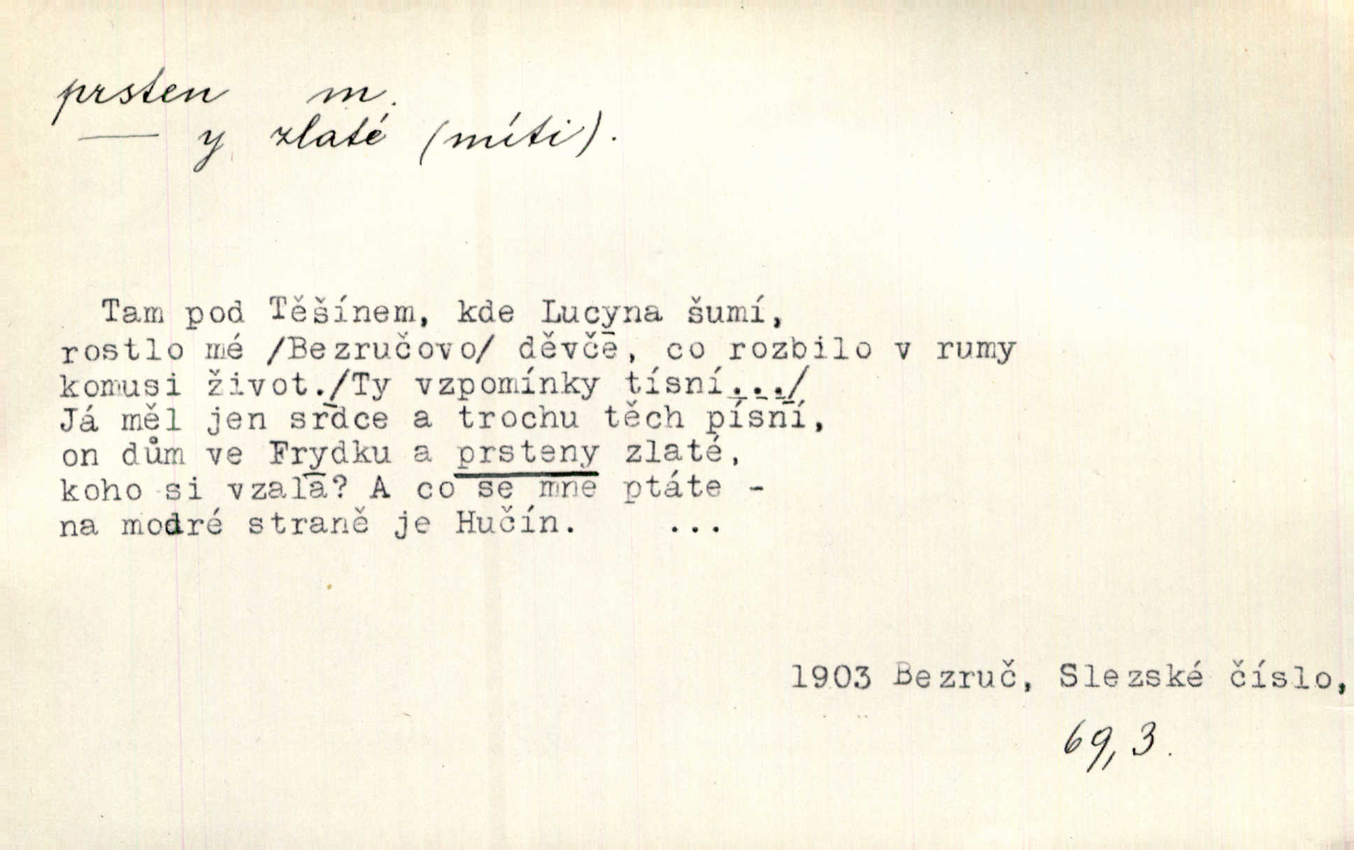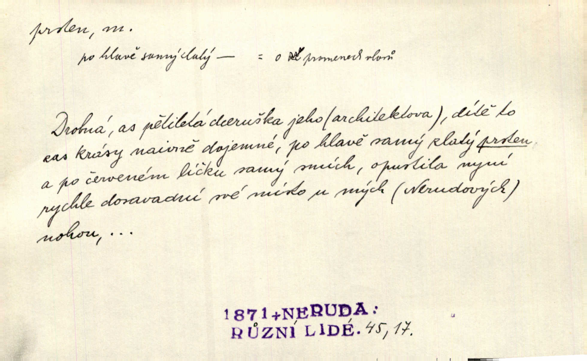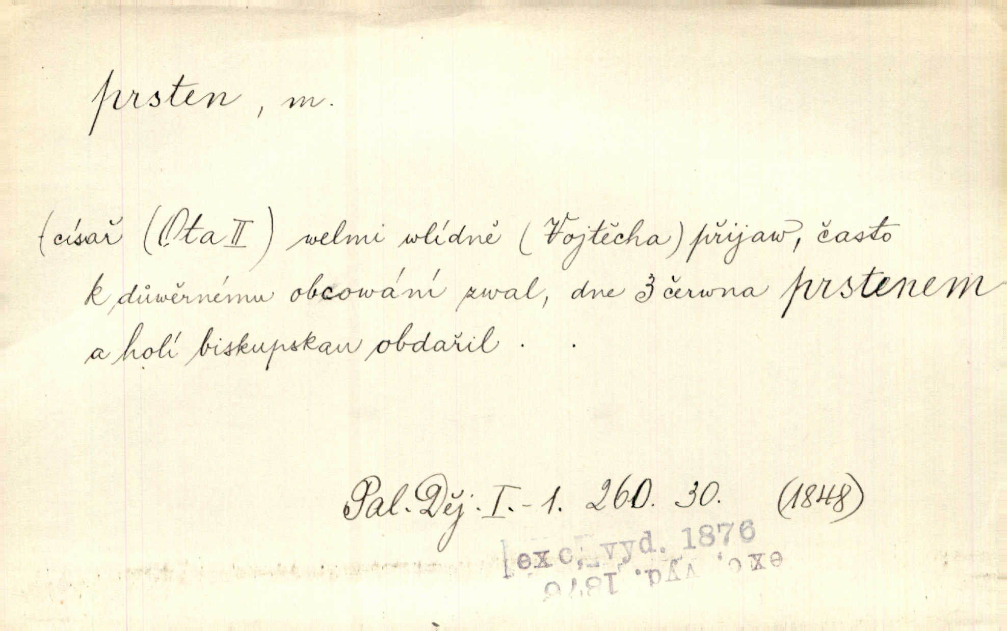 - prsten, -u m. kroužek, obyč. z drahého kovu, navlékaný na prst jako ozdoba, odznak důstojenství, manželství a pod. Na prstech měl [Kvoch] několik prstenů. Hál. Nejbohatší krámy v Římě jsou krámy zlatnické, v nichž plno brillantových prstenů kněžských. Ner. Já měl jen srdce a trochu těch písní, on [sok] dům ve Frydku a prsteny zlaté. Bezr. Stařec dá Blažkovi prsten, plnící ve jménu božím každé přání. Tille. Pak to psaní složil, zapečetil a přitlačil svůj prsten. Erb. Ochotně jej vyslechneš a směníš s ním snubný prsten. Šmil. Círk. prsten rybářský odznak biskupské hodnosti papeže, na jehož pečeti je vyryto lovení ryb sv. Petrem. Sport. hra na zlatý prsten druh dětských her. D kroužek navlékaný na prst a uzpůsobený jako zbraň. Drotar měl proraženu hlavu železným prstenem, jejž Bavoři rádi nosí a jichž při pranicích používají. Něm. D kruh. Jen v těch místech kraj není obklíčen prstenem lesů. Hol. Prsten lidí se rozstoupil. Hol. Strašný ryk revoluce prorazil prsten činžáků města. Vach. D něco stočeného do kroužku, zvl. pramen vlasů, prstenec. Měl [Antoš] hladkou tvář, vlasy jeden prsten. Svět. Drobná dceruška, po hlavě samý zlatý prsten, opustila své místo u mých nohou. Ner. Vlasy [cikánů] jeden černý prsten. Vrch. Nebylo tam [v hradě] sloupce, okolo něhož by se nebyl vinul [břečťan] v temných prstenech. Svět. Astron. prsten Saturnův prstencovité seskupení hmotných částic kolem planety Saturna. D předmět tvarem podobný prstenu. Geom. kulový prsten těleso vytvořené rotací kruhové úseče kolem průměru ji neprotínajícího. Tech. strojová součást v tvaru prstenu n. kruhu; prsten kalibrovací, nárazníkový. Zeměd. železný kruh na kosišti, za který se upevňuje patka kosy. Archit. vypuklý architektonický článek kruhového tvaru. Sklář. šamotový kruh plující na roztavené sklovině, z něhož se sklovina nabírá. Hud. část mechanismu na dřevěných dechových nástrojích; kovový, kostěný nebo celuloidový náprstek s hrotem, jímž se drnká na citeru. Bot. prstenec.