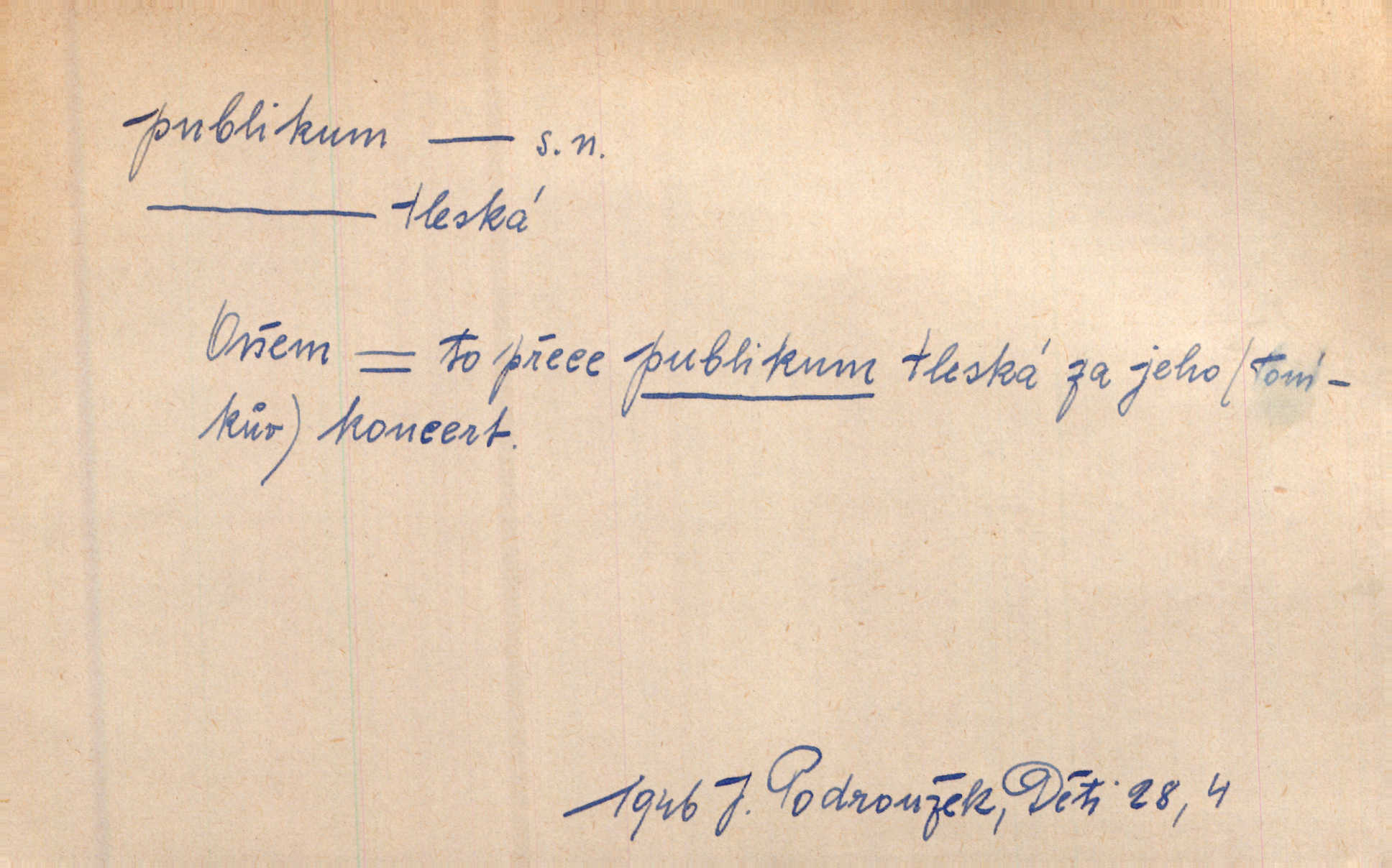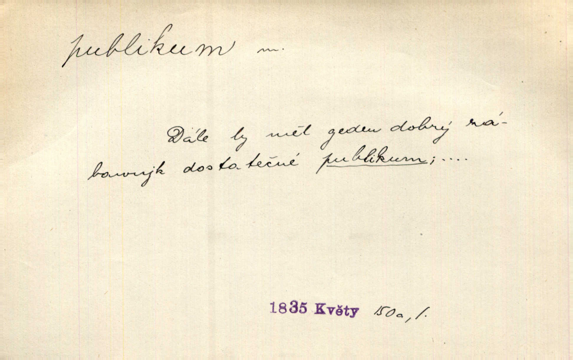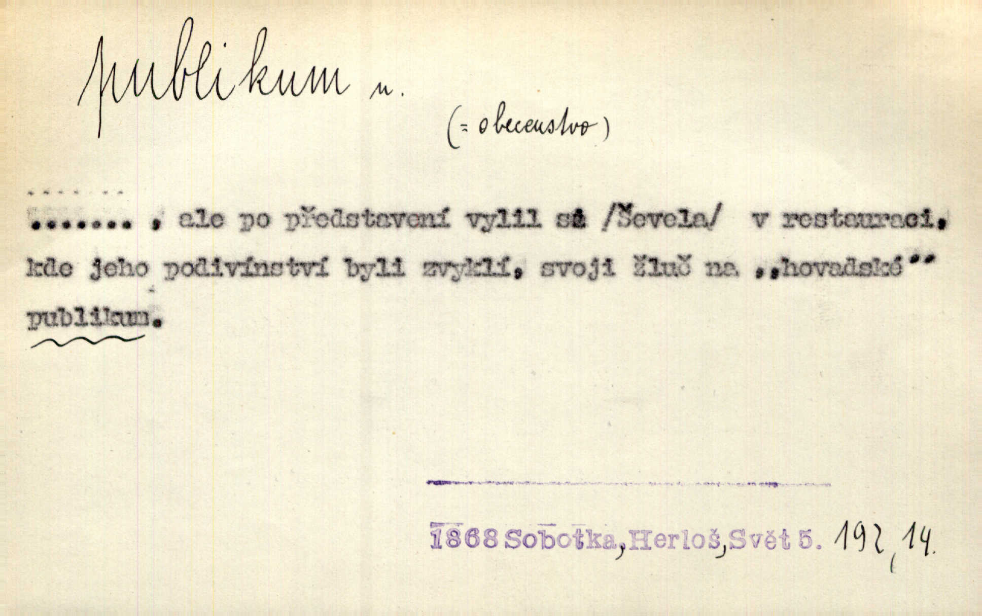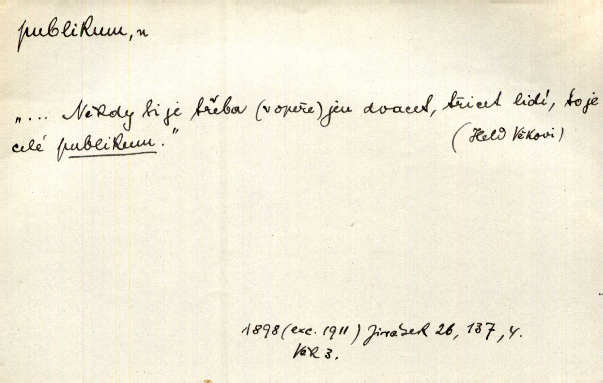 - publikum, -ka n. 1. veřejnost, přítomné obecenstvo. Nic se tak rychle nemění jako vkus publika divadelního. Vrch. Publikum rozčilovalo se jeho [řečníkovými] novými frázemi. Mah. Při těch slovech se stále potutelně usmíval [farář] a pozoroval publikum [návštěvníky hostince, kteří ho poslouchali]. Rais. Čížek byl si vymínil, aby se pohřeb jeho odbyl v největší tichosti, dobou a cestou pro zvědavé publikum nejméně příhodnou. Čech.