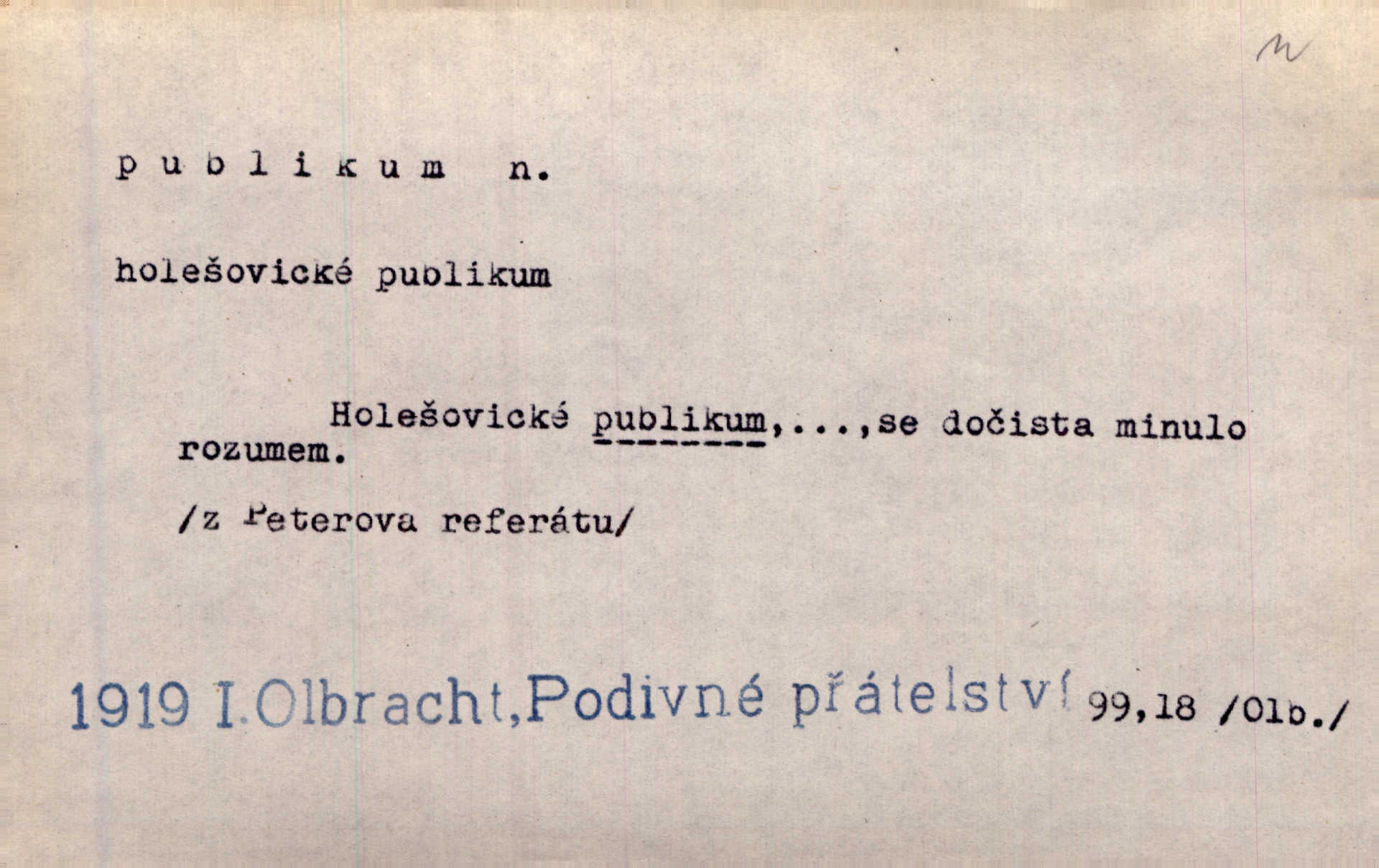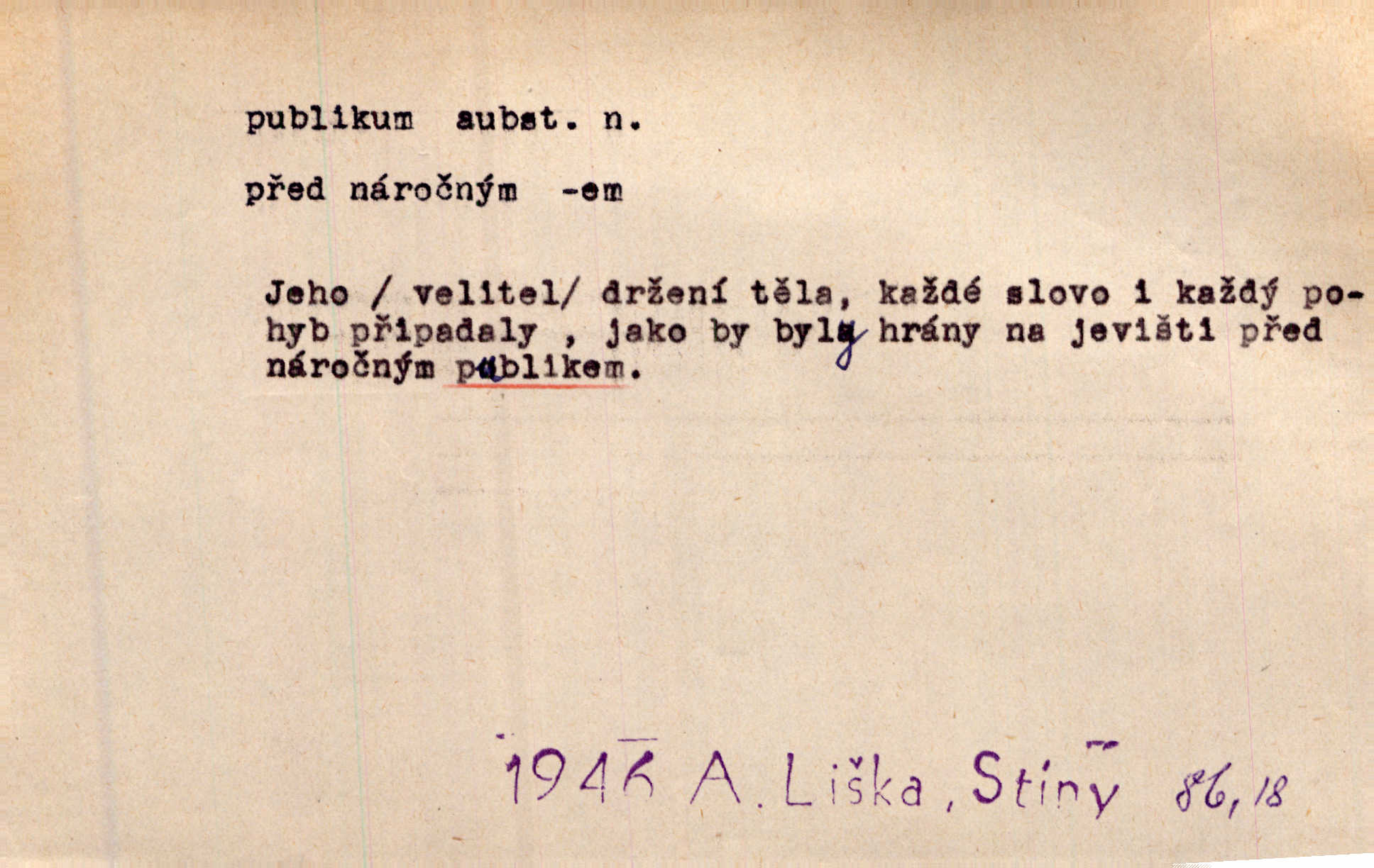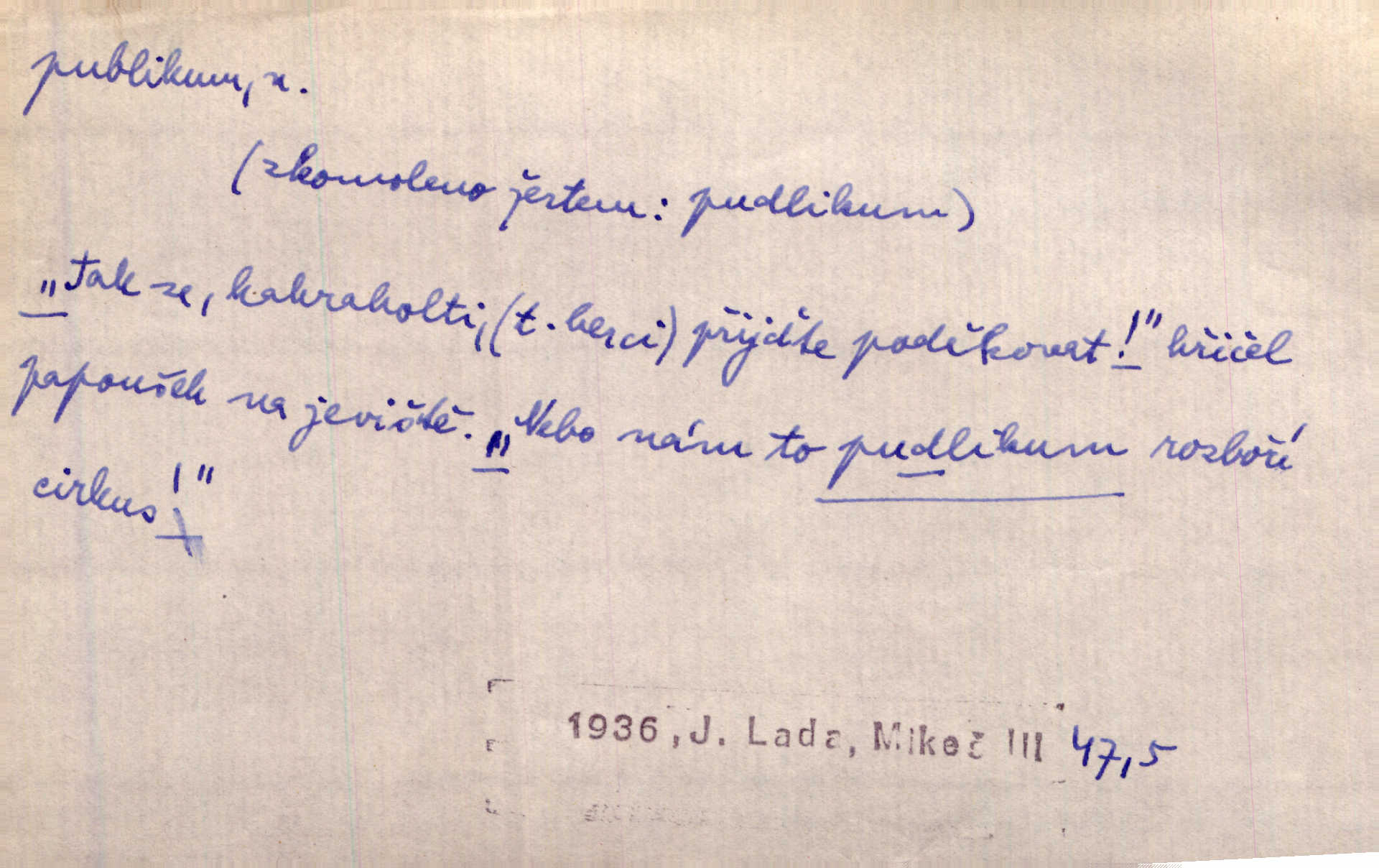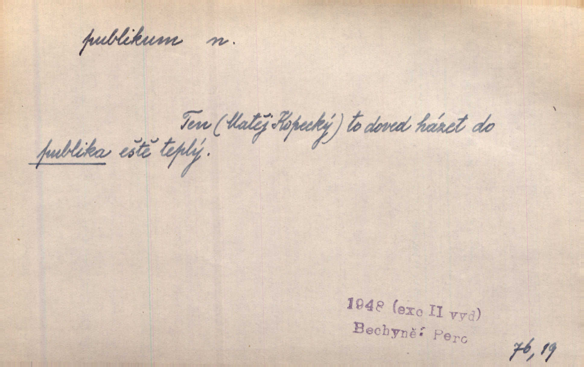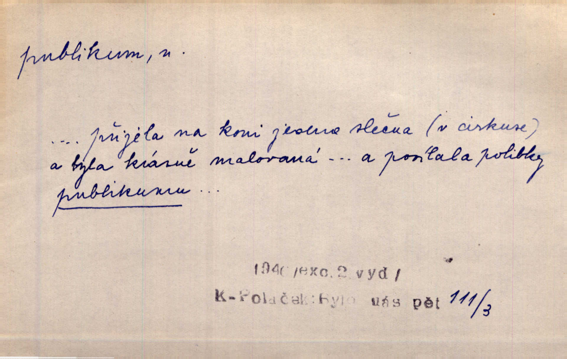 - publikum, -ka n. 1. veřejnost, přítomné obecenstvo. Nic se tak rychle nemění jako vkus publika divadelního. Vrch. Publikum rozčilovalo se jeho [řečníkovými] novými frázemi. Mah. Při těch slovech se stále potutelně usmíval [farář] a pozoroval publikum [návštěvníky hostince, kteří ho poslouchali]. Rais. Čížek byl si vymínil, aby se pohřeb jeho odbyl v největší tichosti, dobou a cestou pro zvědavé publikum nejméně příhodnou. Čech.
