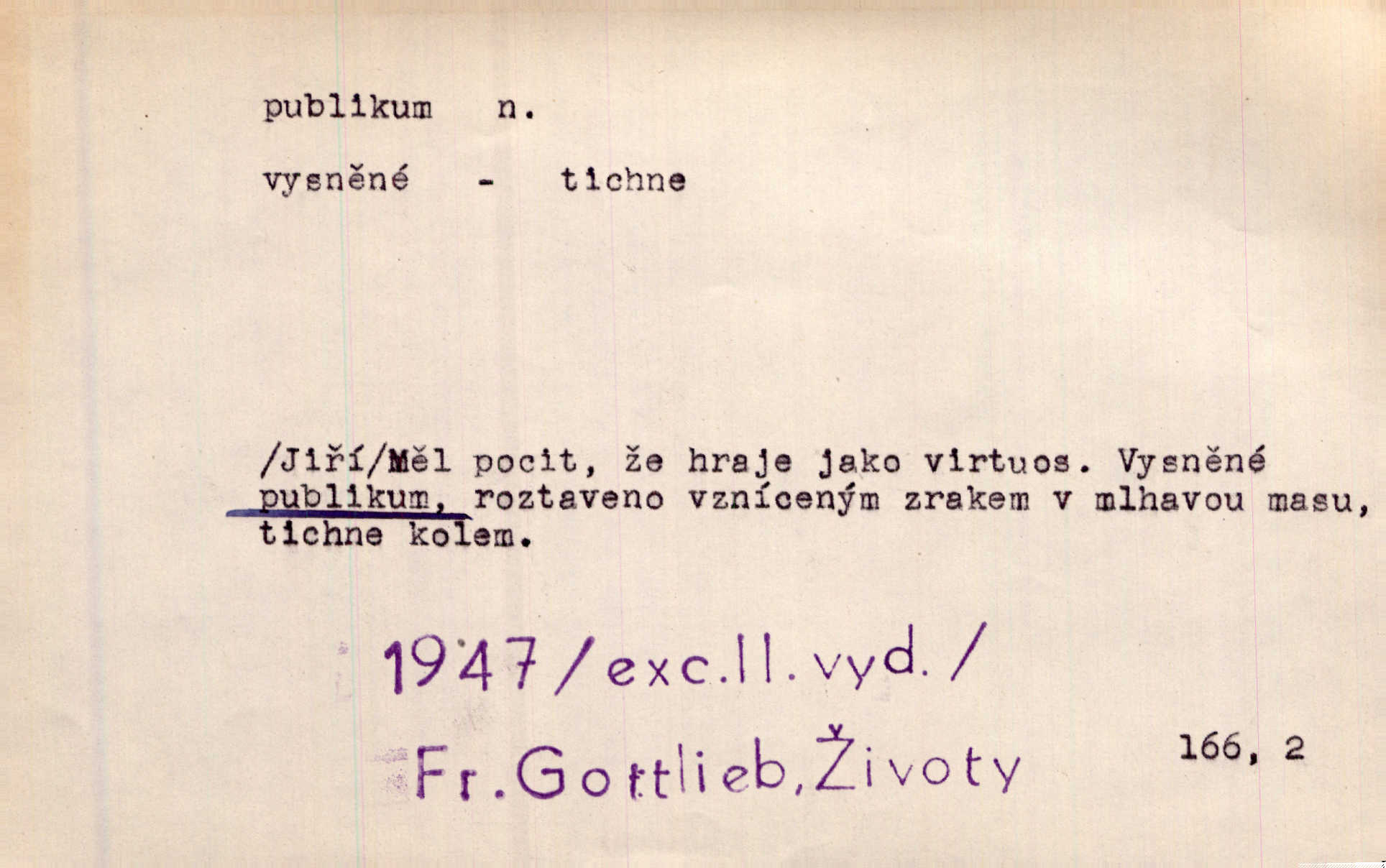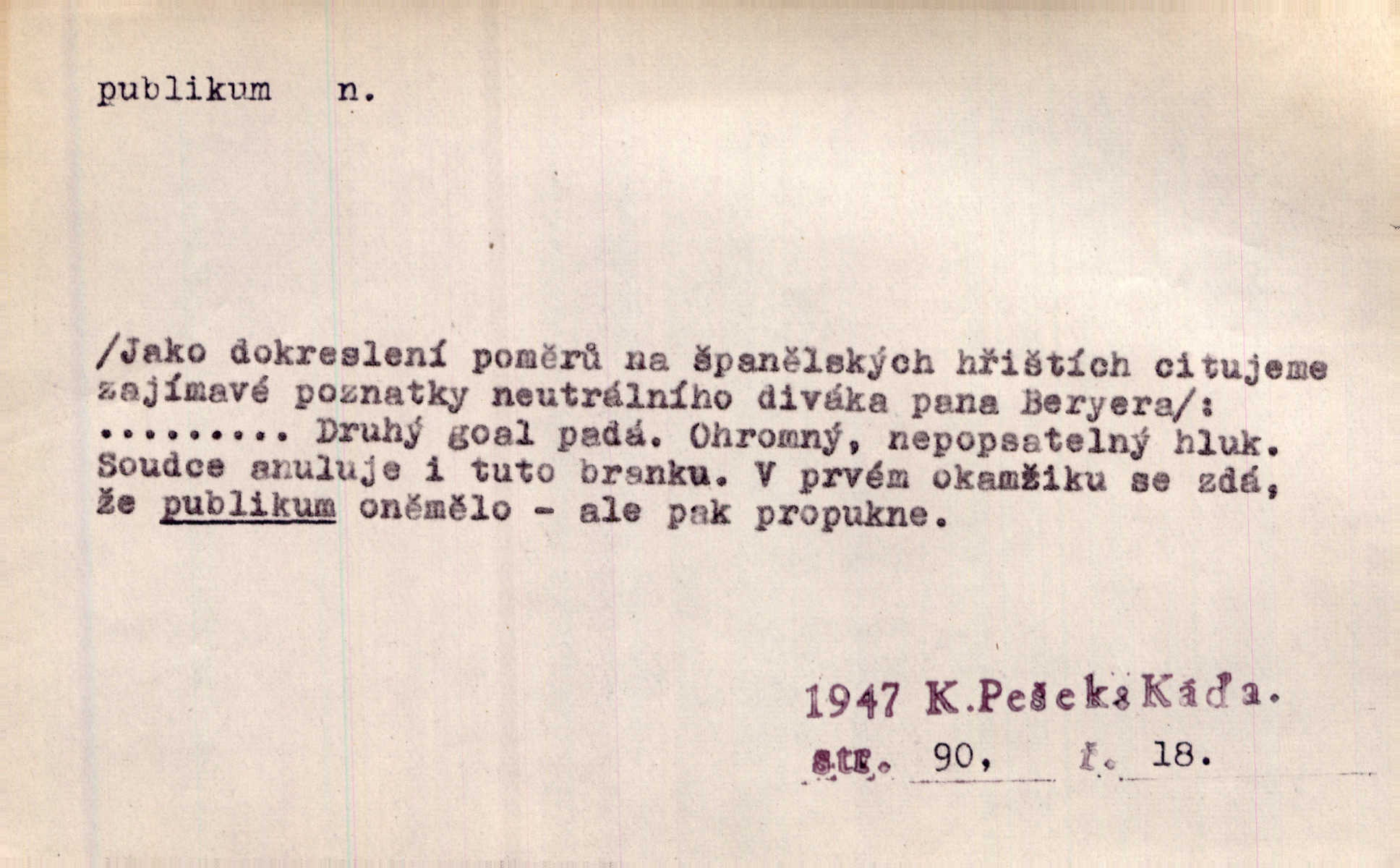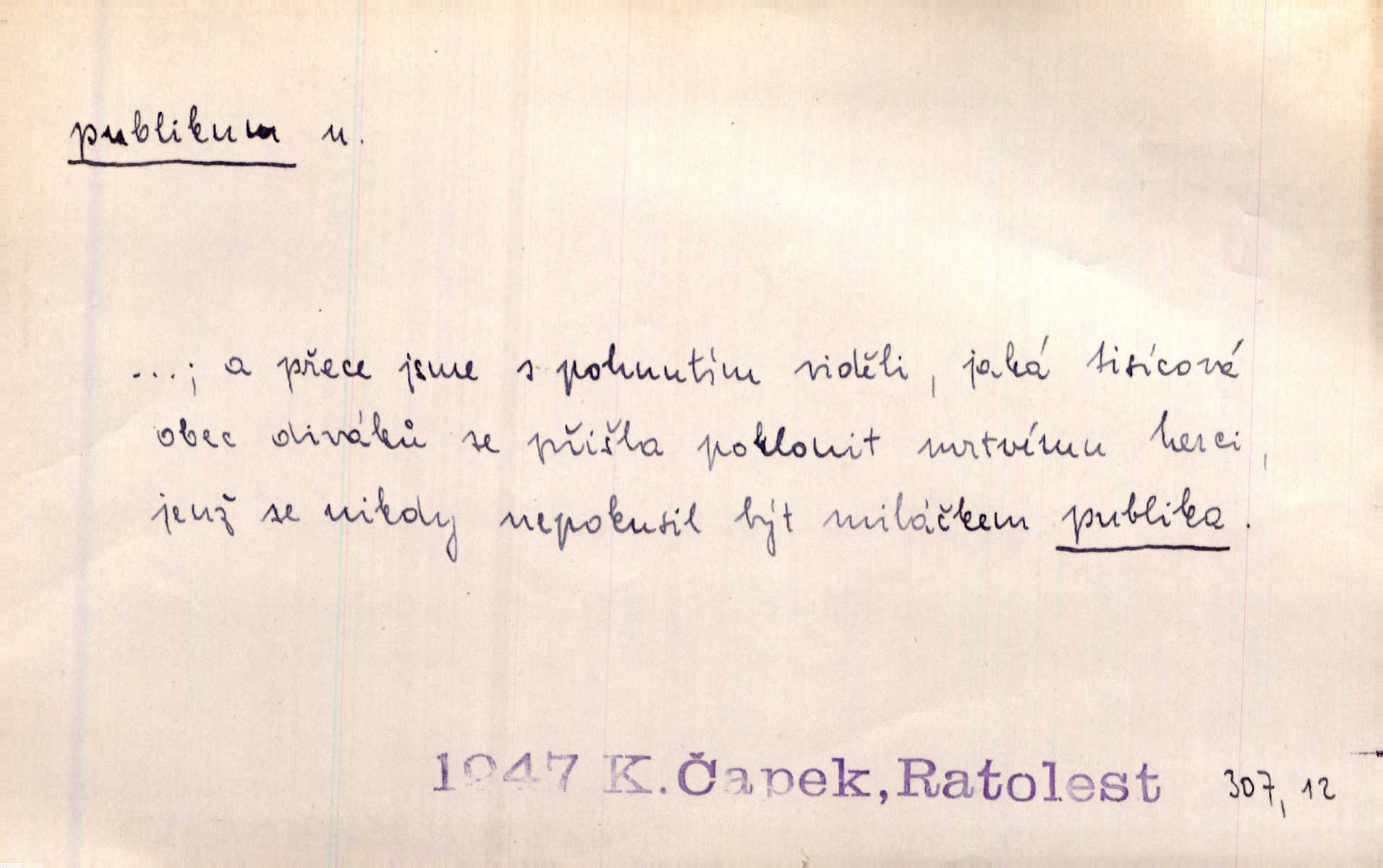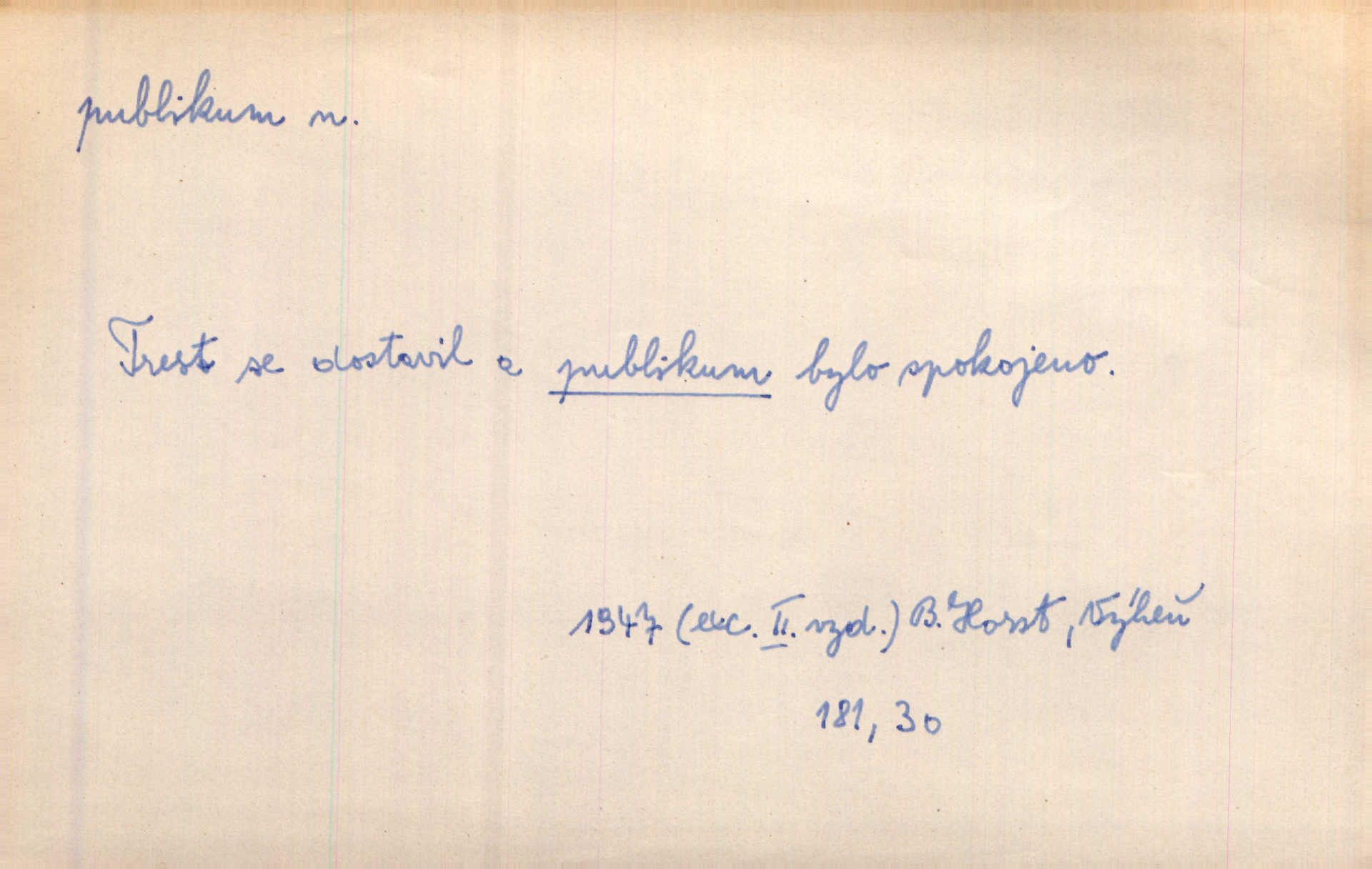 - publikum, -ka n. 1. veřejnost, přítomné obecenstvo. Nic se tak rychle nemění jako vkus publika divadelního. Vrch. Publikum rozčilovalo se jeho [řečníkovými] novými frázemi. Mah. Při těch slovech se stále potutelně usmíval [farář] a pozoroval publikum [návštěvníky hostince, kteří ho poslouchali]. Rais. Čížek byl si vymínil, aby se pohřeb jeho odbyl v největší tichosti, dobou a cestou pro zvědavé publikum nejméně příhodnou. Čech.
