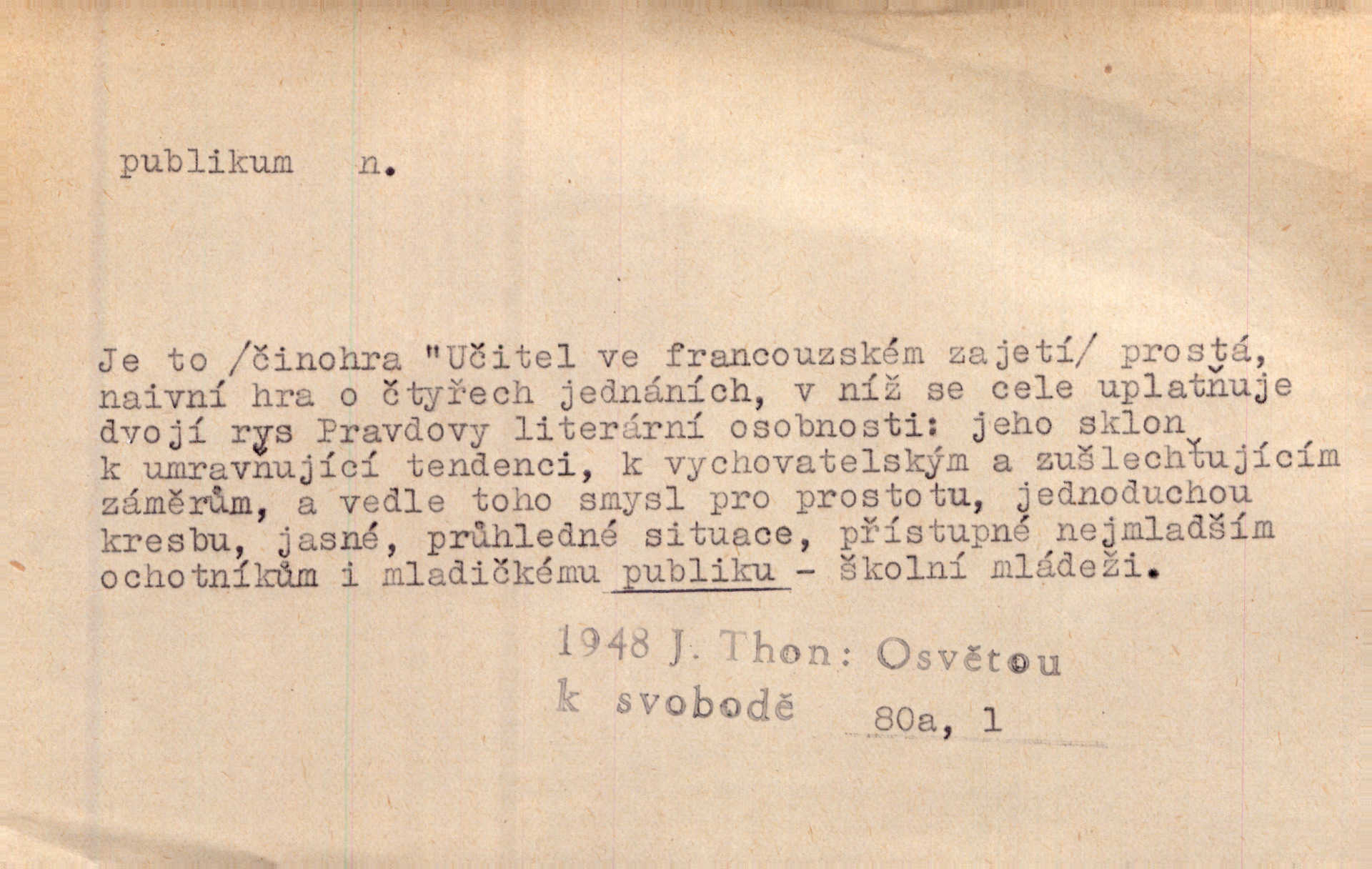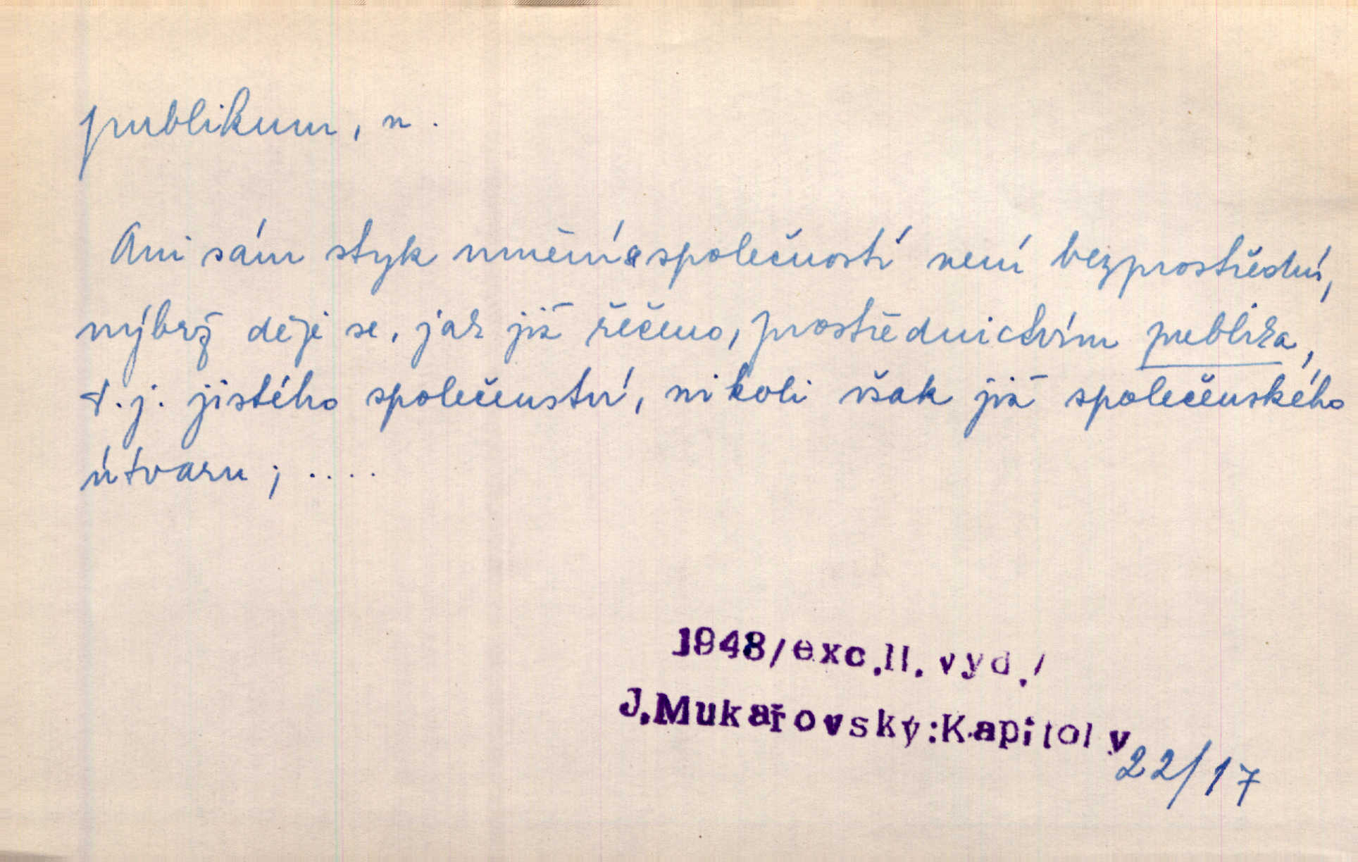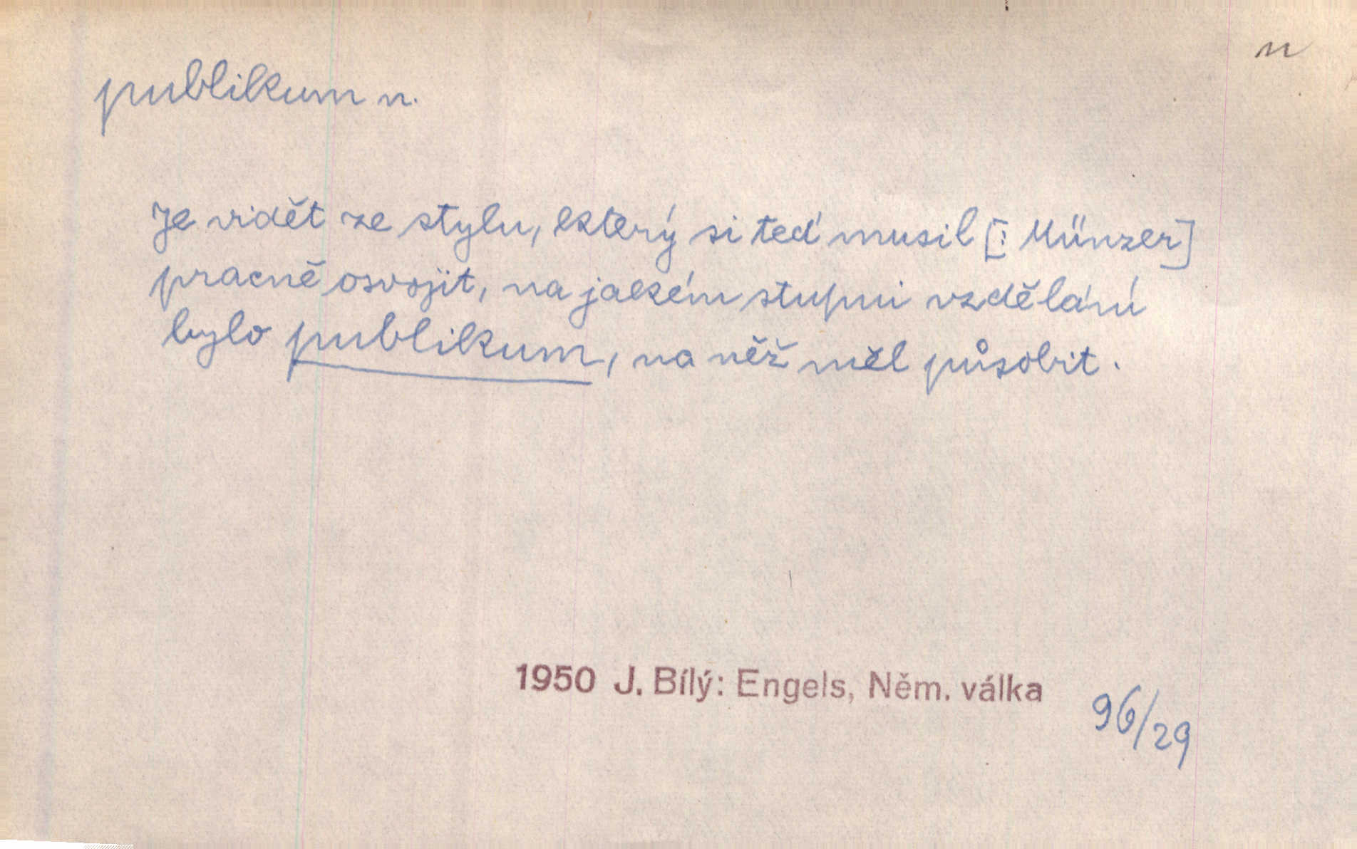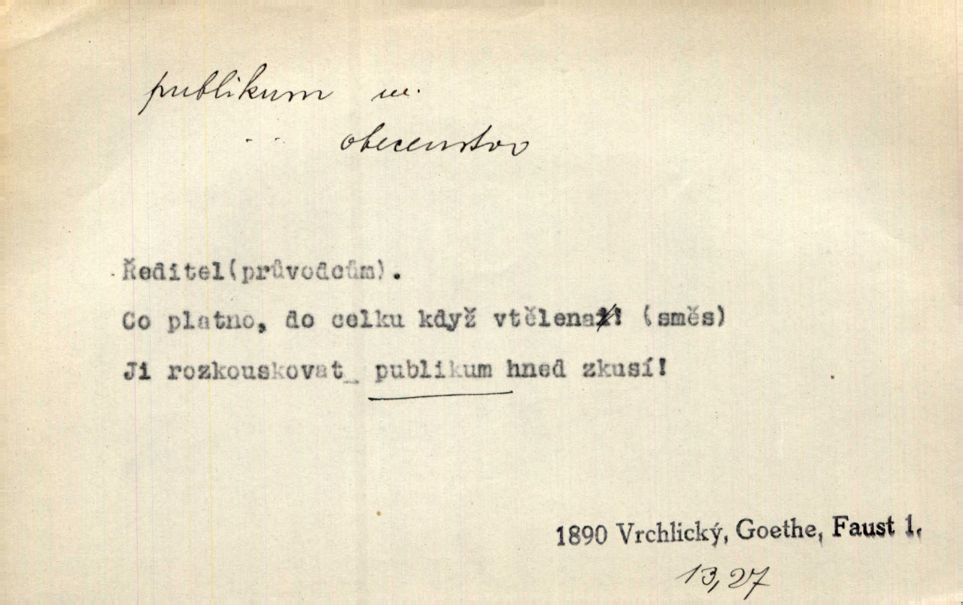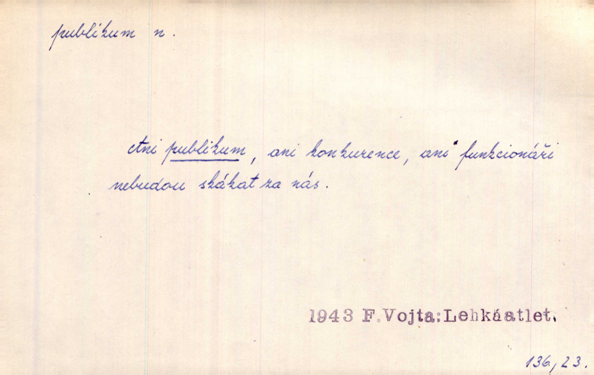 - publikum, -ka n. 1. veřejnost, přítomné obecenstvo. Nic se tak rychle nemění jako vkus publika divadelního. Vrch. Publikum rozčilovalo se jeho [řečníkovými] novými frázemi. Mah. Při těch slovech se stále potutelně usmíval [farář] a pozoroval publikum [návštěvníky hostince, kteří ho poslouchali]. Rais. Čížek byl si vymínil, aby se pohřeb jeho odbyl v největší tichosti, dobou a cestou pro zvědavé publikum nejméně příhodnou. Čech.