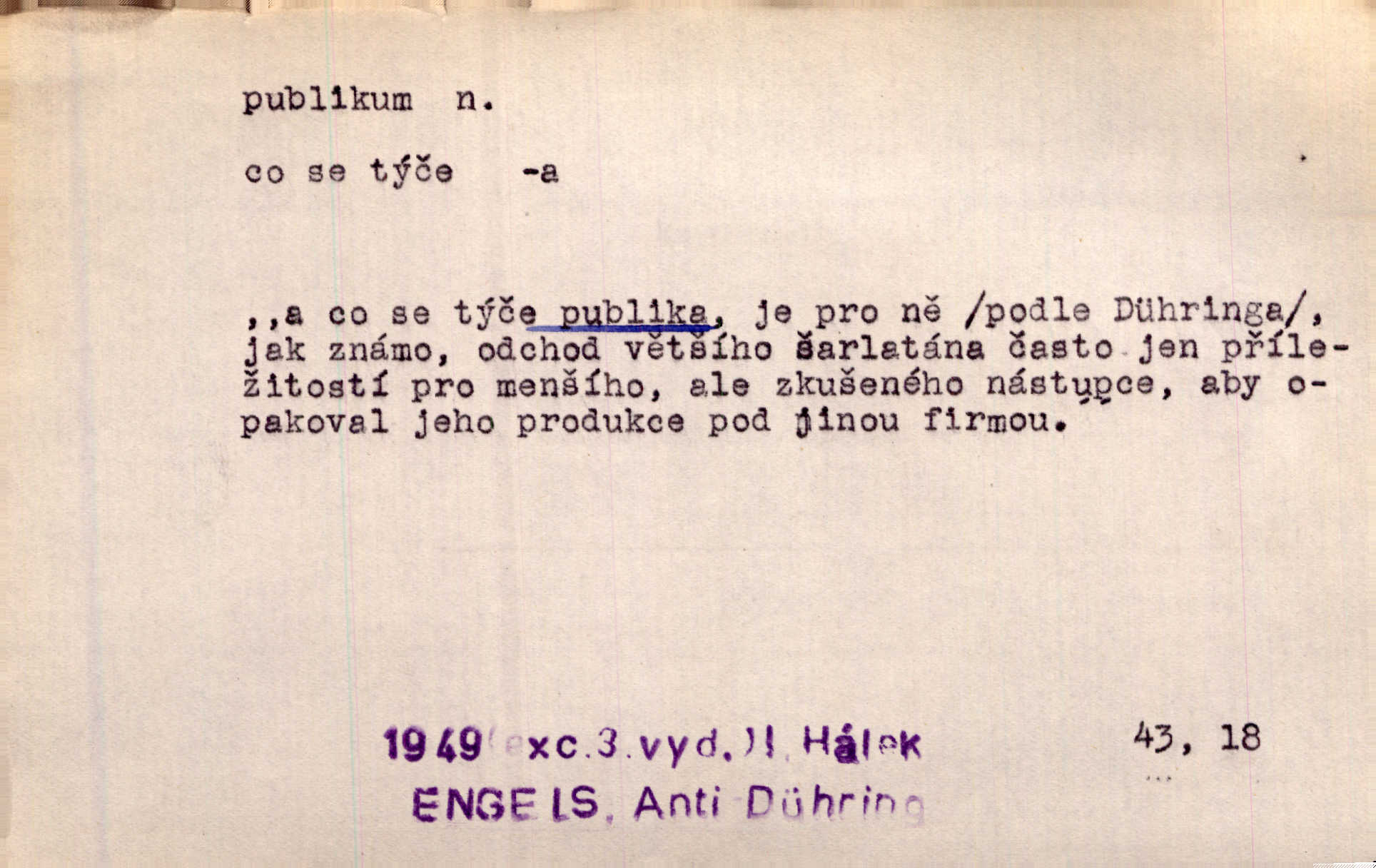 - publikum (ps. i publicum), -ka n. 2. veřejná bezplatná přednáška universitní. Přednášky jsou buď bezplatné (publika), buď za kolejné. Čes. pol.