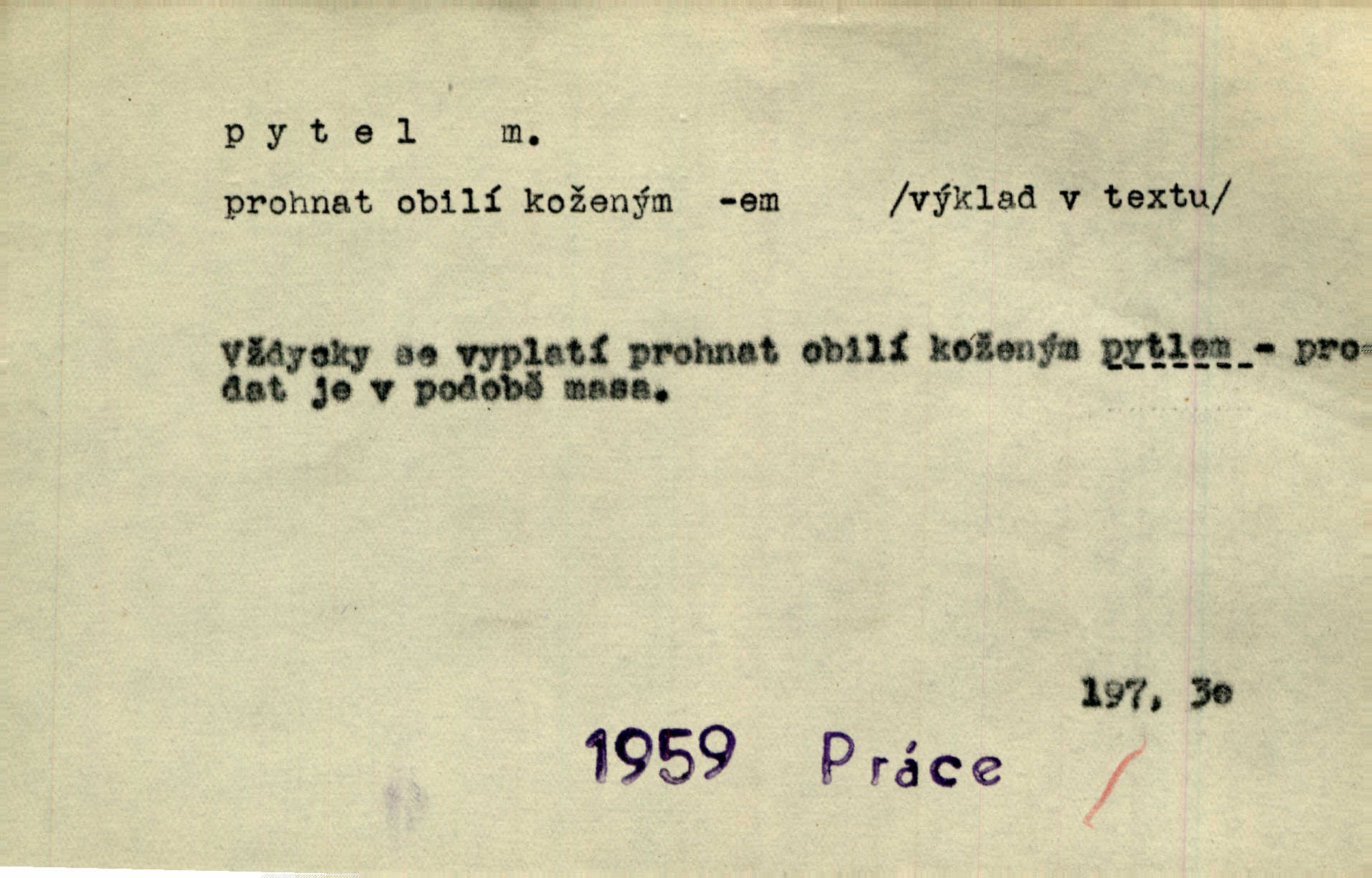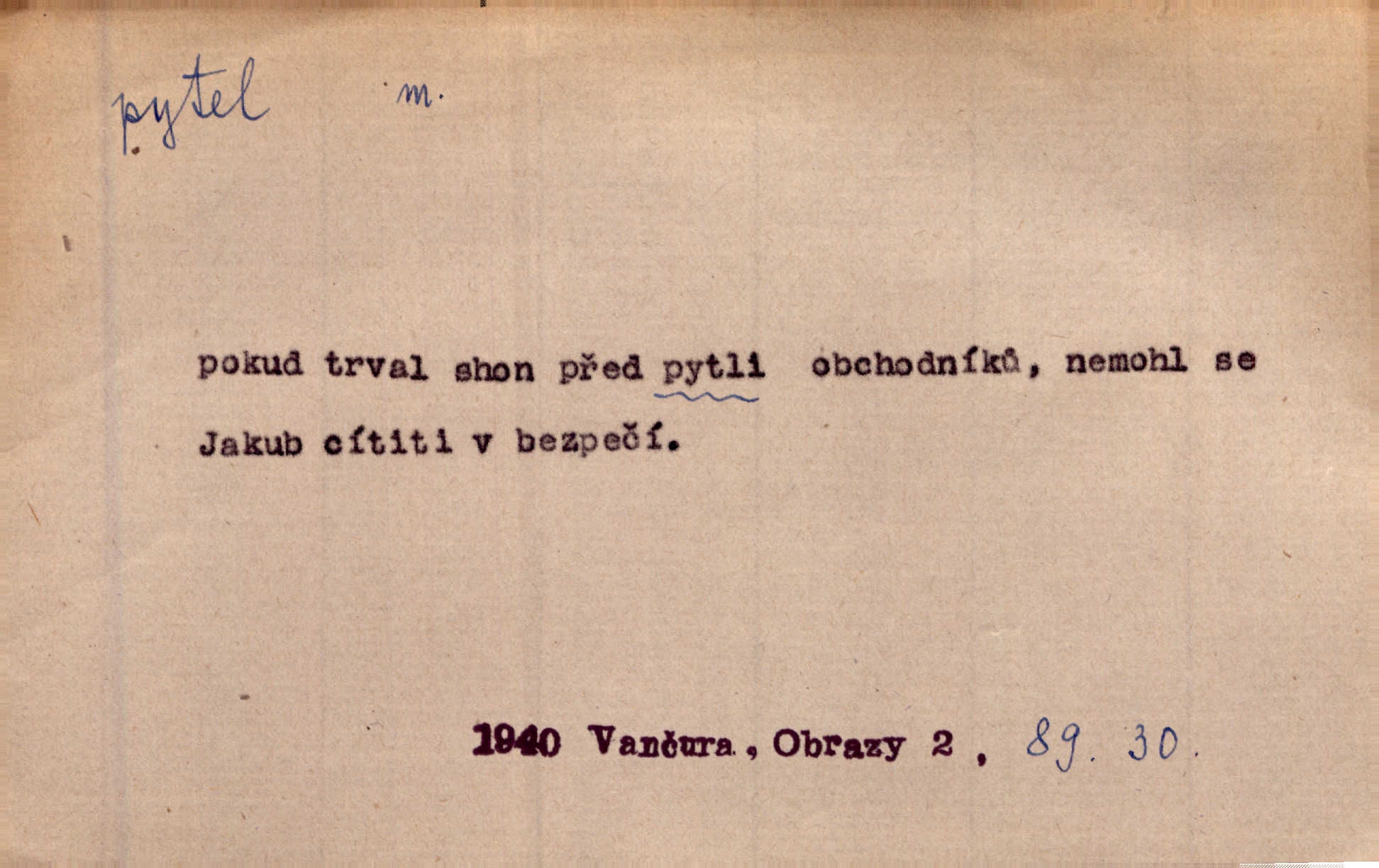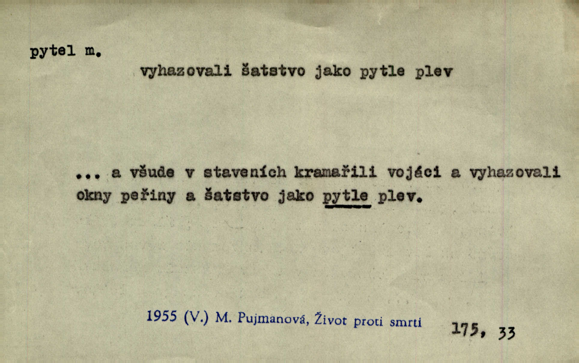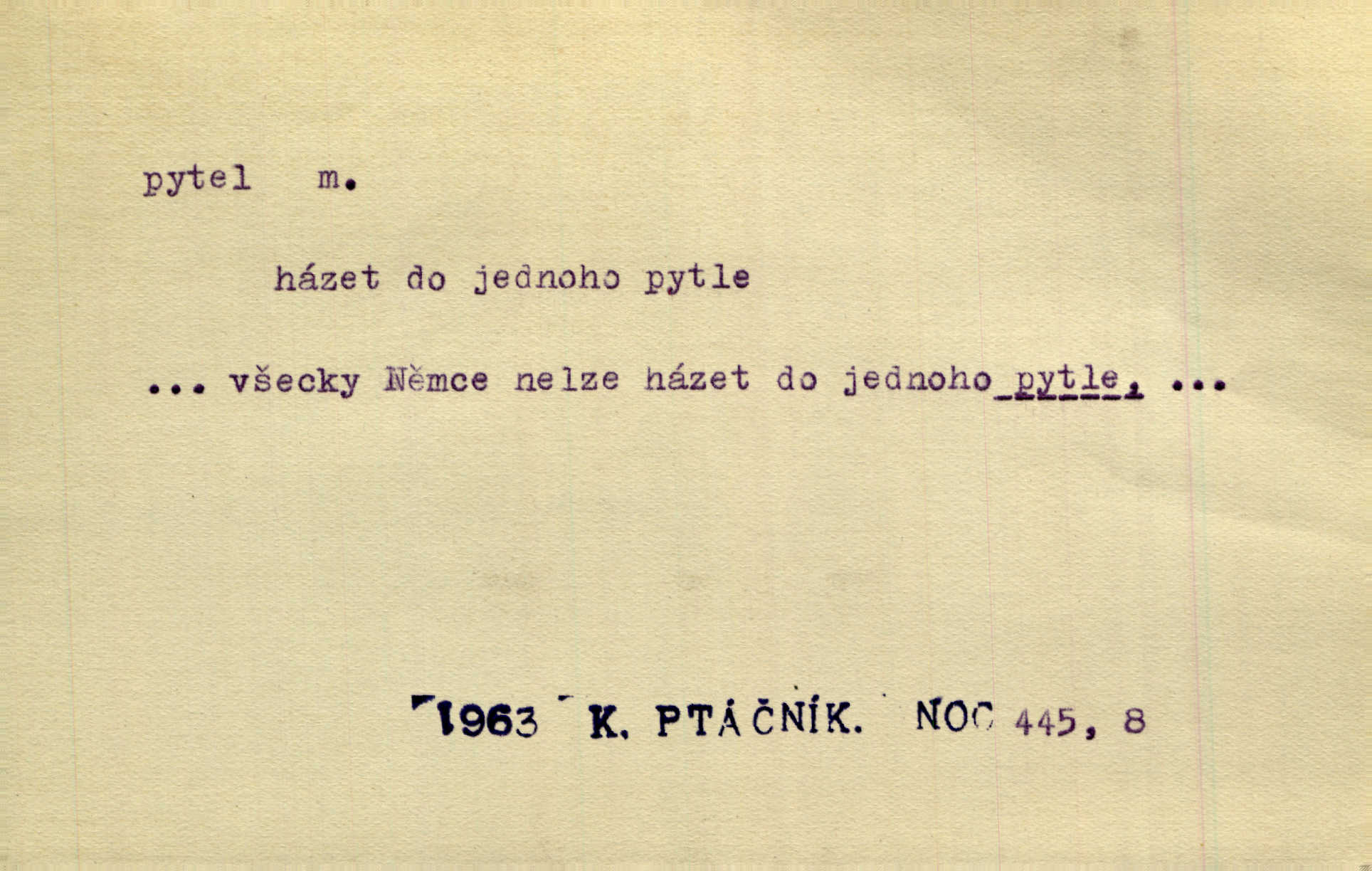 - pytel, -tle m. podlouhlý obal z nějaké tkaniny, zprav. speciální, hrubé, zvané pytlovina, nebo z kůže, papíru a p., na přenášení n. uchovávání rozličných věcí. [Podruh] veze na trakaři pytel obilí. Jir. Vrátiv se [mleč] s pytli mouky i otrub, zajel do cihelničky. Rais. Pytlů rozestaveno hojně se zbožím. Ner. Utíkal muž s pytlem na zádech. Šmil. Tma bylo jako v pytli. Klost. Mlha jako pytel hnala se při zemi. J. Šír. Točí se jako sochor v pytli nemotorně. Hol. Budu se [při tanci] motat jako sysel v pytli? M. Jahn. Slova mu plynou z úst, jako by je z pytle sypal. Prav. Já už mám hlavu jako děravý pytel mám špatnou paměť. Kop. Není na hlavu padlý, „pytlem praštěný“, jak se říká. Her. K stáru vzíti pytel a jíti žebrat. Hál. Koš na ryby, pytel na raky (výraz podivu). Čel. Víc na pytli než v pytli (o pěkném zevnějšku, kryjícím chatrný vnitřek). Přísl. Šídlo se v pytli neutají. Přísl. Nekupuj zajíce v pytli věc, kterou jsi důkladně neviděl. Přísl. Už bys mohl přestat házeti pana Jahodu do jednoho pytle s oněmi skláři. Klost. Říkával, že „svázat je [ženy] všechny do jednoho pytle,“ že nejhorší vždycky na vrchu ostane. Čech. Každé nepřátelství města a venkova je nesprávné. Jsme z jednoho pytle a patříme dohromady. Brázda. Je [děvče] z chudého pytle z chudé rodiny. Herrm. Jak se [Hantych] pohne, je na něm vidět, že je ze selského pytle. Šim. „První jsme přišli, první musíme odejíti.“ „A to ne! První do pytle a poslední z pytle.“ Baar. [Zábavy,] s nimiž se v nastalém podzimu roztrhl pytel. Herrm. Slepá ulička, člověk skrze ni za cílem svým pospíchá, a najednou je v pytli — nemůže dál. Paleč. Tuna byl v pytli, neboť nevěděl, co to [slovo] je. Prav. Rozhodne se, který kterého strčí do pytle překoná, přivede do úzkých. Šmil. Začíná ho bavit, jaký pytel na něj tihle dva ušili a jak si myslí, že ho do něho nedostanou. Ros. Ta věc [útěk dceřin] nezůstane v pytli neutají se. Kosm. Děvčata [při tanci] dávala pánům košem či po česku řečeno „pytlem“ odbývala je. Win. Z dnešní řeči už soused vyrozuměl, že kdyby [na námluvy] přišel, že by syn jeho pytlem nedostal nebyl odmítnut. Jir. Nepořádné vydávaní časopisu na jisto jej sprovodí do pytle Abrahamova na onen svět. Kos. Pošt. poštovní pytel na listovní zásilky a pytlovky. Let. větrný pytel pytel z lehké látky, který se větrem nadme a ukazuje letcům směr a částečně i rychlost větru na letišti. D Expr. šat pytlovité podoby. Na tu [košili v Sibiři] se bere kamlejka, dlouhý pytel s rukávy, který nahoře má kulatou díru, skrze niž se hlava prostrkuje. ČČM. Při každém pohřbu je některé z těch padesáti římských bratrstev v nějak barveném pytli svém, do něhož pro oči jsou vypíchnuty díry. Ner. Oděv. spací pytel. D Les. hluboko zabíhající kout porostní stěny, do něhož se vítr těsná, takže hrozí průlomem celé porostní hloubky. Mysl. úmyslný otvor (větší mezera mezi střelci) při kruhovém honu, záhyb střelecké čáry, vzniklý nestejně rychlým vykračováním. D Expr. velké množství něčeho. Kdyby člověk se tak s ní potkal, ten pytel nadávek a ta hanba, kterou by člověku udělala! Klost. Všeho se dočkáš, člověče, máš-li zdravý kořen a trpělivosti pytel. Herrm. Říká se, že jest hrstka jistoty lepší, než pytel naděje. Havl. Kouká jako pytel neštěstí. Šim. D Expr. obyč. pejor. o člověku. Je jí to divné, jak se s tím prázdným pytlem může [učený pán] pustit do řeči s hloupým člověkem. Don. Tak jsem selský chomout, hrubý selský pytel — no, hezké věci to řekla o mně tvá matka! Mor. [Směr,] kterým odešel ten pytel neštěstí Robinson. Zaor. Ten starý pán je neobyčejný pytel dobroty velký dobrák. Hol.