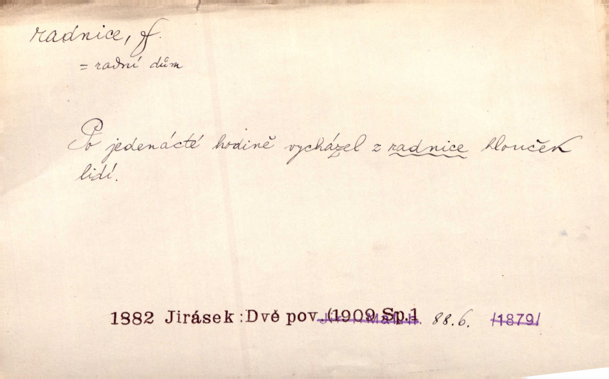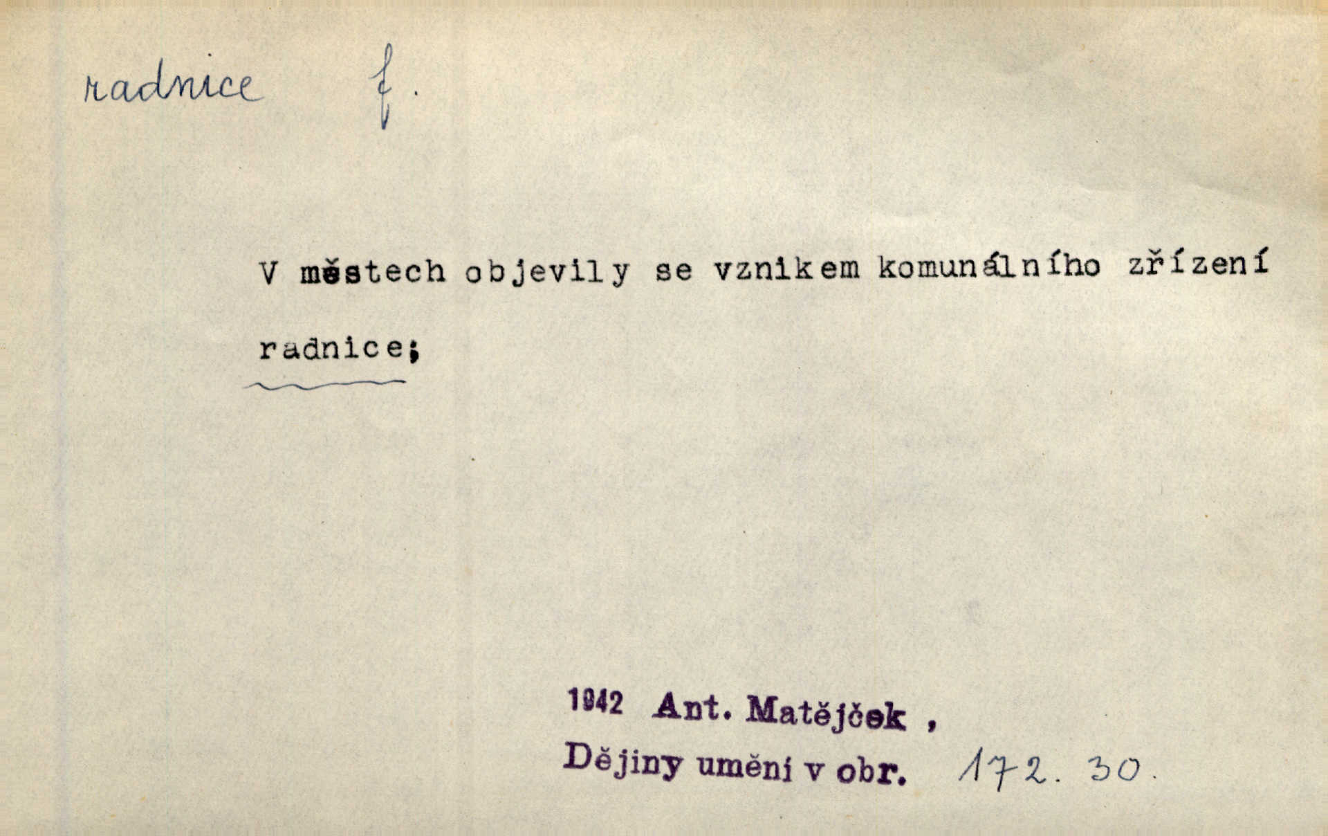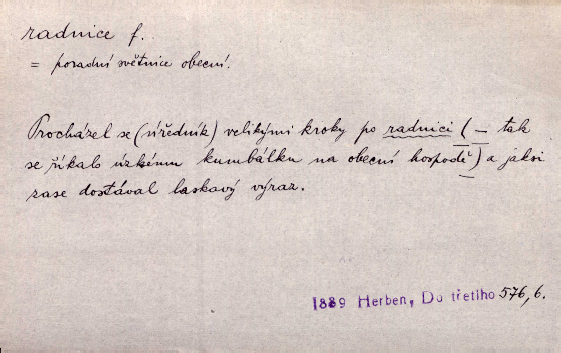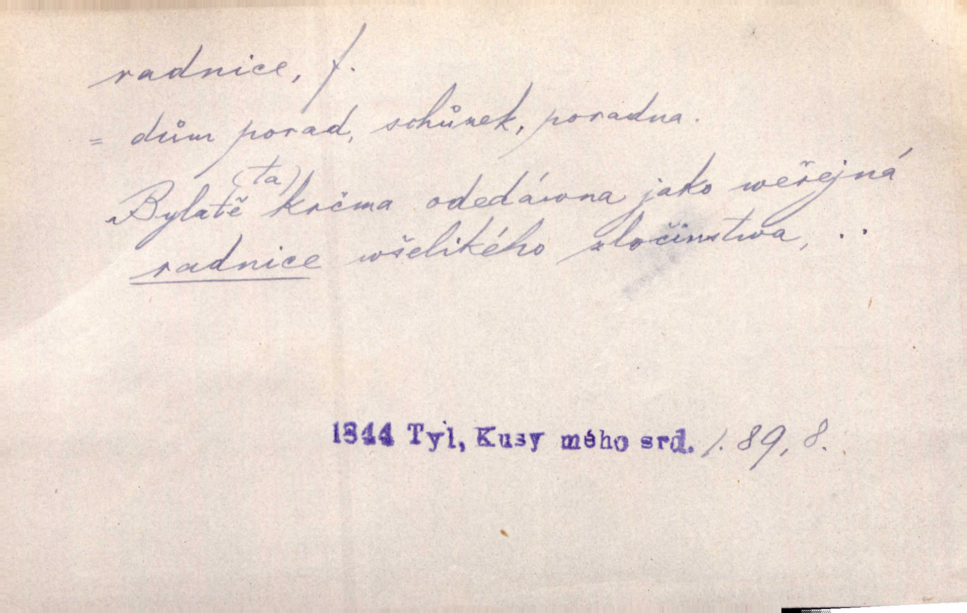 - radnice, -e f. budova obecního úřadu v městě, sídlo městské rady. Tři čtvrti na dvanáct tlouklo na vyšehradské radnici. V. Mrš. Na rynk přinášeli tesaři prkna z radnice. Win. „České Slovo“ tuze láteří: radnici ať nikdo nevěří magistrátu. Dyk.