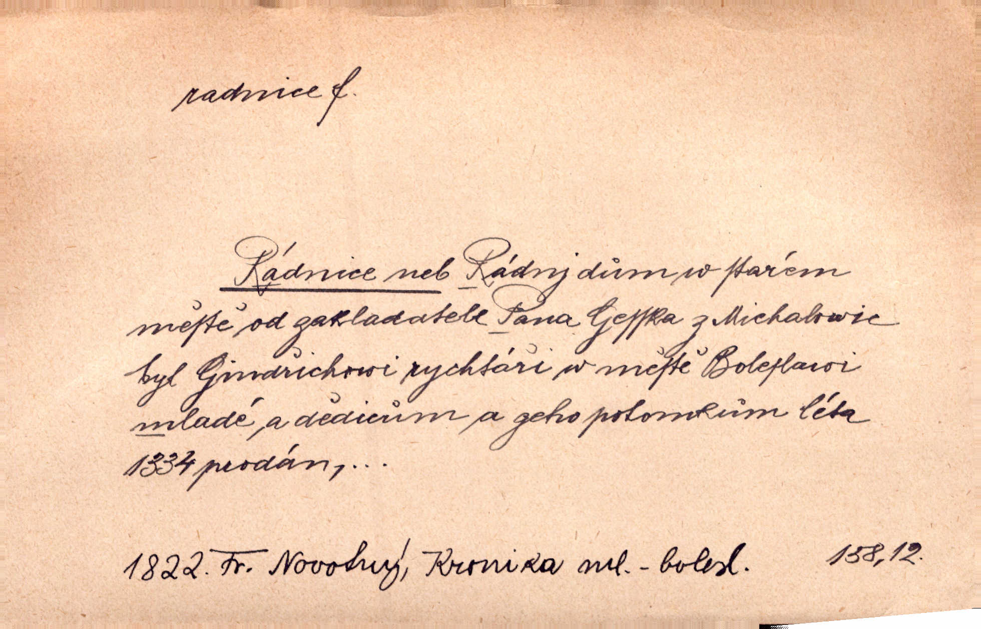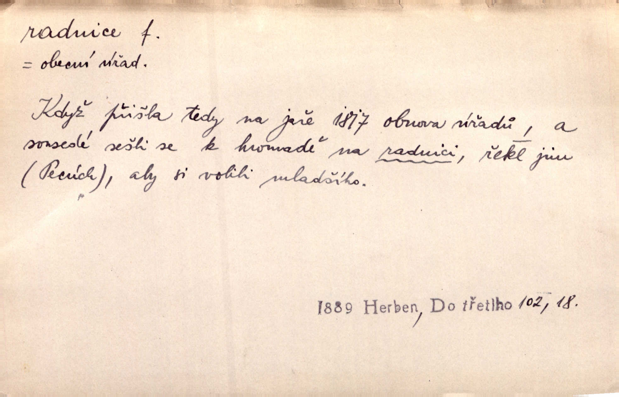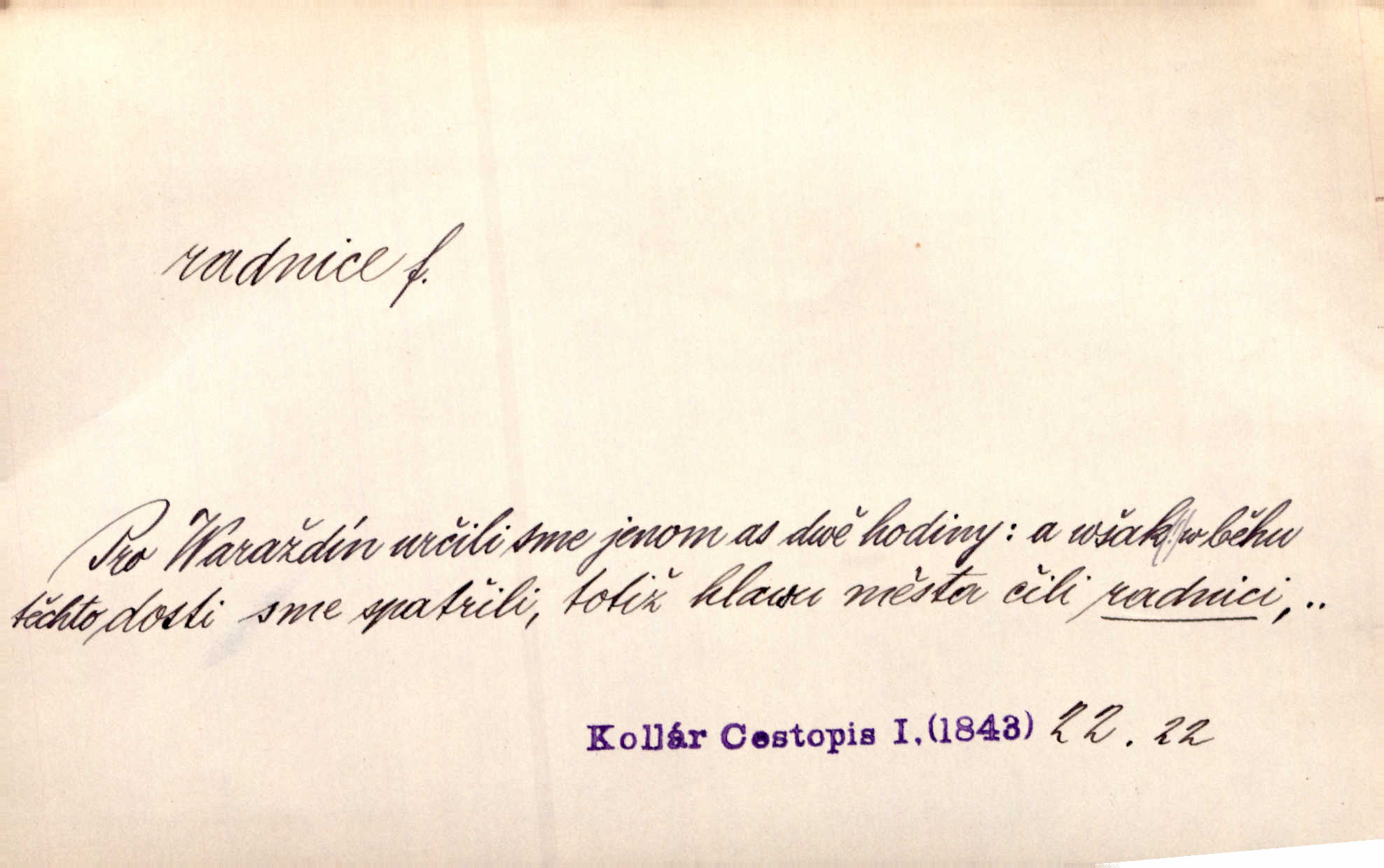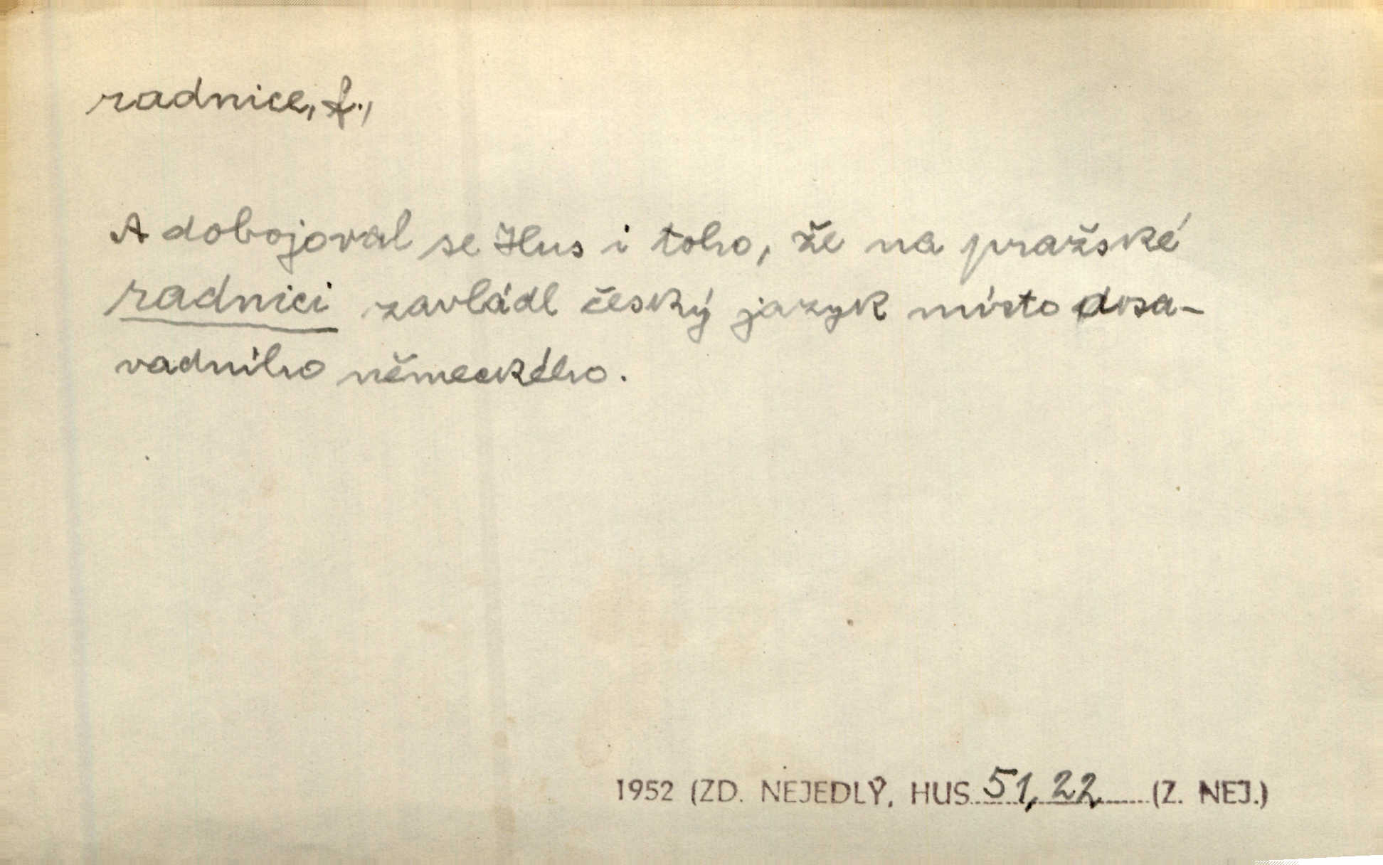- radnice, -e f. budova obecního úřadu v městě, sídlo městské rady. Tři čtvrti na dvanáct tlouklo na vyšehradské radnici. V. Mrš. Na rynk přinášeli tesaři prkna z radnice. Win. „České Slovo“ tuze láteří: radnici ať nikdo nevěří magistrátu. Dyk.