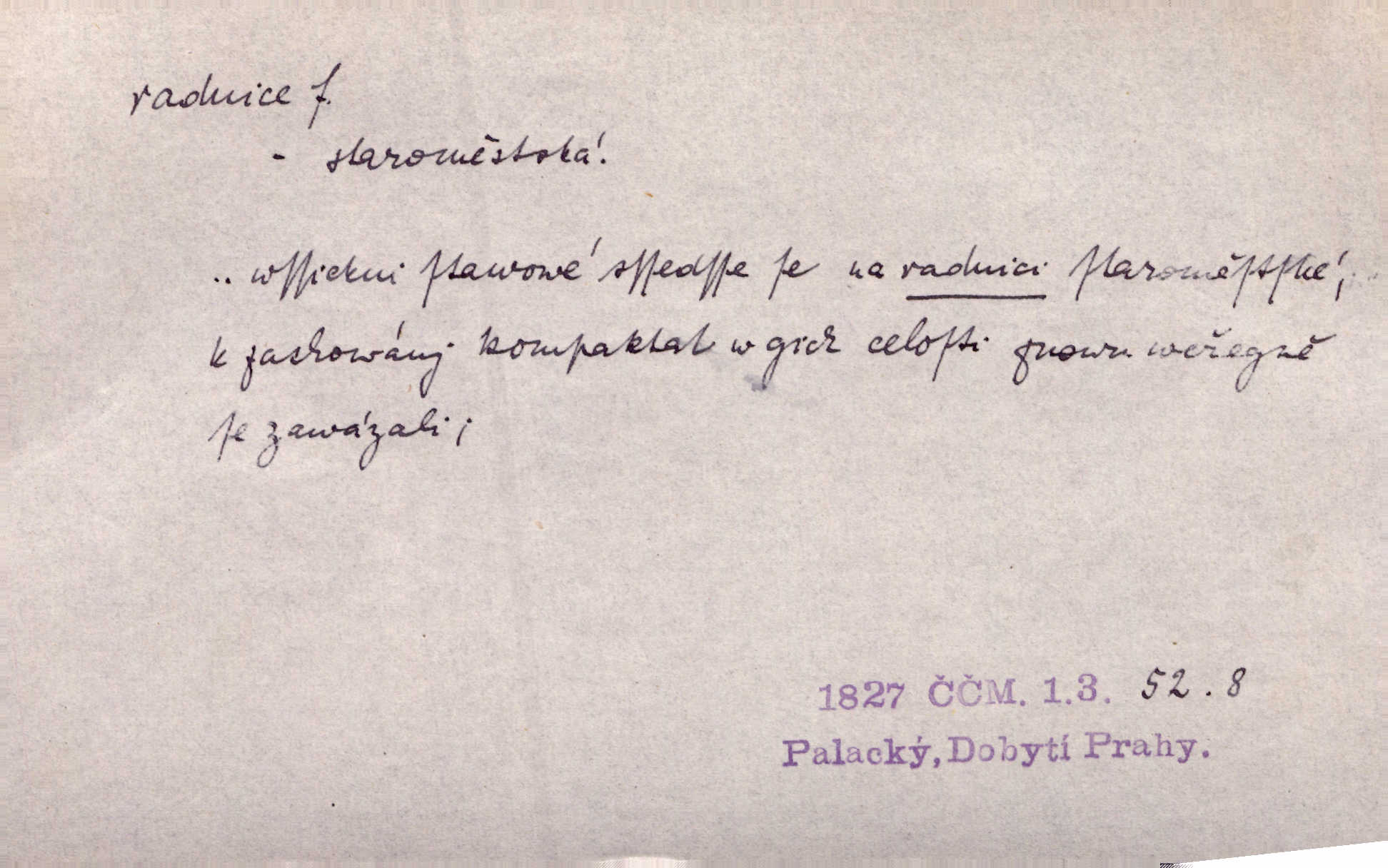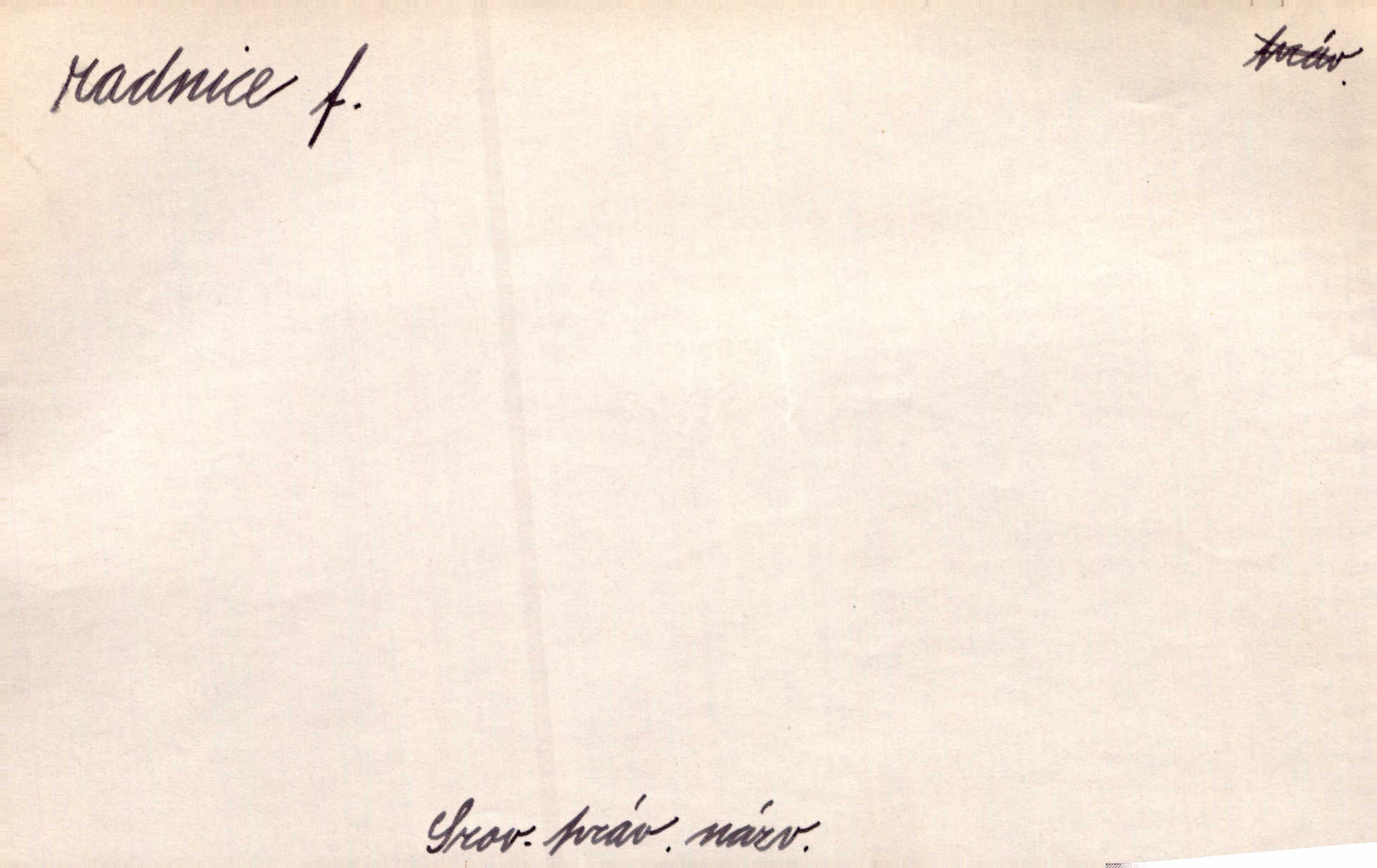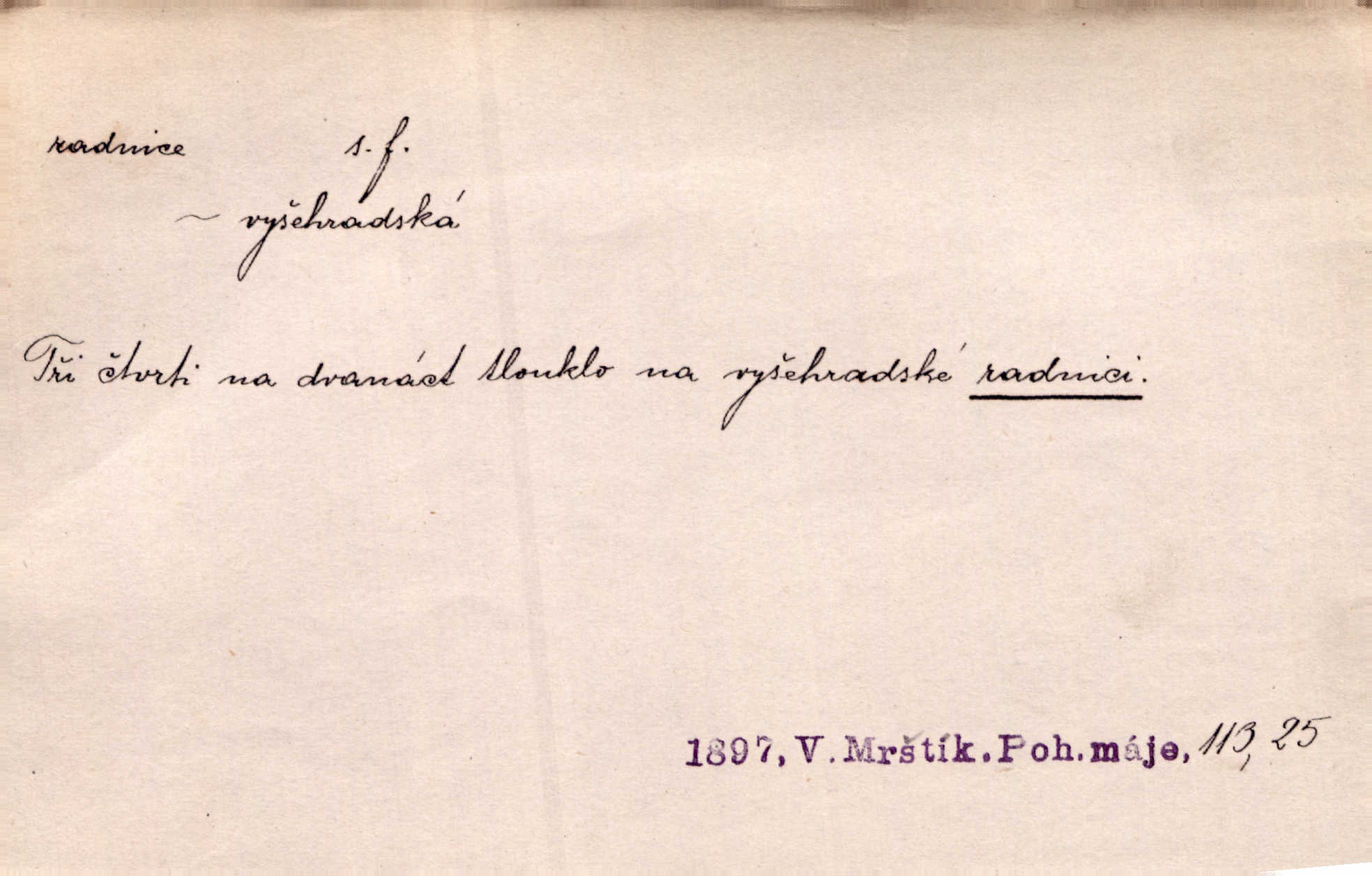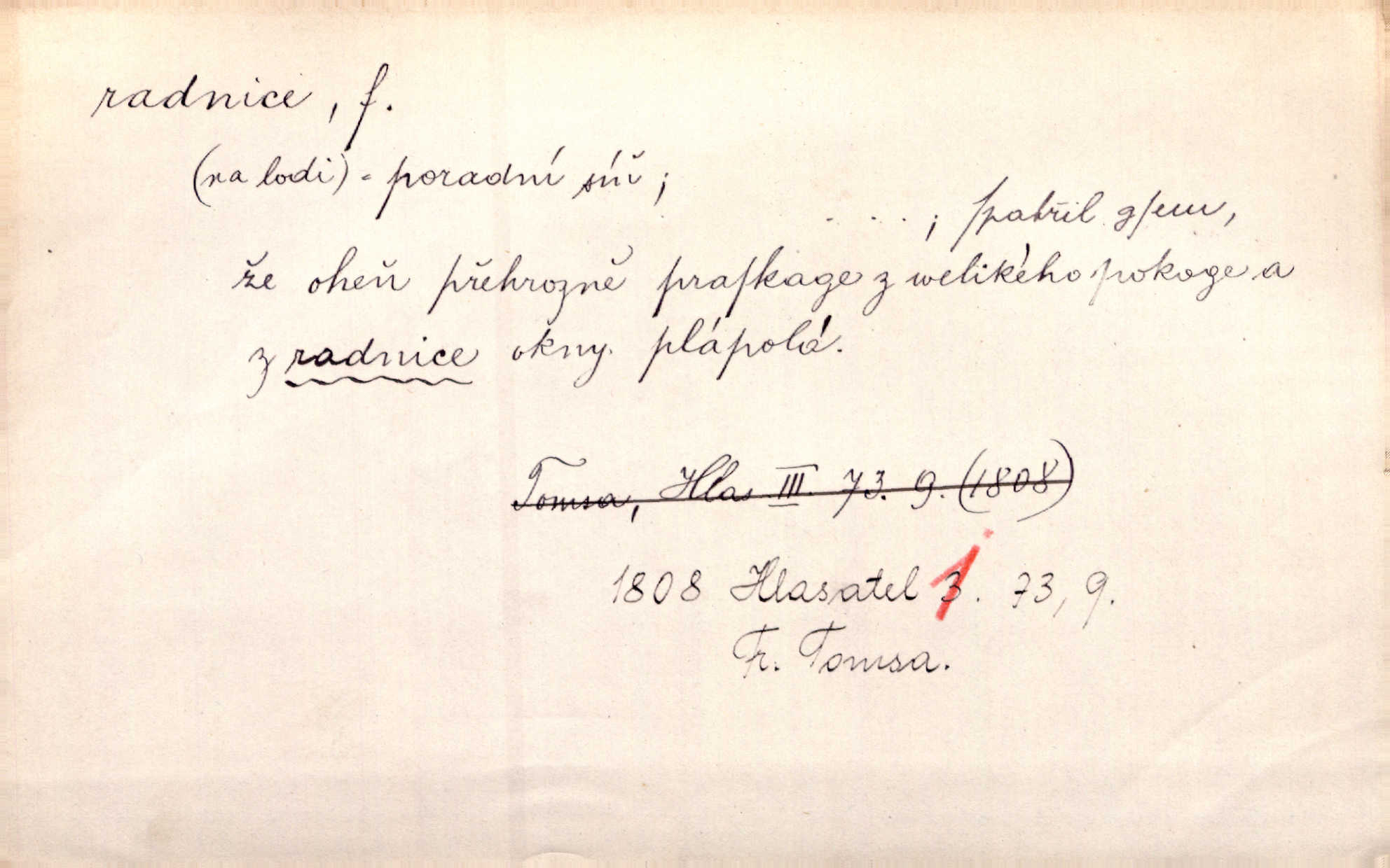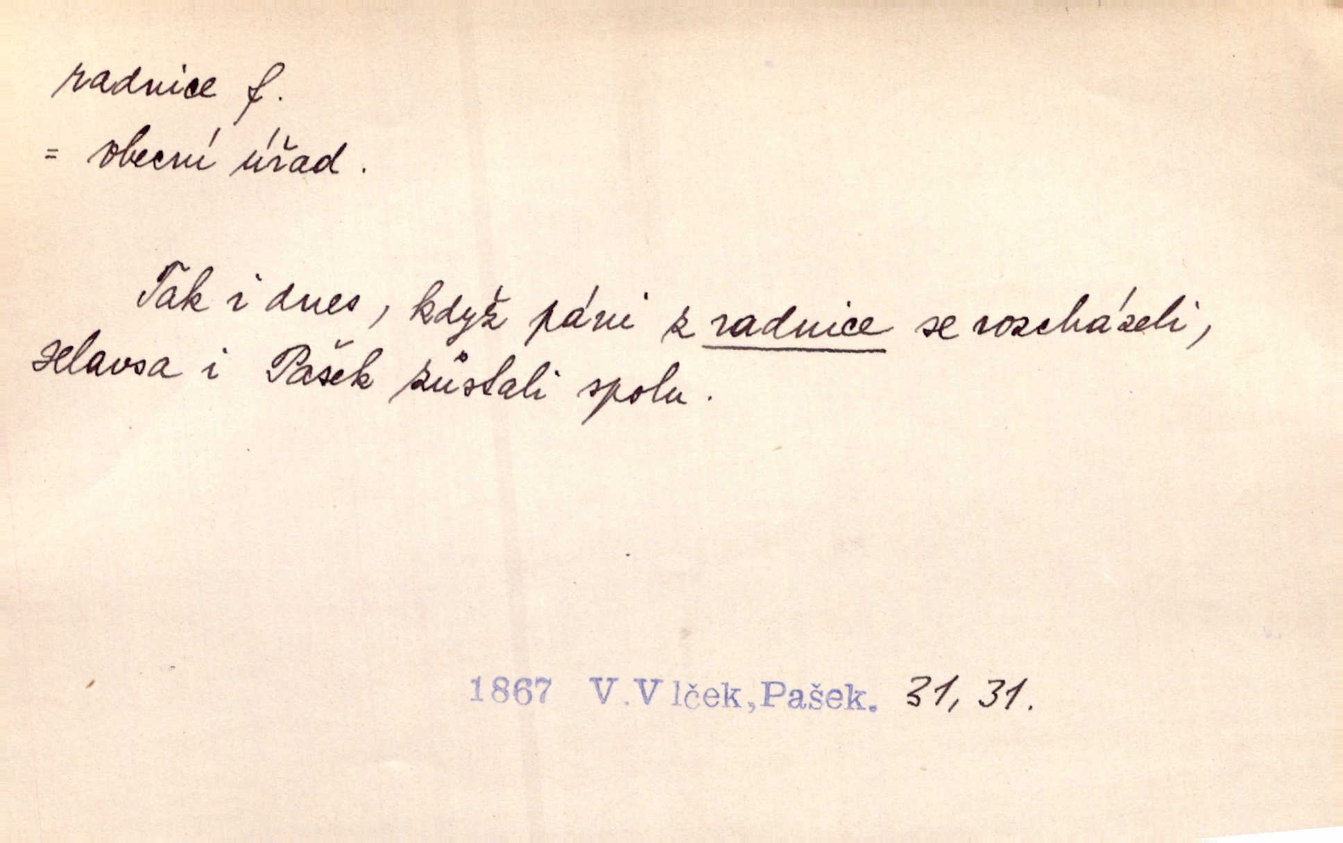 - radnice, -e f. budova obecního úřadu v městě, sídlo městské rady. Tři čtvrti na dvanáct tlouklo na vyšehradské radnici. V. Mrš. Na rynk přinášeli tesaři prkna z radnice. Win. „České Slovo“ tuze láteří: radnici ať nikdo nevěří magistrátu. Dyk.