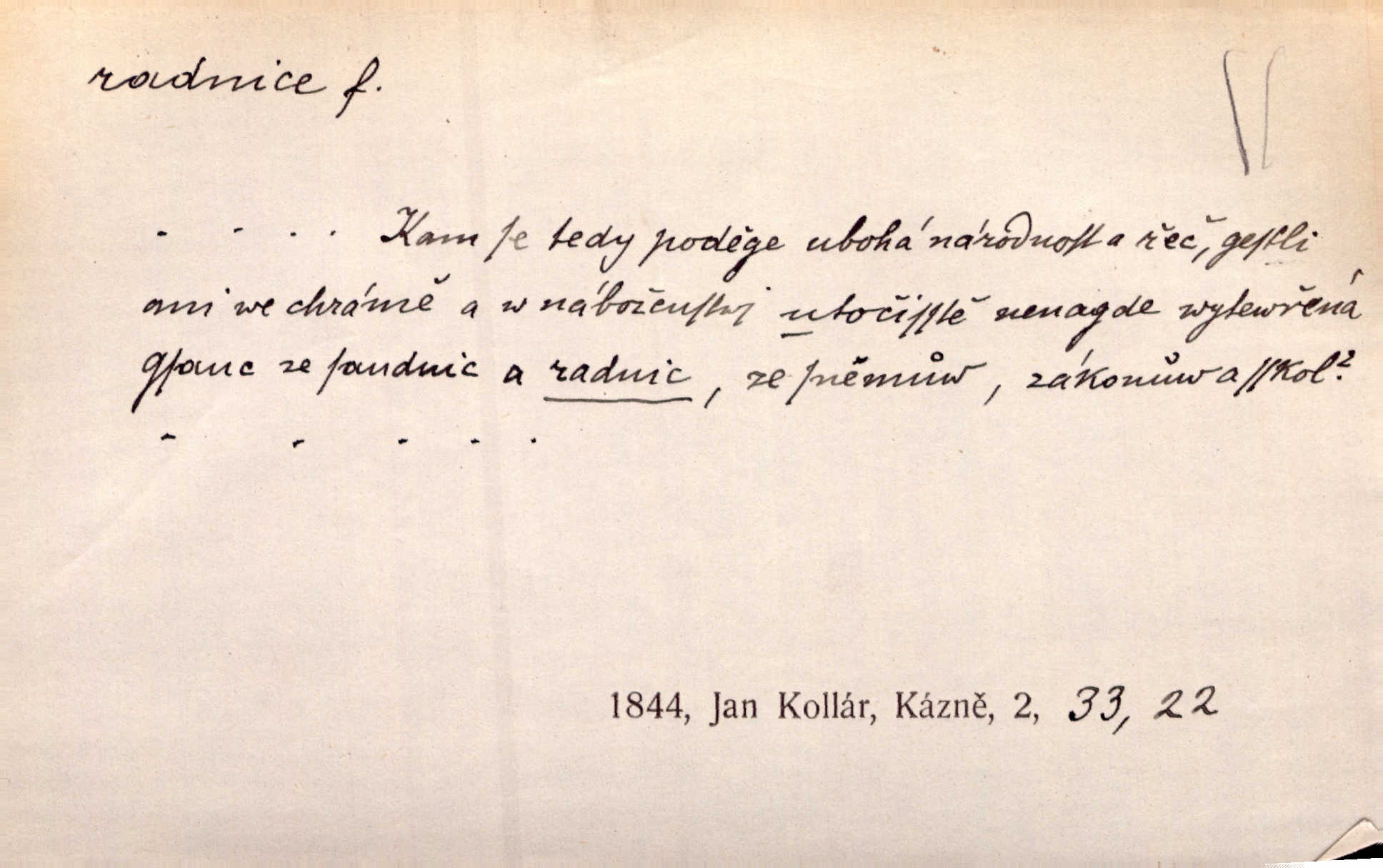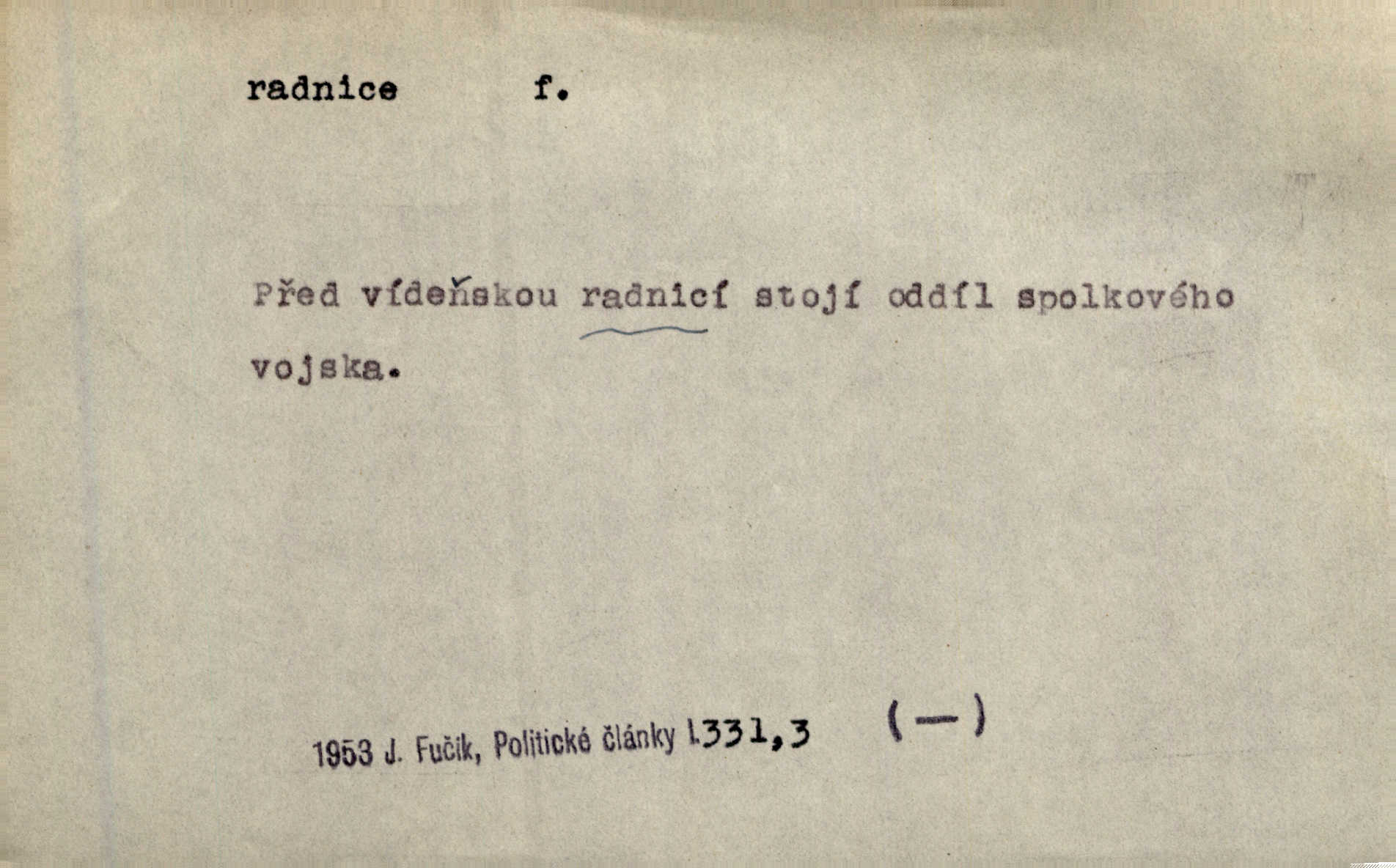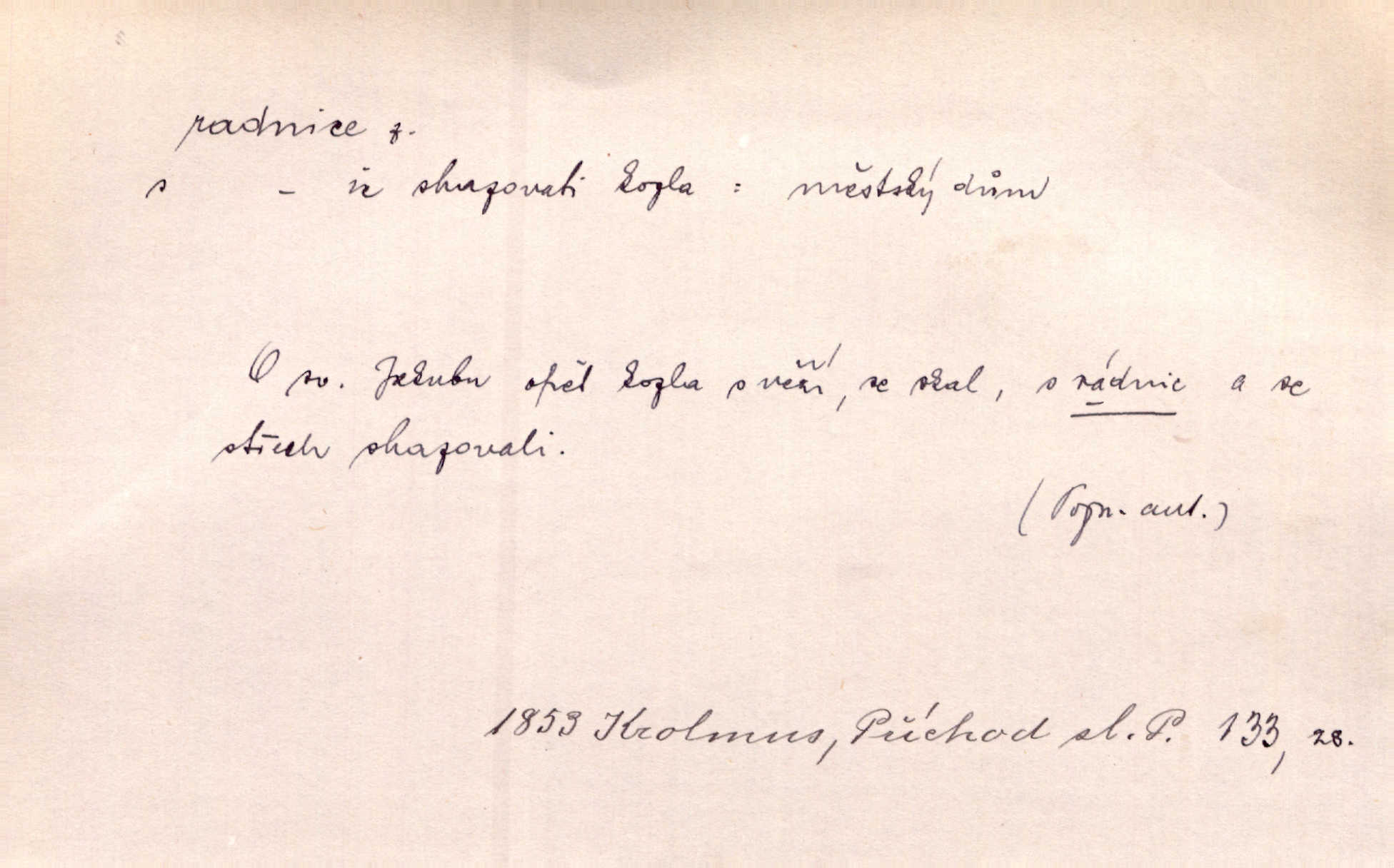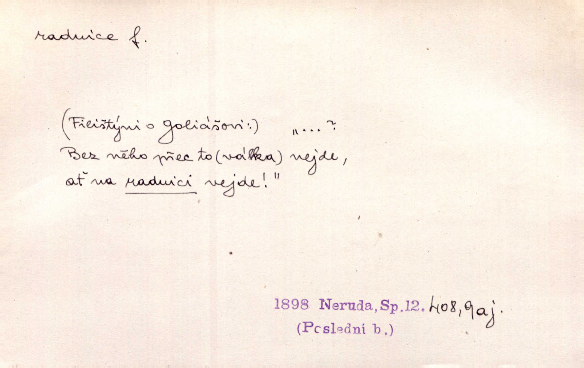 - radnice, -e f. budova obecního úřadu v městě, sídlo městské rady. Tři čtvrti na dvanáct tlouklo na vyšehradské radnici. V. Mrš. Na rynk přinášeli tesaři prkna z radnice. Win. „České Slovo“ tuze láteří: radnici ať nikdo nevěří magistrátu. Dyk.