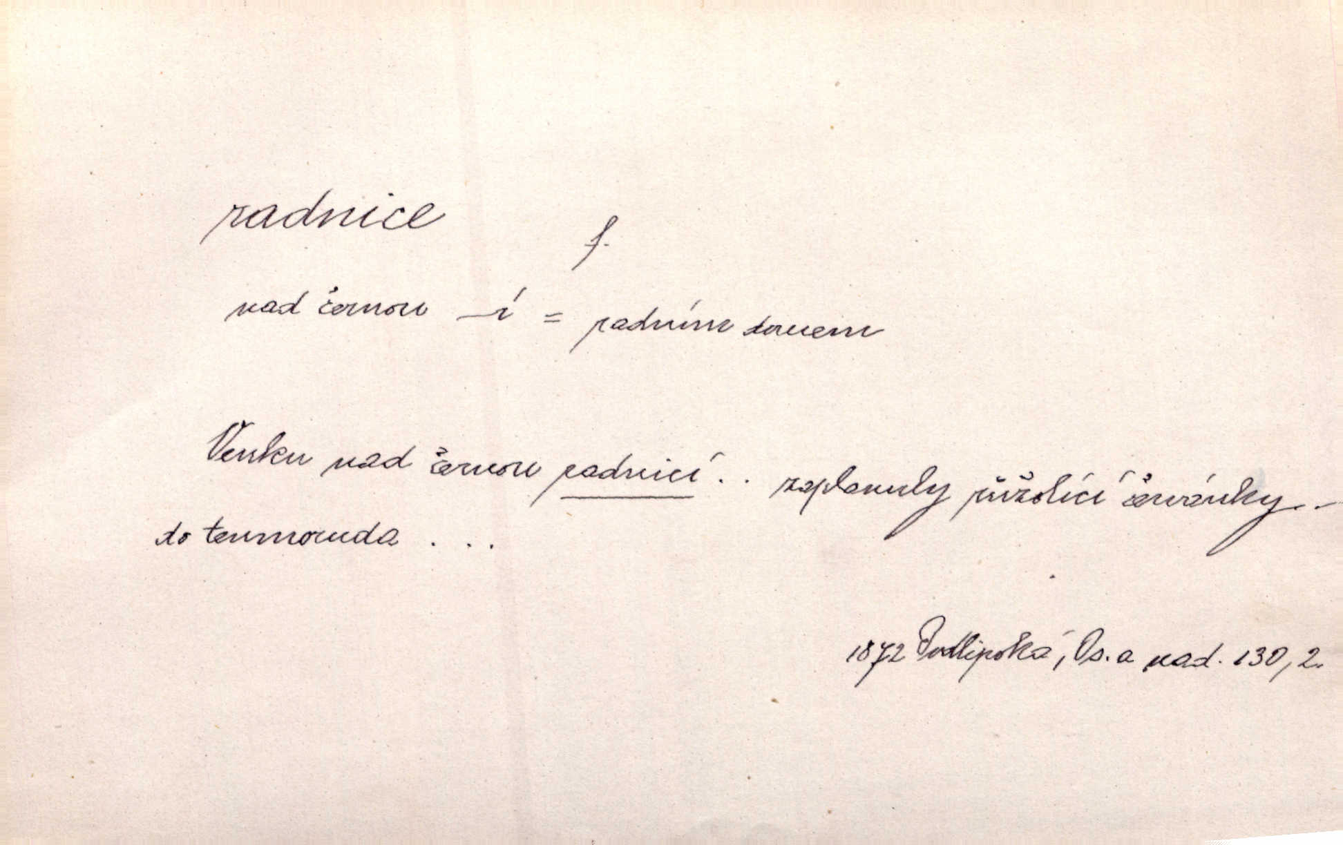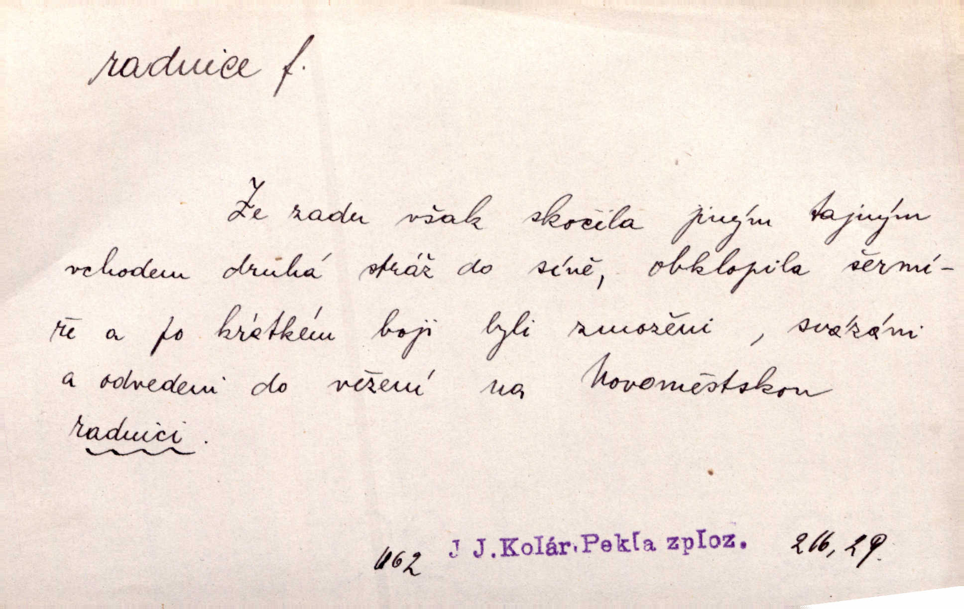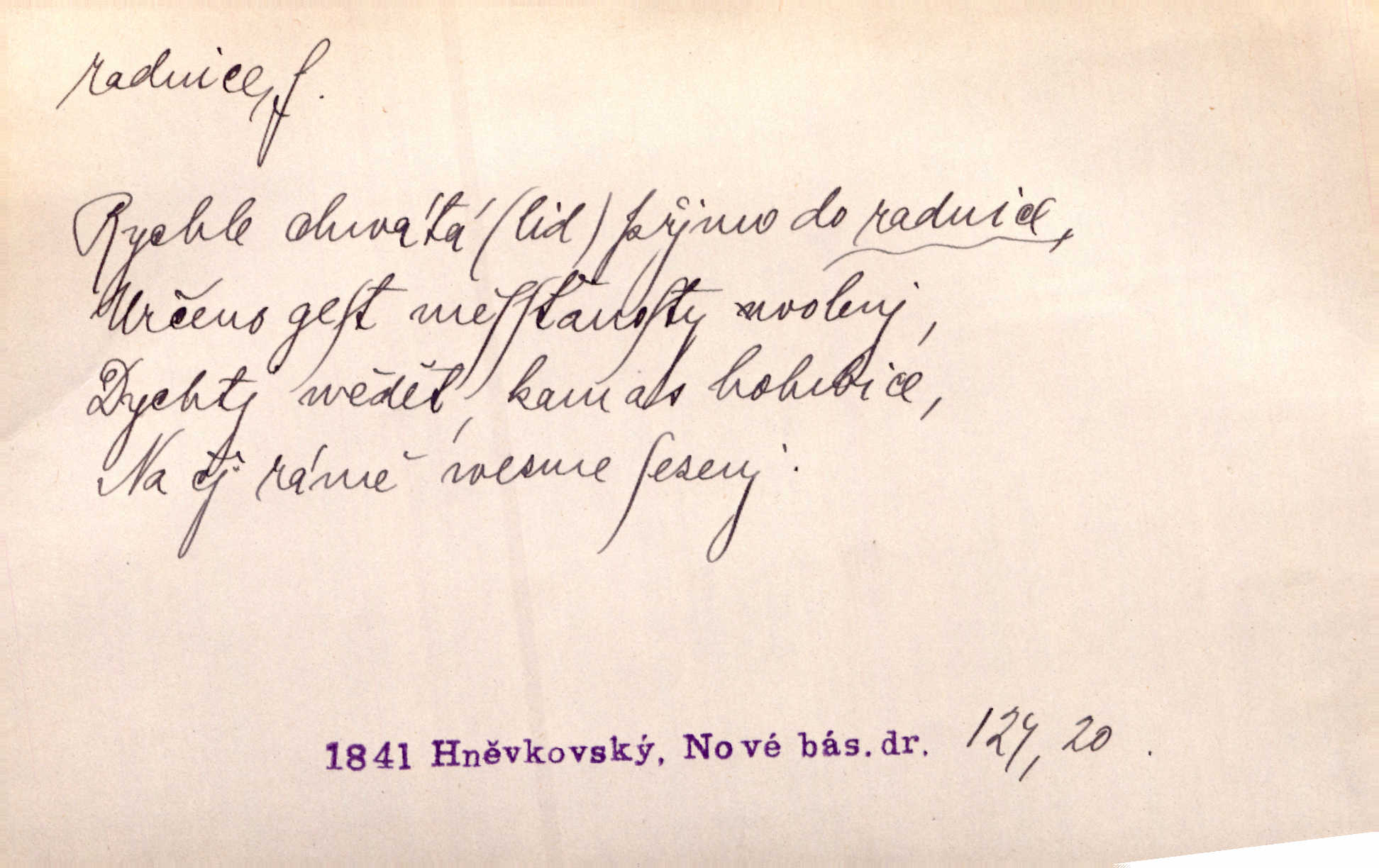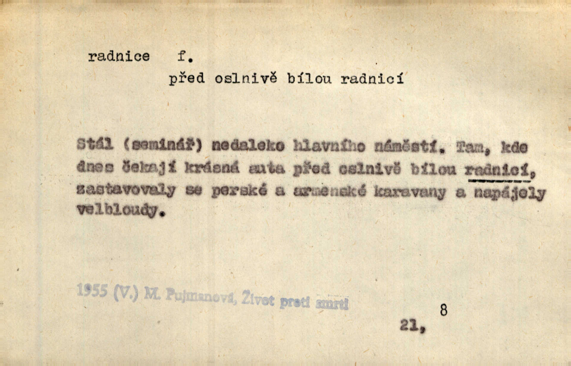 - radnice, -e f. budova obecního úřadu v městě, sídlo městské rady. Tři čtvrti na dvanáct tlouklo na vyšehradské radnici. V. Mrš. Na rynk přinášeli tesaři prkna z radnice. Win. „České Slovo“ tuze láteří: radnici ať nikdo nevěří magistrátu. Dyk.