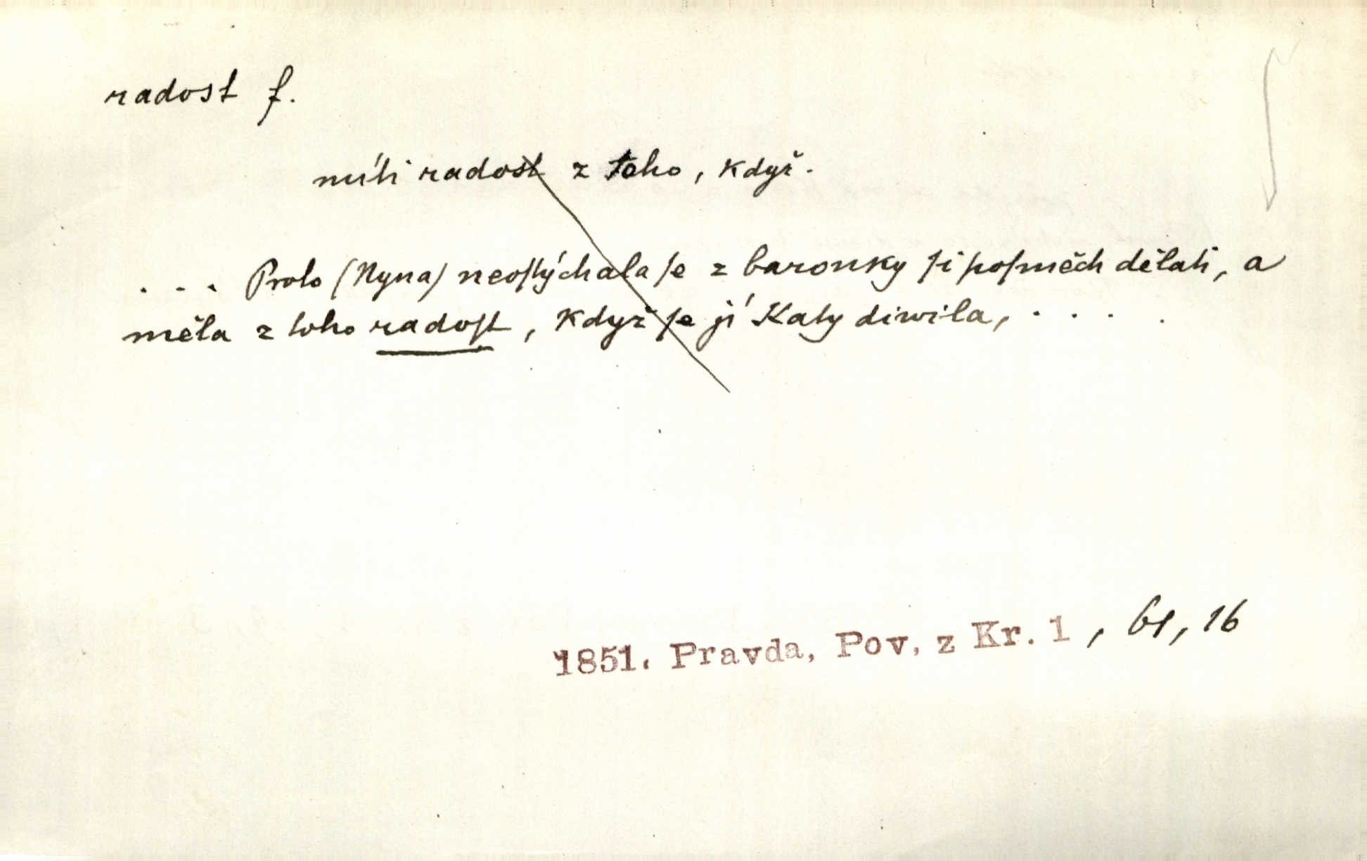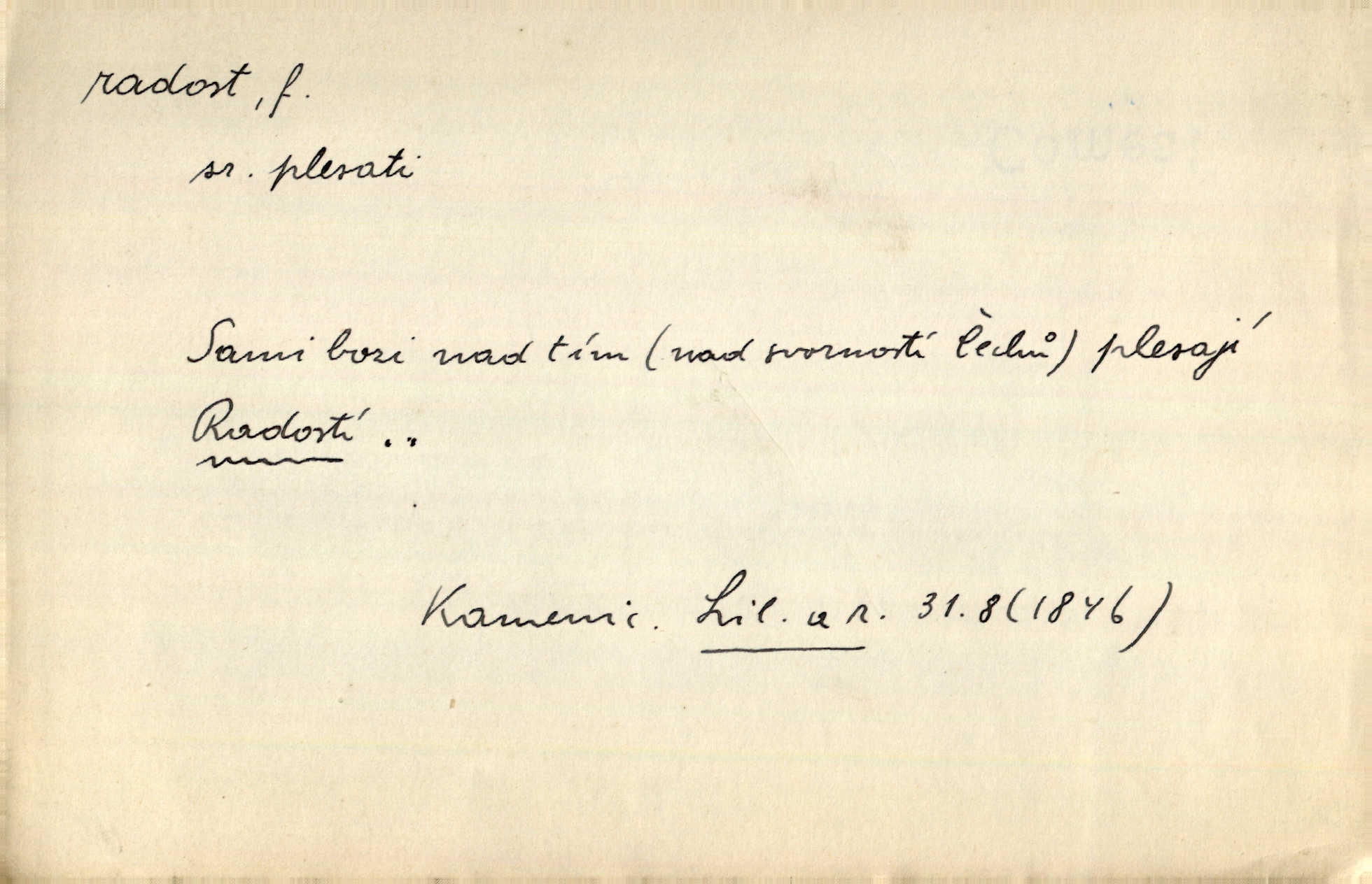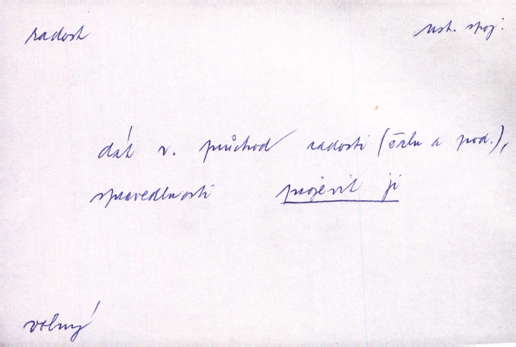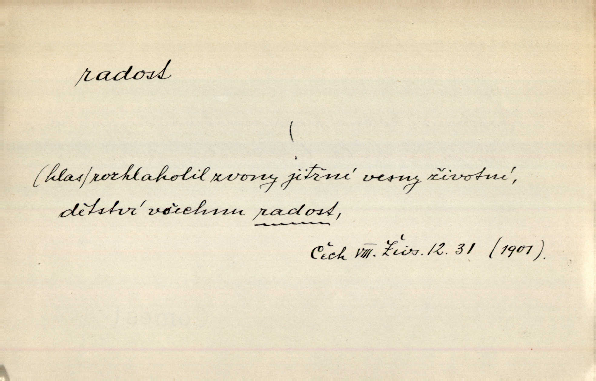 - radost, -i f. stav mysli způsobený něčím příjemným, pro člověka šťastným a projevující se obyčejně veselím, potěšením. Plna radosti, s jasnou tváří a zářícím zrakem přiběhla Anna k Potůčkovi. Jir. Naplňuješ mou duši pýchou a radostí. Šmil. Největší radostí její bylo, mohla-li komu prokázati co dobrého a milého. Svět. Bylo mi radostí, doufati, že se zase setkáme. Dyk. Mnul si radostí ruce. Šmil. Cítil v sobě dosti pružin, kteréž vzpřimovaly jeho sebedůvěru i radost ze života. Čech. Už je to jisté — že můžeme čekat radost — tak někdy po žních radostnou událost, rodinu. Preis. Na tvrzi byla radosť bydleti. Šmil. Bylo radosť podívati se na ně! Herb. Úplatkářství kvetlo jedna radost náramně. Vrba. Zahradnictví mu sloužilo až radost velmi. Herb. D věc n. osoba, kterou máme rádi, která nám působí potěšení; důvod radosti. Před desíti lety se mu ztratil sedmiletý chlapec, jeho jediná radost. Něm. Ta [jalovička] byla jeho jediná radost. Třeb. Sama radostí mateřských se nedočkala. Herrm. Zakusil už dosti těch radostí manželských s paní Johankou. Šmil. Tato světnička tolik výjevů mně drahých zřela, radosti a žaly mnohých roků. Čech. „Ježíši — radosti andělů! Je-li možná?!“ zvolala Marta. Arb. D radost věčná lid. blaženost věčná. Moje Hanče, Pánbůh jí dej věčnou radost, měla také někdy vrtochy (o zemřelé). Něm. Můj nebožtík Jakub — dejž mu bůh radosť věčnou — byl u pana otce naší Evičky v službě. Just. D radovánka, veselí (obyč. pl. radosti). Vdovec neopovrhoval radostmi světskými, ale také v užívání světa nepřeháněl. Don. Ouvej, ouvej! Konec radostí! Sab. Celá ves se shromážďuje k posvícenské radosti. Čel.