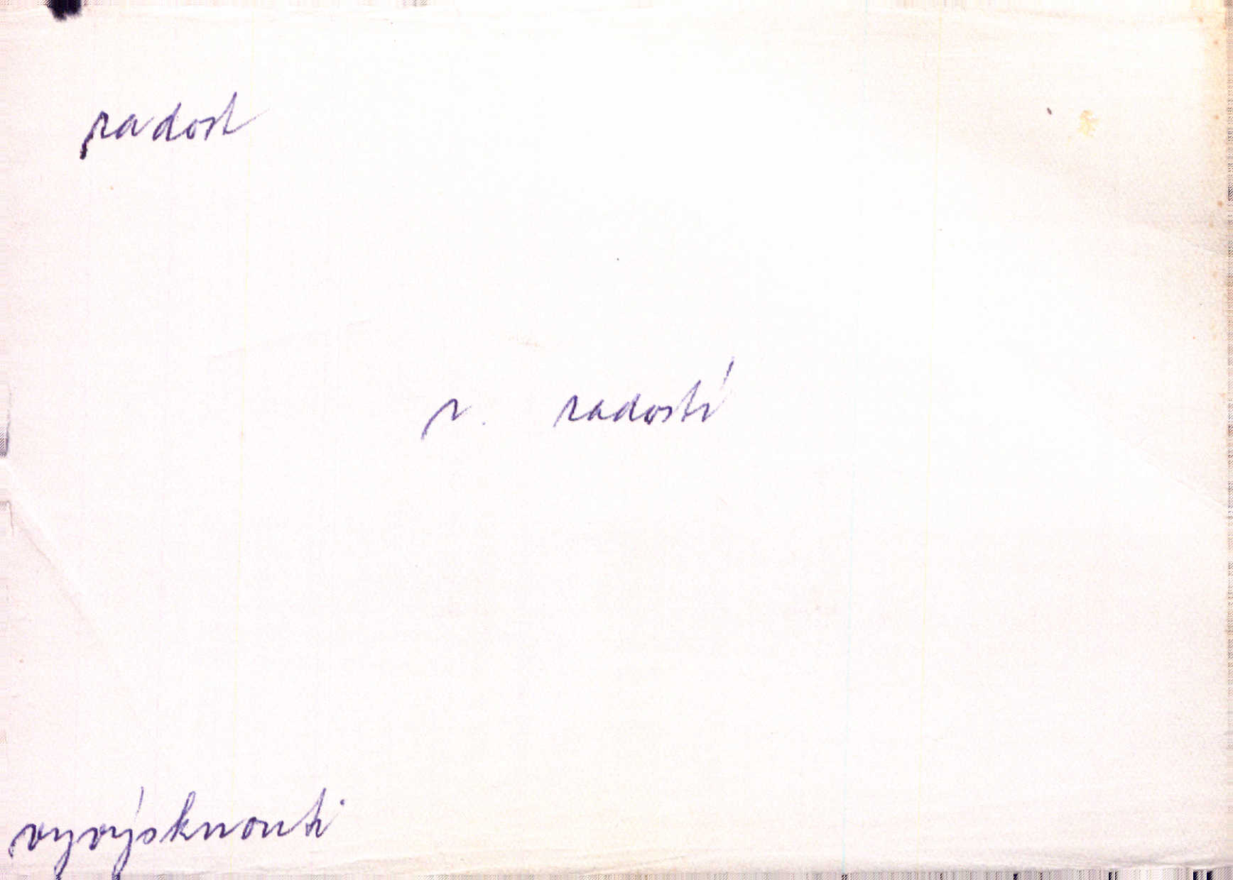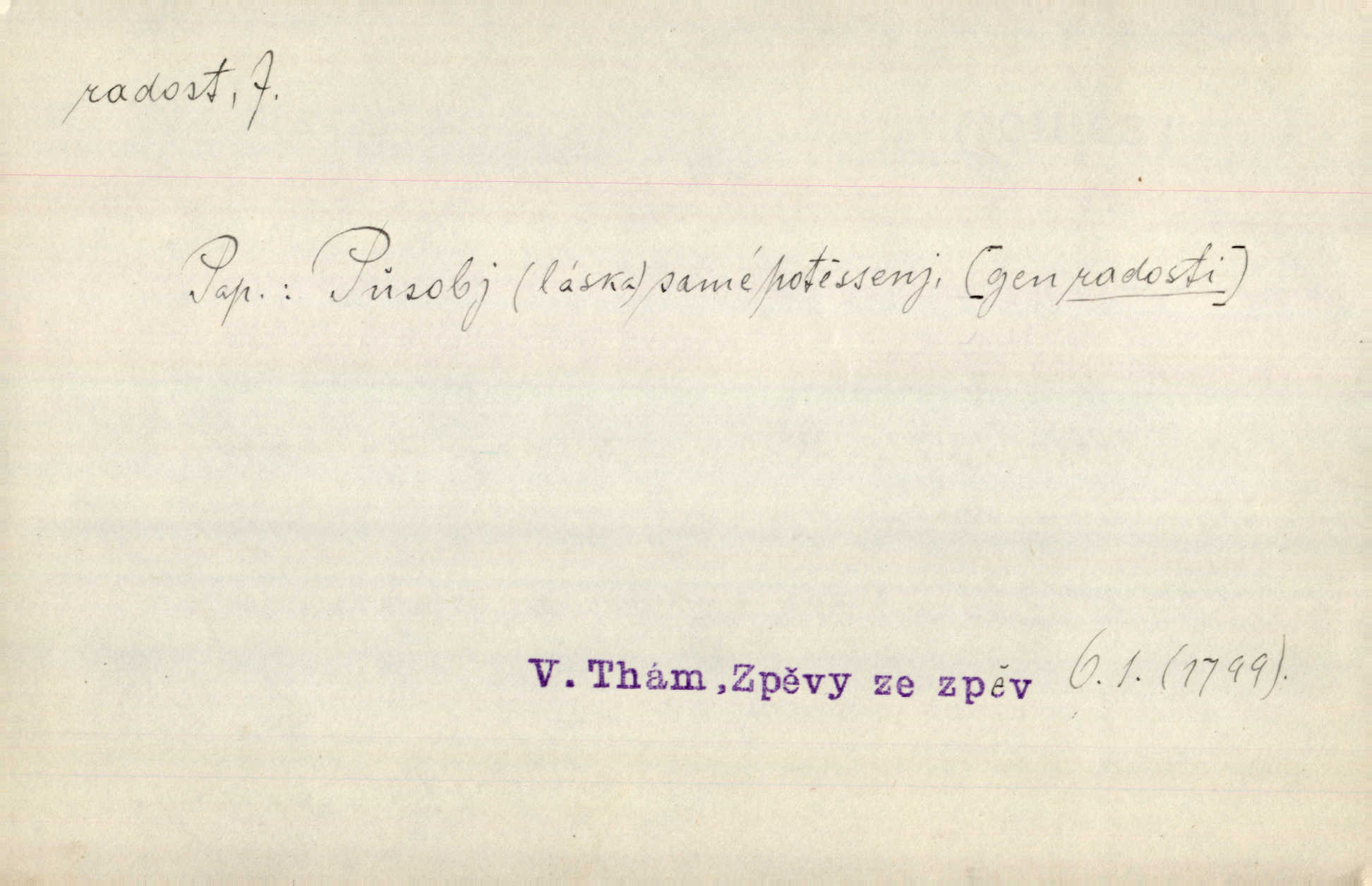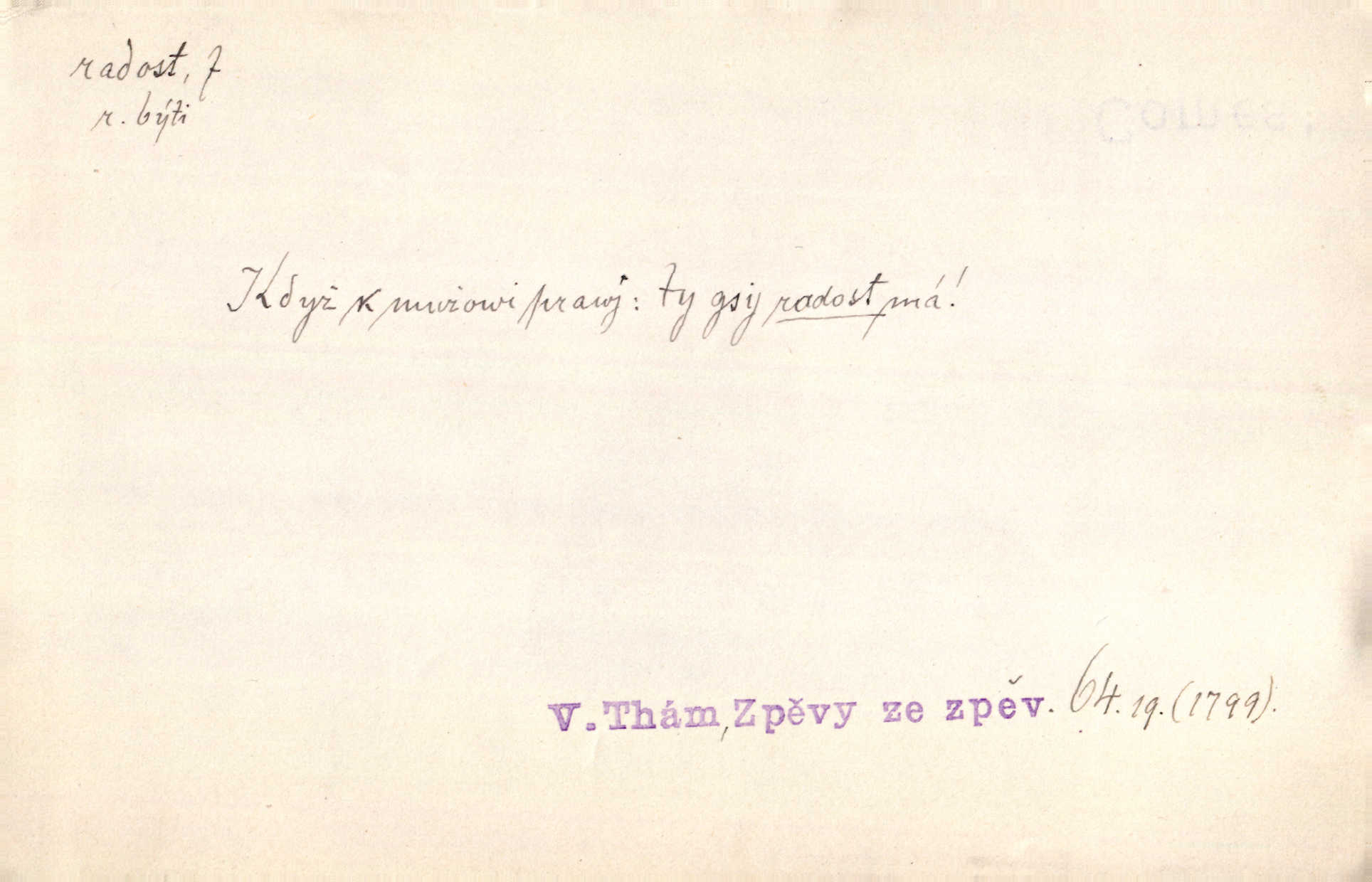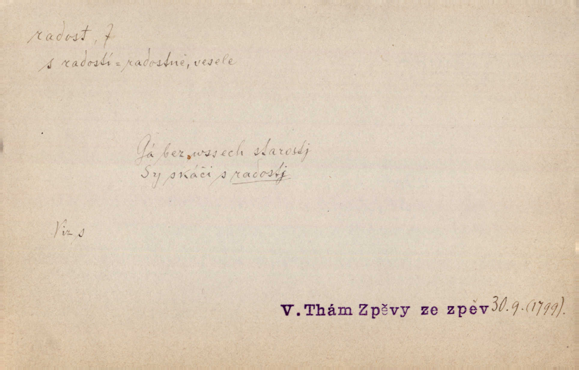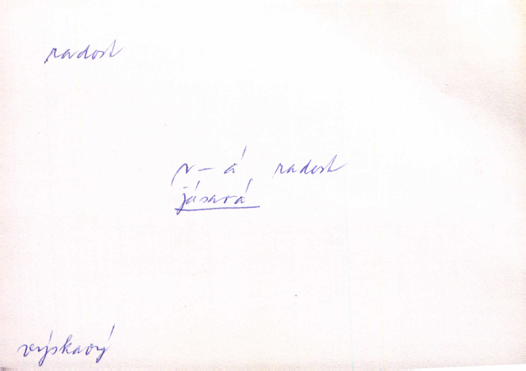 - radost, -i f. stav mysli způsobený něčím příjemným, pro člověka šťastným a projevující se obyčejně veselím, potěšením. Plna radosti, s jasnou tváří a zářícím zrakem přiběhla Anna k Potůčkovi. Jir. Naplňuješ mou duši pýchou a radostí. Šmil. Největší radostí její bylo, mohla-li komu prokázati co dobrého a milého. Svět. Bylo mi radostí, doufati, že se zase setkáme. Dyk. Mnul si radostí ruce. Šmil. Cítil v sobě dosti pružin, kteréž vzpřimovaly jeho sebedůvěru i radost ze života. Čech. Už je to jisté — že můžeme čekat radost — tak někdy po žních radostnou událost, rodinu. Preis. Na tvrzi byla radosť bydleti. Šmil. Bylo radosť podívati se na ně! Herb. Úplatkářství kvetlo jedna radost náramně. Vrba. Zahradnictví mu sloužilo až radost velmi. Herb. D věc n. osoba, kterou máme rádi, která nám působí potěšení; důvod radosti. Před desíti lety se mu ztratil sedmiletý chlapec, jeho jediná radost. Něm. Ta [jalovička] byla jeho jediná radost. Třeb. Sama radostí mateřských se nedočkala. Herrm. Zakusil už dosti těch radostí manželských s paní Johankou. Šmil. Tato světnička tolik výjevů mně drahých zřela, radosti a žaly mnohých roků. Čech. „Ježíši — radosti andělů! Je-li možná?!“ zvolala Marta. Arb. D radost věčná lid. blaženost věčná. Moje Hanče, Pánbůh jí dej věčnou radost, měla také někdy vrtochy (o zemřelé). Něm. Můj nebožtík Jakub — dejž mu bůh radosť věčnou — byl u pana otce naší Evičky v službě. Just. D radovánka, veselí (obyč. pl. radosti). Vdovec neopovrhoval radostmi světskými, ale také v užívání světa nepřeháněl. Don. Ouvej, ouvej! Konec radostí! Sab. Celá ves se shromážďuje k posvícenské radosti. Čel.