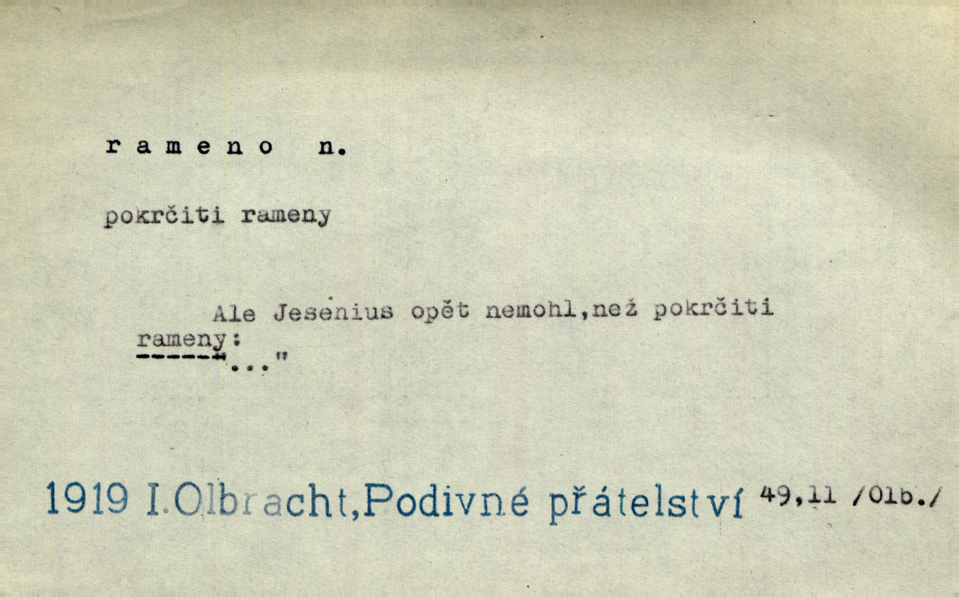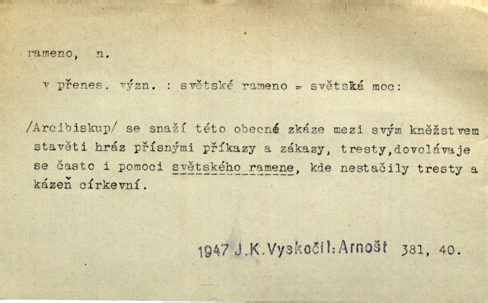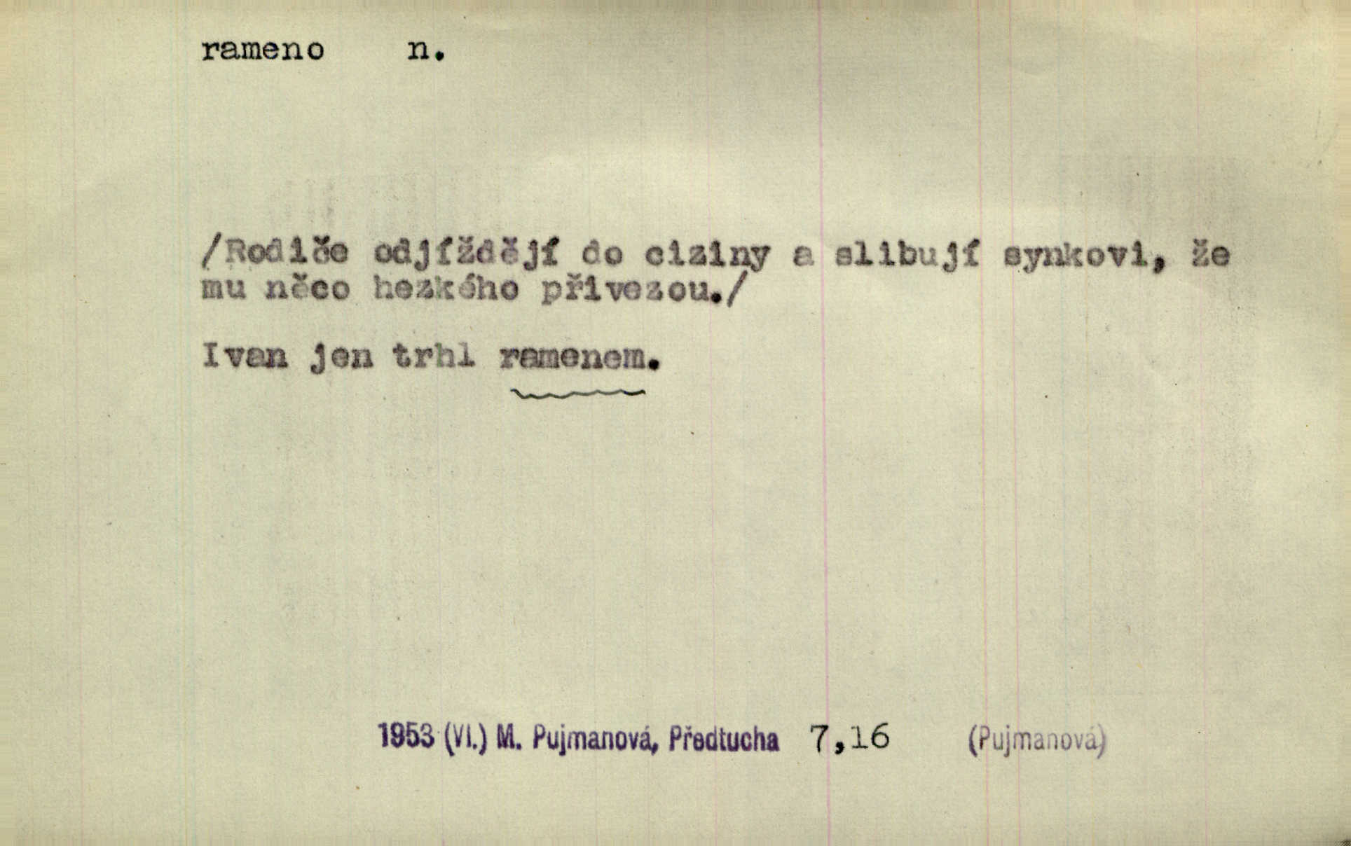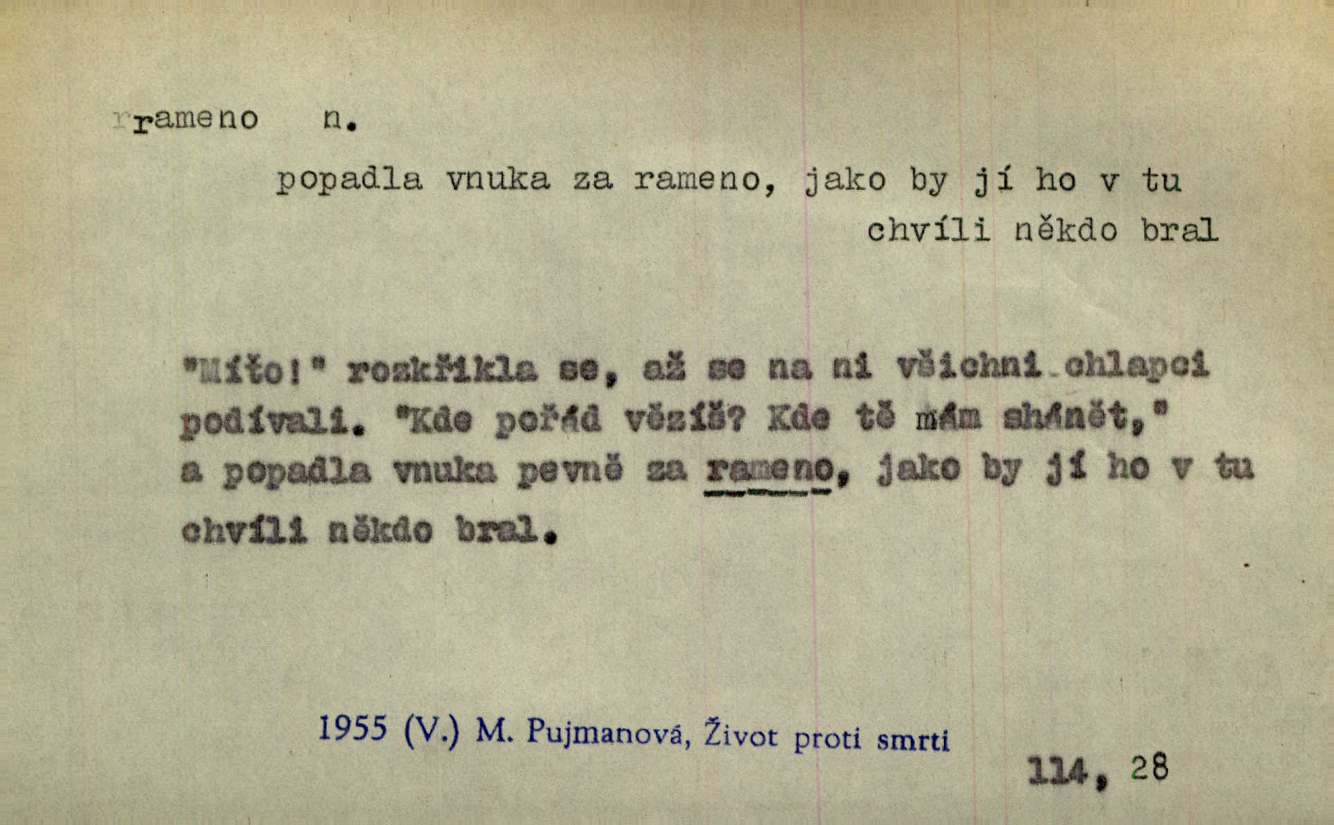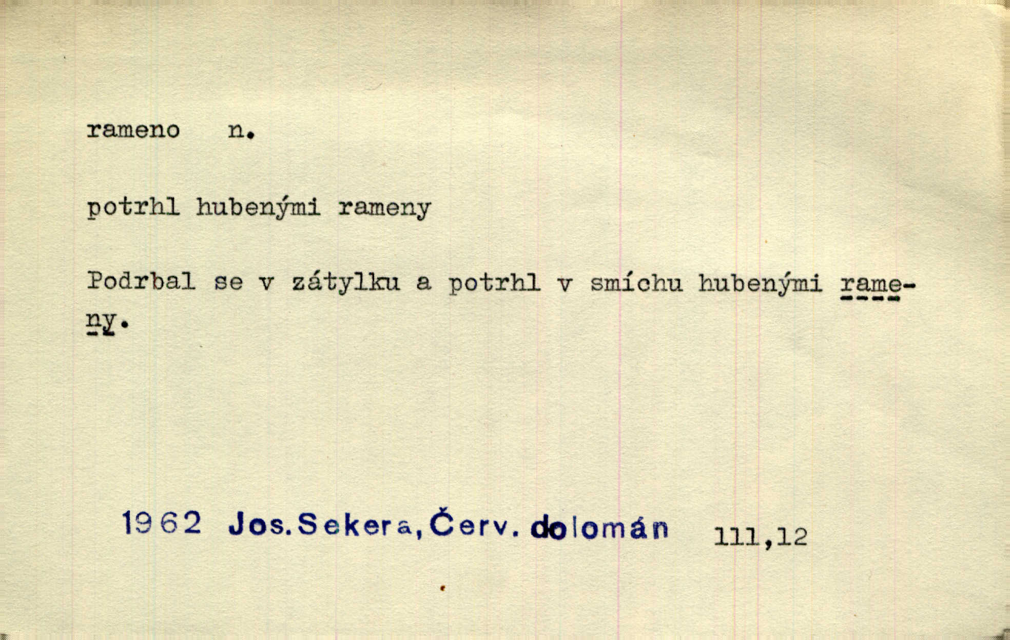 - rameno, -a n., zast. a bás. rámě, -ene n. (2. pl. ramen; 6. pl. ramenech; v ust. spoj. též u ramenou, na ramenou a p.) horní postranní část těla tvořená kloubem a kostí ramenní. [Myslivec] přehodil pušku přes rameno a šel. Něm. Položila si hlavu na slečnino rámě, jako by u ní pomoci hledala. Preis. Potěšil byl velký, hlavy trochu k levému rameni přikloněné. Rais. Tatík, hrabici maje na ramenou, upocen kolébal se po mezi. Rais. Plaid visel mu v dlouhých řasách s ramena na zem. Zey. Vzal nohy na ramena dal se na útěk. Herb. Na Anežku obě sestry hleděly přes rameno pohrdavě. Herb. [Snad není nikdo] tak cynický, aby pokrčil rameny nad osudem vlastního národa projevil lhostejnost. Týd. rozhl. Přen. A na tvých [Šumavy] hrdých ramenech plášť blýská se ti bílý. Heyd. Voj. na rámě — zbraň! (povel). D horní lidská končetina, zvláště její část odshora k lokti. Marně po tobě jsem vzpínal rámě. Rok. Zřím časem, skolébaný v dumy snivé, jak nahé, plné rameno se míhá. Vrch. Ó že jsem sláb a stár a rámě mé již nemůž rázně meče pozdvihnout! Krás. Simáková v ten strastný čas dala se obtáčeti ramenem Vejvodovým. Šmil. Nabídl jí rámě, Nanynka se zavěsila. Herrm. Byl to mladík podobný, že by každá se zalíbením mu rámě podala vdala se za něho. Jir. Pod cizím jménem potuloval se po Táborsku a ukrýval se před ramenem spravedlnosti před četníkem. Staš. Strážník hrozil [ohněstrůjci] zatčením, což by bývalo velmi těžko, ježto sebe delší rámě bezpečnosti nedosáhlo přes hradbu. Čap. Ch. První, kdož na sobě pocítili trestající rámě církve, byli Albigensové. Čech. Nepřítele strážce tvého, Bohše nelítostivého Boží rámě schvátilo Bůh. Macháč. Ty [Bůh] dobrému králi stále rameno své mocné přej! ochranu. Čel. Práv. rameno světské pomoc úřadů světských úřadům církevním, bracchium saeculare. Zool. první základní část přední okončiny obratlovců (mimo ryby). D rameno část něčeho do strany vybíhající. Uvidělo [slunce] lid shromážděný u kostela, jak na kolenou klečí pod rozpjatými rameny dřevěného kříže. A. Mrš. Ramena bronzových lustrů vykvétala v květinové kalichy ze skla perleťového. Herrm. Pod starou pláničkou se široce rozloženými rameny větví páslo děvče v modré pruhované sukni husy. R. Svob. Křižování aut na vjezdových a výjezdových ramenech nebude na závadu. Techn. obz. Úzkou uličkou dáme se nyní podél ramena Vltavy. Pfleg. Tak dostali se k nějaké tůni v hluboké prorvě, snad v mrtvém rameni starého řečiště. Jir. Geol. rameno vrásy jedna ze stran omezujících vrásu. Stav. rameno schodů část přímočarého schodiště, která vede v jednom směru. Vodár. rameno sestupné klesající část násoskového spojení vodárenských studní. D štíhlá, podlouhlá součást stroje n. jiného zařízení, upevněná na jednom n. i na obou koncích. Stroj. rameno jeřábu, semaforu, regulátoru, šicího stroje a pod.; rameno otočné, sklápěcí, kladivové a j.; rameno kola paprsek, špice. D Geom. jedna ze dvou stejně dlouhých stran v trojúhelníku rovnoramenném; rameno úhlu polopaprsek odchýlený od druhého polopaprsku o určitý úhel; jedna z obou různoběžných stran v lichoběžníku. Fys. rameno síly kolmá vzdálenost působiště síly od těžiště.