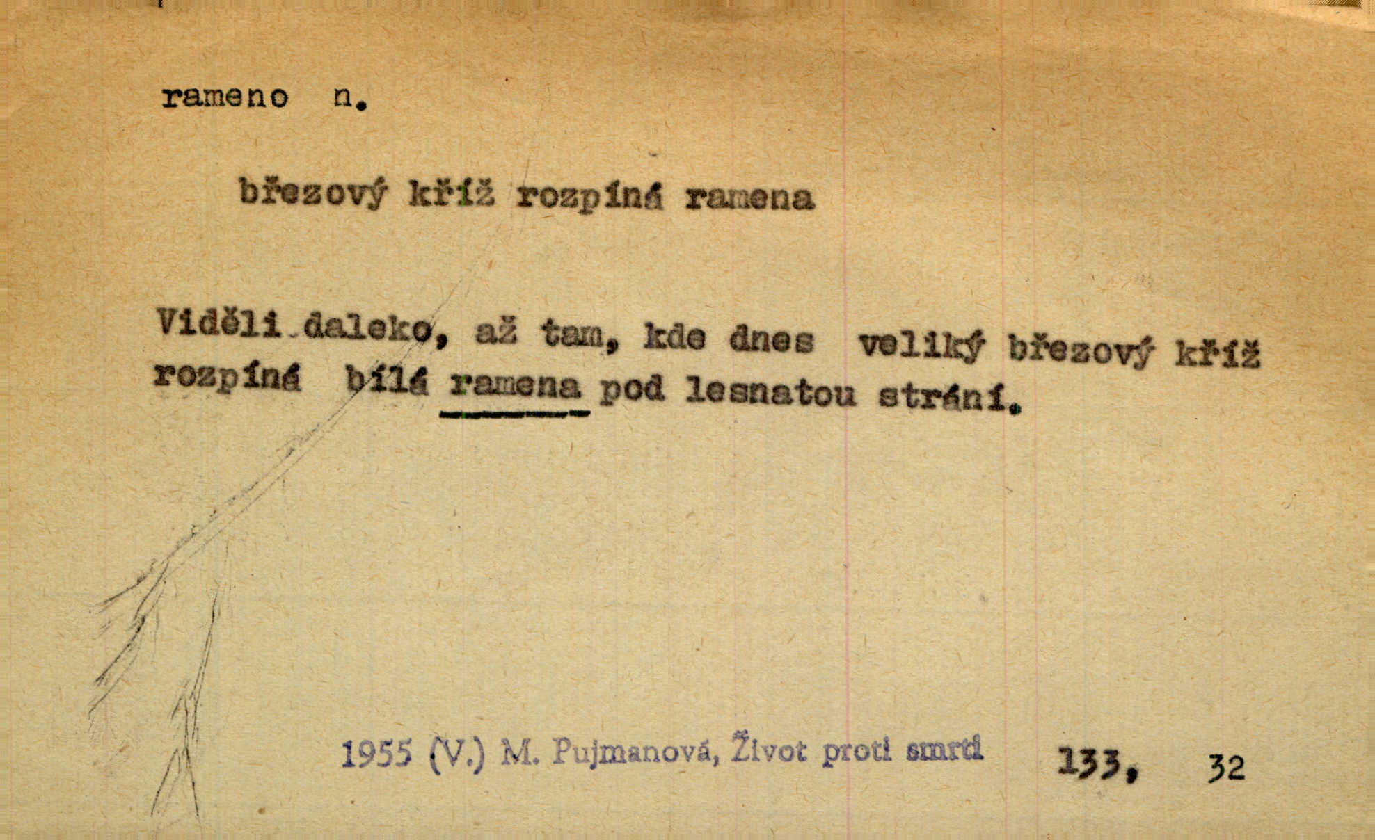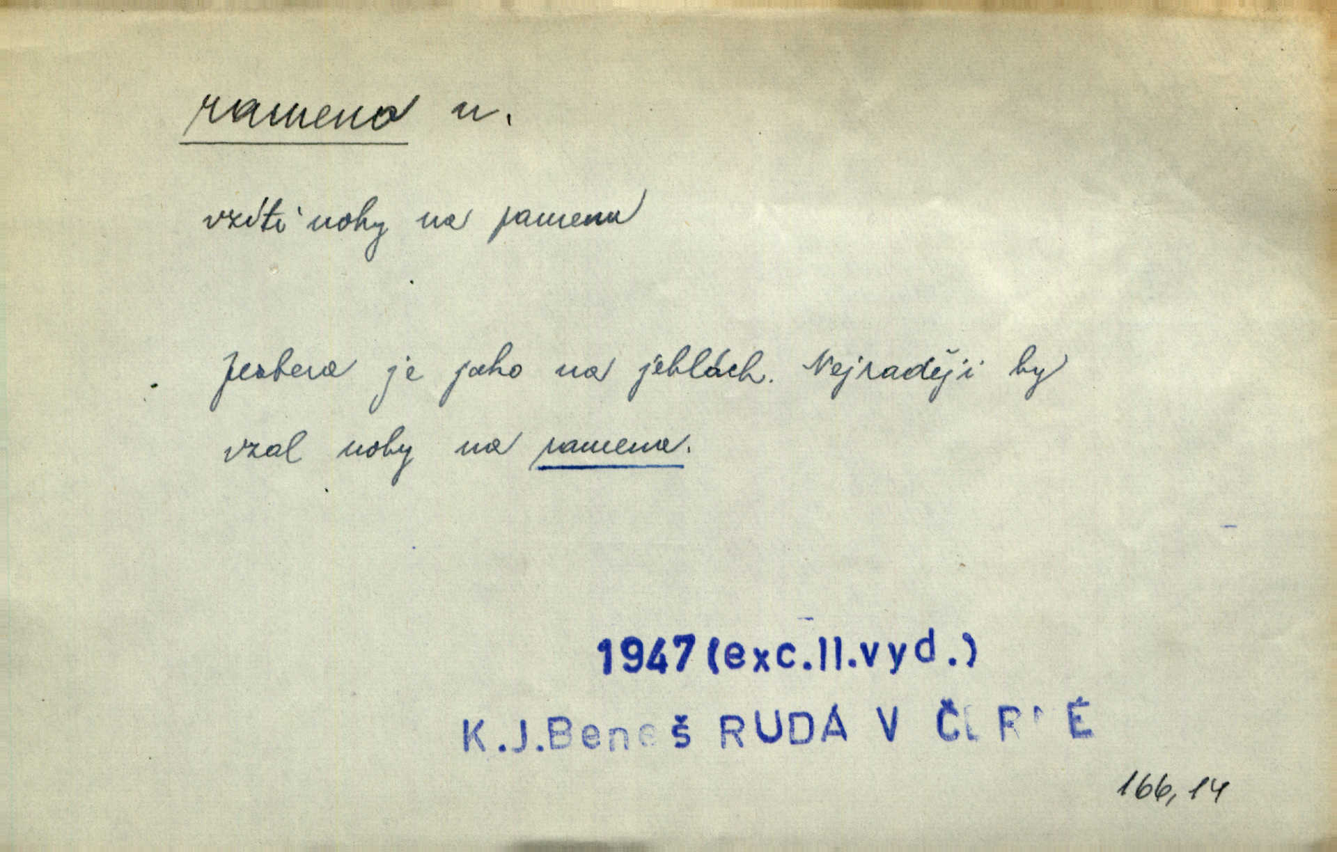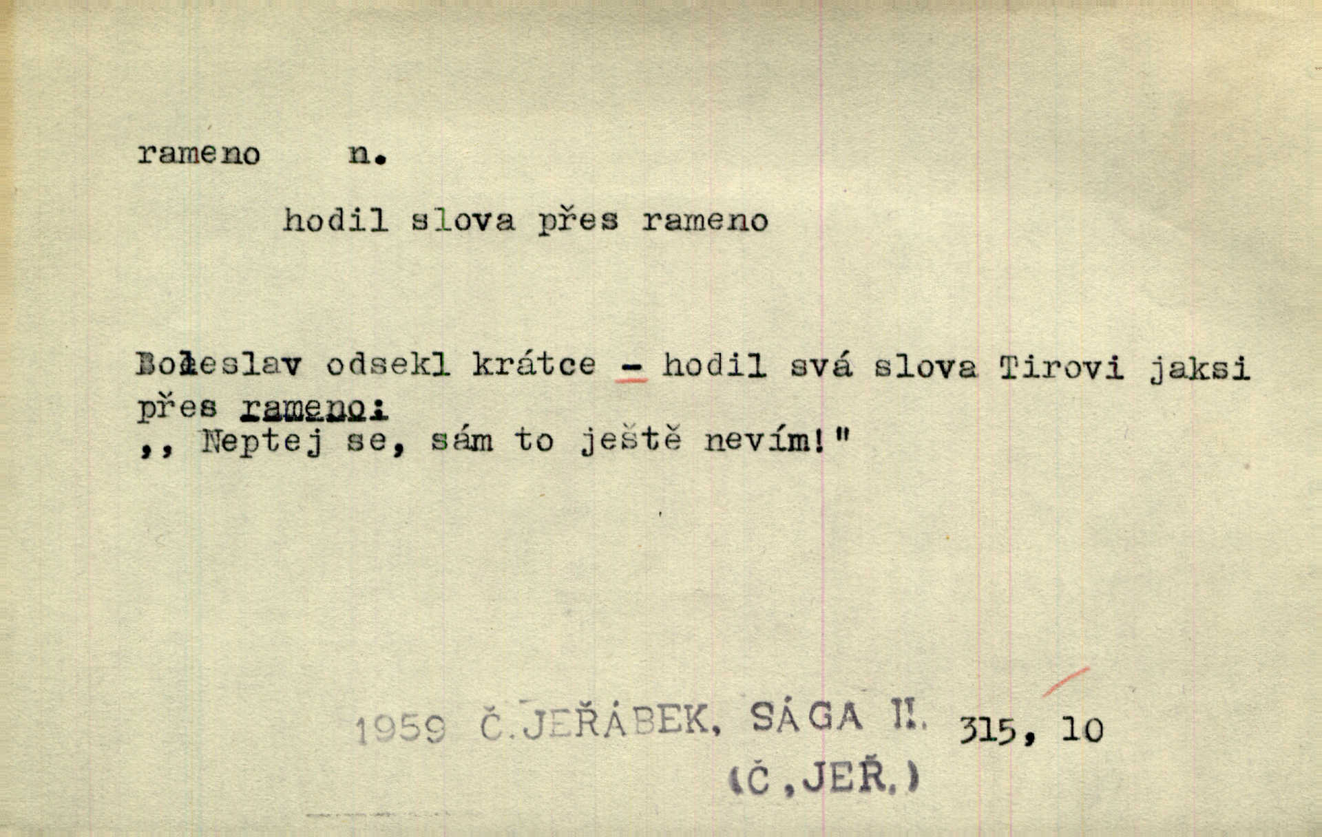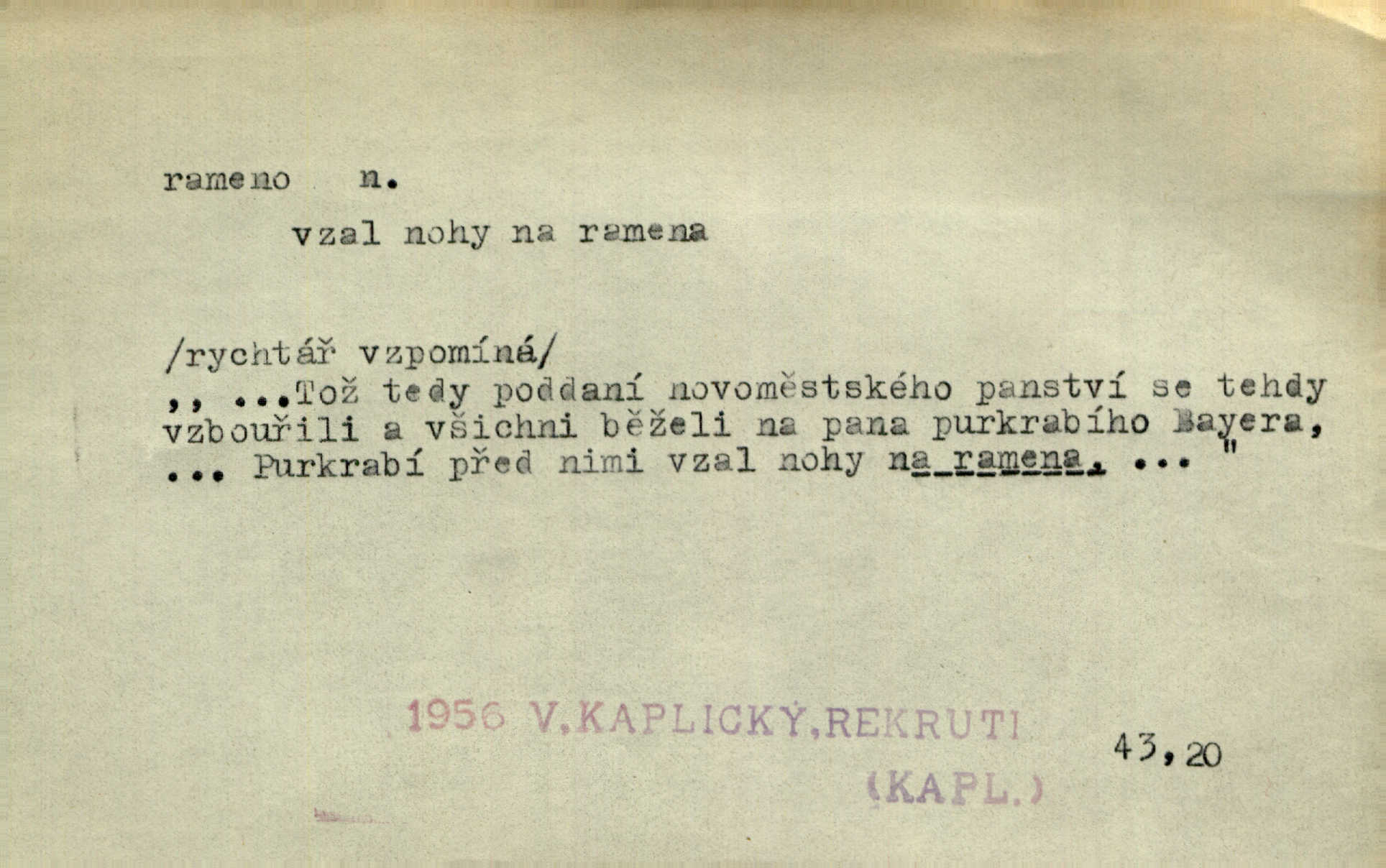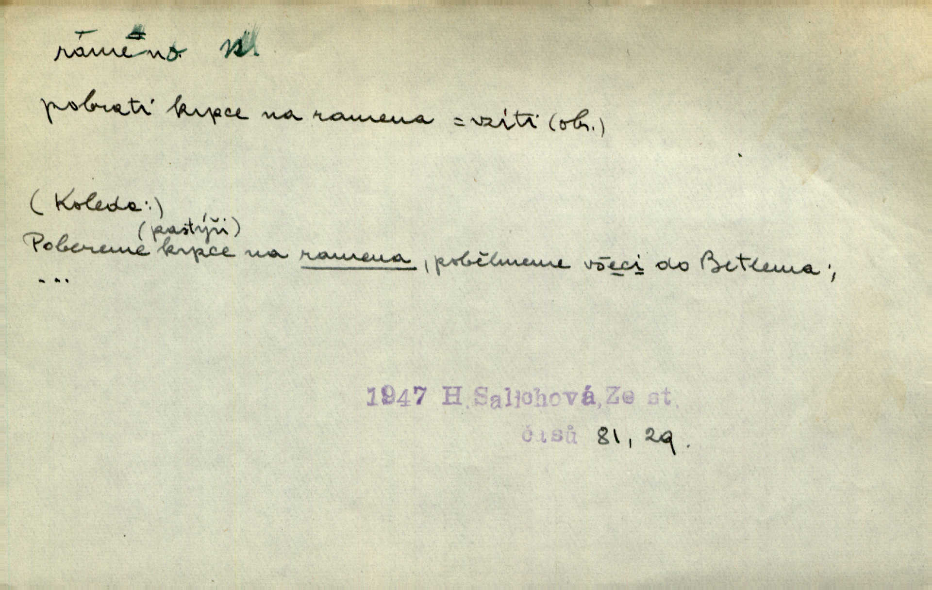 - rameno, -a n., zast. a bás. rámě, -ene n. (2. pl. ramen; 6. pl. ramenech; v ust. spoj. též u ramenou, na ramenou a p.) horní postranní část těla tvořená kloubem a kostí ramenní. [Myslivec] přehodil pušku přes rameno a šel. Něm. Položila si hlavu na slečnino rámě, jako by u ní pomoci hledala. Preis. Potěšil byl velký, hlavy trochu k levému rameni přikloněné. Rais. Tatík, hrabici maje na ramenou, upocen kolébal se po mezi. Rais. Plaid visel mu v dlouhých řasách s ramena na zem. Zey. Vzal nohy na ramena dal se na útěk. Herb. Na Anežku obě sestry hleděly přes rameno pohrdavě. Herb. [Snad není nikdo] tak cynický, aby pokrčil rameny nad osudem vlastního národa projevil lhostejnost. Týd. rozhl. Přen. A na tvých [Šumavy] hrdých ramenech plášť blýská se ti bílý. Heyd. Voj. na rámě — zbraň! (povel). D horní lidská končetina, zvláště její část odshora k lokti. Marně po tobě jsem vzpínal rámě. Rok. Zřím časem, skolébaný v dumy snivé, jak nahé, plné rameno se míhá. Vrch. Ó že jsem sláb a stár a rámě mé již nemůž rázně meče pozdvihnout! Krás. Simáková v ten strastný čas dala se obtáčeti ramenem Vejvodovým. Šmil. Nabídl jí rámě, Nanynka se zavěsila. Herrm. Byl to mladík podobný, že by každá se zalíbením mu rámě podala vdala se za něho. Jir. Pod cizím jménem potuloval se po Táborsku a ukrýval se před ramenem spravedlnosti před četníkem. Staš. Strážník hrozil [ohněstrůjci] zatčením, což by bývalo velmi těžko, ježto sebe delší rámě bezpečnosti nedosáhlo přes hradbu. Čap. Ch. První, kdož na sobě pocítili trestající rámě církve, byli Albigensové. Čech. Nepřítele strážce tvého, Bohše nelítostivého Boží rámě schvátilo Bůh. Macháč. Ty [Bůh] dobrému králi stále rameno své mocné přej! ochranu. Čel. Práv. rameno světské pomoc úřadů světských úřadům církevním, bracchium saeculare. Zool. první základní část přední okončiny obratlovců (mimo ryby). D rameno část něčeho do strany vybíhající. Uvidělo [slunce] lid shromážděný u kostela, jak na kolenou klečí pod rozpjatými rameny dřevěného kříže. A. Mrš. Ramena bronzových lustrů vykvétala v květinové kalichy ze skla perleťového. Herrm. Pod starou pláničkou se široce rozloženými rameny větví páslo děvče v modré pruhované sukni husy. R. Svob. Křižování aut na vjezdových a výjezdových ramenech nebude na závadu. Techn. obz. Úzkou uličkou dáme se nyní podél ramena Vltavy. Pfleg. Tak dostali se k nějaké tůni v hluboké prorvě, snad v mrtvém rameni starého řečiště. Jir. Geol. rameno vrásy jedna ze stran omezujících vrásu. Stav. rameno schodů část přímočarého schodiště, která vede v jednom směru. Vodár. rameno sestupné klesající část násoskového spojení vodárenských studní. D štíhlá, podlouhlá součást stroje n. jiného zařízení, upevněná na jednom n. i na obou koncích. Stroj. rameno jeřábu, semaforu, regulátoru, šicího stroje a pod.; rameno otočné, sklápěcí, kladivové a j.; rameno kola paprsek, špice. D Geom. jedna ze dvou stejně dlouhých stran v trojúhelníku rovnoramenném; rameno úhlu polopaprsek odchýlený od druhého polopaprsku o určitý úhel; jedna z obou různoběžných stran v lichoběžníku. Fys. rameno síly kolmá vzdálenost působiště síly od těžiště.