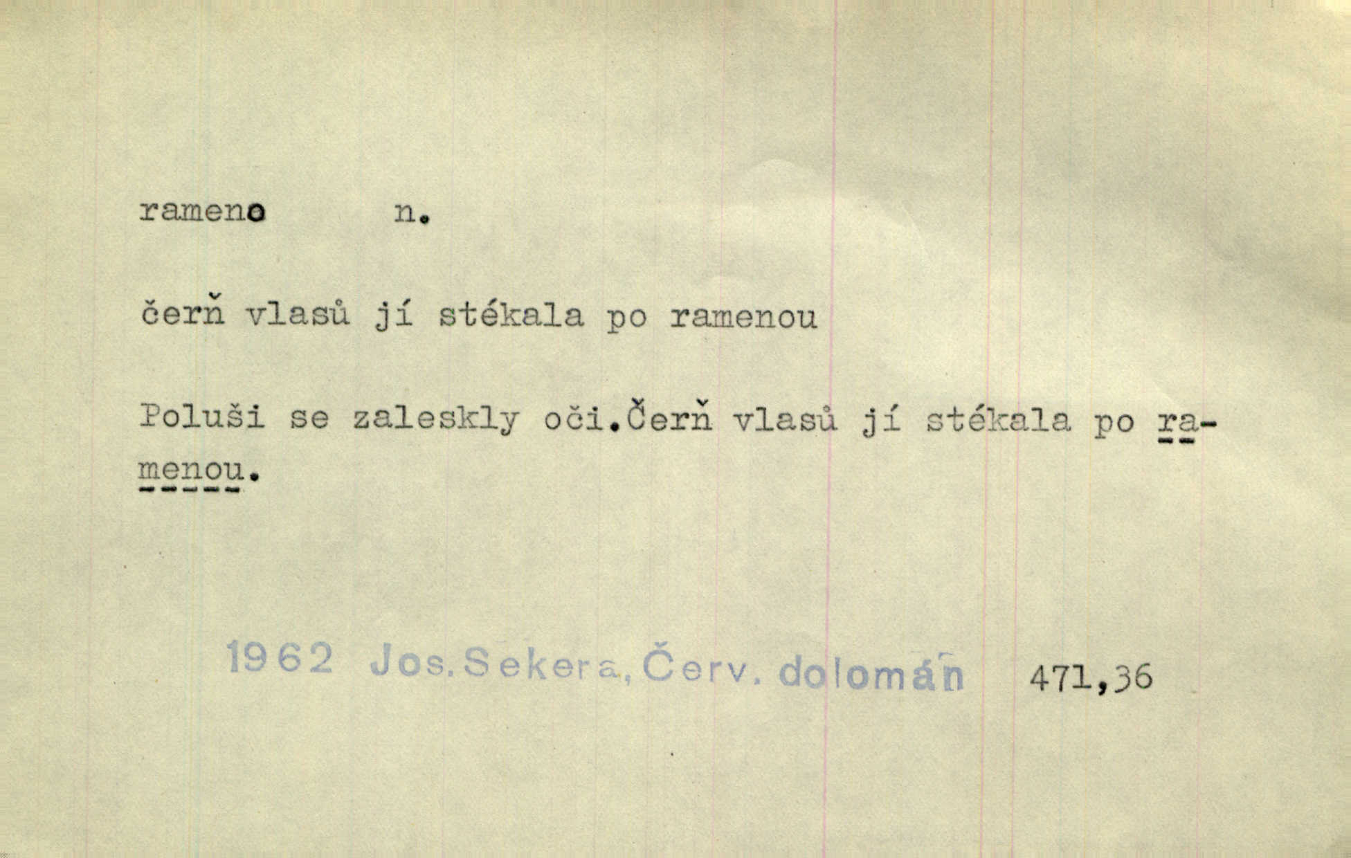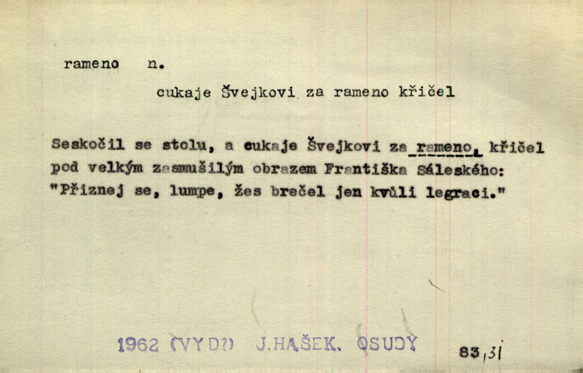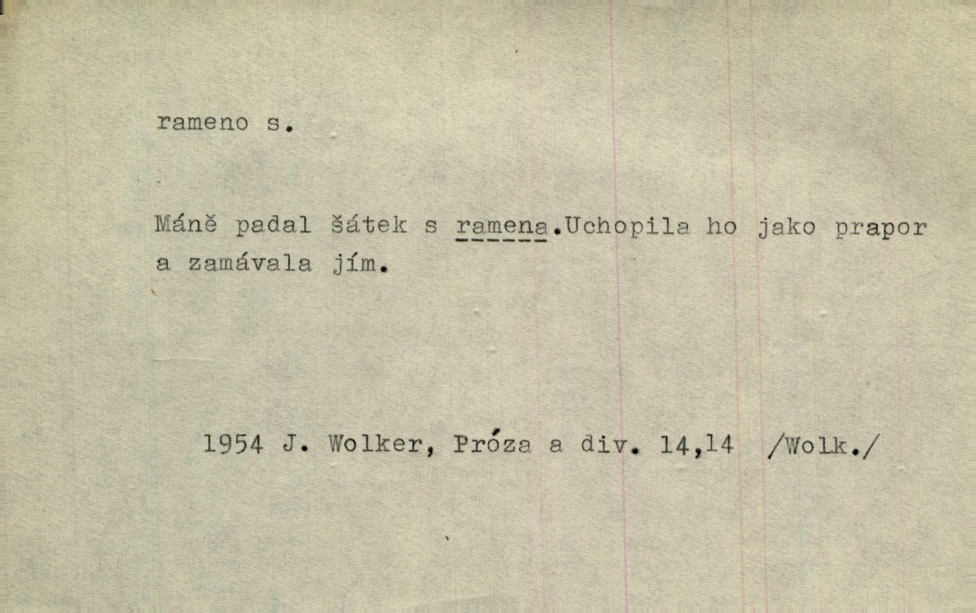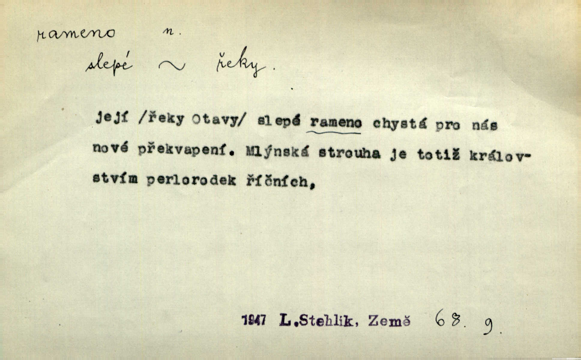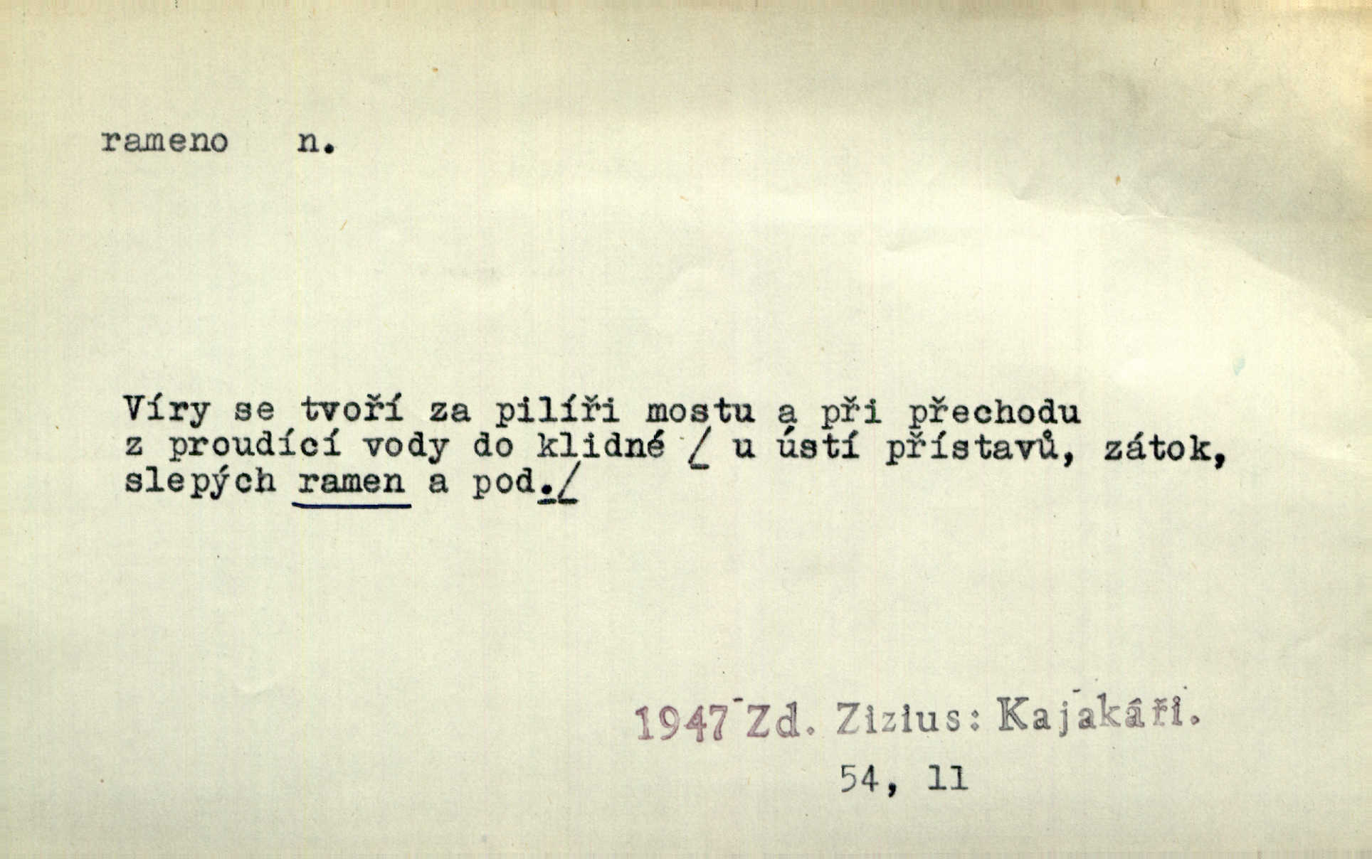 - rameno, -a n., zast. a bás. rámě, -ene n. (2. pl. ramen; 6. pl. ramenech; v ust. spoj. též u ramenou, na ramenou a p.) horní postranní část těla tvořená kloubem a kostí ramenní. [Myslivec] přehodil pušku přes rameno a šel. Něm. Položila si hlavu na slečnino rámě, jako by u ní pomoci hledala. Preis. Potěšil byl velký, hlavy trochu k levému rameni přikloněné. Rais. Tatík, hrabici maje na ramenou, upocen kolébal se po mezi. Rais. Plaid visel mu v dlouhých řasách s ramena na zem. Zey. Vzal nohy na ramena dal se na útěk. Herb. Na Anežku obě sestry hleděly přes rameno pohrdavě. Herb. [Snad není nikdo] tak cynický, aby pokrčil rameny nad osudem vlastního národa projevil lhostejnost. Týd. rozhl. Přen. A na tvých [Šumavy] hrdých ramenech plášť blýská se ti bílý. Heyd. Voj. na rámě — zbraň! (povel). D horní lidská končetina, zvláště její část odshora k lokti. Marně po tobě jsem vzpínal rámě. Rok. Zřím časem, skolébaný v dumy snivé, jak nahé, plné rameno se míhá. Vrch. Ó že jsem sláb a stár a rámě mé již nemůž rázně meče pozdvihnout! Krás. Simáková v ten strastný čas dala se obtáčeti ramenem Vejvodovým. Šmil. Nabídl jí rámě, Nanynka se zavěsila. Herrm. Byl to mladík podobný, že by každá se zalíbením mu rámě podala vdala se za něho. Jir. Pod cizím jménem potuloval se po Táborsku a ukrýval se před ramenem spravedlnosti před četníkem. Staš. Strážník hrozil [ohněstrůjci] zatčením, což by bývalo velmi těžko, ježto sebe delší rámě bezpečnosti nedosáhlo přes hradbu. Čap. Ch. První, kdož na sobě pocítili trestající rámě církve, byli Albigensové. Čech. Nepřítele strážce tvého, Bohše nelítostivého Boží rámě schvátilo Bůh. Macháč. Ty [Bůh] dobrému králi stále rameno své mocné přej! ochranu. Čel. Práv. rameno světské pomoc úřadů světských úřadům církevním, bracchium saeculare. Zool. první základní část přední okončiny obratlovců (mimo ryby). D rameno část něčeho do strany vybíhající. Uvidělo [slunce] lid shromážděný u kostela, jak na kolenou klečí pod rozpjatými rameny dřevěného kříže. A. Mrš. Ramena bronzových lustrů vykvétala v květinové kalichy ze skla perleťového. Herrm. Pod starou pláničkou se široce rozloženými rameny větví páslo děvče v modré pruhované sukni husy. R. Svob. Křižování aut na vjezdových a výjezdových ramenech nebude na závadu. Techn. obz. Úzkou uličkou dáme se nyní podél ramena Vltavy. Pfleg. Tak dostali se k nějaké tůni v hluboké prorvě, snad v mrtvém rameni starého řečiště. Jir. Geol. rameno vrásy jedna ze stran omezujících vrásu. Stav. rameno schodů část přímočarého schodiště, která vede v jednom směru. Vodár. rameno sestupné klesající část násoskového spojení vodárenských studní. D štíhlá, podlouhlá součást stroje n. jiného zařízení, upevněná na jednom n. i na obou koncích. Stroj. rameno jeřábu, semaforu, regulátoru, šicího stroje a pod.; rameno otočné, sklápěcí, kladivové a j.; rameno kola paprsek, špice. D Geom. jedna ze dvou stejně dlouhých stran v trojúhelníku rovnoramenném; rameno úhlu polopaprsek odchýlený od druhého polopaprsku o určitý úhel; jedna z obou různoběžných stran v lichoběžníku. Fys. rameno síly kolmá vzdálenost působiště síly od těžiště.