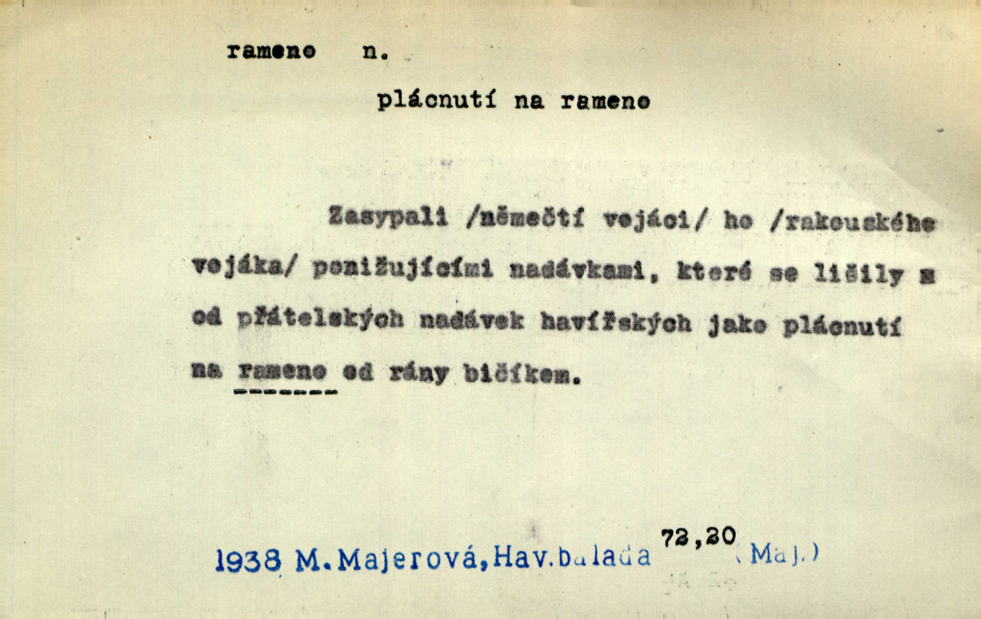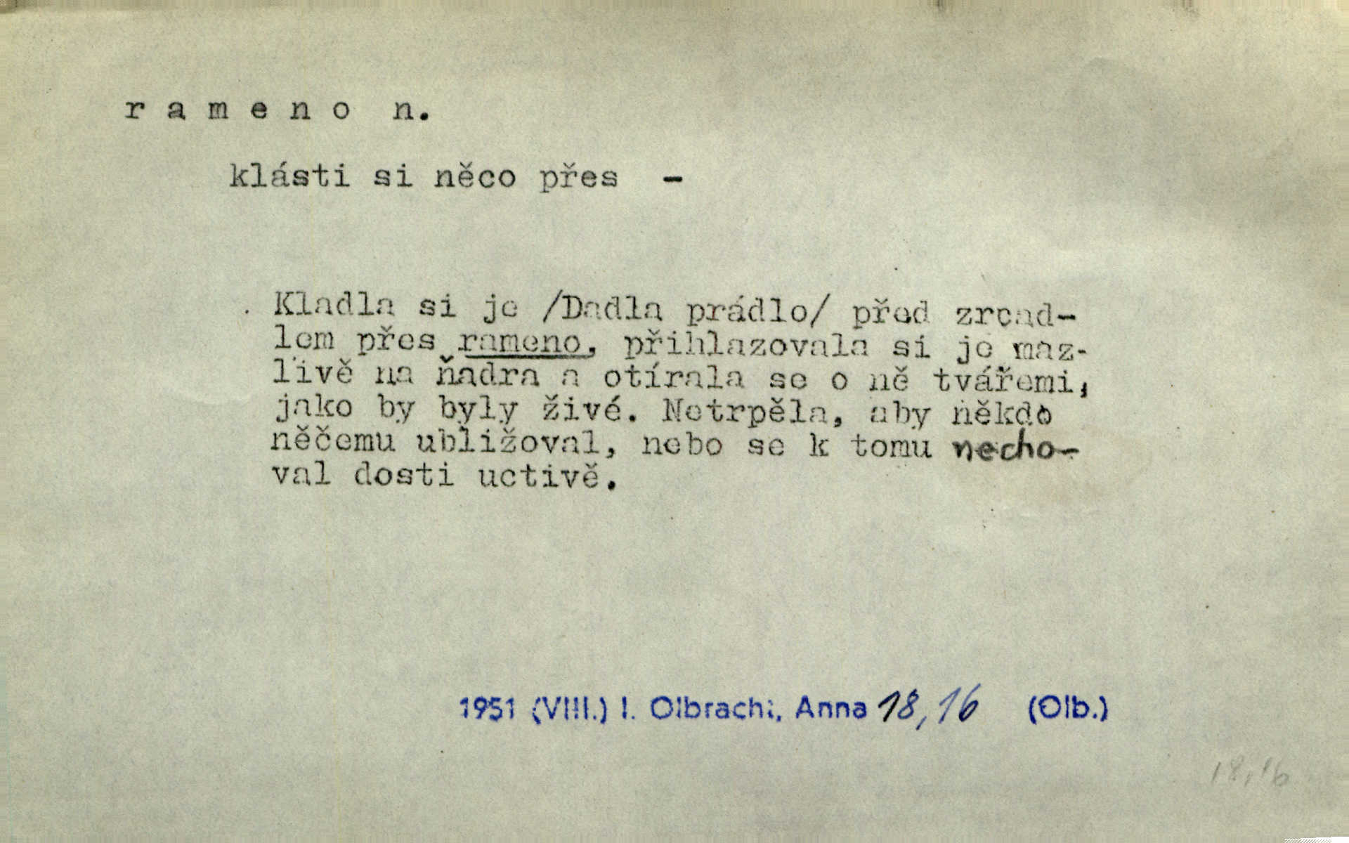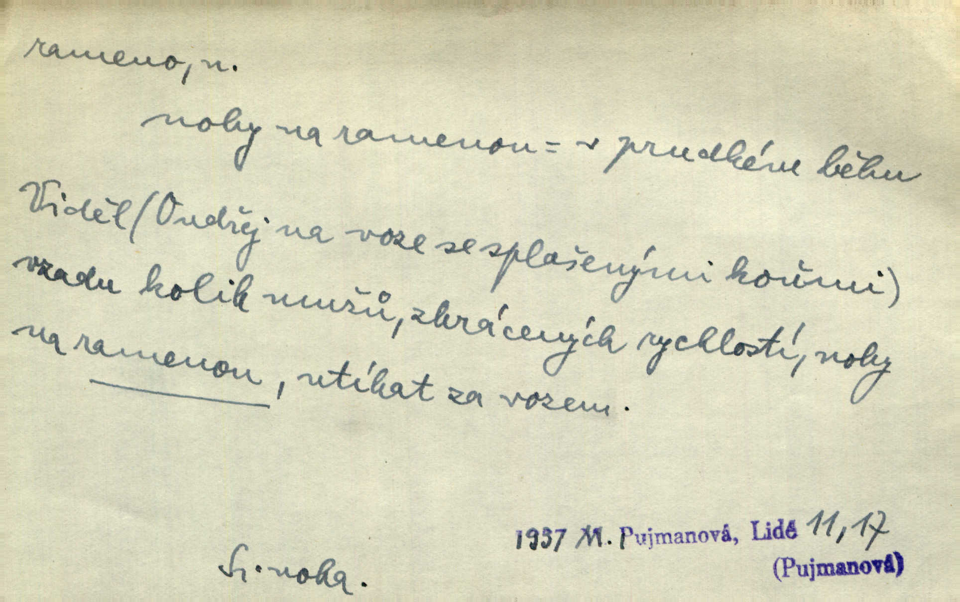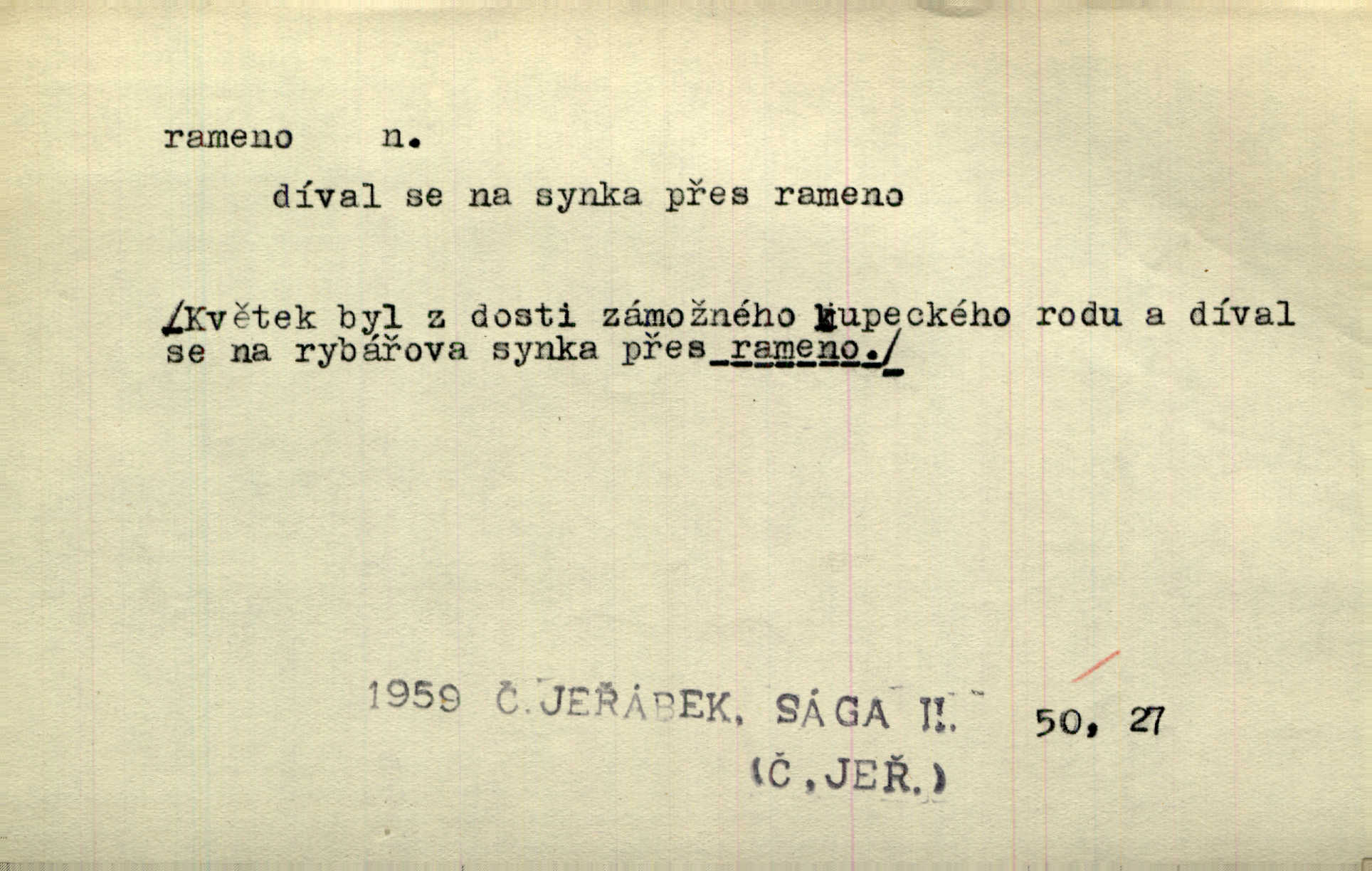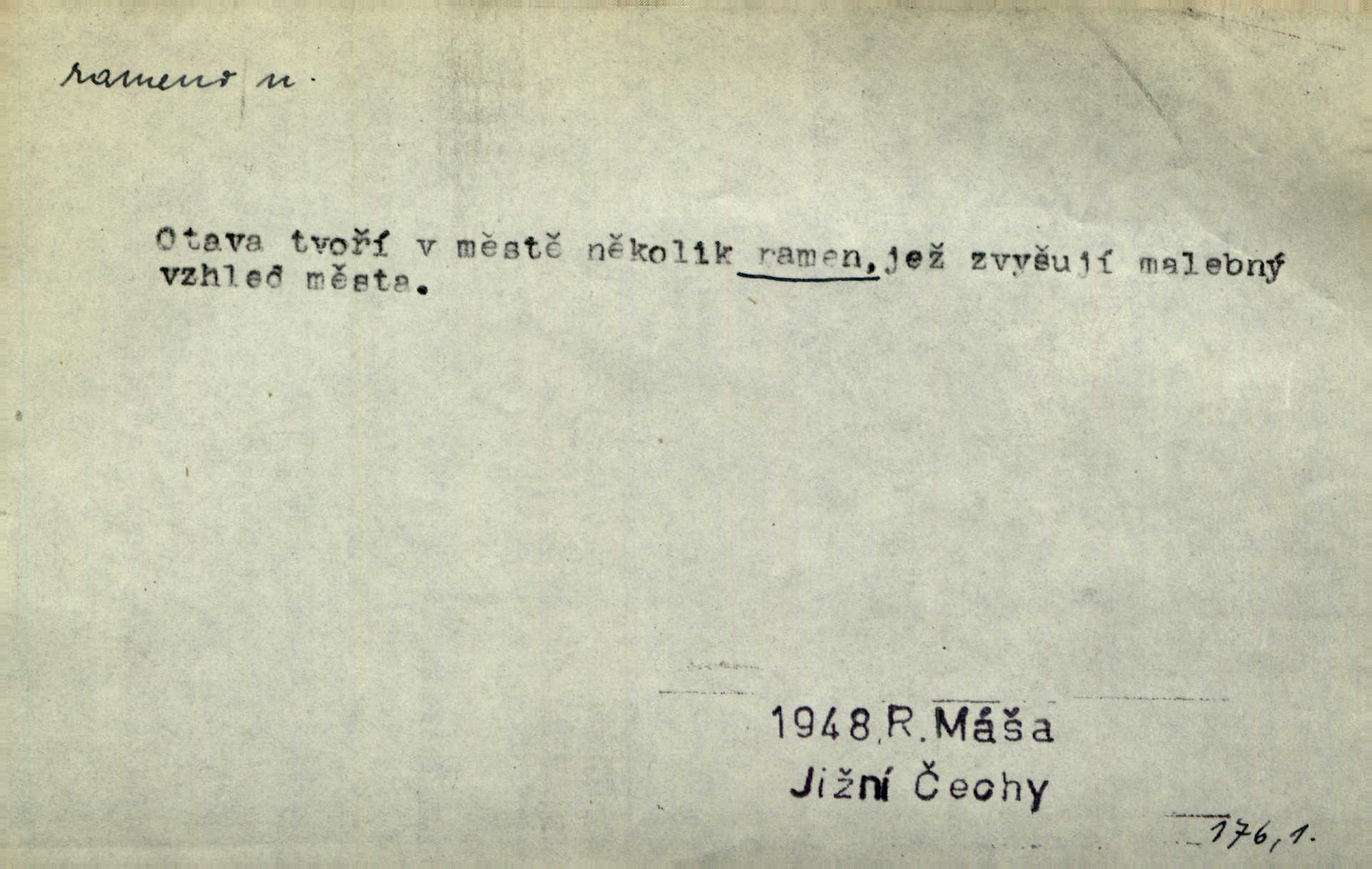 - rameno, -a n., zast. a bás. rámě, -ene n. (2. pl. ramen; 6. pl. ramenech; v ust. spoj. též u ramenou, na ramenou a p.) horní postranní část těla tvořená kloubem a kostí ramenní. [Myslivec] přehodil pušku přes rameno a šel. Něm. Položila si hlavu na slečnino rámě, jako by u ní pomoci hledala. Preis. Potěšil byl velký, hlavy trochu k levému rameni přikloněné. Rais. Tatík, hrabici maje na ramenou, upocen kolébal se po mezi. Rais. Plaid visel mu v dlouhých řasách s ramena na zem. Zey. Vzal nohy na ramena dal se na útěk. Herb. Na Anežku obě sestry hleděly přes rameno pohrdavě. Herb. [Snad není nikdo] tak cynický, aby pokrčil rameny nad osudem vlastního národa projevil lhostejnost. Týd. rozhl. Přen. A na tvých [Šumavy] hrdých ramenech plášť blýská se ti bílý. Heyd. Voj. na rámě — zbraň! (povel). D horní lidská končetina, zvláště její část odshora k lokti. Marně po tobě jsem vzpínal rámě. Rok. Zřím časem, skolébaný v dumy snivé, jak nahé, plné rameno se míhá. Vrch. Ó že jsem sláb a stár a rámě mé již nemůž rázně meče pozdvihnout! Krás. Simáková v ten strastný čas dala se obtáčeti ramenem Vejvodovým. Šmil. Nabídl jí rámě, Nanynka se zavěsila. Herrm. Byl to mladík podobný, že by každá se zalíbením mu rámě podala vdala se za něho. Jir. Pod cizím jménem potuloval se po Táborsku a ukrýval se před ramenem spravedlnosti před četníkem. Staš. Strážník hrozil [ohněstrůjci] zatčením, což by bývalo velmi těžko, ježto sebe delší rámě bezpečnosti nedosáhlo přes hradbu. Čap. Ch. První, kdož na sobě pocítili trestající rámě církve, byli Albigensové. Čech. Nepřítele strážce tvého, Bohše nelítostivého Boží rámě schvátilo Bůh. Macháč. Ty [Bůh] dobrému králi stále rameno své mocné přej! ochranu. Čel. Práv. rameno světské pomoc úřadů světských úřadům církevním, bracchium saeculare. Zool. první základní část přední okončiny obratlovců (mimo ryby). D rameno část něčeho do strany vybíhající. Uvidělo [slunce] lid shromážděný u kostela, jak na kolenou klečí pod rozpjatými rameny dřevěného kříže. A. Mrš. Ramena bronzových lustrů vykvétala v květinové kalichy ze skla perleťového. Herrm. Pod starou pláničkou se široce rozloženými rameny větví páslo děvče v modré pruhované sukni husy. R. Svob. Křižování aut na vjezdových a výjezdových ramenech nebude na závadu. Techn. obz. Úzkou uličkou dáme se nyní podél ramena Vltavy. Pfleg. Tak dostali se k nějaké tůni v hluboké prorvě, snad v mrtvém rameni starého řečiště. Jir. Geol. rameno vrásy jedna ze stran omezujících vrásu. Stav. rameno schodů část přímočarého schodiště, která vede v jednom směru. Vodár. rameno sestupné klesající část násoskového spojení vodárenských studní. D štíhlá, podlouhlá součást stroje n. jiného zařízení, upevněná na jednom n. i na obou koncích. Stroj. rameno jeřábu, semaforu, regulátoru, šicího stroje a pod.; rameno otočné, sklápěcí, kladivové a j.; rameno kola paprsek, špice. D Geom. jedna ze dvou stejně dlouhých stran v trojúhelníku rovnoramenném; rameno úhlu polopaprsek odchýlený od druhého polopaprsku o určitý úhel; jedna z obou různoběžných stran v lichoběžníku. Fys. rameno síly kolmá vzdálenost působiště síly od těžiště.