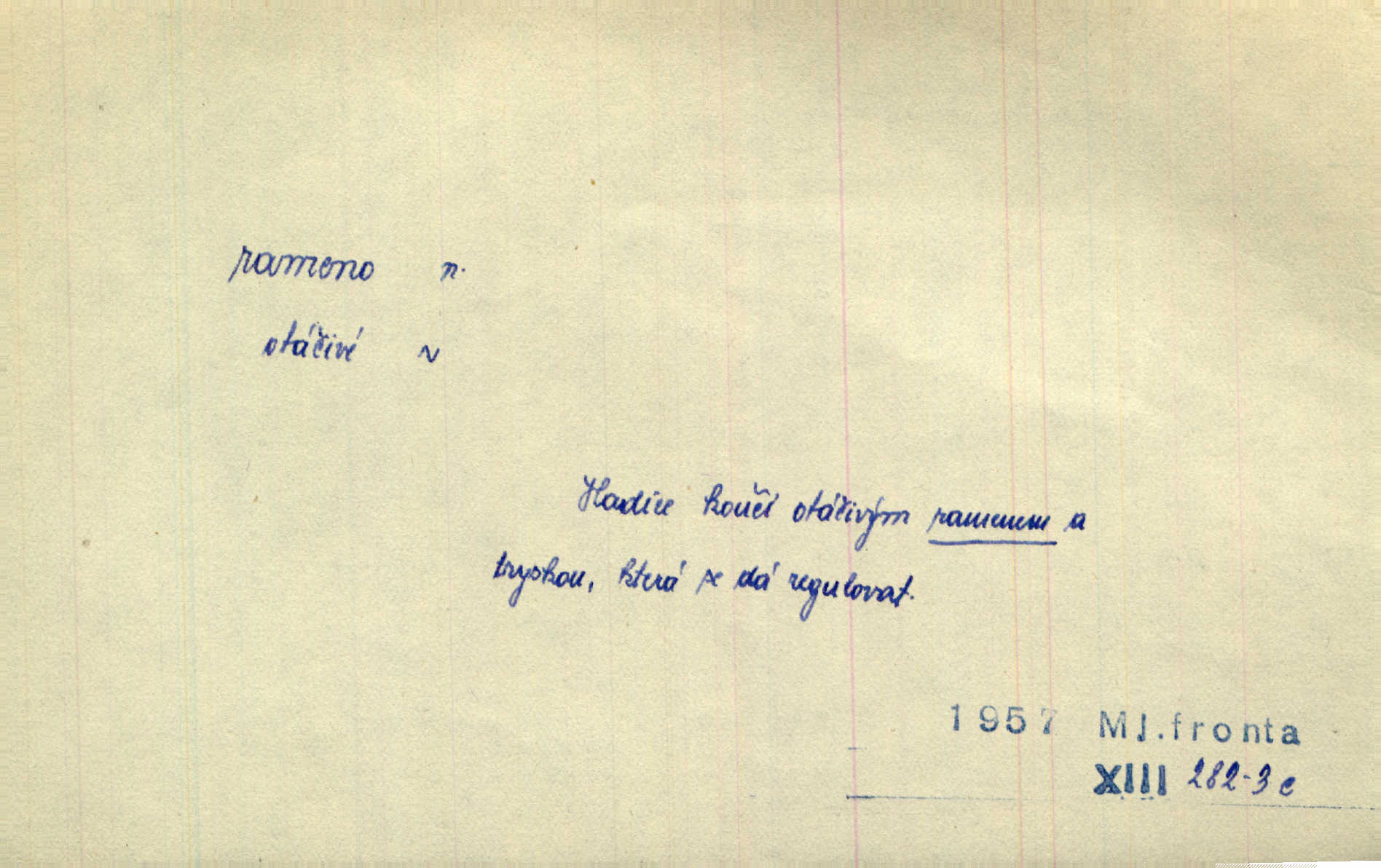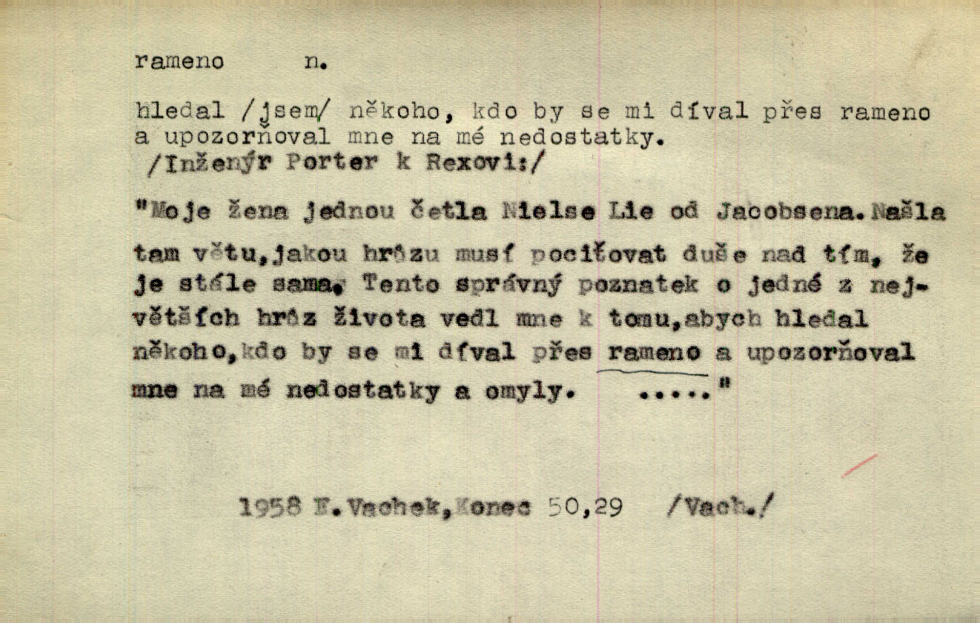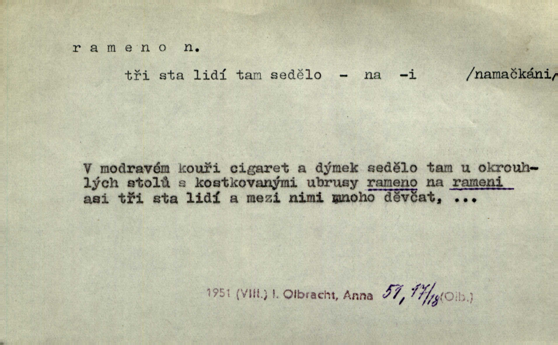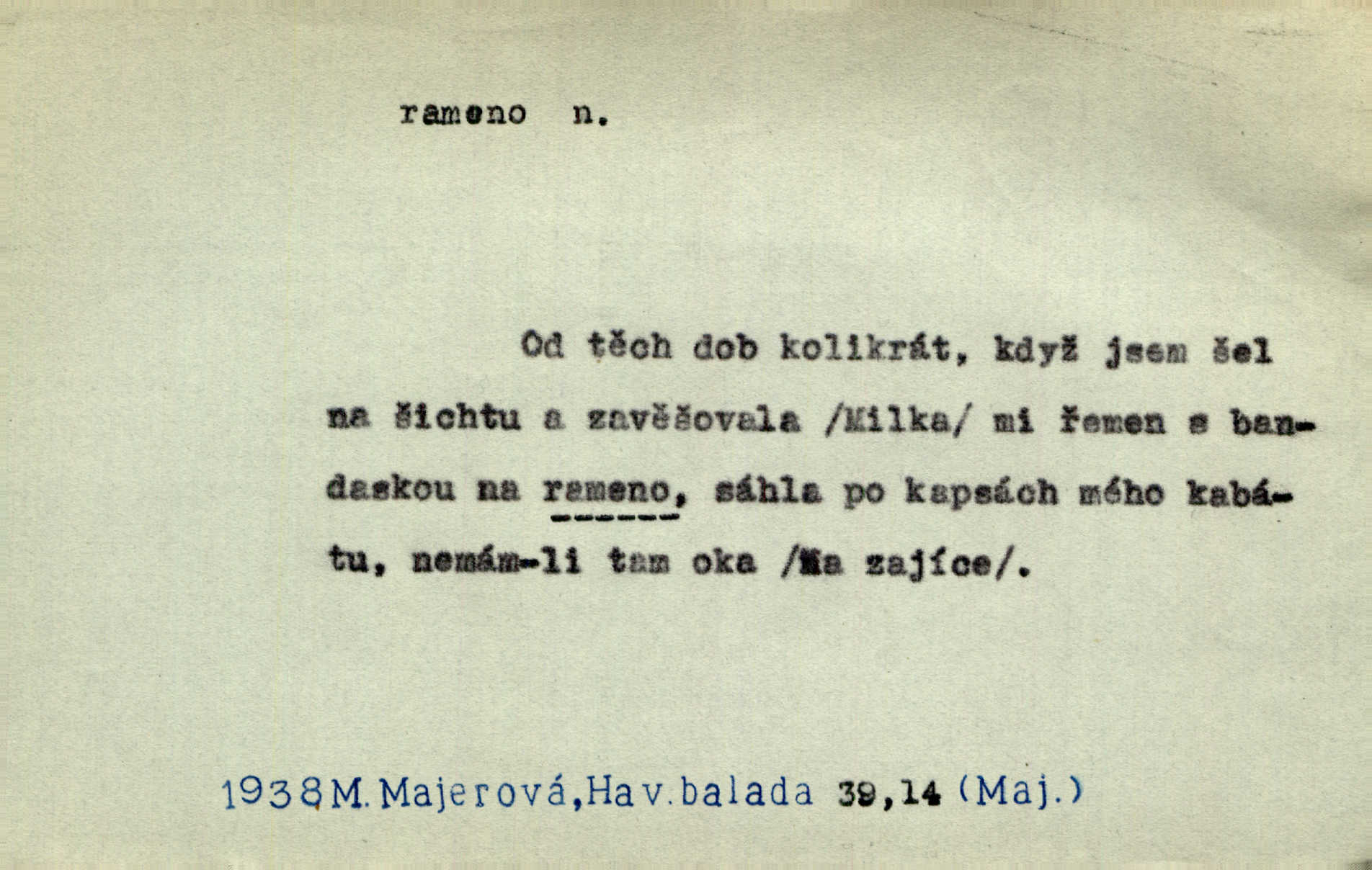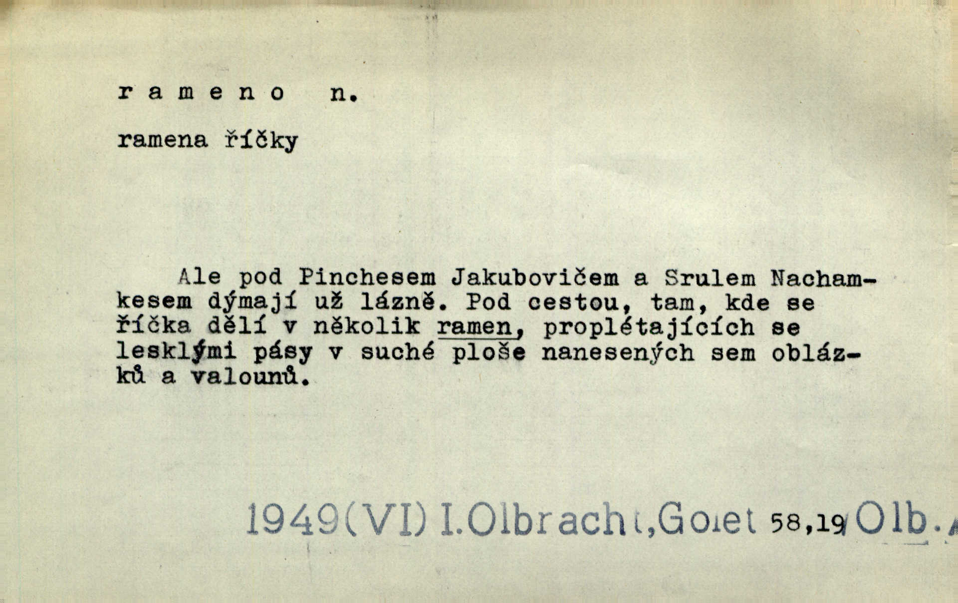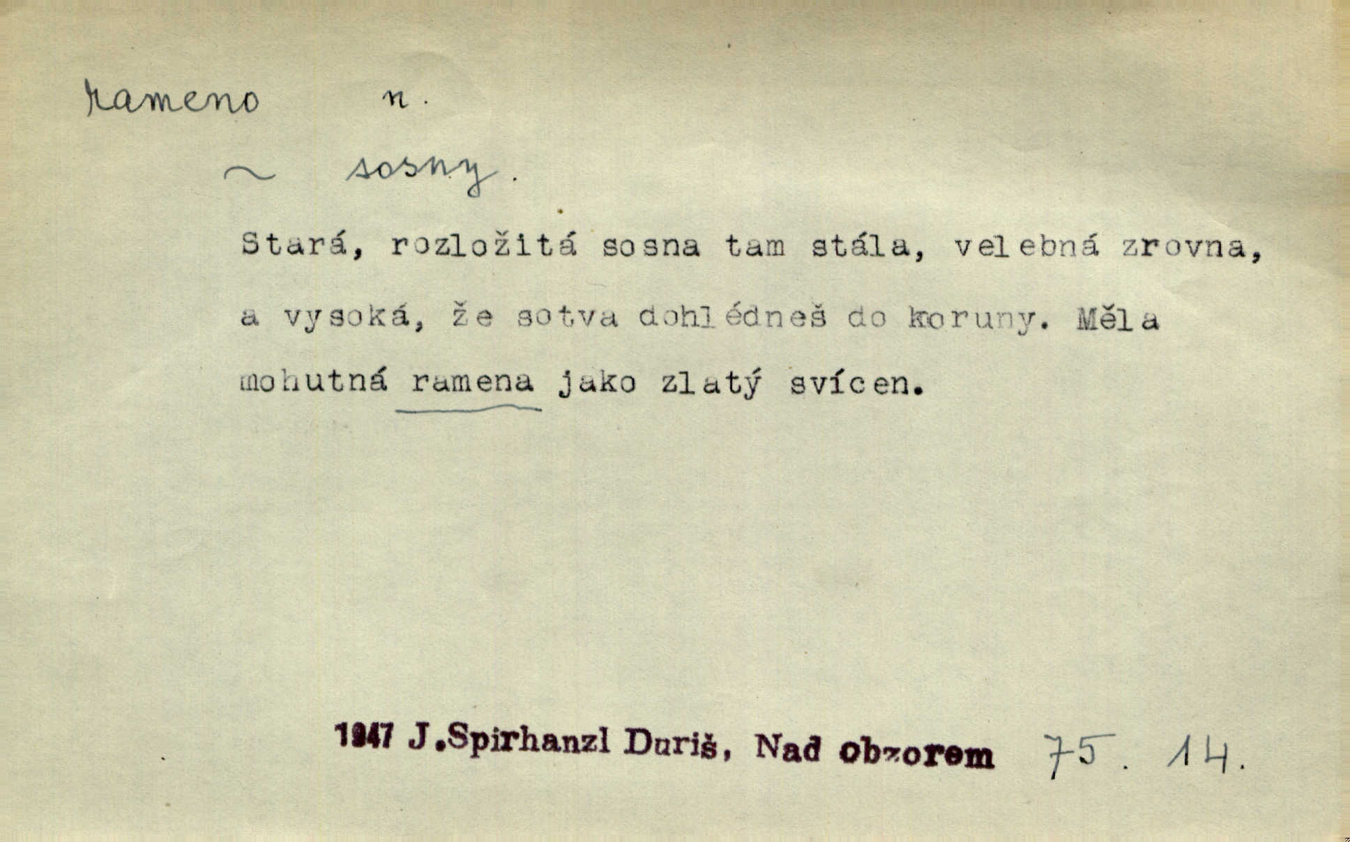 - rameno, -a n., zast. a bás. rámě, -ene n. (2. pl. ramen; 6. pl. ramenech; v ust. spoj. též u ramenou, na ramenou a p.) horní postranní část těla tvořená kloubem a kostí ramenní. [Myslivec] přehodil pušku přes rameno a šel. Něm. Položila si hlavu na slečnino rámě, jako by u ní pomoci hledala. Preis. Potěšil byl velký, hlavy trochu k levému rameni přikloněné. Rais. Tatík, hrabici maje na ramenou, upocen kolébal se po mezi. Rais. Plaid visel mu v dlouhých řasách s ramena na zem. Zey. Vzal nohy na ramena dal se na útěk. Herb. Na Anežku obě sestry hleděly přes rameno pohrdavě. Herb. [Snad není nikdo] tak cynický, aby pokrčil rameny nad osudem vlastního národa projevil lhostejnost. Týd. rozhl. Přen. A na tvých [Šumavy] hrdých ramenech plášť blýská se ti bílý. Heyd. Voj. na rámě — zbraň! (povel). D horní lidská končetina, zvláště její část odshora k lokti. Marně po tobě jsem vzpínal rámě. Rok. Zřím časem, skolébaný v dumy snivé, jak nahé, plné rameno se míhá. Vrch. Ó že jsem sláb a stár a rámě mé již nemůž rázně meče pozdvihnout! Krás. Simáková v ten strastný čas dala se obtáčeti ramenem Vejvodovým. Šmil. Nabídl jí rámě, Nanynka se zavěsila. Herrm. Byl to mladík podobný, že by každá se zalíbením mu rámě podala vdala se za něho. Jir. Pod cizím jménem potuloval se po Táborsku a ukrýval se před ramenem spravedlnosti před četníkem. Staš. Strážník hrozil [ohněstrůjci] zatčením, což by bývalo velmi těžko, ježto sebe delší rámě bezpečnosti nedosáhlo přes hradbu. Čap. Ch. První, kdož na sobě pocítili trestající rámě církve, byli Albigensové. Čech. Nepřítele strážce tvého, Bohše nelítostivého Boží rámě schvátilo Bůh. Macháč. Ty [Bůh] dobrému králi stále rameno své mocné přej! ochranu. Čel. Práv. rameno světské pomoc úřadů světských úřadům církevním, bracchium saeculare. Zool. první základní část přední okončiny obratlovců (mimo ryby). D rameno část něčeho do strany vybíhající. Uvidělo [slunce] lid shromážděný u kostela, jak na kolenou klečí pod rozpjatými rameny dřevěného kříže. A. Mrš. Ramena bronzových lustrů vykvétala v květinové kalichy ze skla perleťového. Herrm. Pod starou pláničkou se široce rozloženými rameny větví páslo děvče v modré pruhované sukni husy. R. Svob. Křižování aut na vjezdových a výjezdových ramenech nebude na závadu. Techn. obz. Úzkou uličkou dáme se nyní podél ramena Vltavy. Pfleg. Tak dostali se k nějaké tůni v hluboké prorvě, snad v mrtvém rameni starého řečiště. Jir. Geol. rameno vrásy jedna ze stran omezujících vrásu. Stav. rameno schodů část přímočarého schodiště, která vede v jednom směru. Vodár. rameno sestupné klesající část násoskového spojení vodárenských studní. D štíhlá, podlouhlá součást stroje n. jiného zařízení, upevněná na jednom n. i na obou koncích. Stroj. rameno jeřábu, semaforu, regulátoru, šicího stroje a pod.; rameno otočné, sklápěcí, kladivové a j.; rameno kola paprsek, špice. D Geom. jedna ze dvou stejně dlouhých stran v trojúhelníku rovnoramenném; rameno úhlu polopaprsek odchýlený od druhého polopaprsku o určitý úhel; jedna z obou různoběžných stran v lichoběžníku. Fys. rameno síly kolmá vzdálenost působiště síly od těžiště.