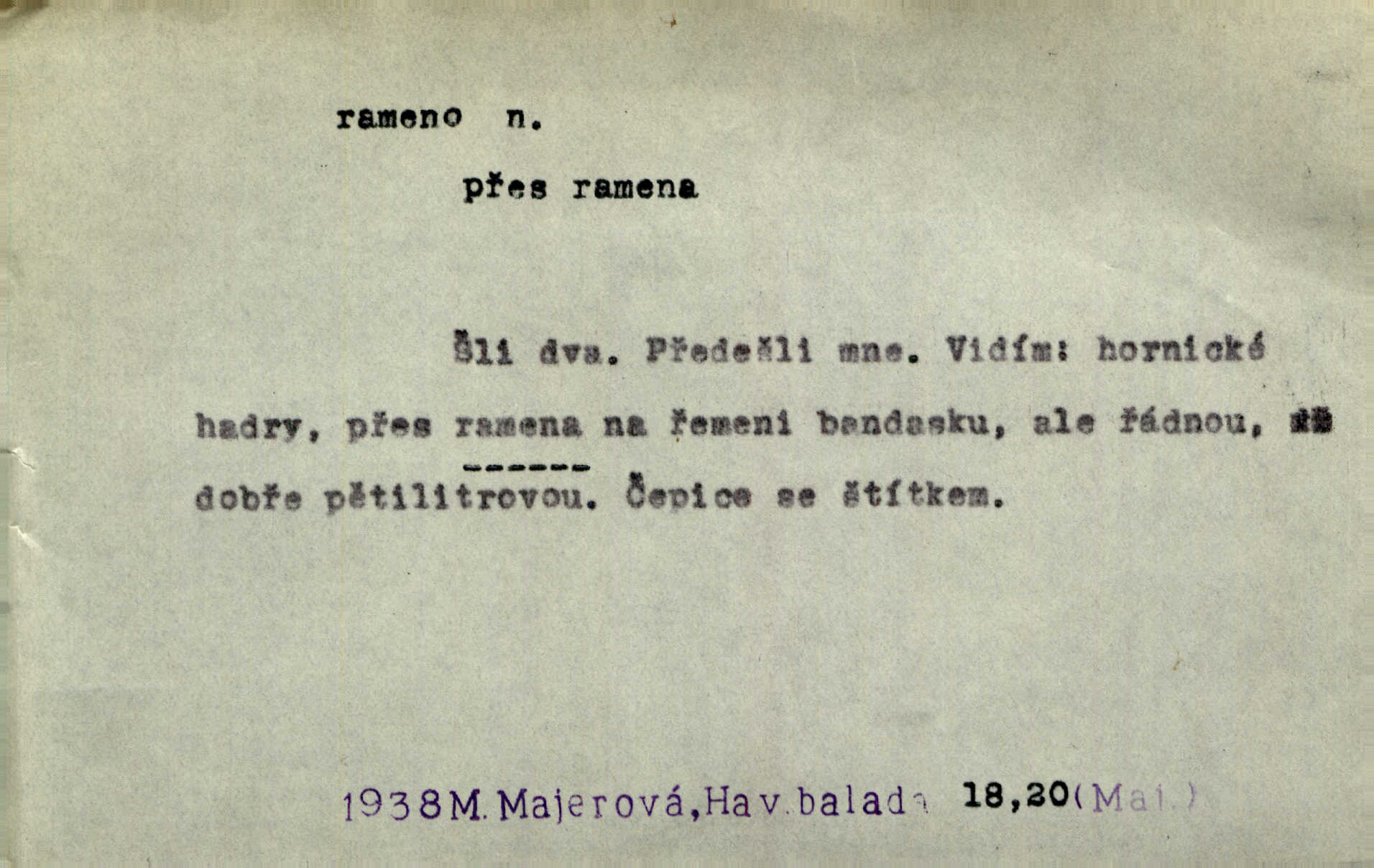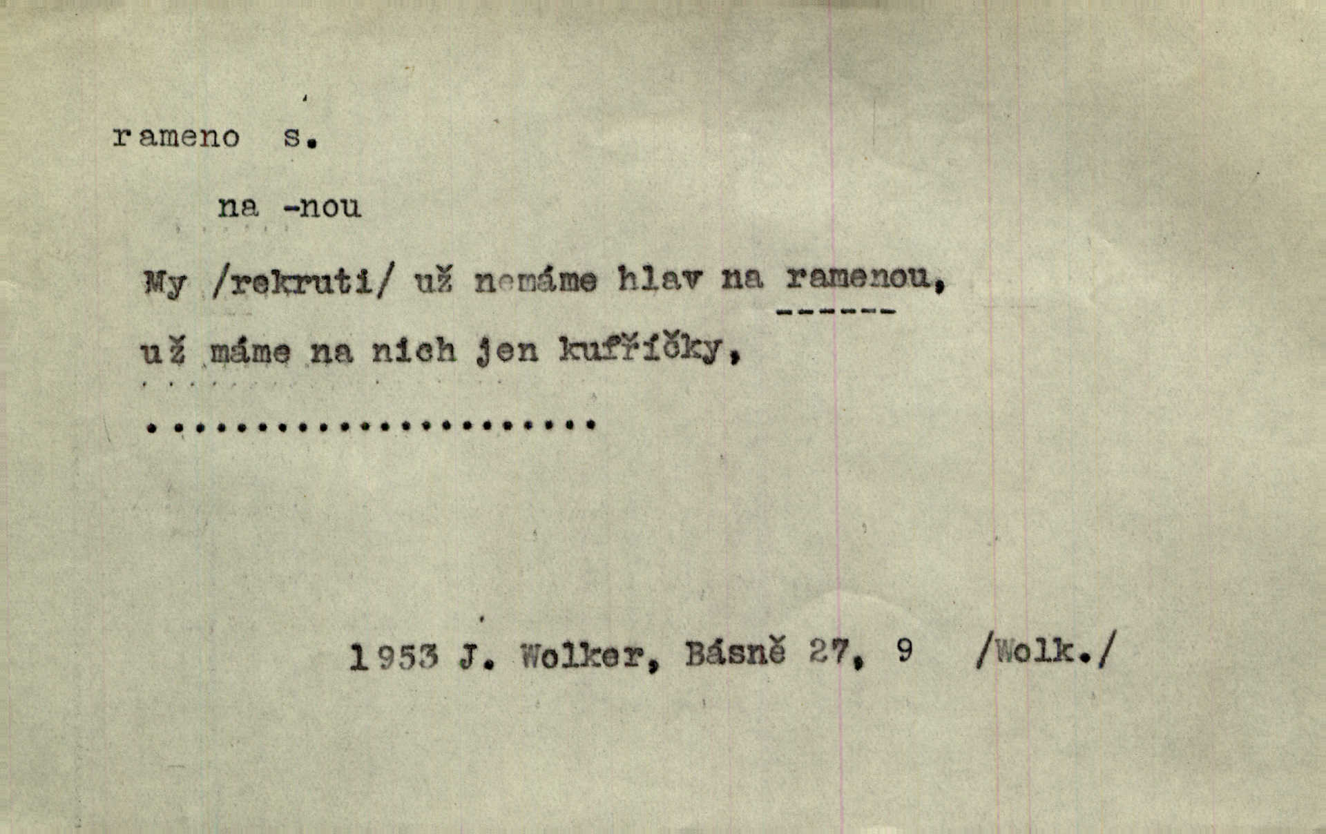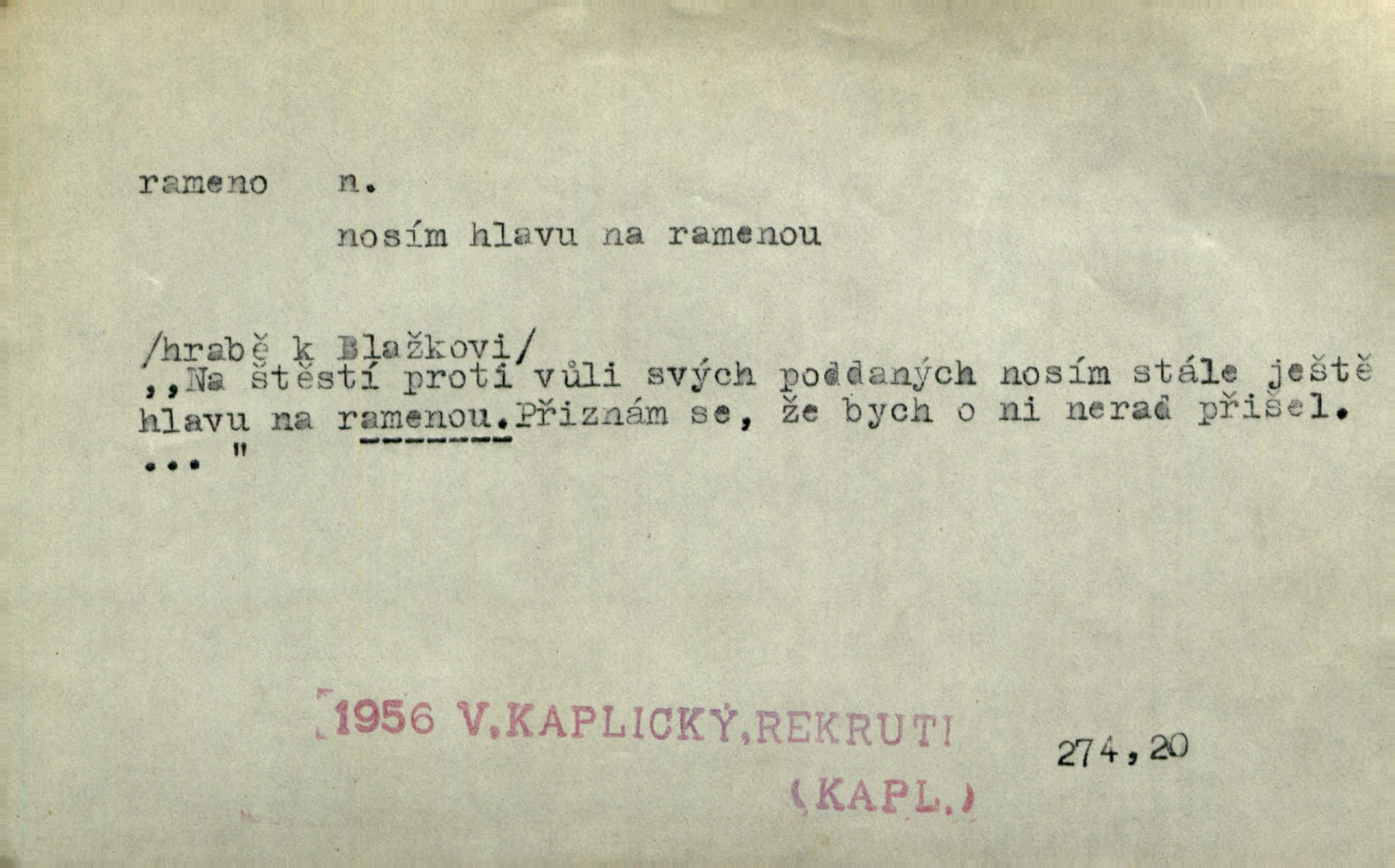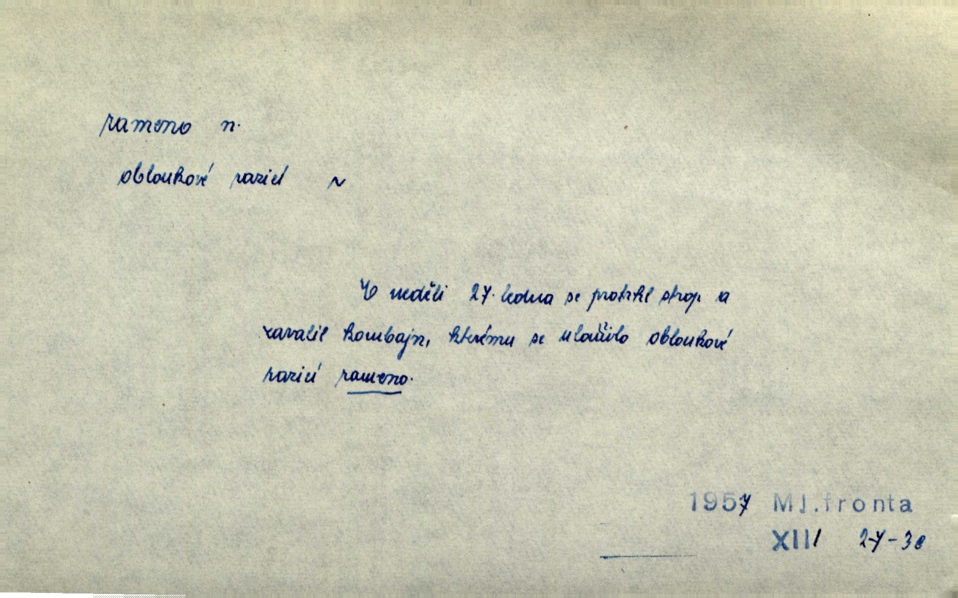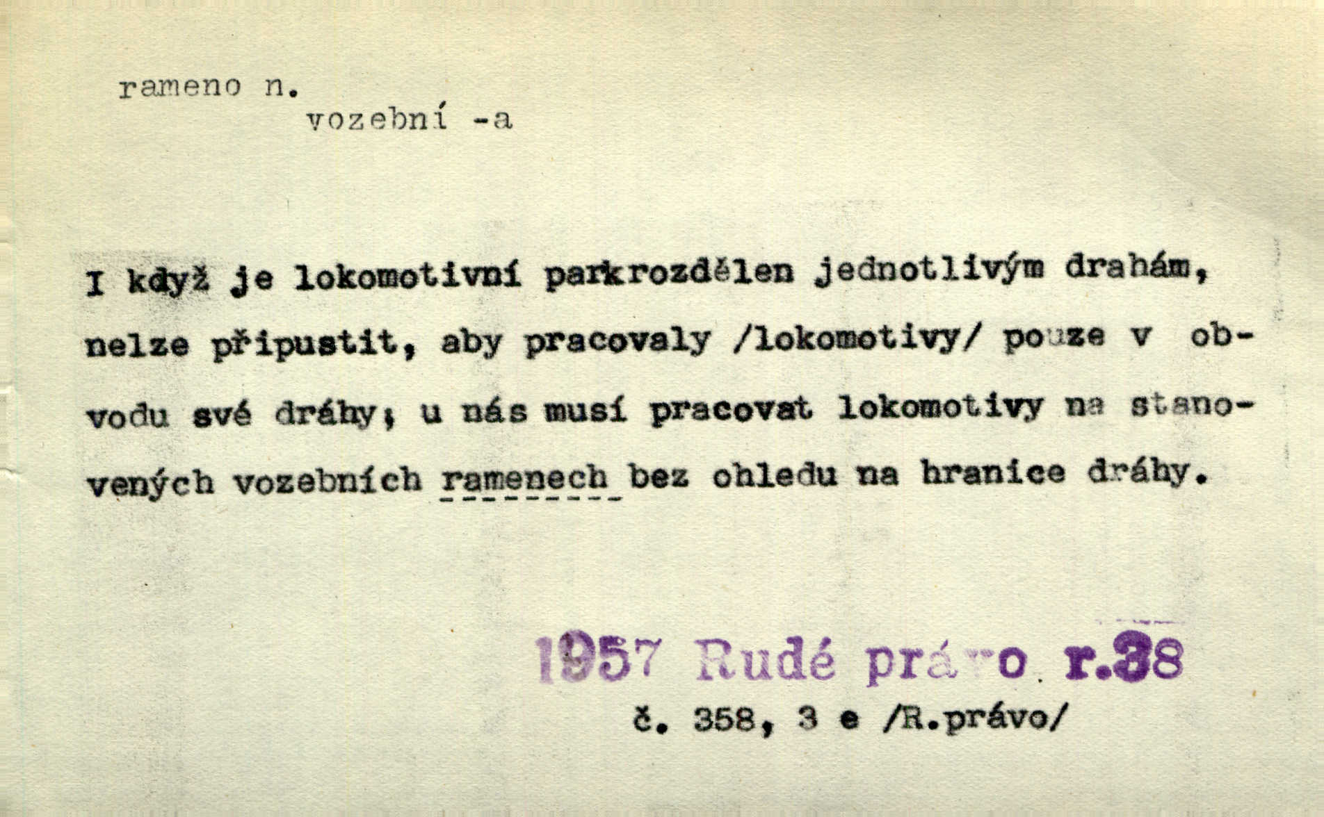 - rameno, -a n., zast. a bás. rámě, -ene n. (2. pl. ramen; 6. pl. ramenech; v ust. spoj. též u ramenou, na ramenou a p.) horní postranní část těla tvořená kloubem a kostí ramenní. [Myslivec] přehodil pušku přes rameno a šel. Něm. Položila si hlavu na slečnino rámě, jako by u ní pomoci hledala. Preis. Potěšil byl velký, hlavy trochu k levému rameni přikloněné. Rais. Tatík, hrabici maje na ramenou, upocen kolébal se po mezi. Rais. Plaid visel mu v dlouhých řasách s ramena na zem. Zey. Vzal nohy na ramena dal se na útěk. Herb. Na Anežku obě sestry hleděly přes rameno pohrdavě. Herb. [Snad není nikdo] tak cynický, aby pokrčil rameny nad osudem vlastního národa projevil lhostejnost. Týd. rozhl. Přen. A na tvých [Šumavy] hrdých ramenech plášť blýská se ti bílý. Heyd. Voj. na rámě — zbraň! (povel). D horní lidská končetina, zvláště její část odshora k lokti. Marně po tobě jsem vzpínal rámě. Rok. Zřím časem, skolébaný v dumy snivé, jak nahé, plné rameno se míhá. Vrch. Ó že jsem sláb a stár a rámě mé již nemůž rázně meče pozdvihnout! Krás. Simáková v ten strastný čas dala se obtáčeti ramenem Vejvodovým. Šmil. Nabídl jí rámě, Nanynka se zavěsila. Herrm. Byl to mladík podobný, že by každá se zalíbením mu rámě podala vdala se za něho. Jir. Pod cizím jménem potuloval se po Táborsku a ukrýval se před ramenem spravedlnosti před četníkem. Staš. Strážník hrozil [ohněstrůjci] zatčením, což by bývalo velmi těžko, ježto sebe delší rámě bezpečnosti nedosáhlo přes hradbu. Čap. Ch. První, kdož na sobě pocítili trestající rámě církve, byli Albigensové. Čech. Nepřítele strážce tvého, Bohše nelítostivého Boží rámě schvátilo Bůh. Macháč. Ty [Bůh] dobrému králi stále rameno své mocné přej! ochranu. Čel. Práv. rameno světské pomoc úřadů světských úřadům církevním, bracchium saeculare. Zool. první základní část přední okončiny obratlovců (mimo ryby). D rameno část něčeho do strany vybíhající. Uvidělo [slunce] lid shromážděný u kostela, jak na kolenou klečí pod rozpjatými rameny dřevěného kříže. A. Mrš. Ramena bronzových lustrů vykvétala v květinové kalichy ze skla perleťového. Herrm. Pod starou pláničkou se široce rozloženými rameny větví páslo děvče v modré pruhované sukni husy. R. Svob. Křižování aut na vjezdových a výjezdových ramenech nebude na závadu. Techn. obz. Úzkou uličkou dáme se nyní podél ramena Vltavy. Pfleg. Tak dostali se k nějaké tůni v hluboké prorvě, snad v mrtvém rameni starého řečiště. Jir. Geol. rameno vrásy jedna ze stran omezujících vrásu. Stav. rameno schodů část přímočarého schodiště, která vede v jednom směru. Vodár. rameno sestupné klesající část násoskového spojení vodárenských studní. D štíhlá, podlouhlá součást stroje n. jiného zařízení, upevněná na jednom n. i na obou koncích. Stroj. rameno jeřábu, semaforu, regulátoru, šicího stroje a pod.; rameno otočné, sklápěcí, kladivové a j.; rameno kola paprsek, špice. D Geom. jedna ze dvou stejně dlouhých stran v trojúhelníku rovnoramenném; rameno úhlu polopaprsek odchýlený od druhého polopaprsku o určitý úhel; jedna z obou různoběžných stran v lichoběžníku. Fys. rameno síly kolmá vzdálenost působiště síly od těžiště.