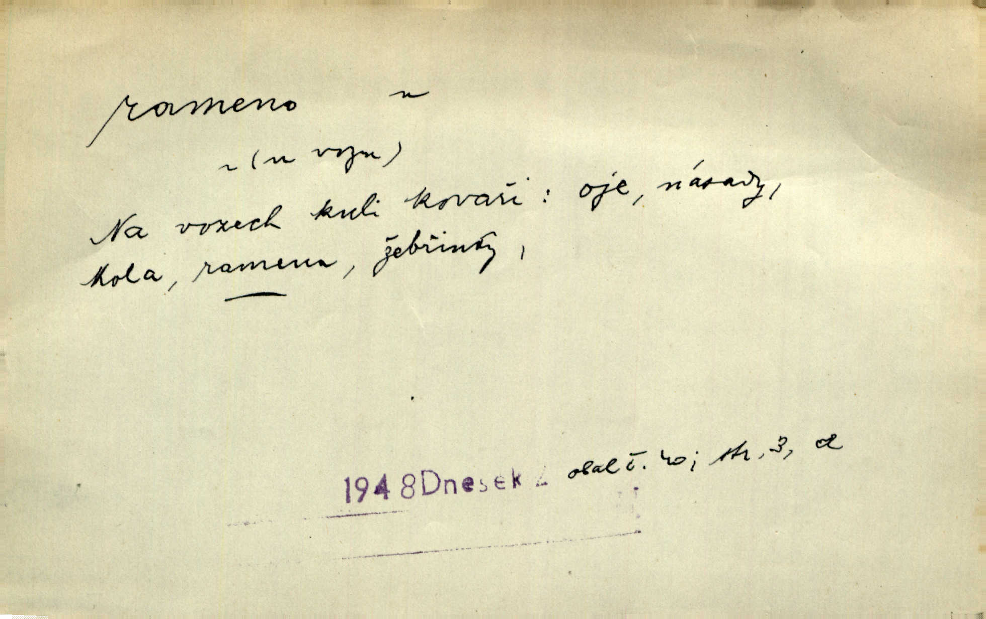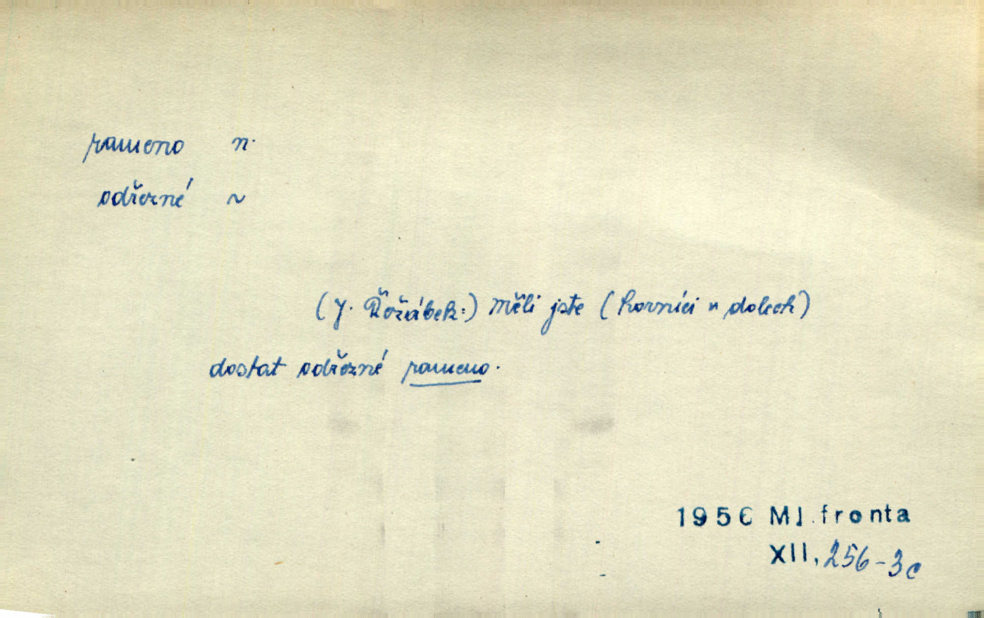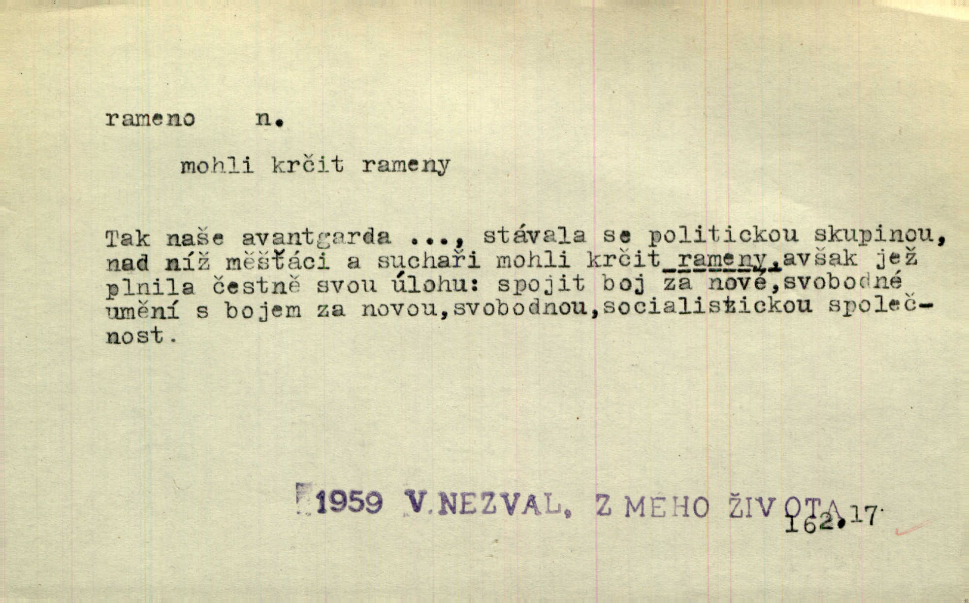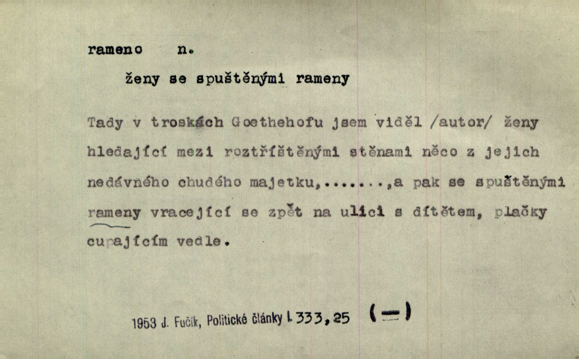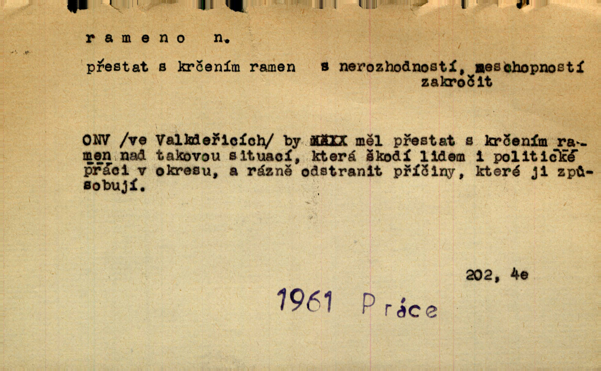 - rameno, -a n., zast. a bás. rámě, -ene n. (2. pl. ramen; 6. pl. ramenech; v ust. spoj. též u ramenou, na ramenou a p.) horní postranní část těla tvořená kloubem a kostí ramenní. [Myslivec] přehodil pušku přes rameno a šel. Něm. Položila si hlavu na slečnino rámě, jako by u ní pomoci hledala. Preis. Potěšil byl velký, hlavy trochu k levému rameni přikloněné. Rais. Tatík, hrabici maje na ramenou, upocen kolébal se po mezi. Rais. Plaid visel mu v dlouhých řasách s ramena na zem. Zey. Vzal nohy na ramena dal se na útěk. Herb. Na Anežku obě sestry hleděly přes rameno pohrdavě. Herb. [Snad není nikdo] tak cynický, aby pokrčil rameny nad osudem vlastního národa projevil lhostejnost. Týd. rozhl. Přen. A na tvých [Šumavy] hrdých ramenech plášť blýská se ti bílý. Heyd. Voj. na rámě — zbraň! (povel). D horní lidská končetina, zvláště její část odshora k lokti. Marně po tobě jsem vzpínal rámě. Rok. Zřím časem, skolébaný v dumy snivé, jak nahé, plné rameno se míhá. Vrch. Ó že jsem sláb a stár a rámě mé již nemůž rázně meče pozdvihnout! Krás. Simáková v ten strastný čas dala se obtáčeti ramenem Vejvodovým. Šmil. Nabídl jí rámě, Nanynka se zavěsila. Herrm. Byl to mladík podobný, že by každá se zalíbením mu rámě podala vdala se za něho. Jir. Pod cizím jménem potuloval se po Táborsku a ukrýval se před ramenem spravedlnosti před četníkem. Staš. Strážník hrozil [ohněstrůjci] zatčením, což by bývalo velmi těžko, ježto sebe delší rámě bezpečnosti nedosáhlo přes hradbu. Čap. Ch. První, kdož na sobě pocítili trestající rámě církve, byli Albigensové. Čech. Nepřítele strážce tvého, Bohše nelítostivého Boží rámě schvátilo Bůh. Macháč. Ty [Bůh] dobrému králi stále rameno své mocné přej! ochranu. Čel. Práv. rameno světské pomoc úřadů světských úřadům církevním, bracchium saeculare. Zool. první základní část přední okončiny obratlovců (mimo ryby). D rameno část něčeho do strany vybíhající. Uvidělo [slunce] lid shromážděný u kostela, jak na kolenou klečí pod rozpjatými rameny dřevěného kříže. A. Mrš. Ramena bronzových lustrů vykvétala v květinové kalichy ze skla perleťového. Herrm. Pod starou pláničkou se široce rozloženými rameny větví páslo děvče v modré pruhované sukni husy. R. Svob. Křižování aut na vjezdových a výjezdových ramenech nebude na závadu. Techn. obz. Úzkou uličkou dáme se nyní podél ramena Vltavy. Pfleg. Tak dostali se k nějaké tůni v hluboké prorvě, snad v mrtvém rameni starého řečiště. Jir. Geol. rameno vrásy jedna ze stran omezujících vrásu. Stav. rameno schodů část přímočarého schodiště, která vede v jednom směru. Vodár. rameno sestupné klesající část násoskového spojení vodárenských studní. D štíhlá, podlouhlá součást stroje n. jiného zařízení, upevněná na jednom n. i na obou koncích. Stroj. rameno jeřábu, semaforu, regulátoru, šicího stroje a pod.; rameno otočné, sklápěcí, kladivové a j.; rameno kola paprsek, špice. D Geom. jedna ze dvou stejně dlouhých stran v trojúhelníku rovnoramenném; rameno úhlu polopaprsek odchýlený od druhého polopaprsku o určitý úhel; jedna z obou různoběžných stran v lichoběžníku. Fys. rameno síly kolmá vzdálenost působiště síly od těžiště.