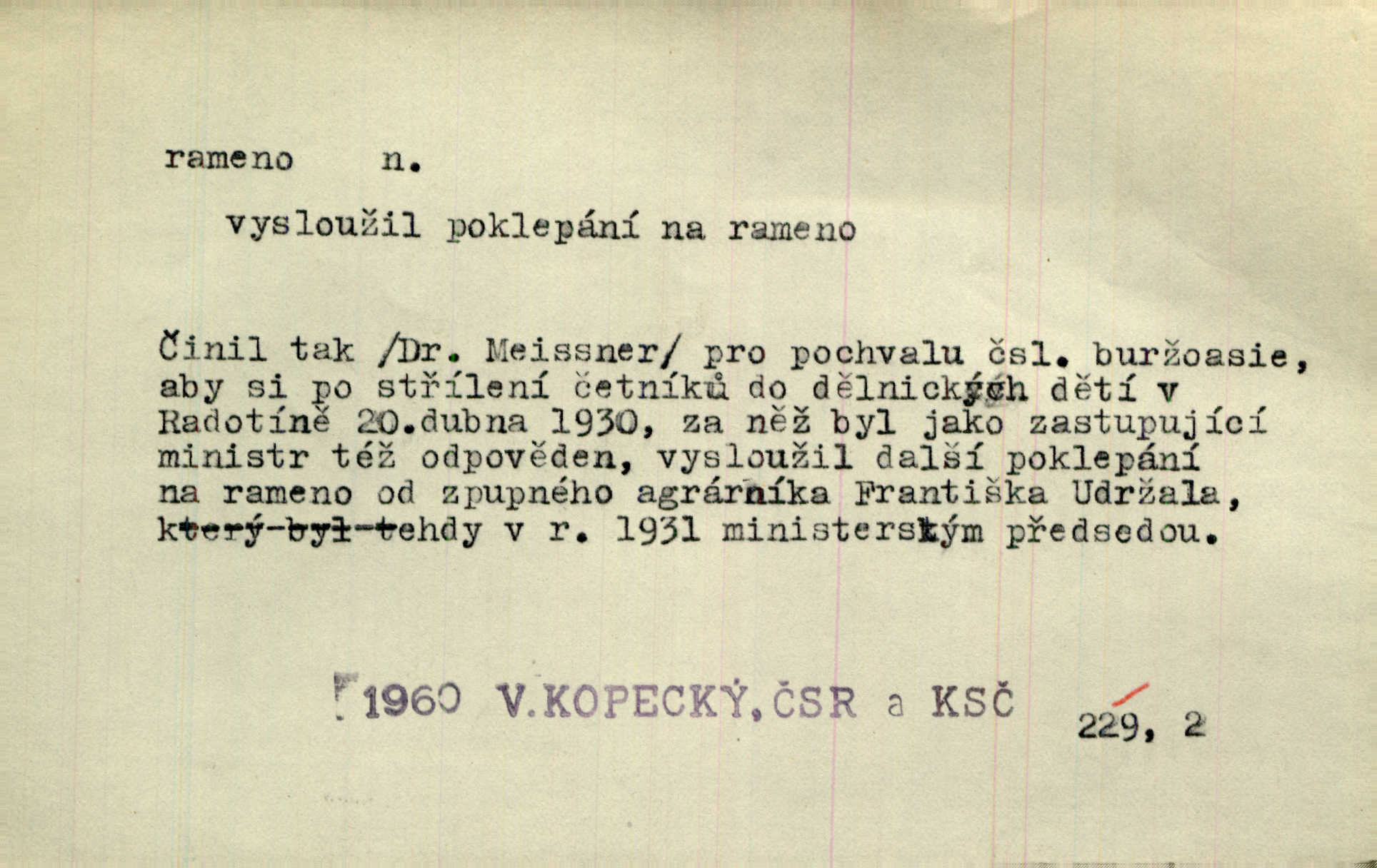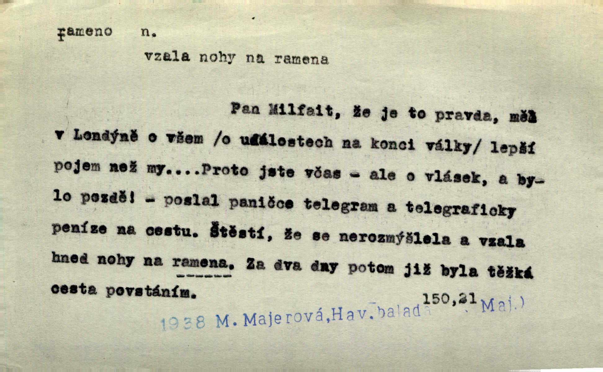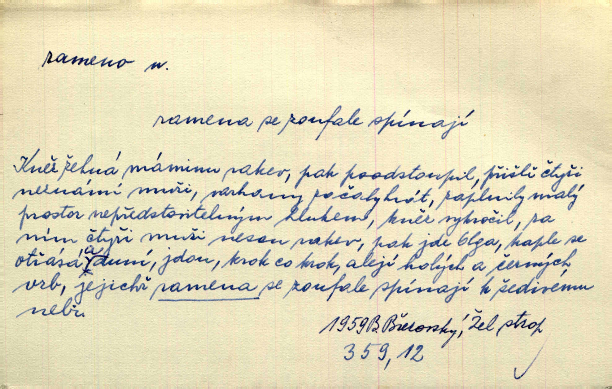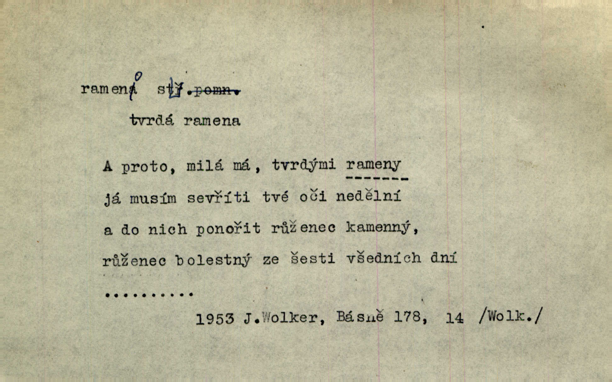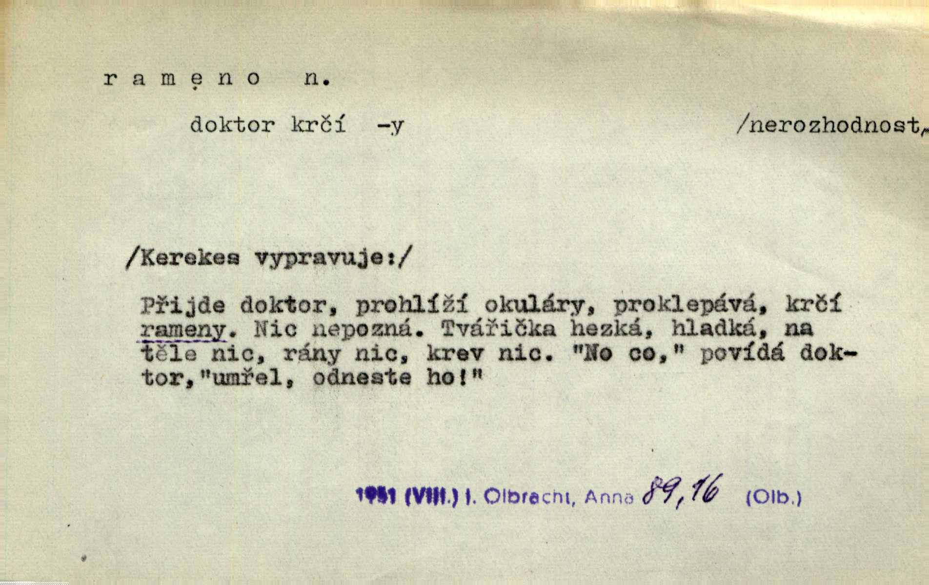 - rameno, -a n., zast. a bás. rámě, -ene n. (2. pl. ramen; 6. pl. ramenech; v ust. spoj. též u ramenou, na ramenou a p.) horní postranní část těla tvořená kloubem a kostí ramenní. [Myslivec] přehodil pušku přes rameno a šel. Něm. Položila si hlavu na slečnino rámě, jako by u ní pomoci hledala. Preis. Potěšil byl velký, hlavy trochu k levému rameni přikloněné. Rais. Tatík, hrabici maje na ramenou, upocen kolébal se po mezi. Rais. Plaid visel mu v dlouhých řasách s ramena na zem. Zey. Vzal nohy na ramena dal se na útěk. Herb. Na Anežku obě sestry hleděly přes rameno pohrdavě. Herb. [Snad není nikdo] tak cynický, aby pokrčil rameny nad osudem vlastního národa projevil lhostejnost. Týd. rozhl. Přen. A na tvých [Šumavy] hrdých ramenech plášť blýská se ti bílý. Heyd. Voj. na rámě — zbraň! (povel). D horní lidská končetina, zvláště její část odshora k lokti. Marně po tobě jsem vzpínal rámě. Rok. Zřím časem, skolébaný v dumy snivé, jak nahé, plné rameno se míhá. Vrch. Ó že jsem sláb a stár a rámě mé již nemůž rázně meče pozdvihnout! Krás. Simáková v ten strastný čas dala se obtáčeti ramenem Vejvodovým. Šmil. Nabídl jí rámě, Nanynka se zavěsila. Herrm. Byl to mladík podobný, že by každá se zalíbením mu rámě podala vdala se za něho. Jir. Pod cizím jménem potuloval se po Táborsku a ukrýval se před ramenem spravedlnosti před četníkem. Staš. Strážník hrozil [ohněstrůjci] zatčením, což by bývalo velmi těžko, ježto sebe delší rámě bezpečnosti nedosáhlo přes hradbu. Čap. Ch. První, kdož na sobě pocítili trestající rámě církve, byli Albigensové. Čech. Nepřítele strážce tvého, Bohše nelítostivého Boží rámě schvátilo Bůh. Macháč. Ty [Bůh] dobrému králi stále rameno své mocné přej! ochranu. Čel. Práv. rameno světské pomoc úřadů světských úřadům církevním, bracchium saeculare. Zool. první základní část přední okončiny obratlovců (mimo ryby). D rameno část něčeho do strany vybíhající. Uvidělo [slunce] lid shromážděný u kostela, jak na kolenou klečí pod rozpjatými rameny dřevěného kříže. A. Mrš. Ramena bronzových lustrů vykvétala v květinové kalichy ze skla perleťového. Herrm. Pod starou pláničkou se široce rozloženými rameny větví páslo děvče v modré pruhované sukni husy. R. Svob. Křižování aut na vjezdových a výjezdových ramenech nebude na závadu. Techn. obz. Úzkou uličkou dáme se nyní podél ramena Vltavy. Pfleg. Tak dostali se k nějaké tůni v hluboké prorvě, snad v mrtvém rameni starého řečiště. Jir. Geol. rameno vrásy jedna ze stran omezujících vrásu. Stav. rameno schodů část přímočarého schodiště, která vede v jednom směru. Vodár. rameno sestupné klesající část násoskového spojení vodárenských studní. D štíhlá, podlouhlá součást stroje n. jiného zařízení, upevněná na jednom n. i na obou koncích. Stroj. rameno jeřábu, semaforu, regulátoru, šicího stroje a pod.; rameno otočné, sklápěcí, kladivové a j.; rameno kola paprsek, špice. D Geom. jedna ze dvou stejně dlouhých stran v trojúhelníku rovnoramenném; rameno úhlu polopaprsek odchýlený od druhého polopaprsku o určitý úhel; jedna z obou různoběžných stran v lichoběžníku. Fys. rameno síly kolmá vzdálenost působiště síly od těžiště.