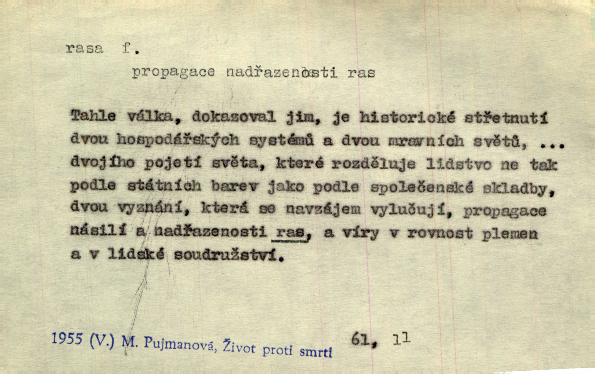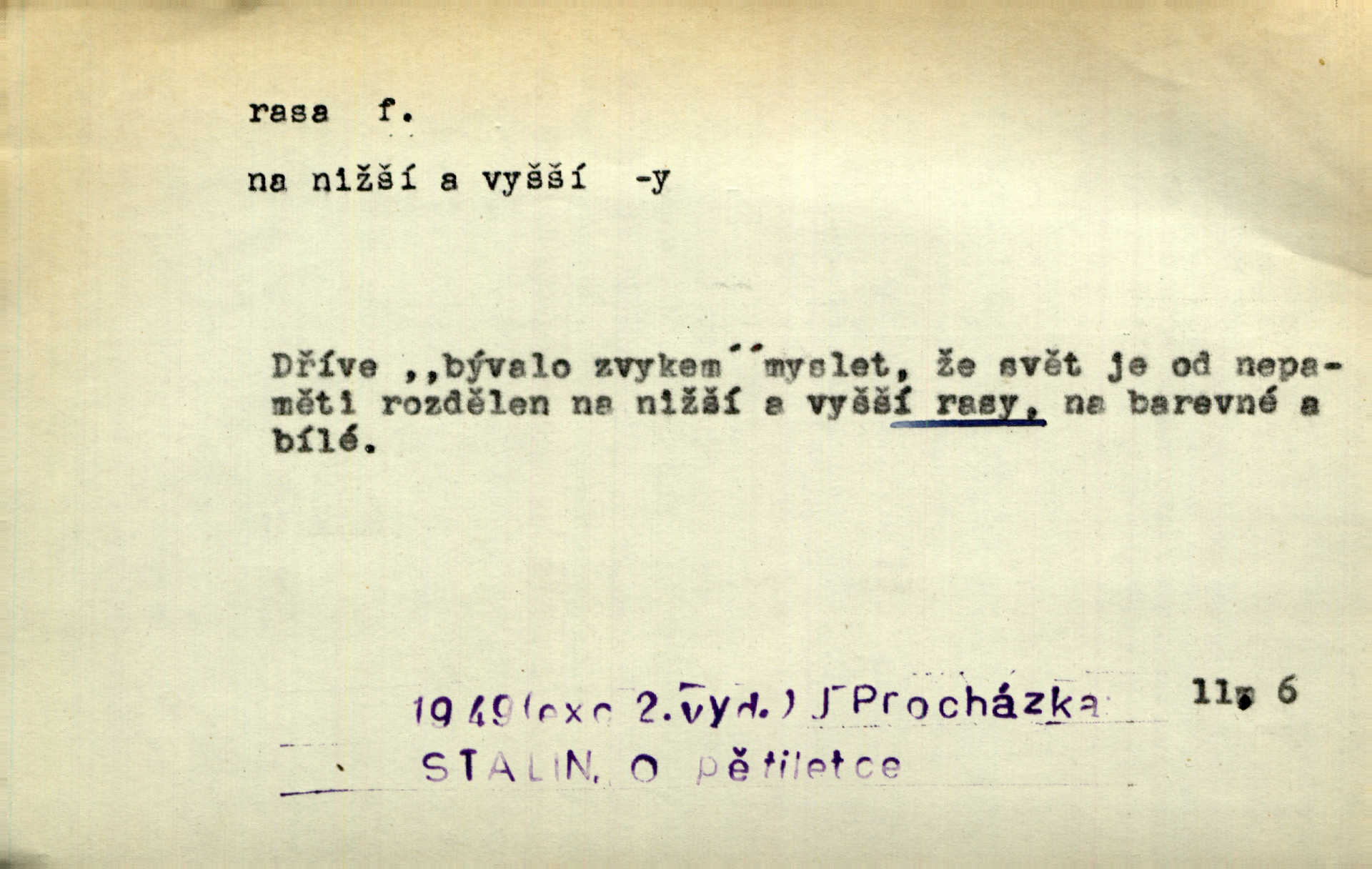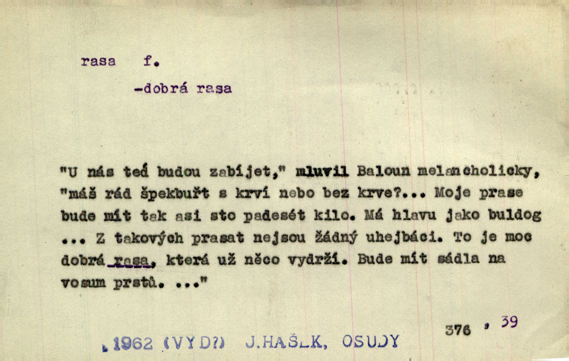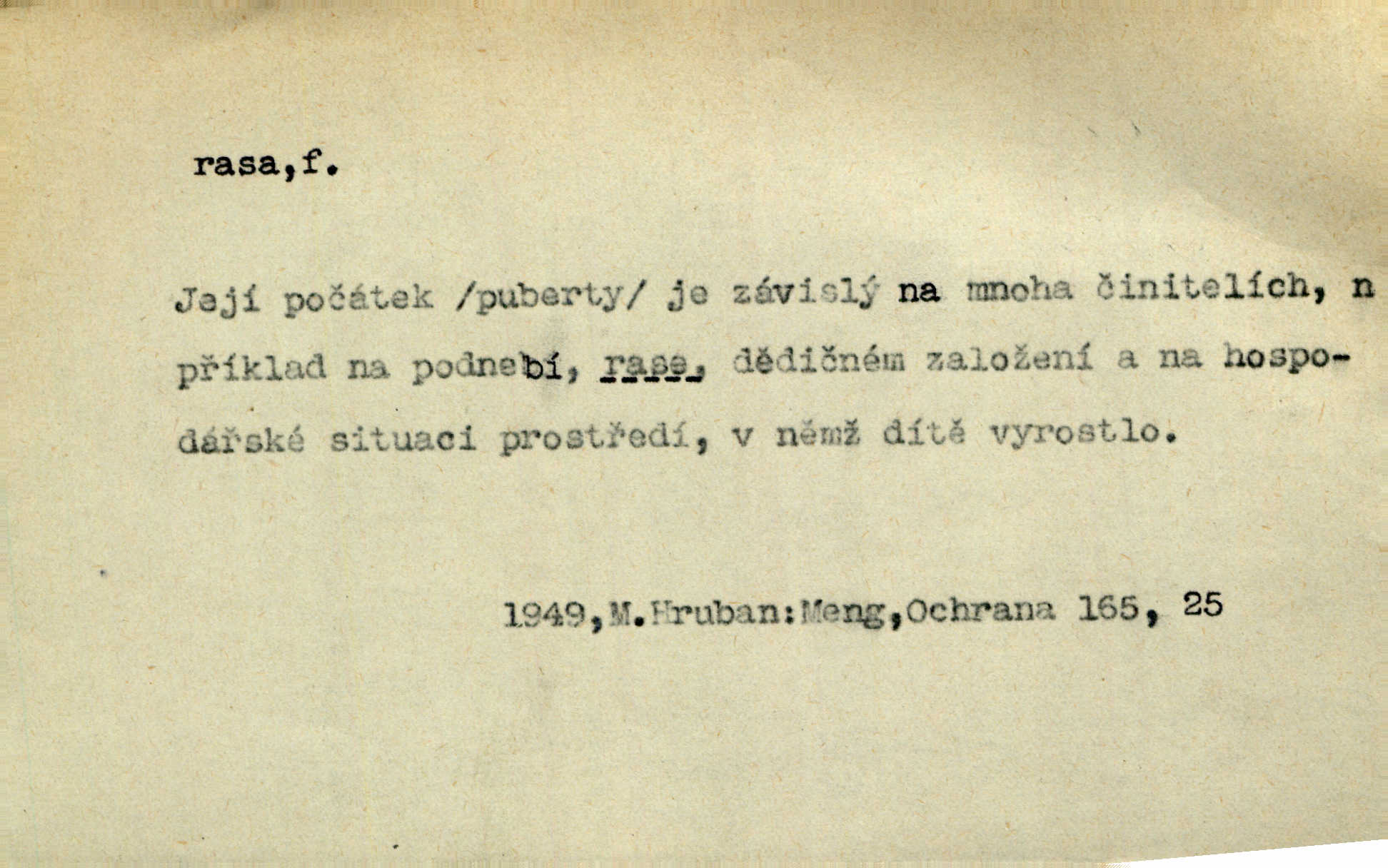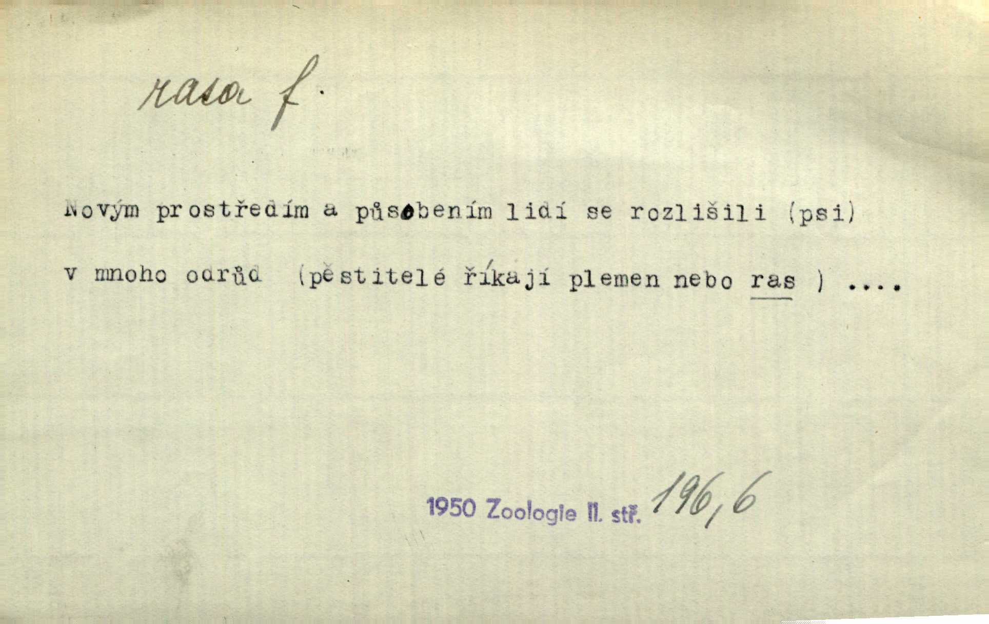 - rasa (ps. též raça), -y f. skupina individuí, která pocházejí ze stejné rodové linie a zdědila tedy stejné tělesné i duševní vlastnosti, plemeno. Zvíře non plus ultra. Čistá raça! Herrm. Smečka psů nejušlechtilejší rasy letěla před koňmi. Zey. Je to brána východu, jíž procházejí snad všechny rasy Asie. J. Havlasa. Čím zachovalejší a čistší raça toho kterého národa, tím zdravější a čistší je také jeho plod. V. Mrš. Zool. kategorie v systematice zoologické nižší než druh a vyšší než odchylka, subspecies. Bot. odchylka kulturní rostliny člověkem vědomě vypěstovaná a získaná výběrem n. křížením, sorta.