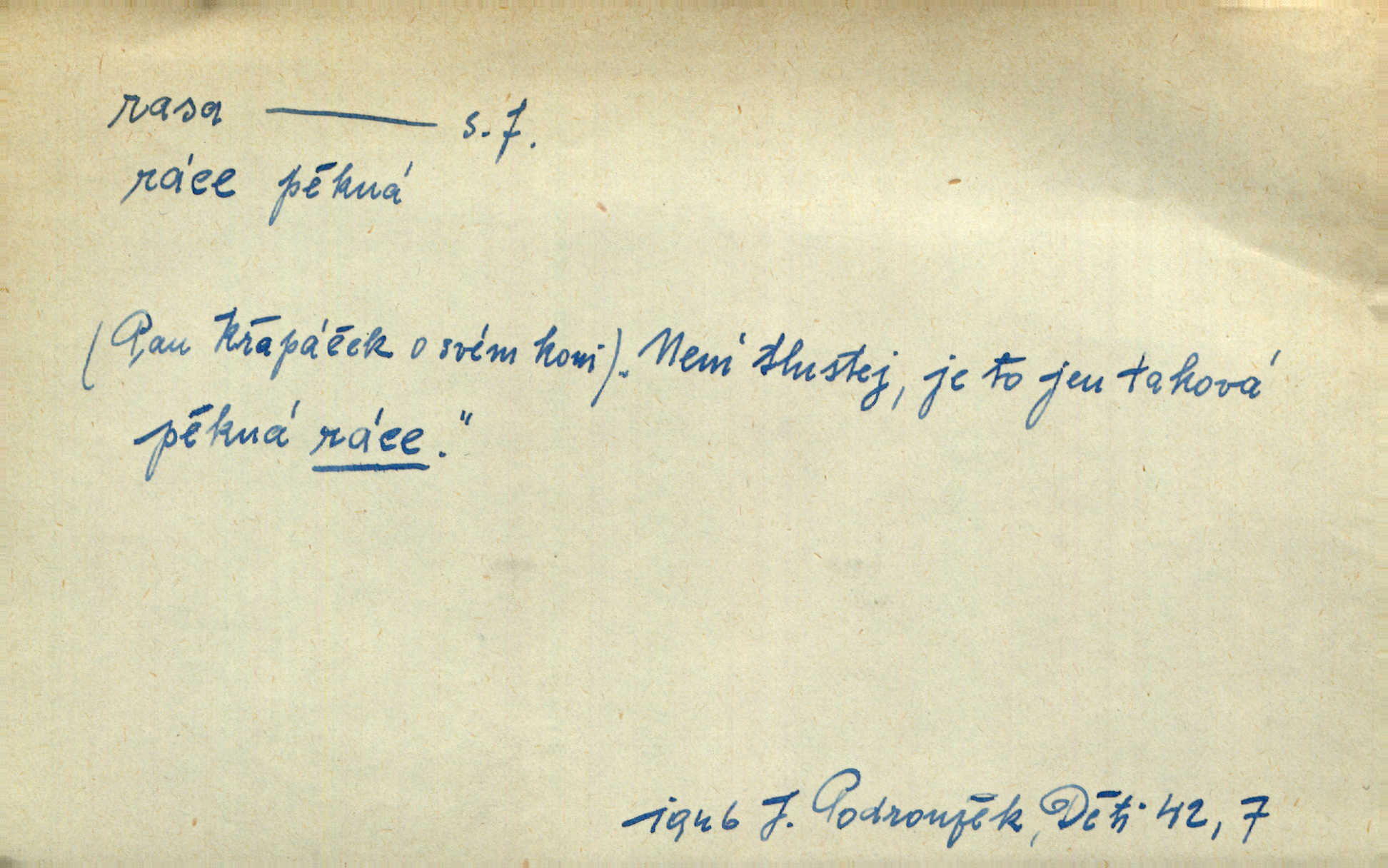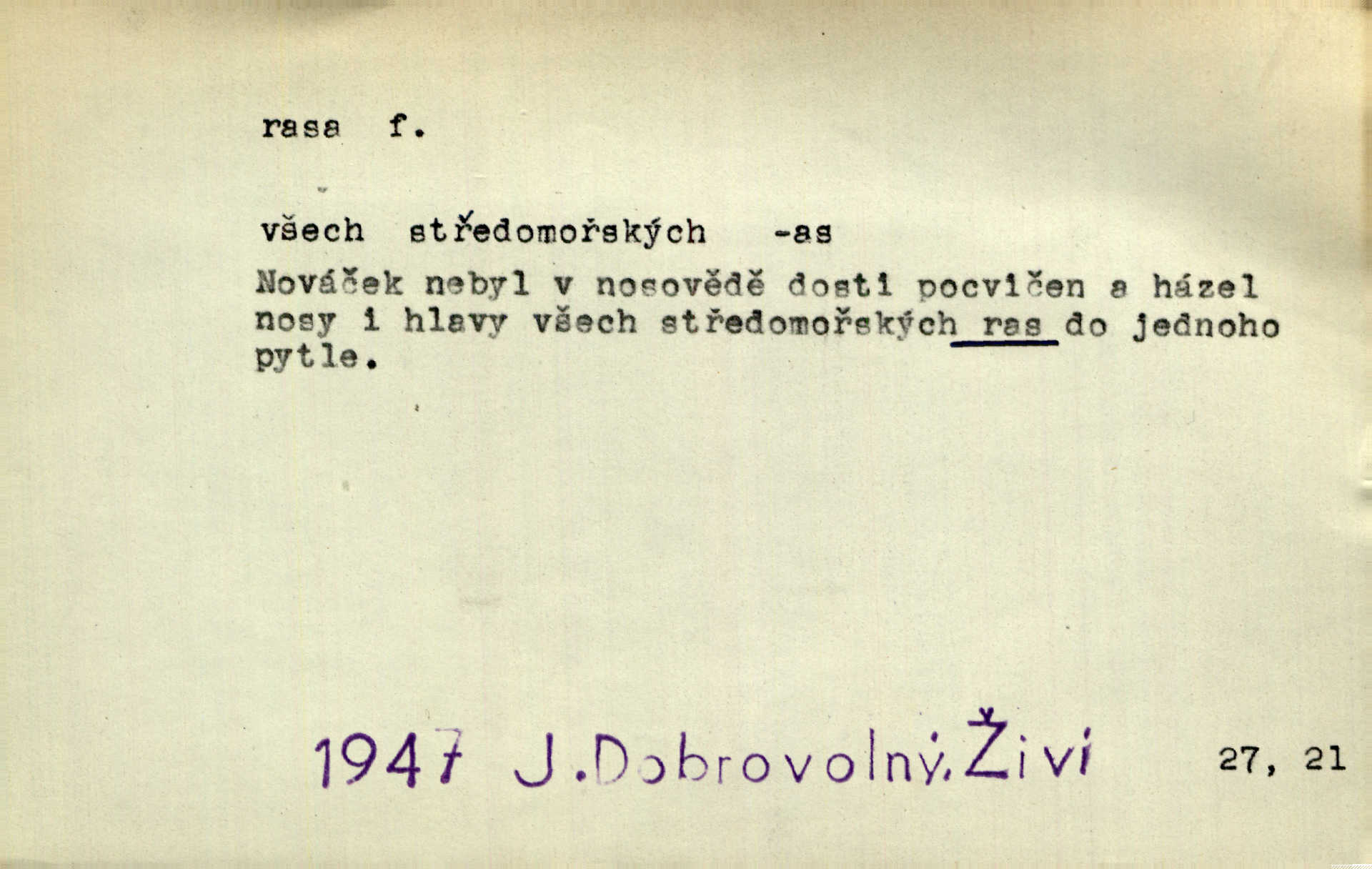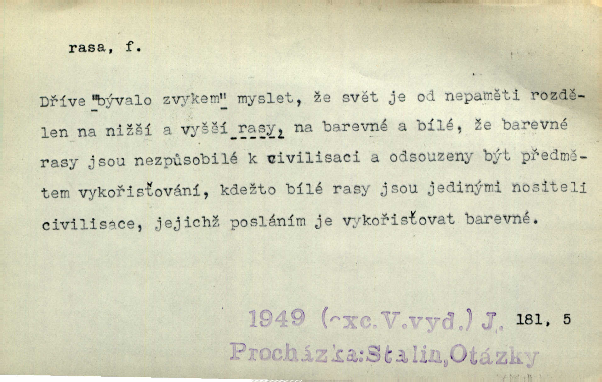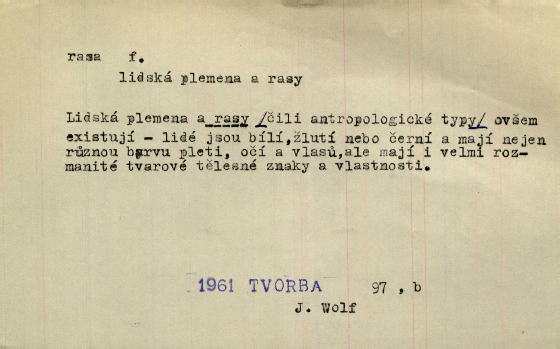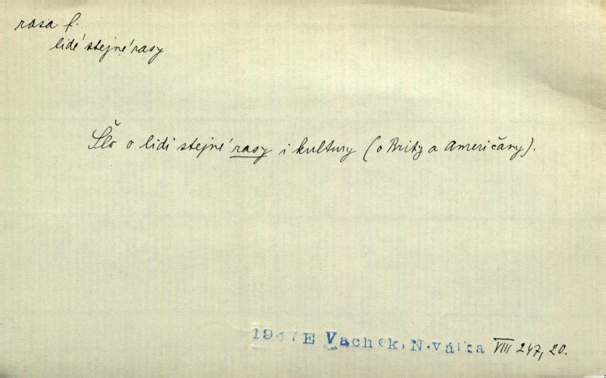 - rasa (ps. též raça), -y f. skupina individuí, která pocházejí ze stejné rodové linie a zdědila tedy stejné tělesné i duševní vlastnosti, plemeno. Zvíře non plus ultra. Čistá raça! Herrm. Smečka psů nejušlechtilejší rasy letěla před koňmi. Zey. Je to brána východu, jíž procházejí snad všechny rasy Asie. J. Havlasa. Čím zachovalejší a čistší raça toho kterého národa, tím zdravější a čistší je také jeho plod. V. Mrš. Zool. kategorie v systematice zoologické nižší než druh a vyšší než odchylka, subspecies. Bot. odchylka kulturní rostliny člověkem vědomě vypěstovaná a získaná výběrem n. křížením, sorta.