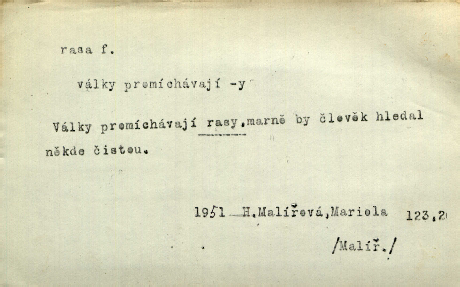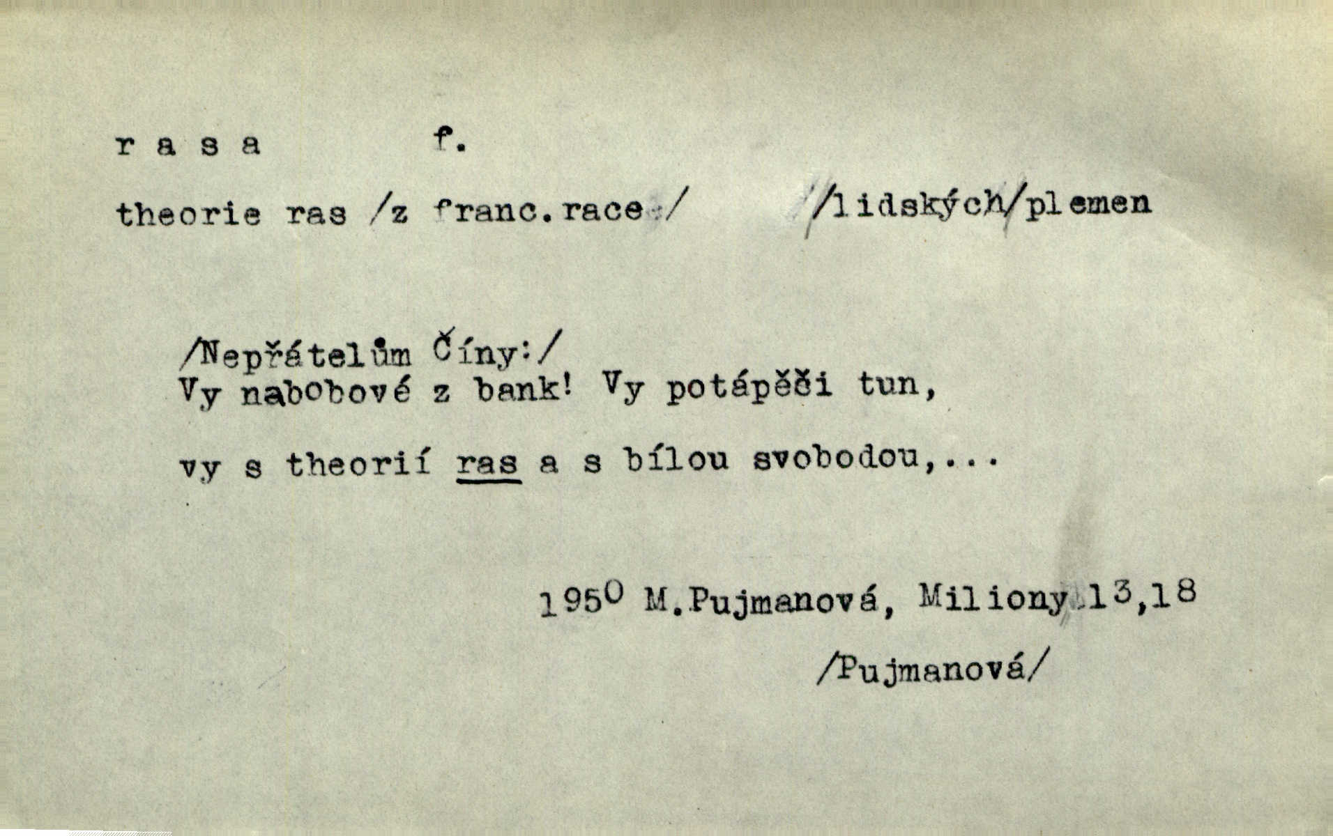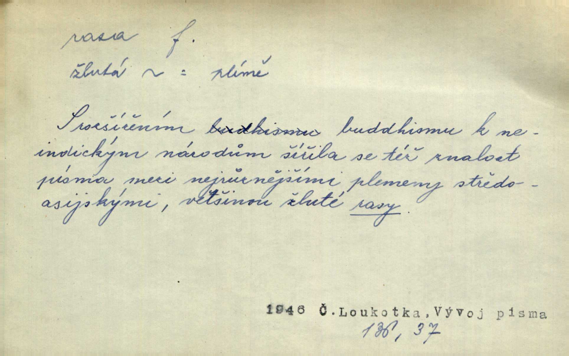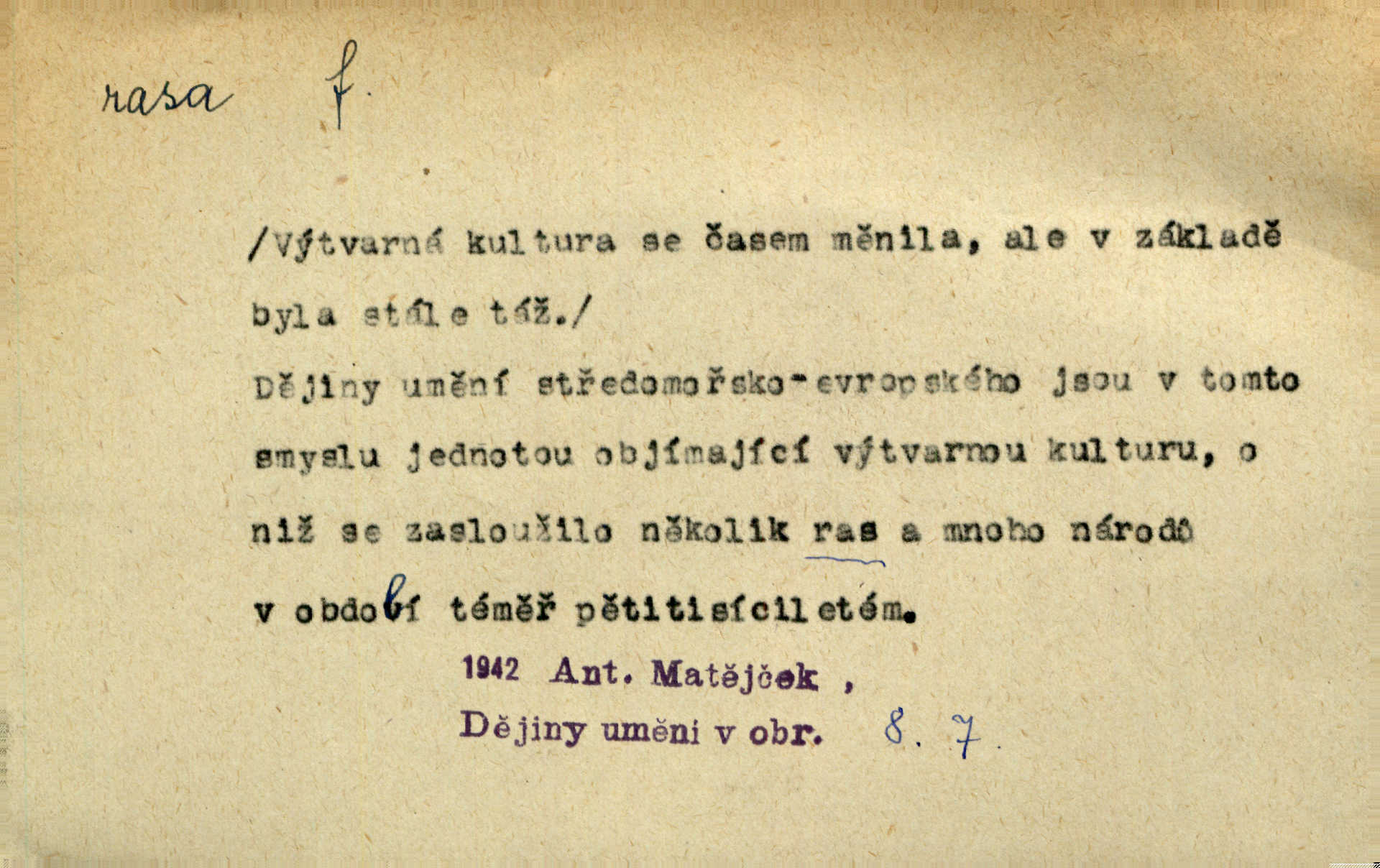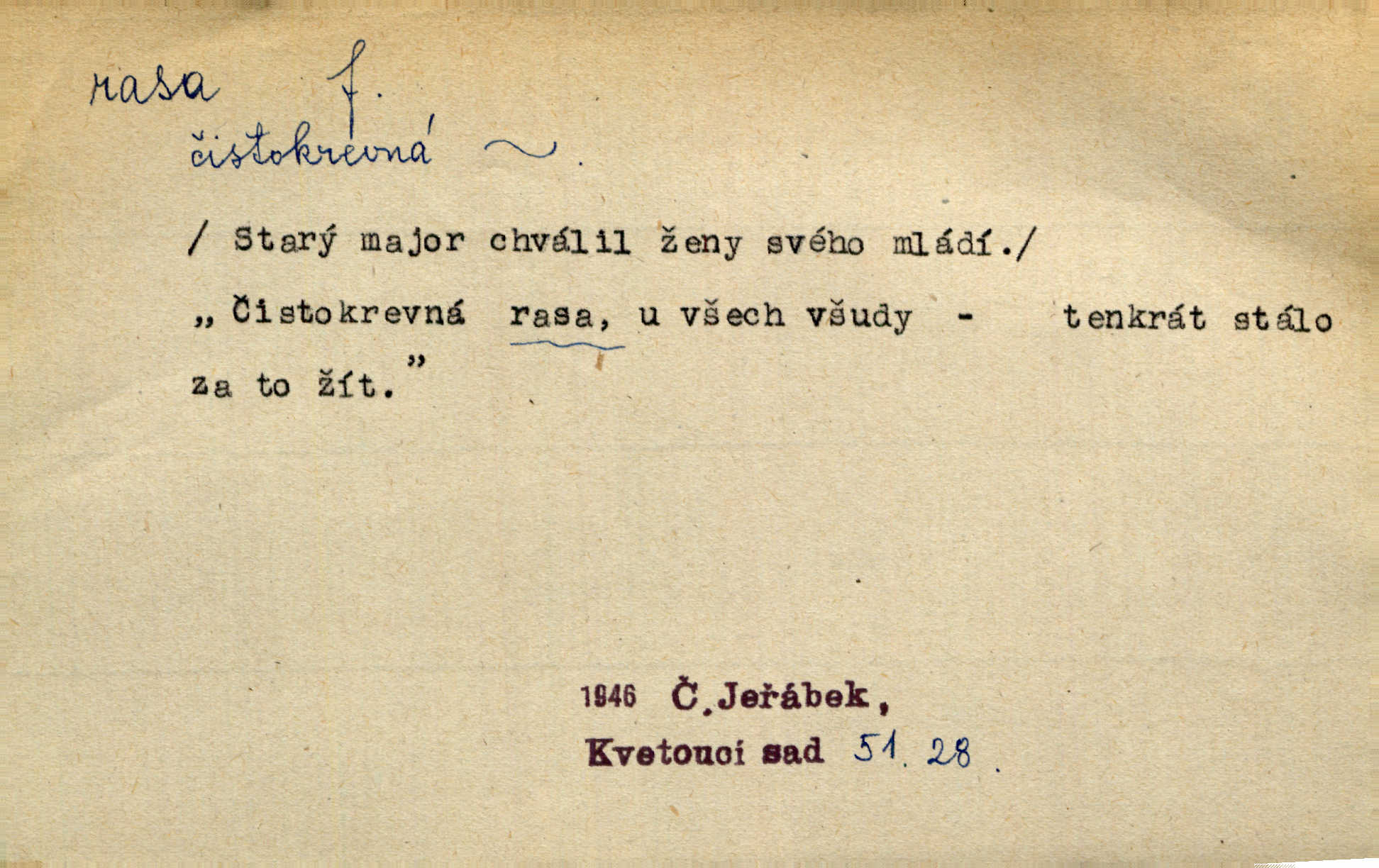 - rasa (ps. též raça), -y f. skupina individuí, která pocházejí ze stejné rodové linie a zdědila tedy stejné tělesné i duševní vlastnosti, plemeno. Zvíře non plus ultra. Čistá raça! Herrm. Smečka psů nejušlechtilejší rasy letěla před koňmi. Zey. Je to brána východu, jíž procházejí snad všechny rasy Asie. J. Havlasa. Čím zachovalejší a čistší raça toho kterého národa, tím zdravější a čistší je také jeho plod. V. Mrš. Zool. kategorie v systematice zoologické nižší než druh a vyšší než odchylka, subspecies. Bot. odchylka kulturní rostliny člověkem vědomě vypěstovaná a získaná výběrem n. křížením, sorta.