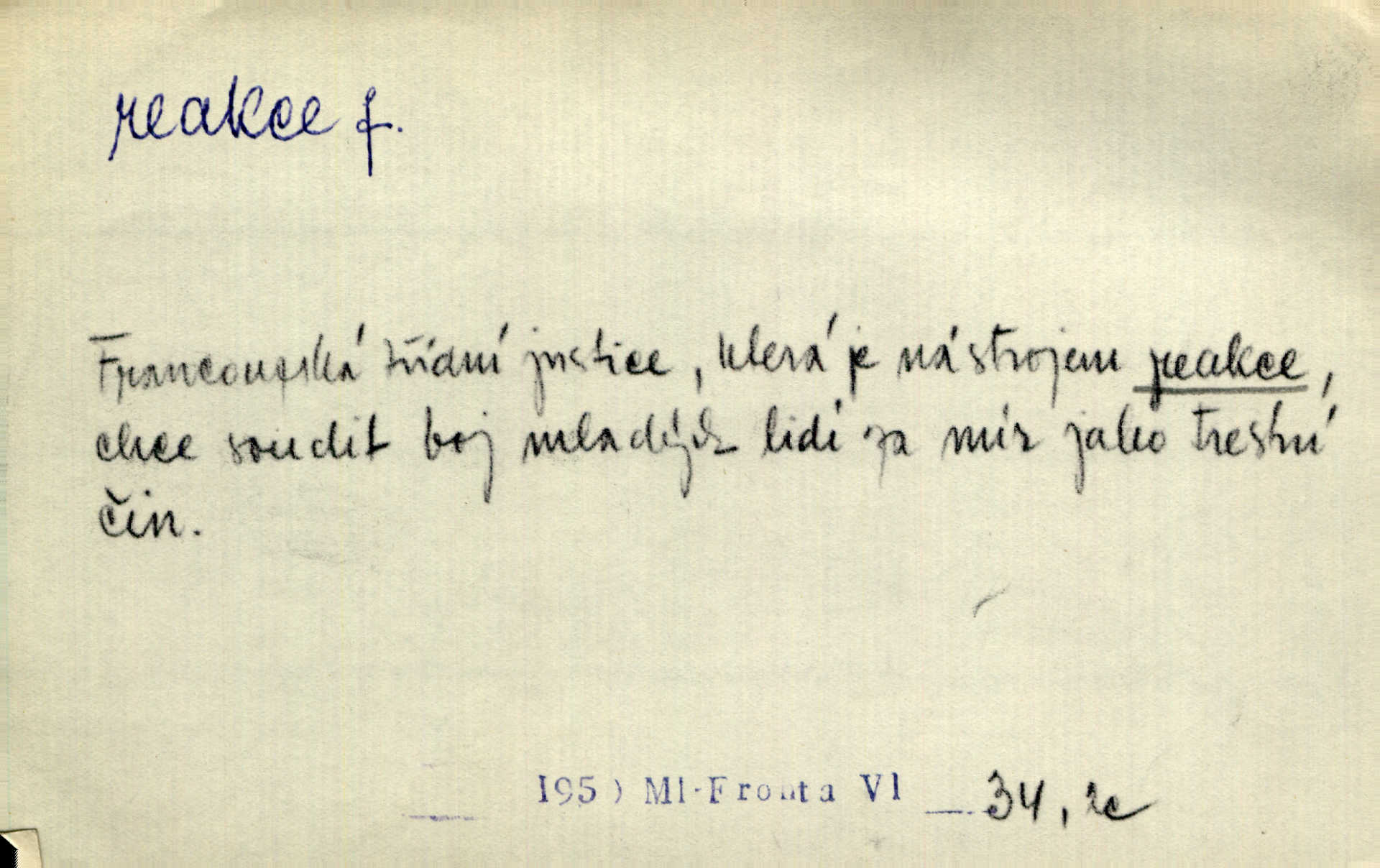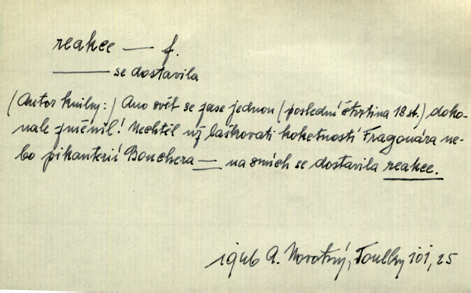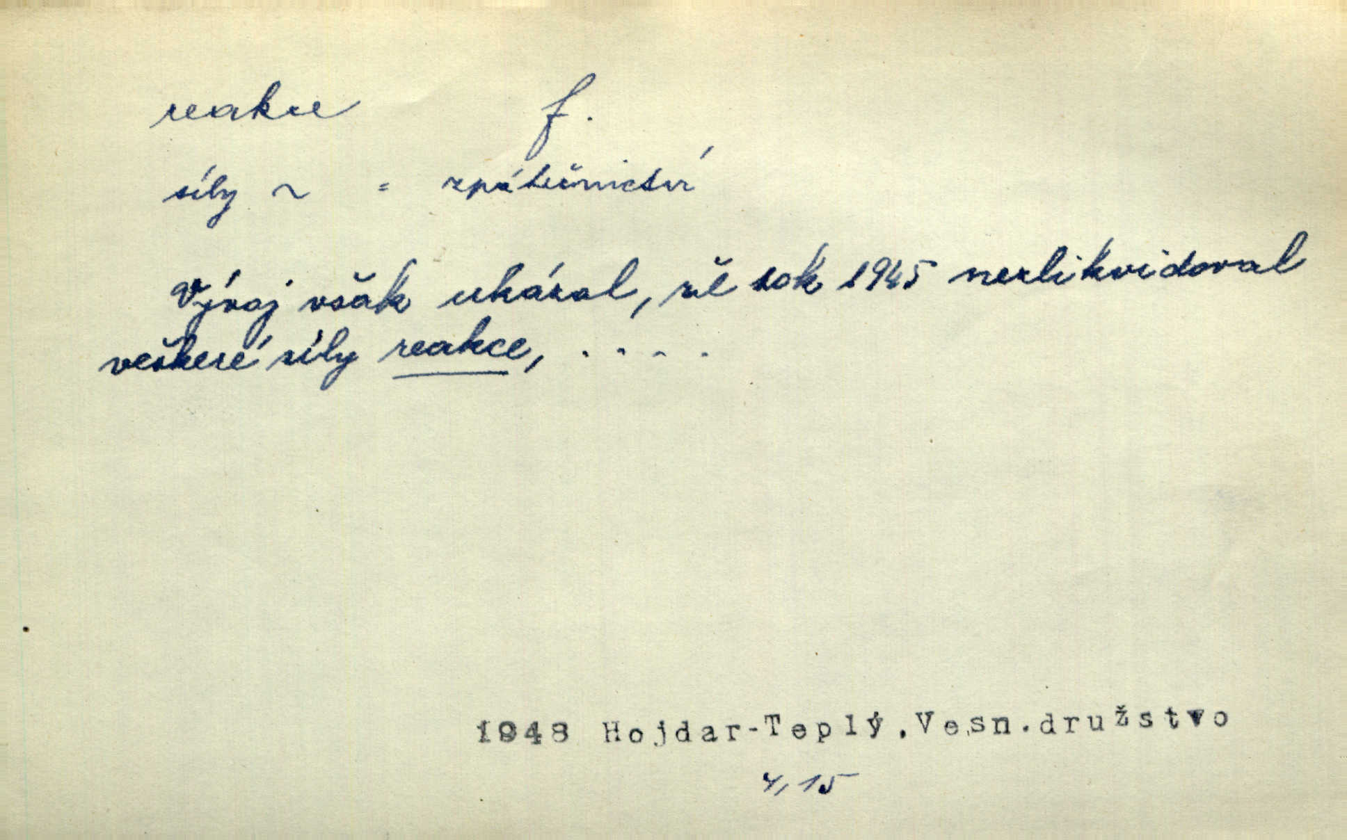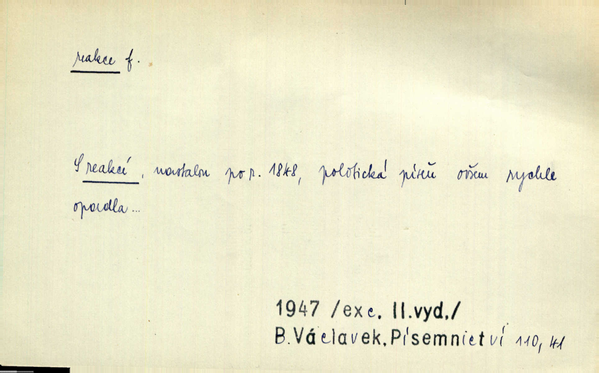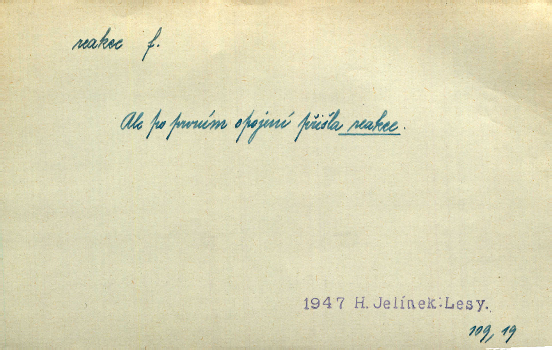 - reakce, -e f. (zast. reakcí, -í) f. činnost n. stav vzbuzený nějakým popudem, podnětem, ohlas, odezva. Pochybuje se o činu lidském, který by byl něco kladného a svéprávného, t. j. něco jiného než pouhá reakce na něco vnějškového. Šal. Zakňučení strachy bylo jedinou reakcí [hraběte] na pohrůžku. Čap. Ch. Pravidlem jsou u něho [Svobody] tlumené akce a reakce průměrného sentimentu. Sez. List otcův způsobil ve mně hlubokou reakci. Kun. Chci se zmínit o několika dopisech, jež mi byly doručeny jako reakce či odezva na mé články. Nor. Chem. chemický pochod, při němž nastávají změny látkové; reakce skladné, rozkladné, barevné, isolované a j. Reakce prostředí kyselá, neutrální, alkalická. Fysiol., psych. změna v celém organismu n. jednotlivých ústrojích odpovídající na popud n. podráždění. Lék. reakce očkování a pod. Fys. silový děj způsobený jiným dějem, akcí; Newtonův princip akce a reakce. D stav, hnutí jsoucí v protikladu k stavu, hnutí předcházejícímu. Nezkalená veselost [pana domácího] trvala jen několik dní. Nastala reakce, jakási ochablost. Arb. Proud slzí se zarazil, nastala reakce, hněv zaujal místo bolu. Klost. Asketa probudil se opět v Xaveru a reakce jeho opojení byla trpká! Zey. Tenkráte [v době husitské] tmavé a šeré barvy [krojů] nabyly vrchu. Ale již koncem 15. stol. nastala v tom reakce. Nádhera krojů zavládla zase. Jir. D politické hnutí, jež po období převratů a politických n. j. společenských reforem usiluje obnoviti dřívější řád, zpátečnictví. Výstřednosti francouzské revoluce vyvolaly nutně všeobecnou reakci. Grégr. Smrt Ludvíka XIV. byla heslem k reakci. J. Malý. Kleomenes pokouší se o zavedení reakce v Athenách. Kvíč. Svoboda vychází z dětských střevíčků, reakcí ze starého haraburdí. Ner. Nastal v celé říši zpátečnický ruch, a reakce byla brzo v plném květu. I. Klicp. V době reakce bachovské osvědčilo se úplně, co [Náprstek] předvídal! Zey. D hnutí, směr potírající něco, stavějící se proti něčemu, odpor proti něčemu. Silná reakce proti utlačování předešlých roků trvá ještě. Zl. Praha. Bylať jednota Strakonická reakcí proti Poděbradským. Světozor. Jeť ve mně reakce proti materialismu. Podl. Nastala i reakce proti němu [Březinovi]. Dur. V malbě krajin impresionism jest poměrně mladý, jest reakcí proti formalismu. Lier.