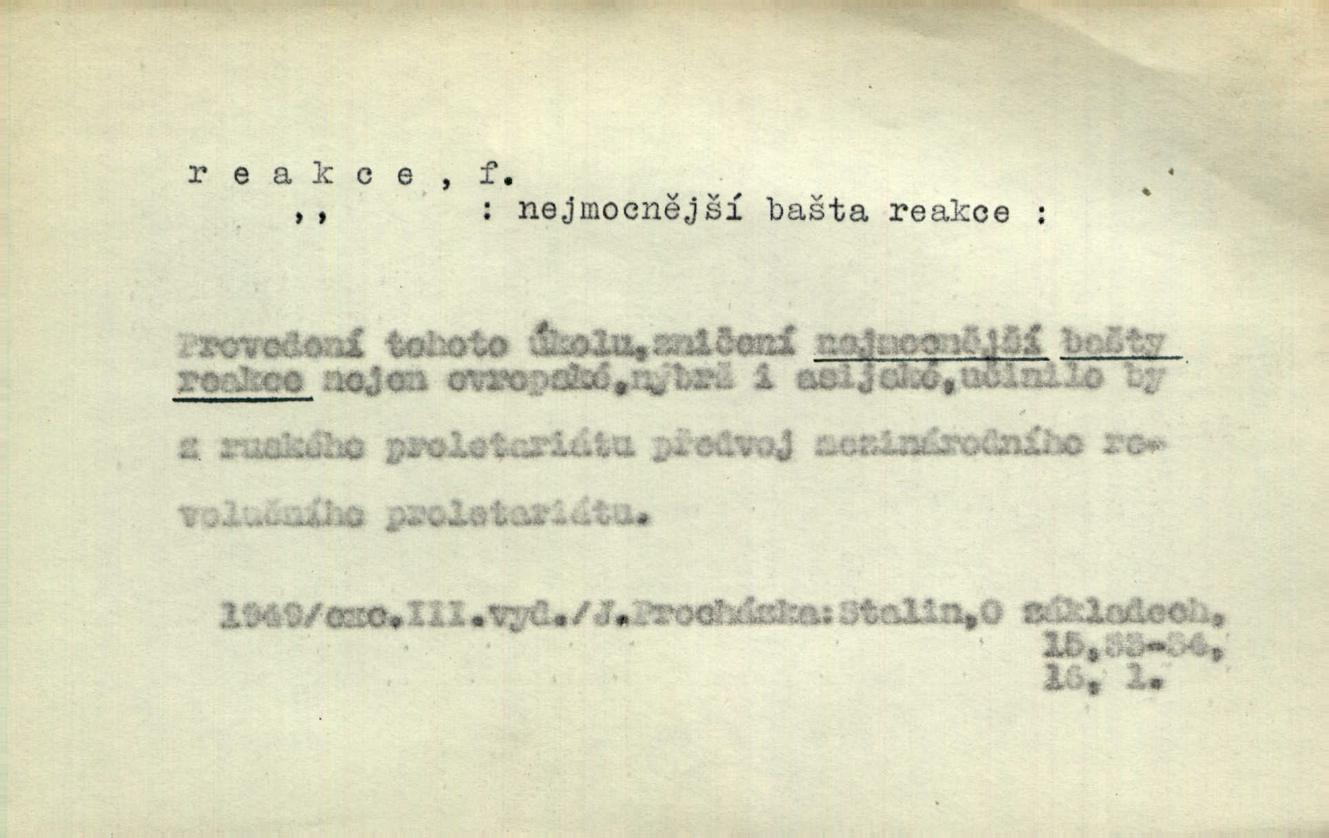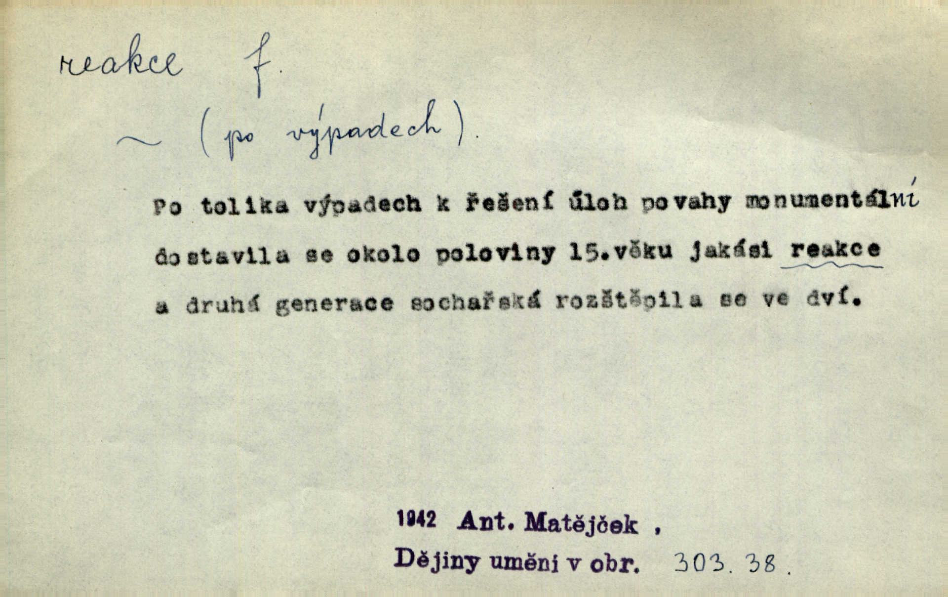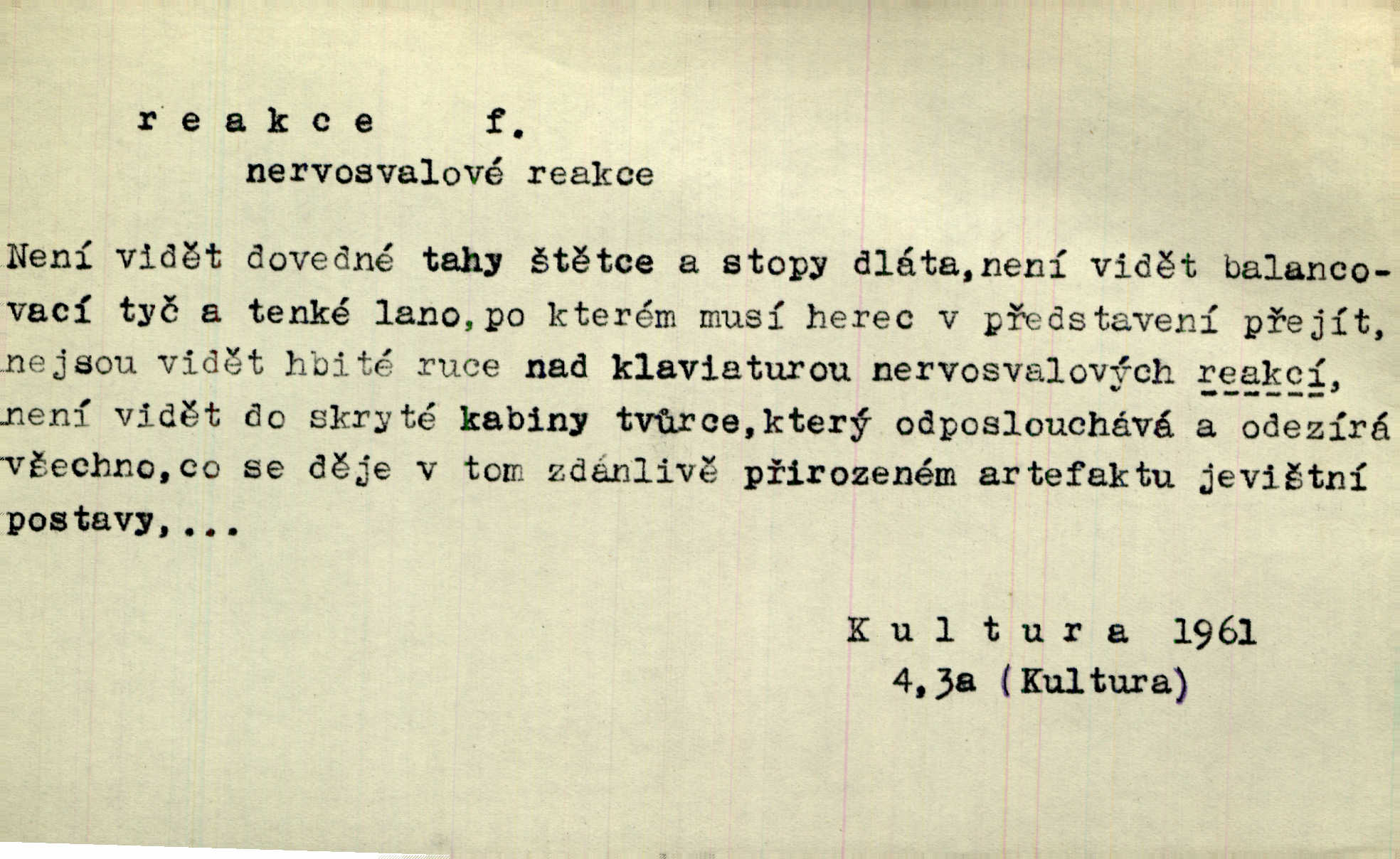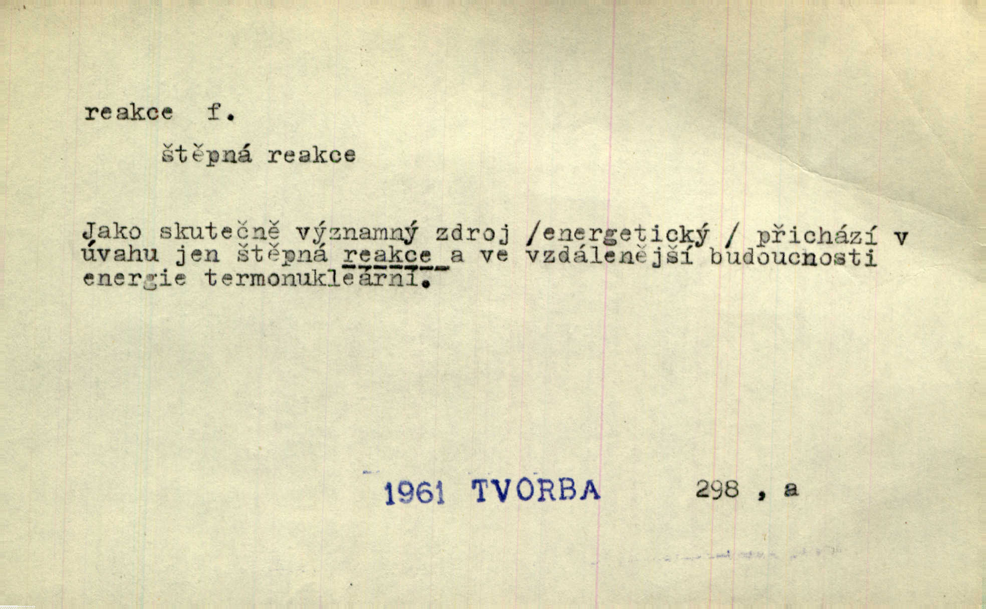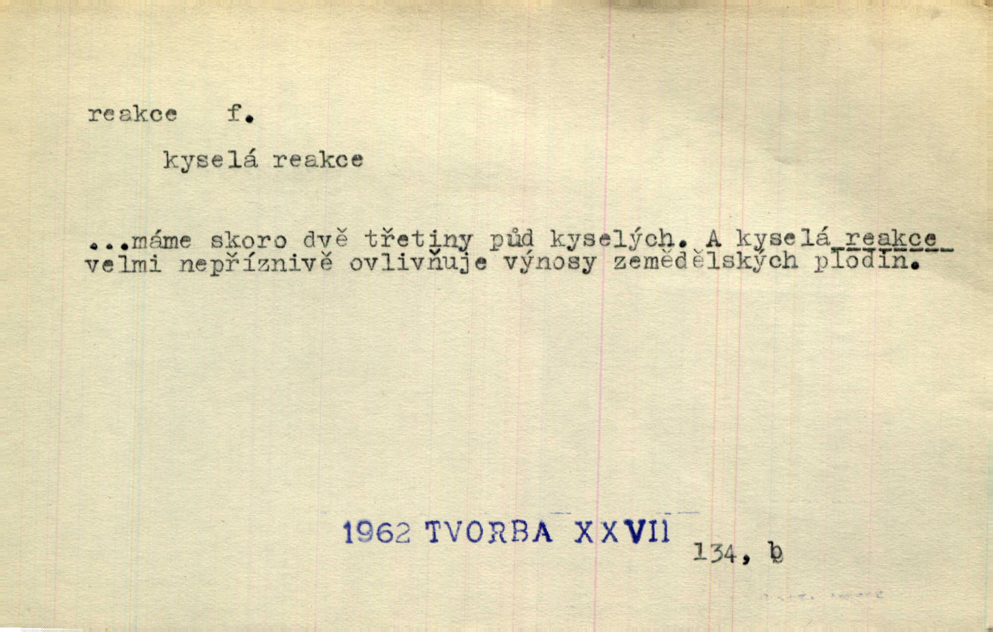 - reakce, -e f. (zast. reakcí, -í) f. činnost n. stav vzbuzený nějakým popudem, podnětem, ohlas, odezva. Pochybuje se o činu lidském, který by byl něco kladného a svéprávného, t. j. něco jiného než pouhá reakce na něco vnějškového. Šal. Zakňučení strachy bylo jedinou reakcí [hraběte] na pohrůžku. Čap. Ch. Pravidlem jsou u něho [Svobody] tlumené akce a reakce průměrného sentimentu. Sez. List otcův způsobil ve mně hlubokou reakci. Kun. Chci se zmínit o několika dopisech, jež mi byly doručeny jako reakce či odezva na mé články. Nor. Chem. chemický pochod, při němž nastávají změny látkové; reakce skladné, rozkladné, barevné, isolované a j. Reakce prostředí kyselá, neutrální, alkalická. Fysiol., psych. změna v celém organismu n. jednotlivých ústrojích odpovídající na popud n. podráždění. Lék. reakce očkování a pod. Fys. silový děj způsobený jiným dějem, akcí; Newtonův princip akce a reakce. D stav, hnutí jsoucí v protikladu k stavu, hnutí předcházejícímu. Nezkalená veselost [pana domácího] trvala jen několik dní. Nastala reakce, jakási ochablost. Arb. Proud slzí se zarazil, nastala reakce, hněv zaujal místo bolu. Klost. Asketa probudil se opět v Xaveru a reakce jeho opojení byla trpká! Zey. Tenkráte [v době husitské] tmavé a šeré barvy [krojů] nabyly vrchu. Ale již koncem 15. stol. nastala v tom reakce. Nádhera krojů zavládla zase. Jir. D politické hnutí, jež po období převratů a politických n. j. společenských reforem usiluje obnoviti dřívější řád, zpátečnictví. Výstřednosti francouzské revoluce vyvolaly nutně všeobecnou reakci. Grégr. Smrt Ludvíka XIV. byla heslem k reakci. J. Malý. Kleomenes pokouší se o zavedení reakce v Athenách. Kvíč. Svoboda vychází z dětských střevíčků, reakcí ze starého haraburdí. Ner. Nastal v celé říši zpátečnický ruch, a reakce byla brzo v plném květu. I. Klicp. V době reakce bachovské osvědčilo se úplně, co [Náprstek] předvídal! Zey. D hnutí, směr potírající něco, stavějící se proti něčemu, odpor proti něčemu. Silná reakce proti utlačování předešlých roků trvá ještě. Zl. Praha. Bylať jednota Strakonická reakcí proti Poděbradským. Světozor. Jeť ve mně reakce proti materialismu. Podl. Nastala i reakce proti němu [Březinovi]. Dur. V malbě krajin impresionism jest poměrně mladý, jest reakcí proti formalismu. Lier.